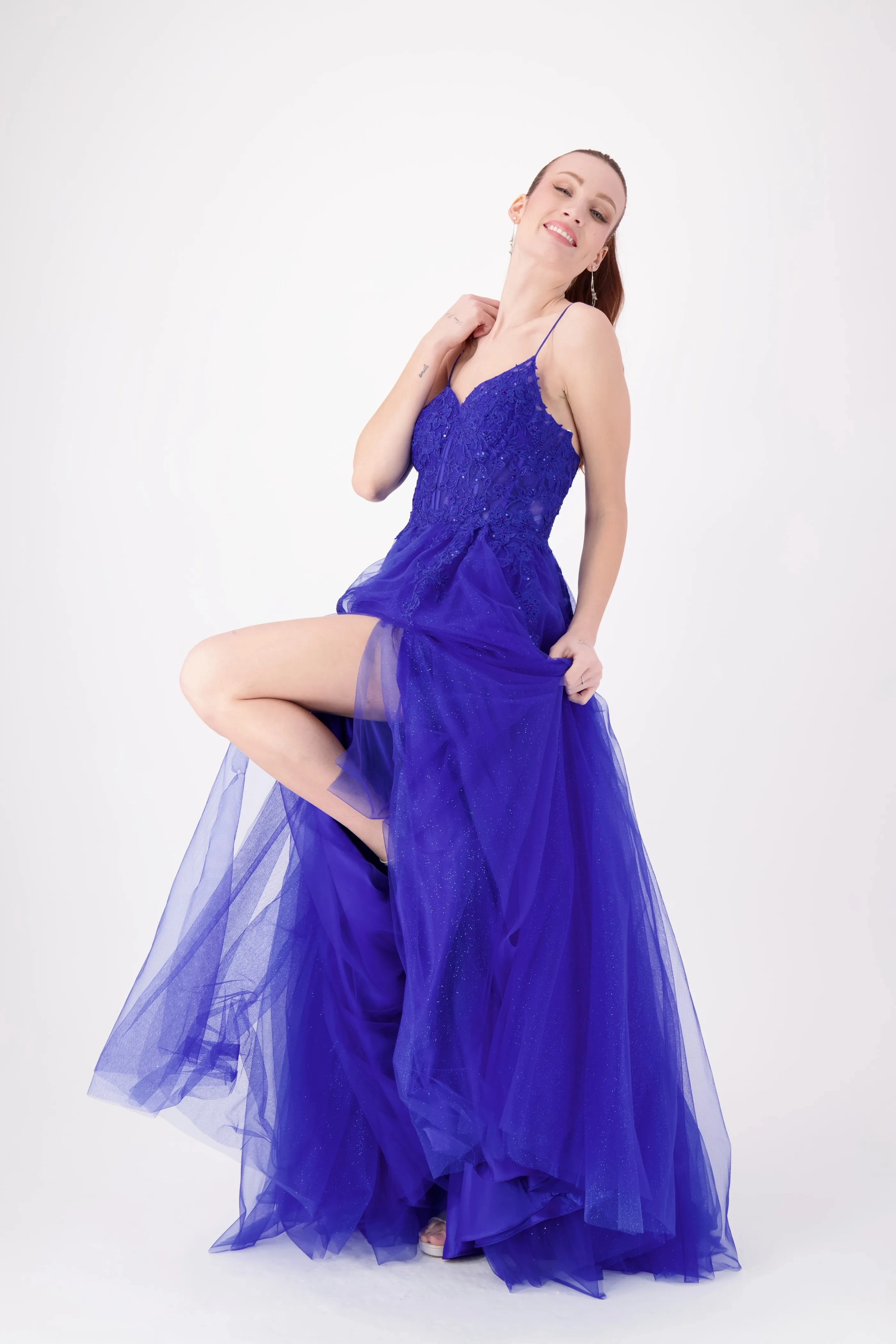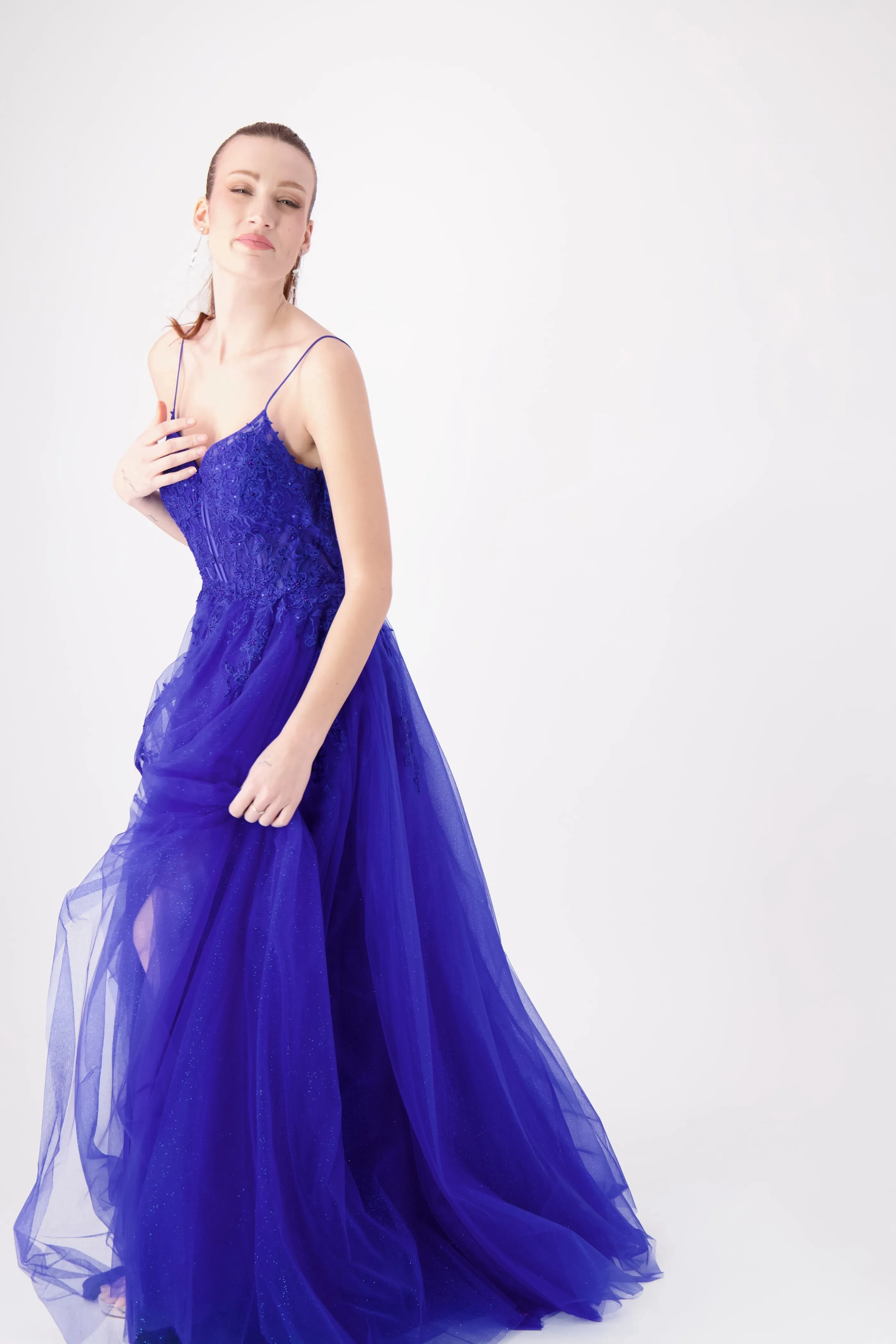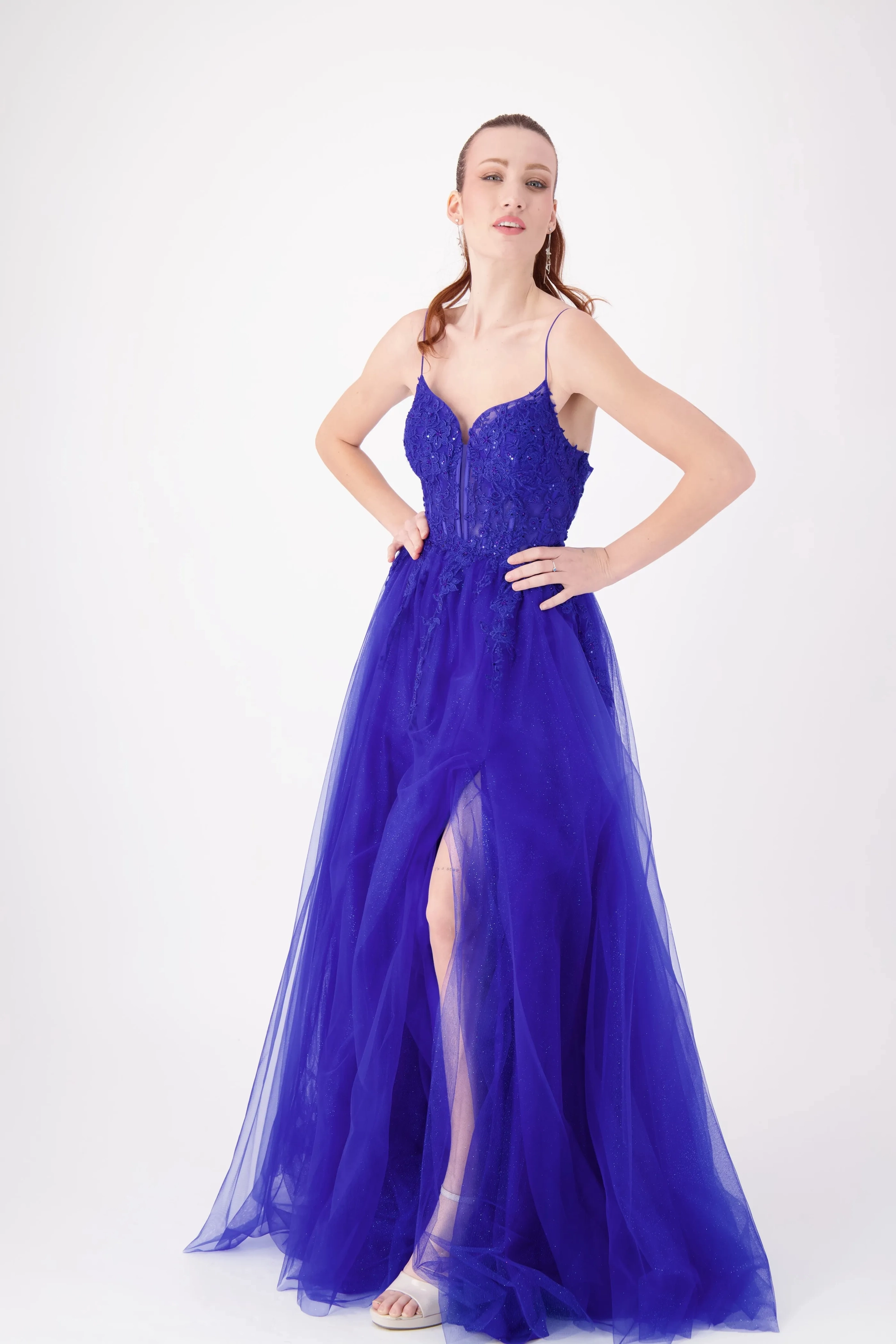 Get ready to level up your style game with our Royal Blue A-line prom dress. it's practically royalty in gown form! This captivating masterpiece features a corset-like bodice that'll have you feeling like a queen with its flattering fit. The delicate thin straps add a touch of sophistication, while a sheer paneling on the bodice hints at a world of allure. This dress isn't just an outfit; it's a statement, and it's ready to help you steal the show at your special event. Don this exquisite ensemble and watch heads turn as you shine like the star you are!