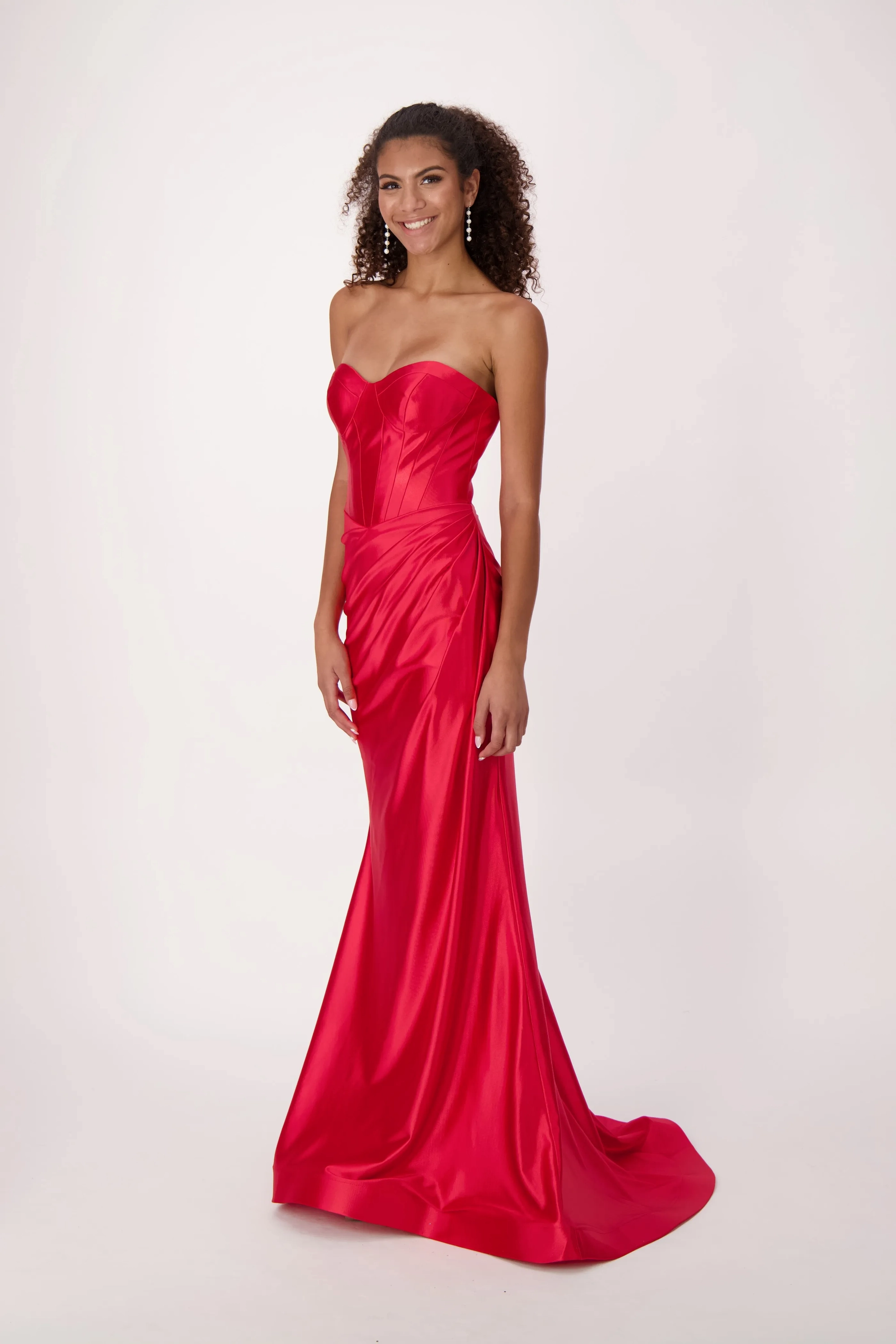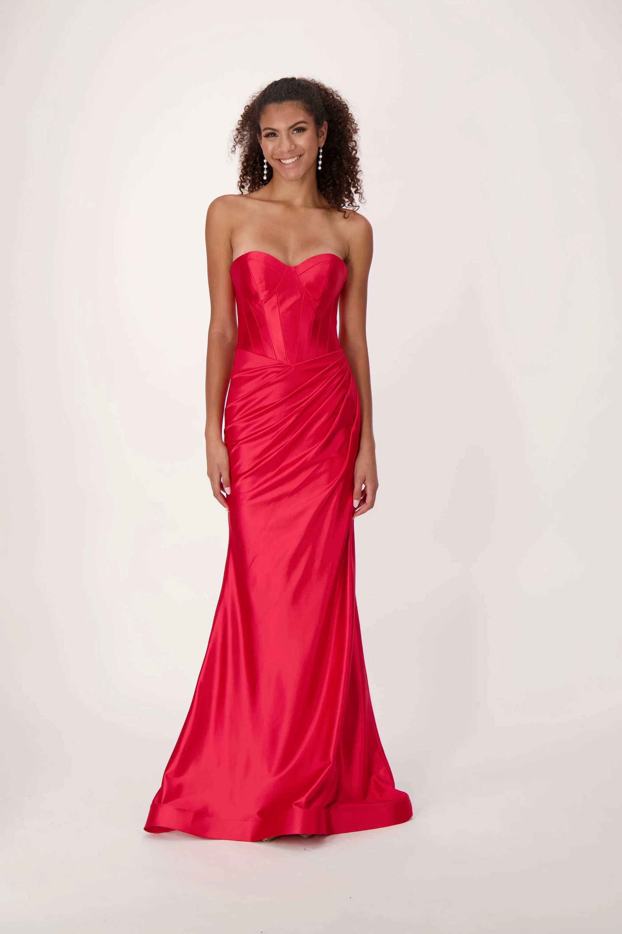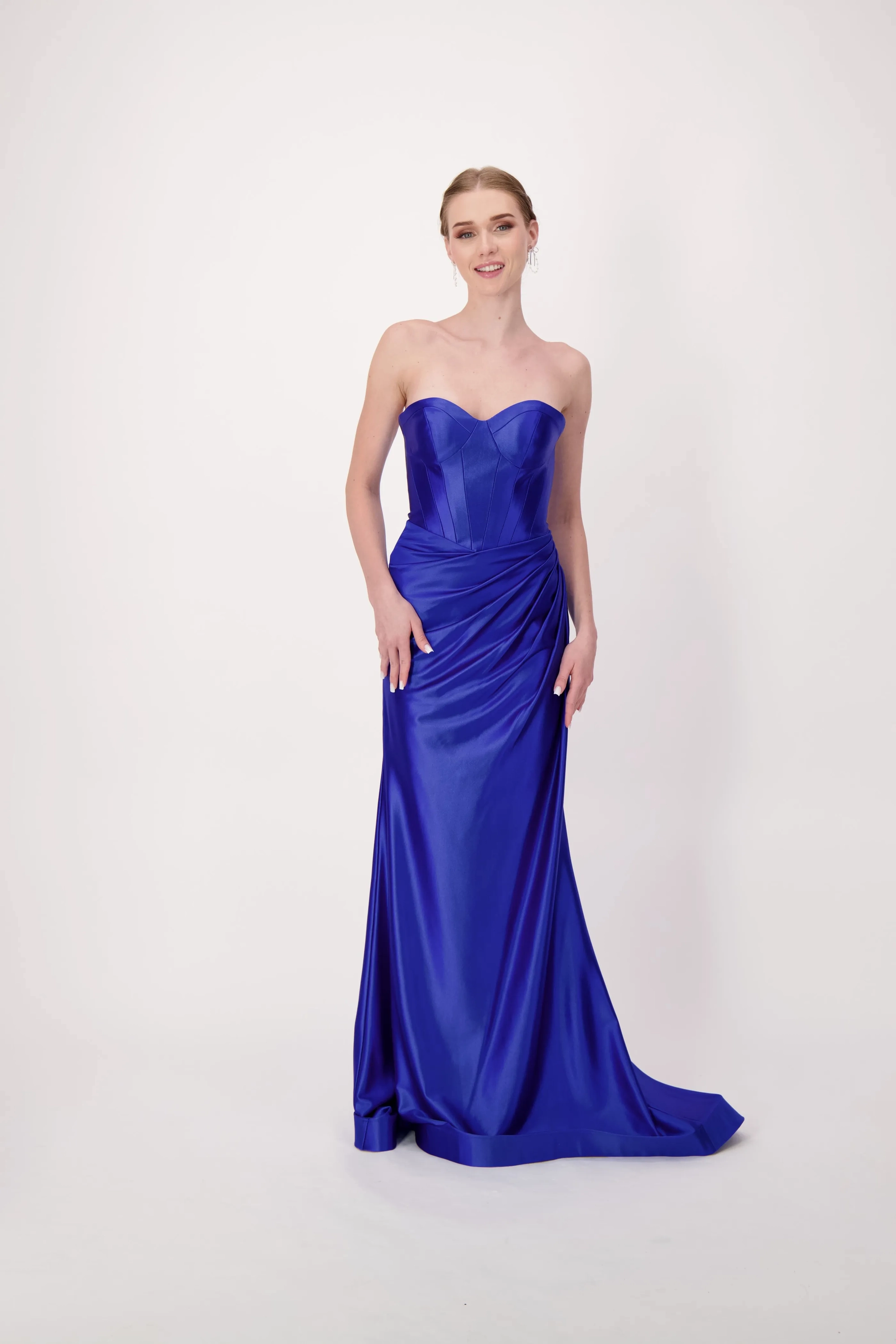 Command attention in our stunning satin dress featuring a sweetheart corset top. This exquisite design combines the allure of a corset with the luxury of satin, sculpting a flattering silhouette. A rouching at the hips adds a touch of elegance, making this gown the perfect choice for a night of elegance and undeniable style.
