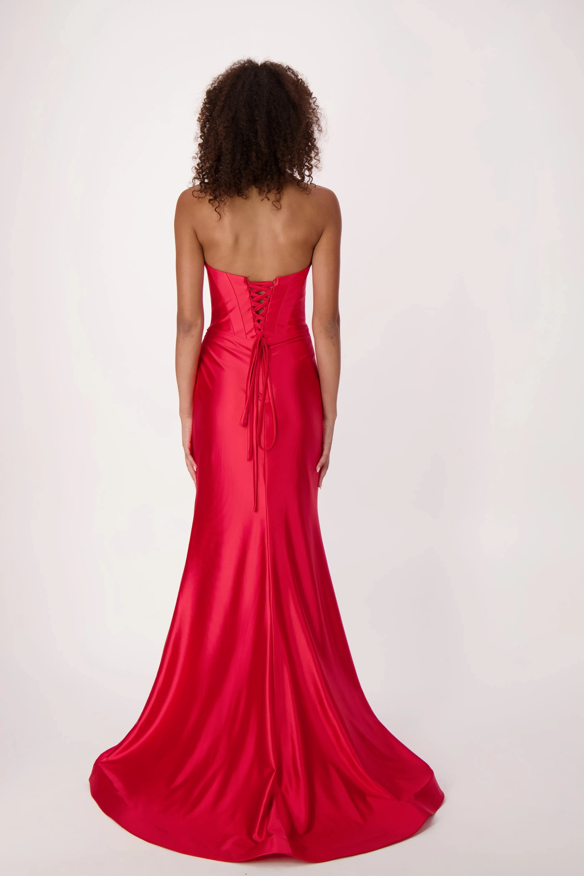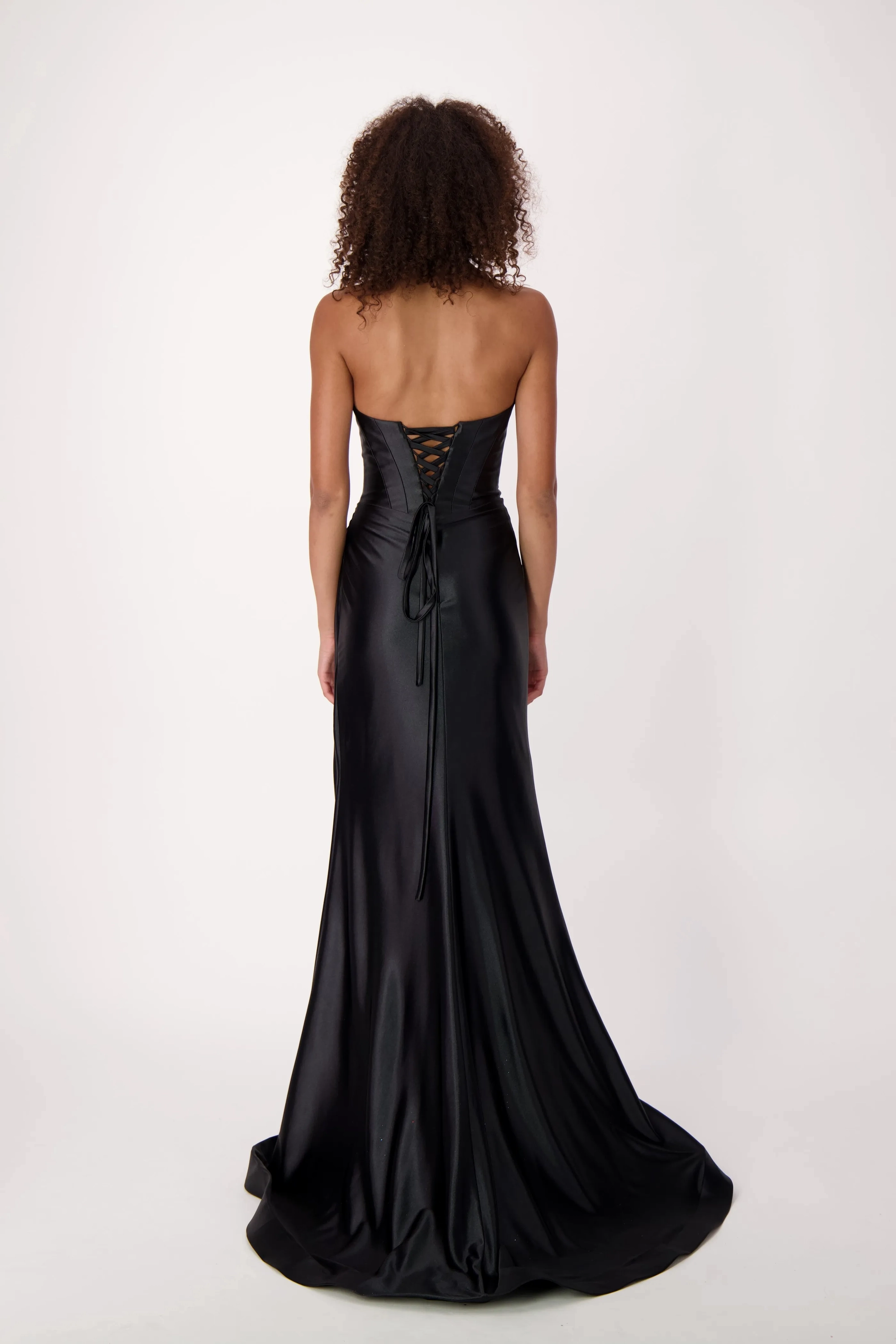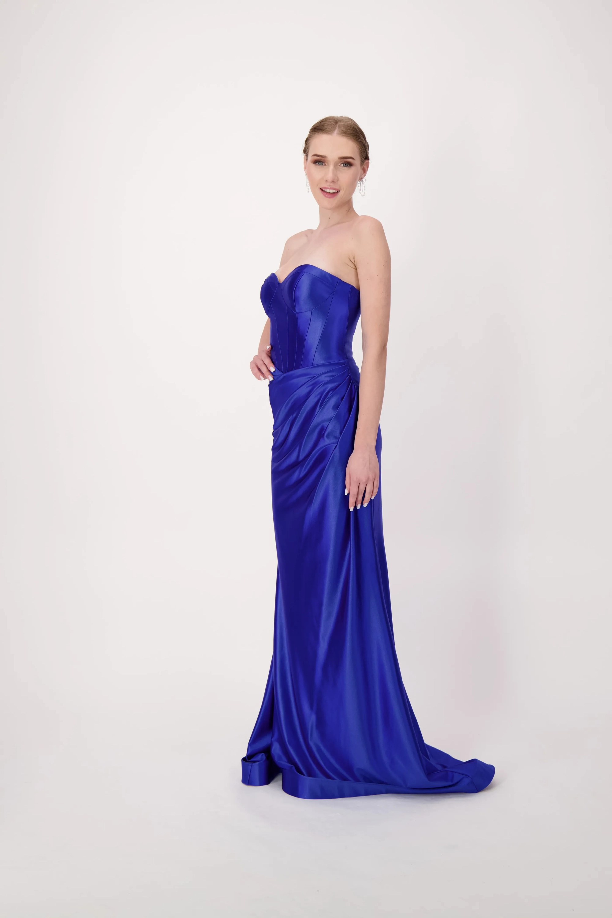 Command attention in our stunning satin dress featuring a sweetheart corset top. This exquisite design combines the allure of a corset with the luxury of satin, sculpting a flattering silhouette. A rouching at the hips adds a touch of elegance, making this gown the perfect choice for a night of elegance and undeniable style.