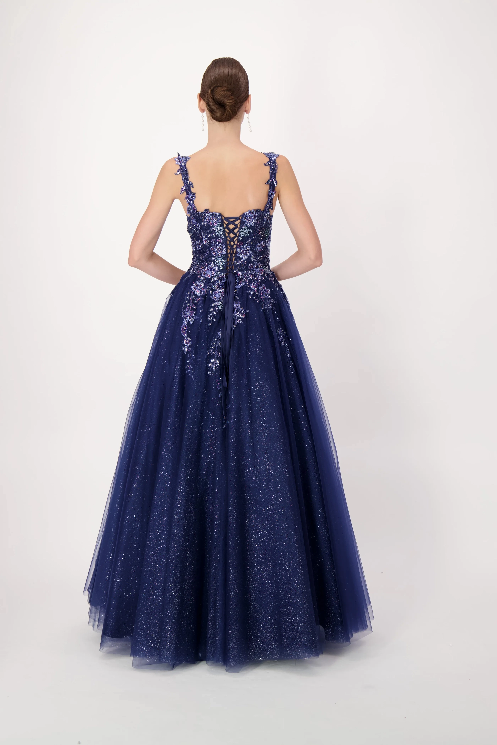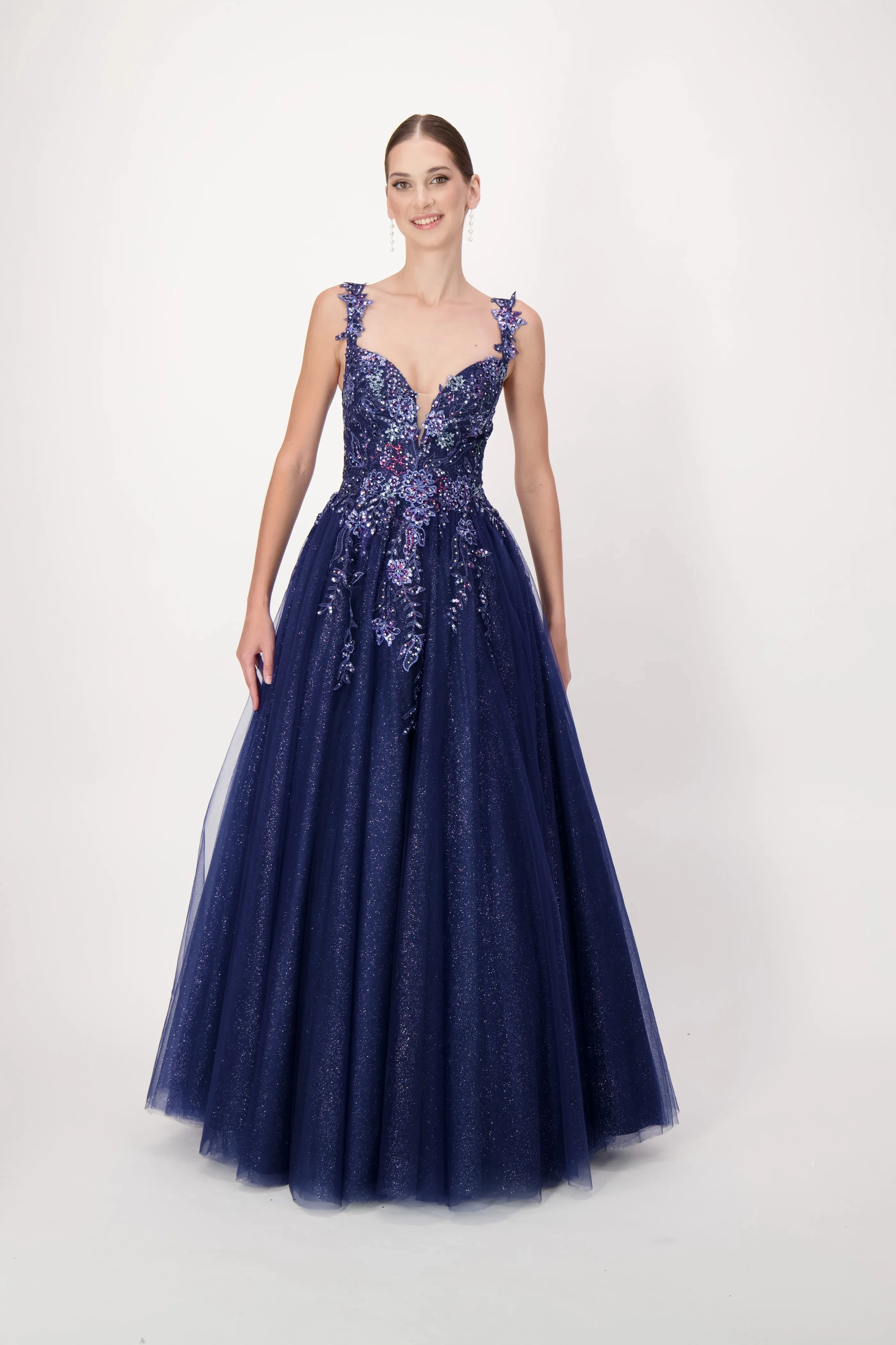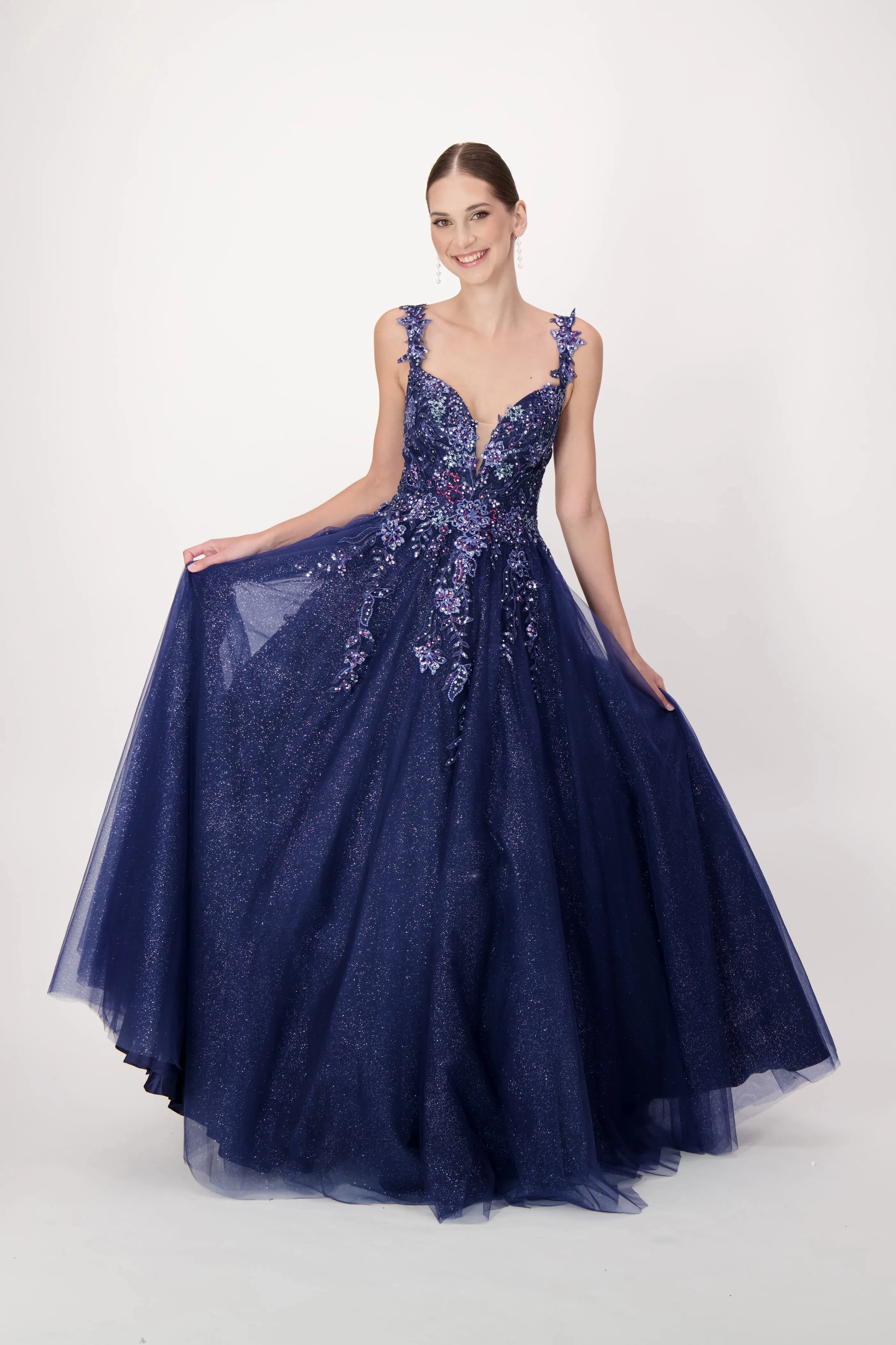 This enchanting ball gown features a shimmering tulle skirt and intricate floral lace appliqué on the bodice. The deep V neckline and delicate straps add a touch of romance, making it perfect for prom, quinceañeras, weddings, or formal events. Shine brightly in this sparkling masterpiece.