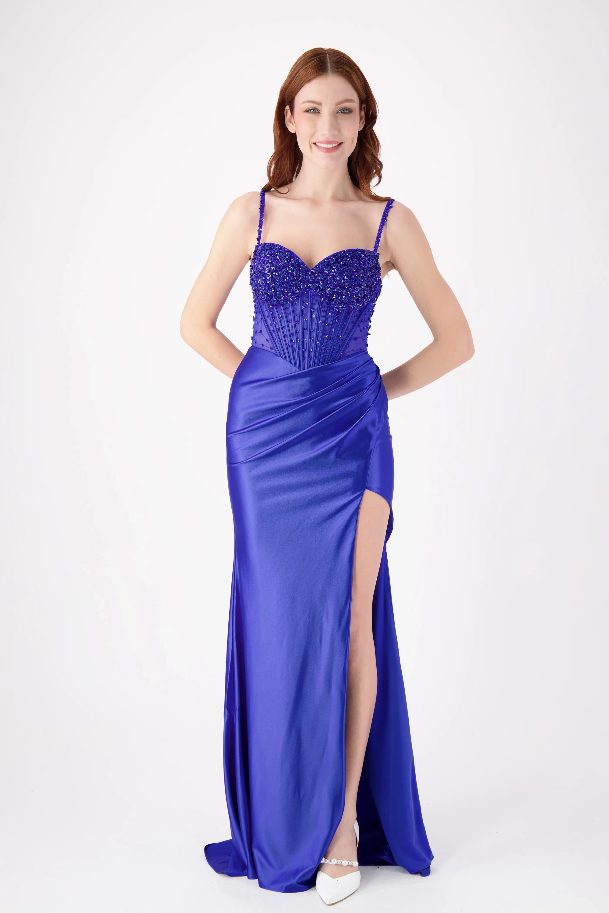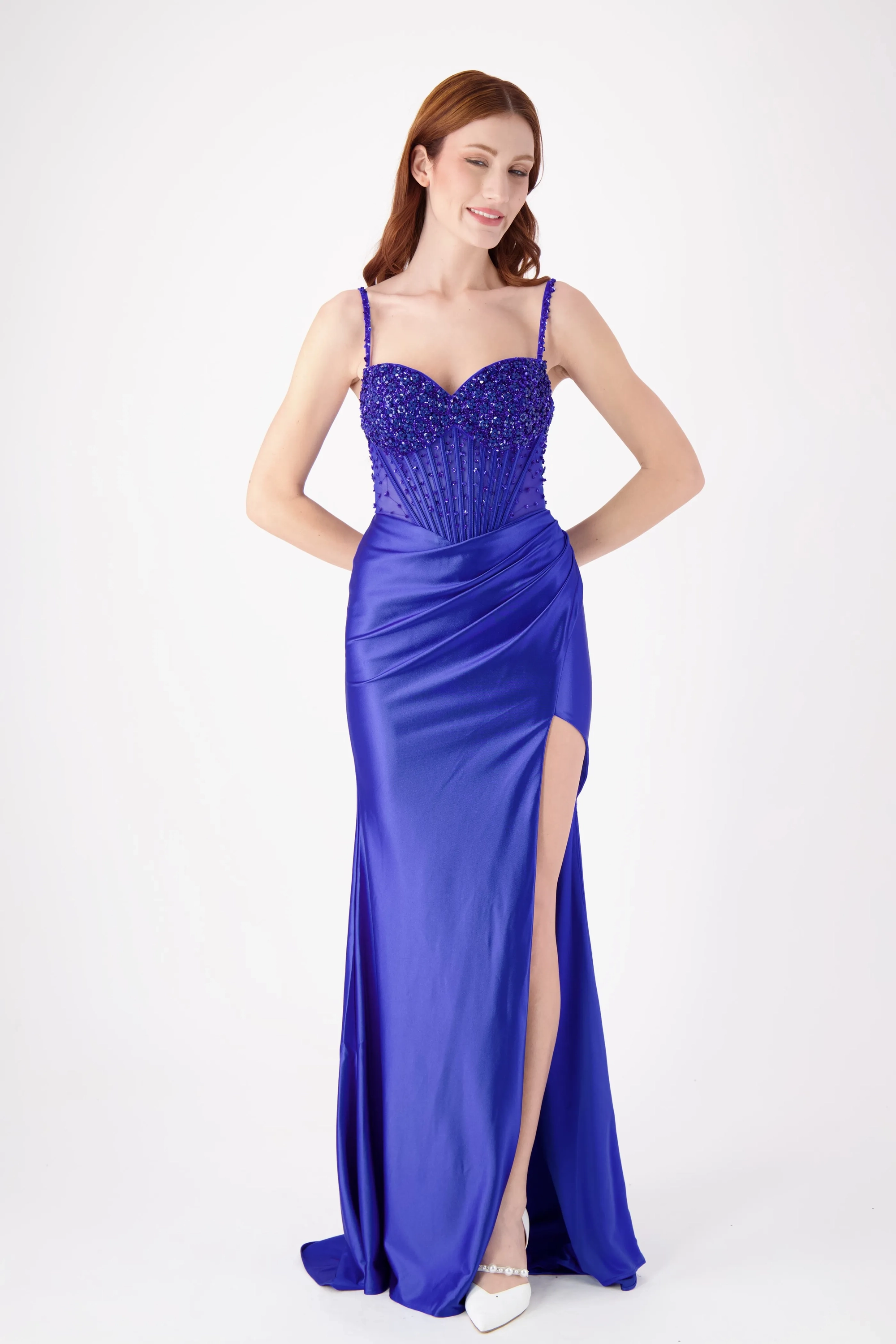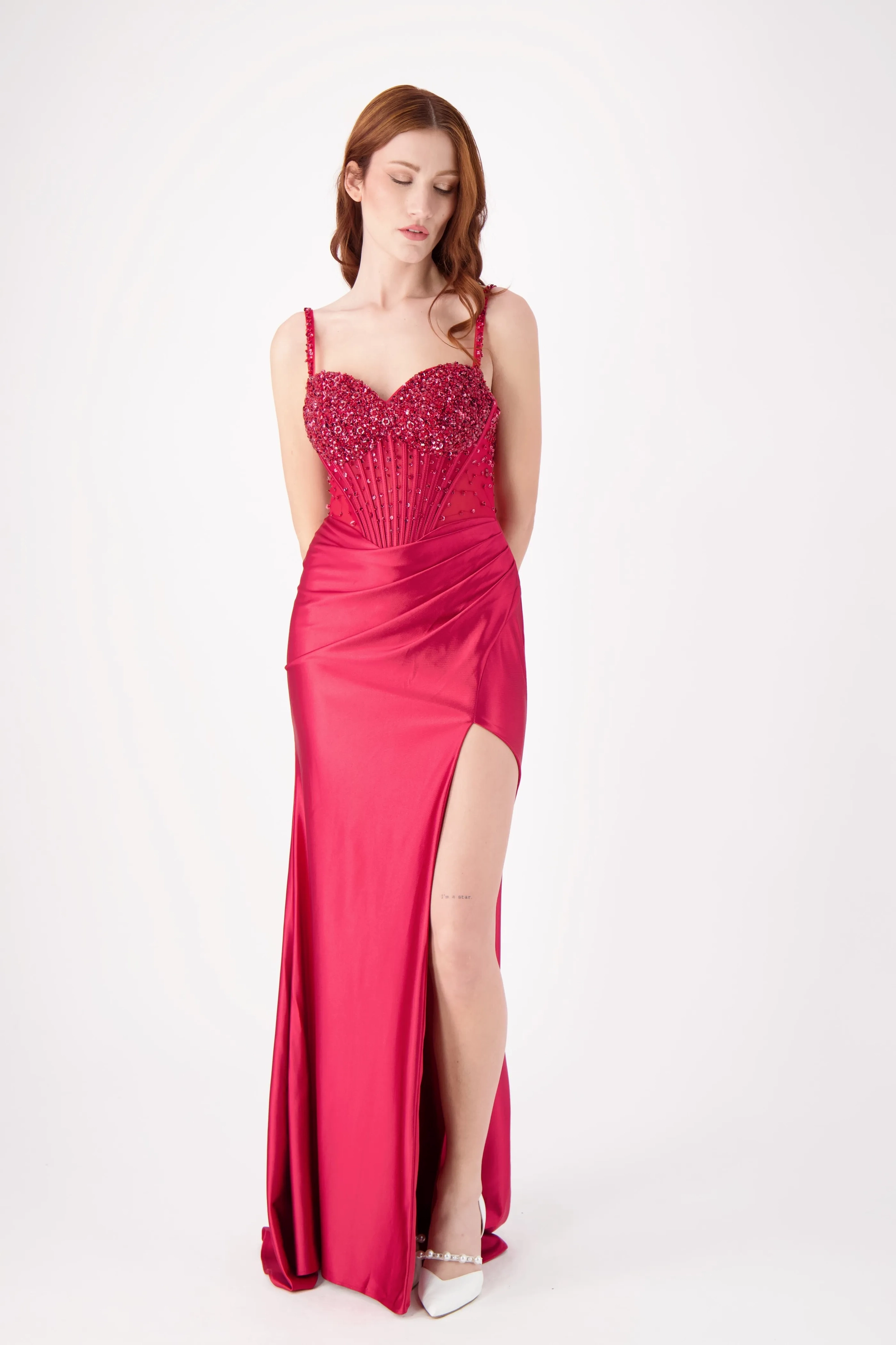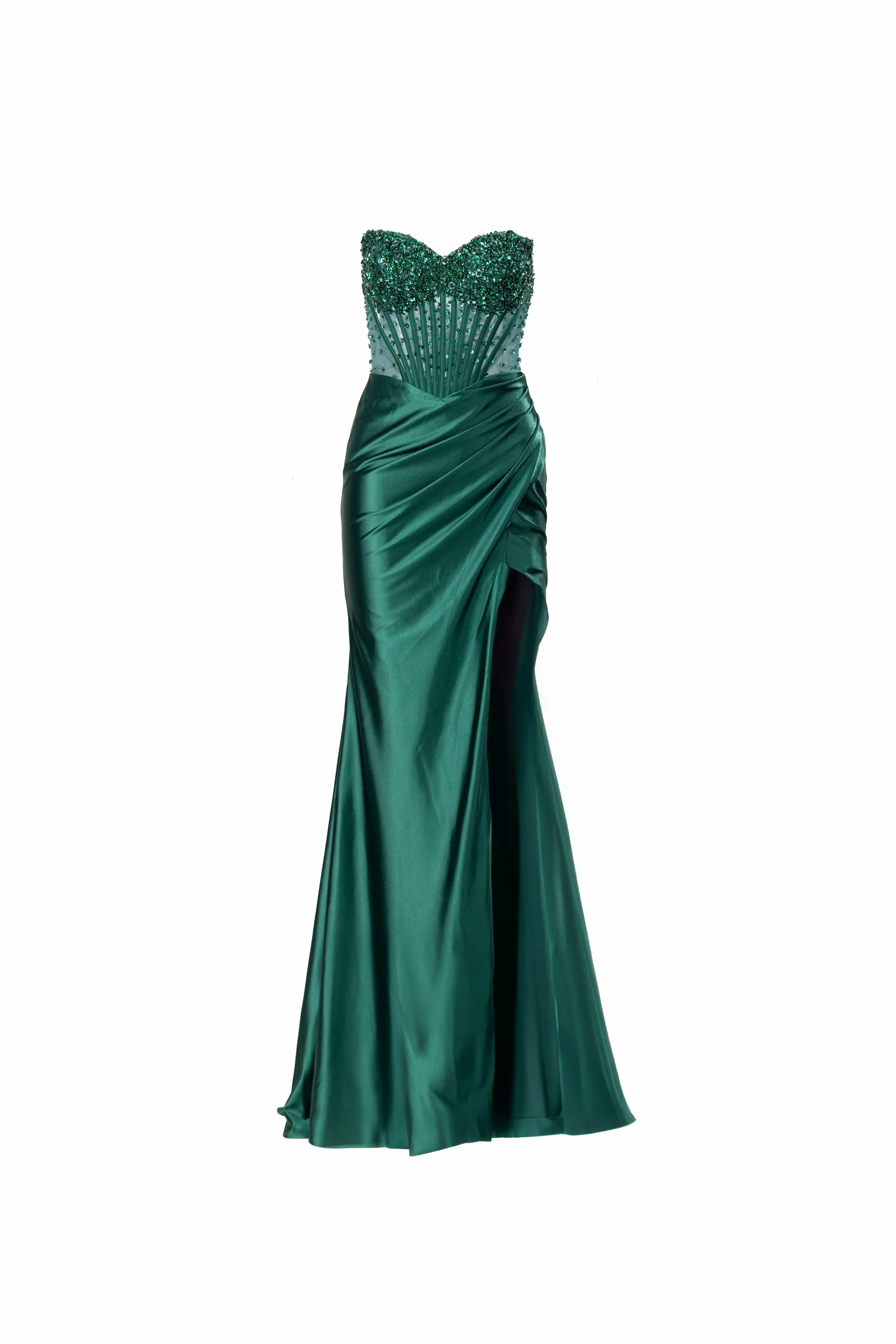 This stunning strapless fitted dress features a beautifully embellished bodice with intricate beading, complemented by a sleek skirt and a daring high slit. The flattering silhouette makes it the perfect choice for prom or any formal event where you want to stand out with elegance and confidence.