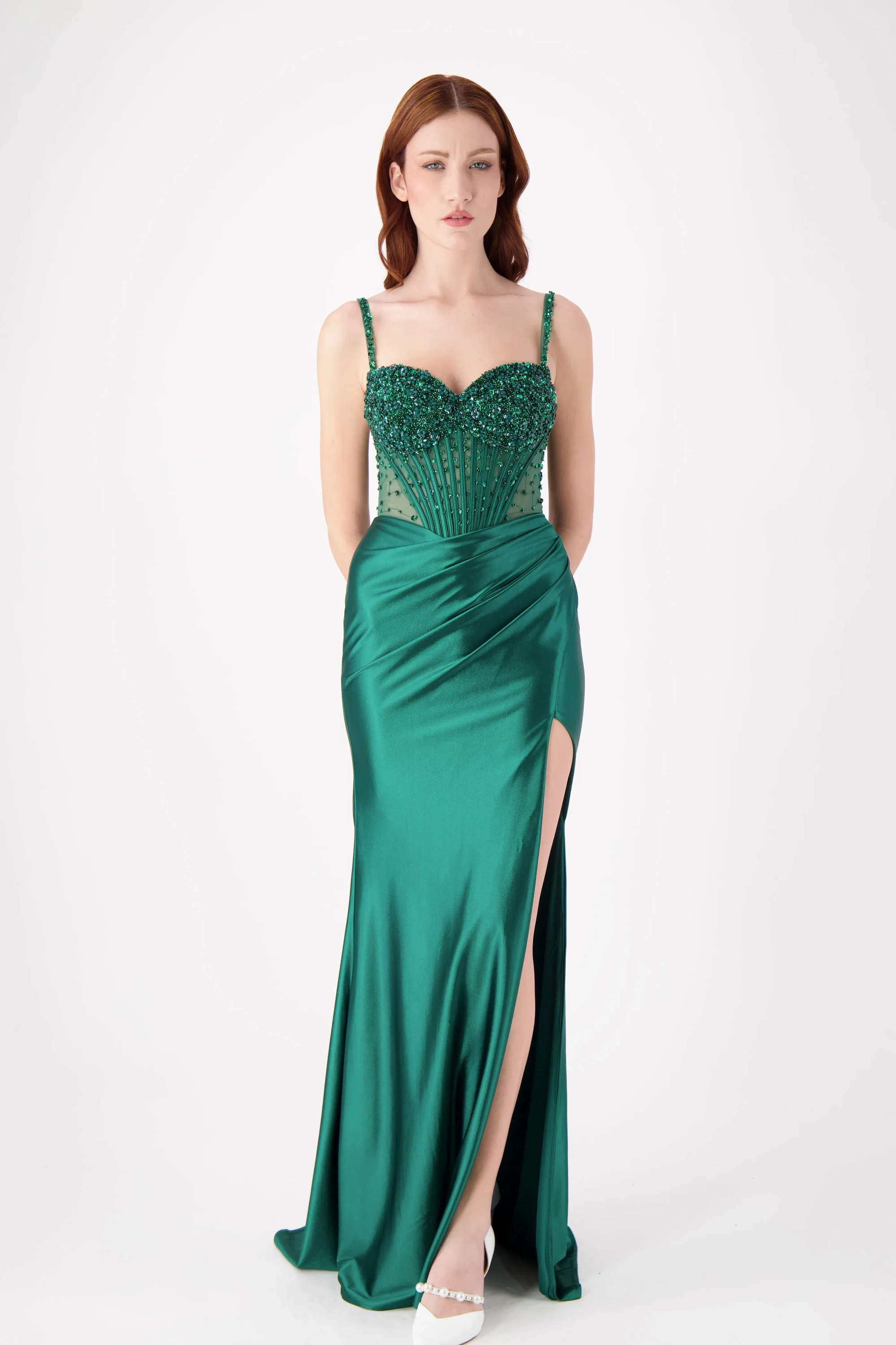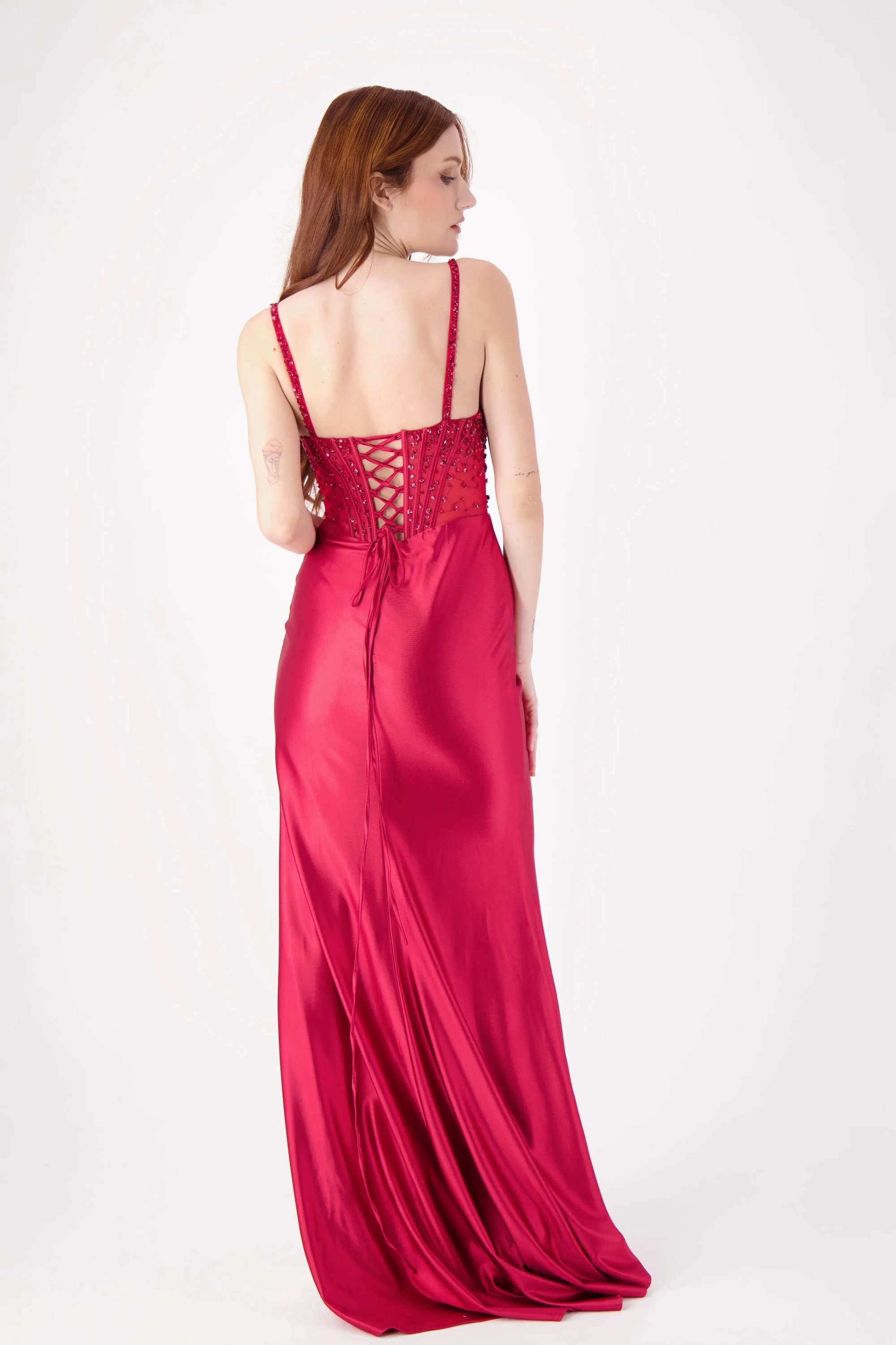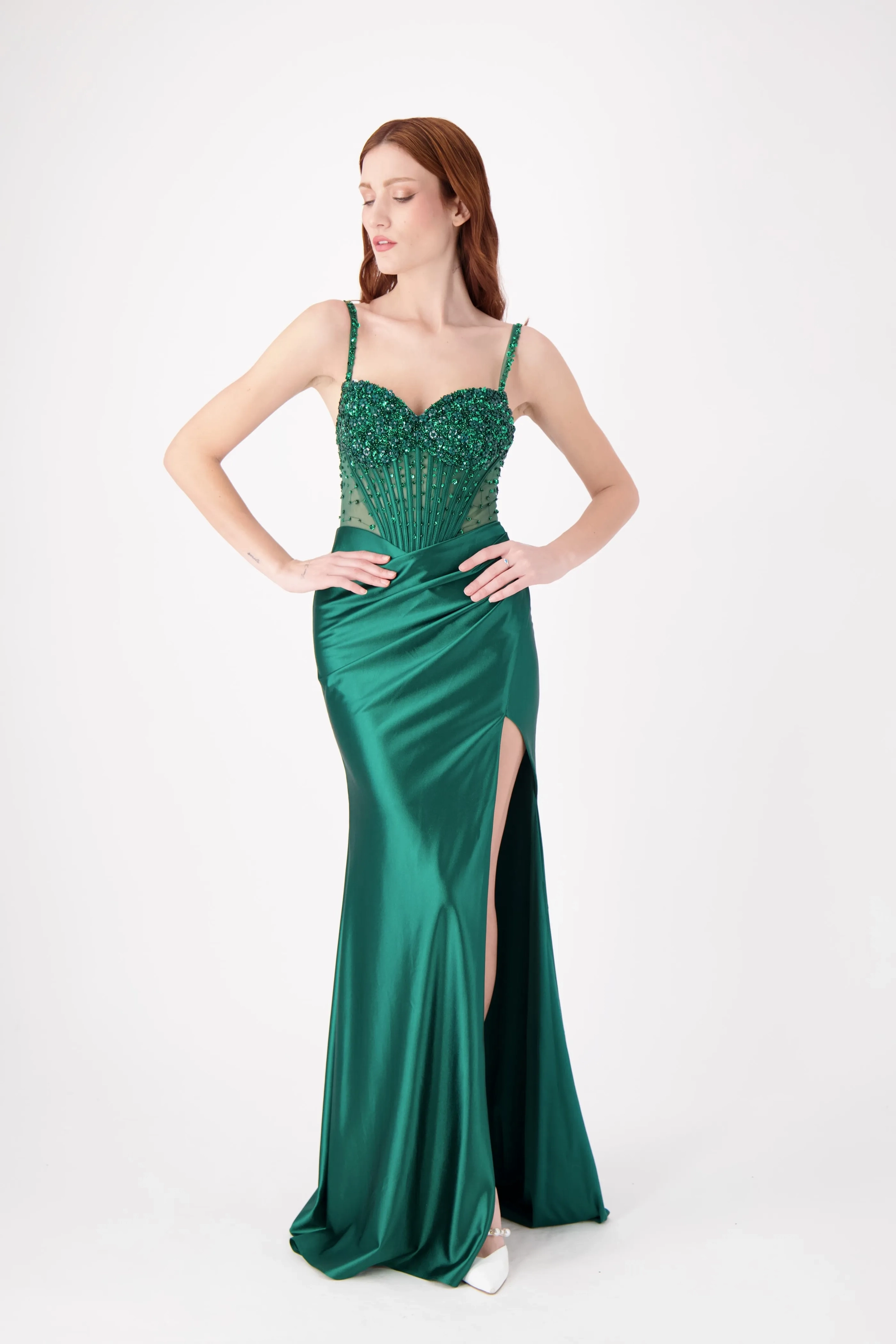 This stunning strapless fitted dress features a beautifully embellished bodice with intricate beading, complemented by a sleek skirt and a daring high slit. The flattering silhouette makes it the perfect choice for prom or any formal event where you want to stand out with elegance and confidence.