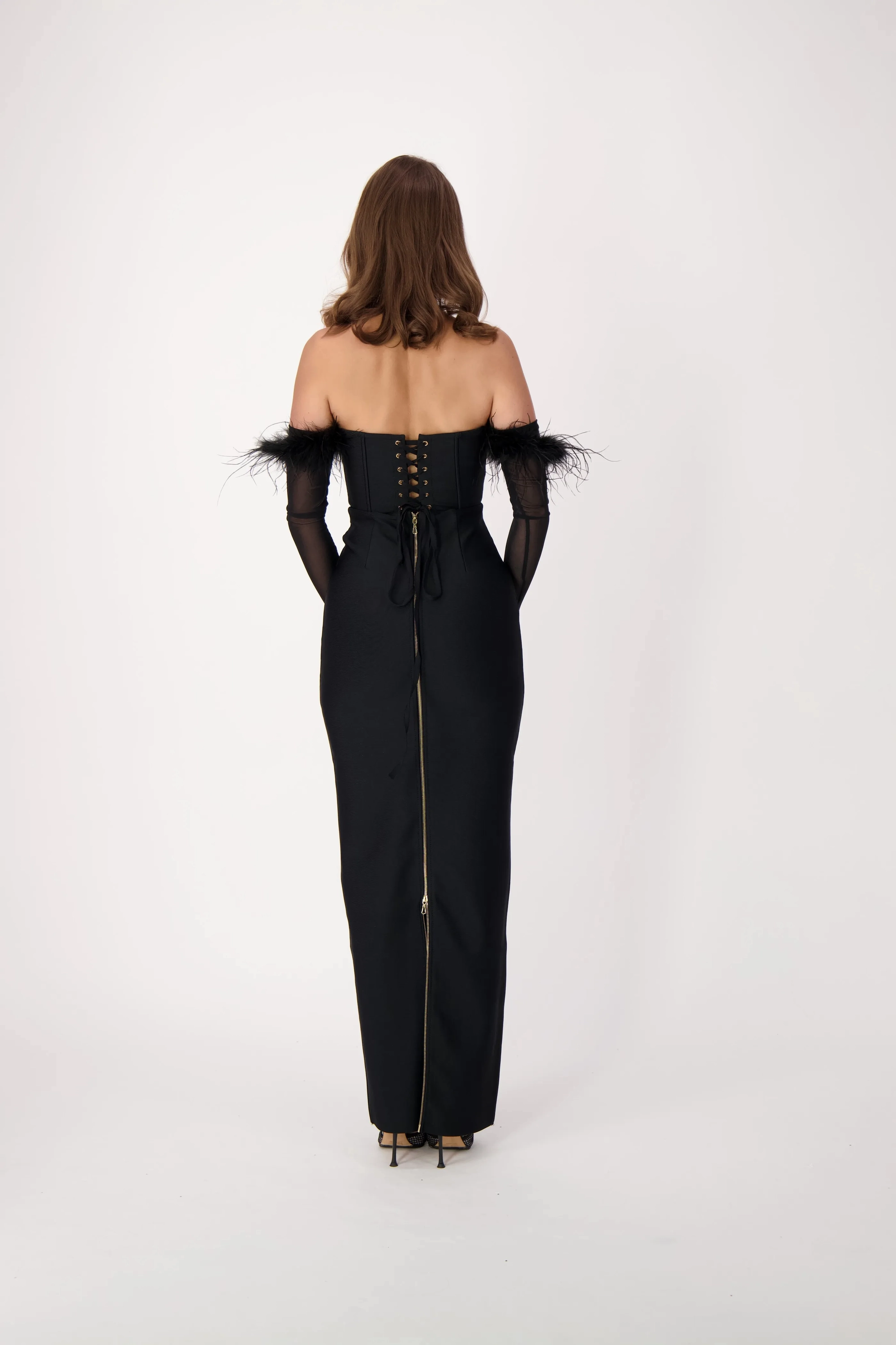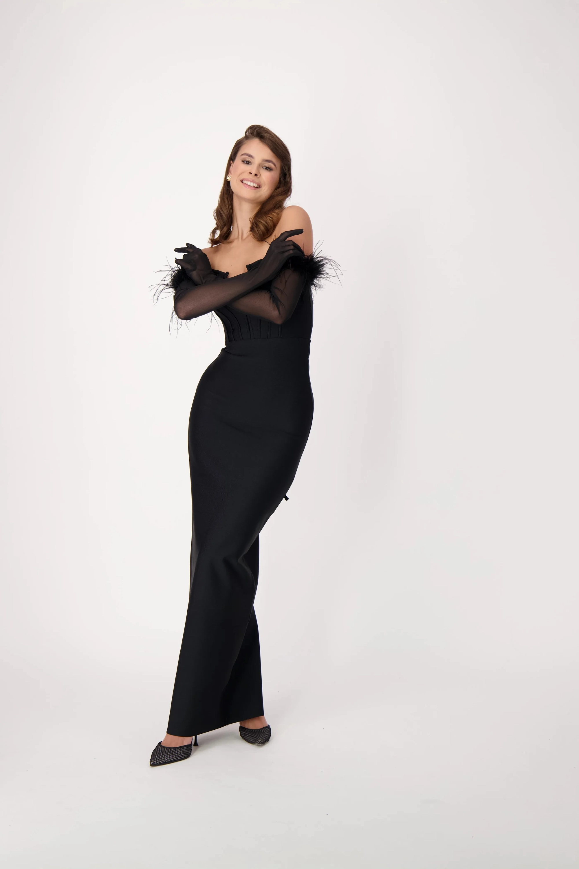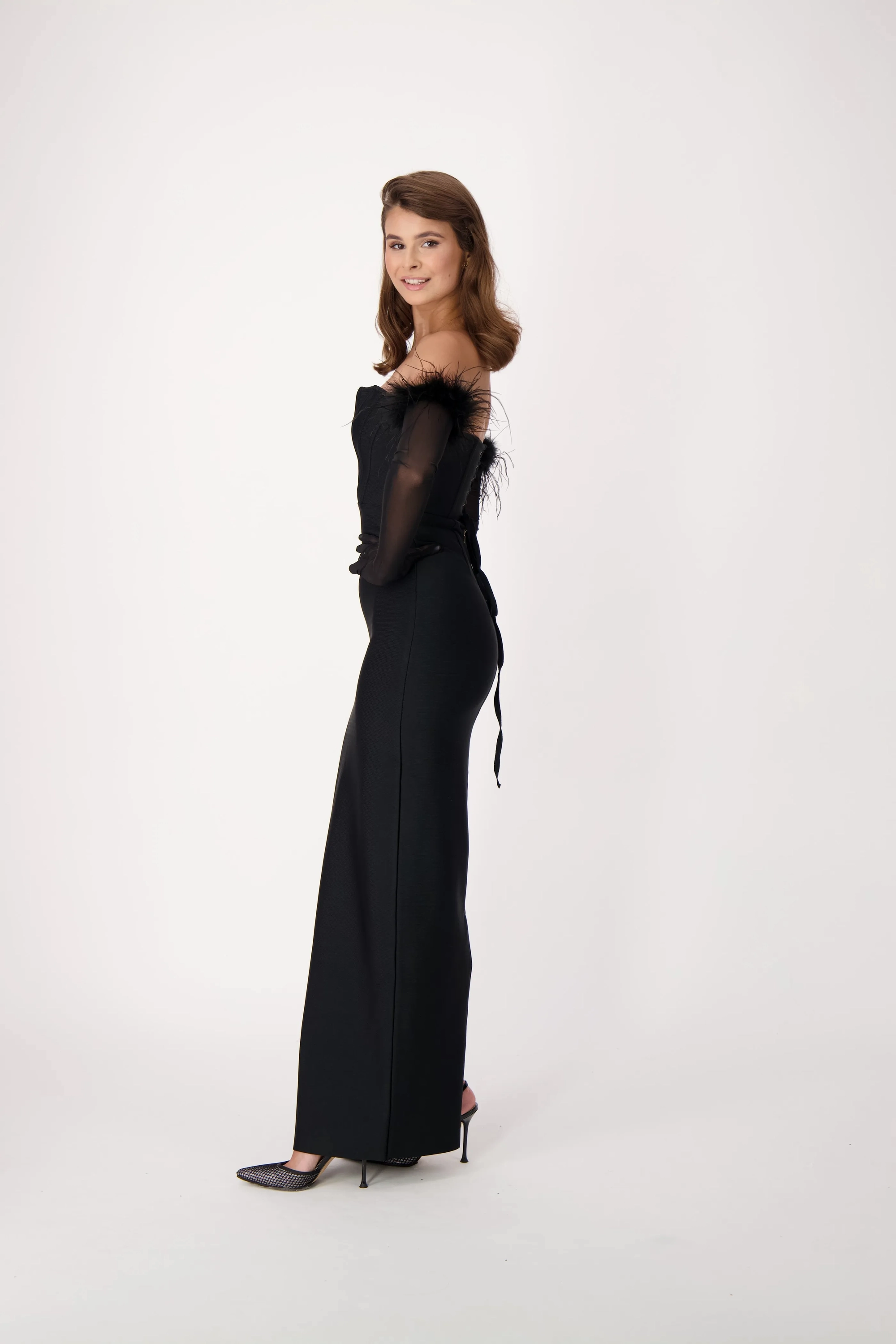 This strapless black gown exudes elegance with a deep plunge neckline and luxurious feather accents along the arms. Perfect for formal events, New Year’s Eve, or special occasions, this gown combines timeless sophistication with a touch of dramatic flair, ensuring you’ll make a lasting impression.