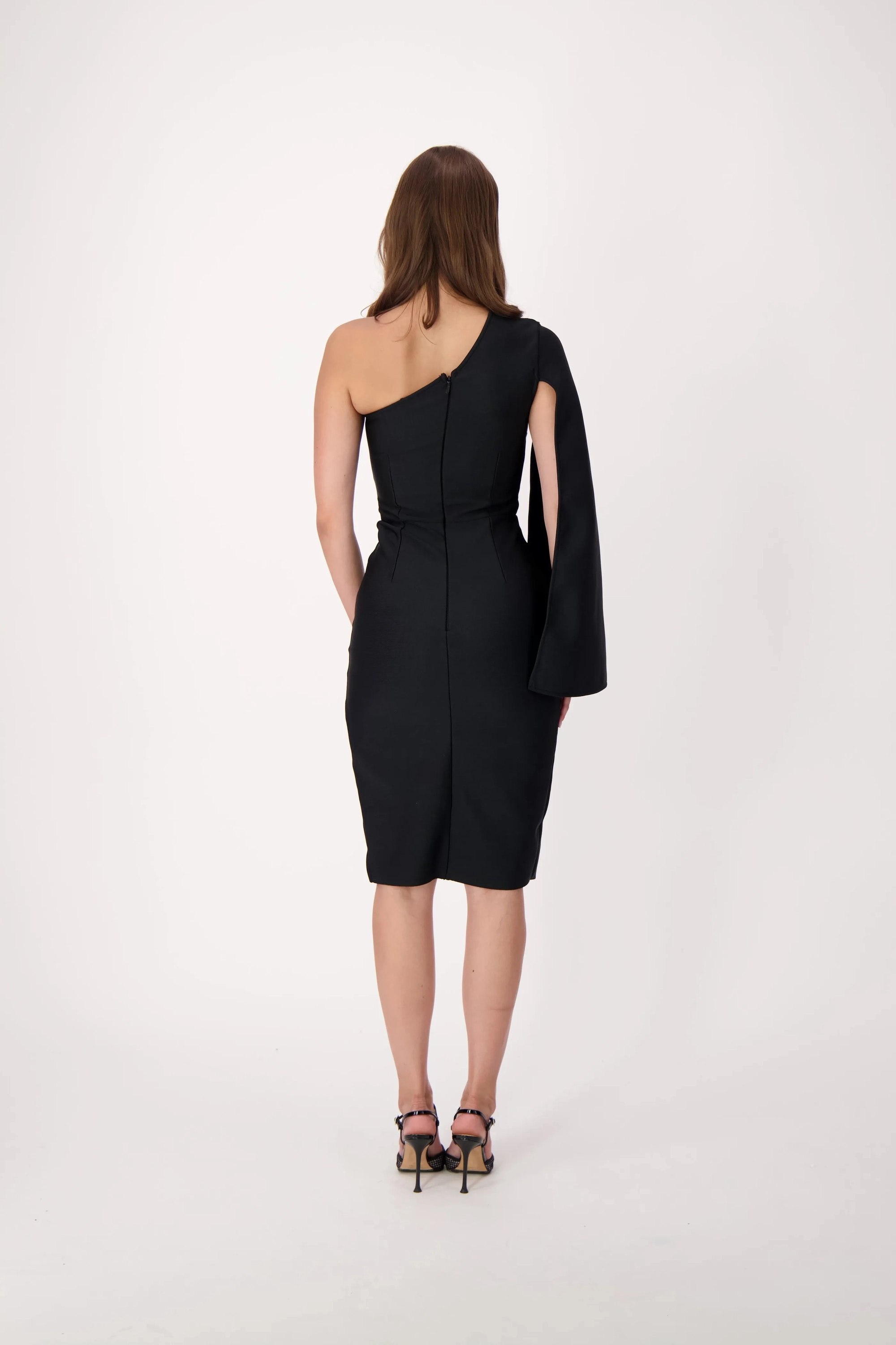 Make a bold statement with this one-shoulder black dress, featuring a dramatic sleeve and a sleek high slit. Ideal for cocktail parties, formal dinners, or special occasions, this fitted dress offers a modern twist on classic elegance, ensuring you’ll stand out with its unique and sophisticated design.