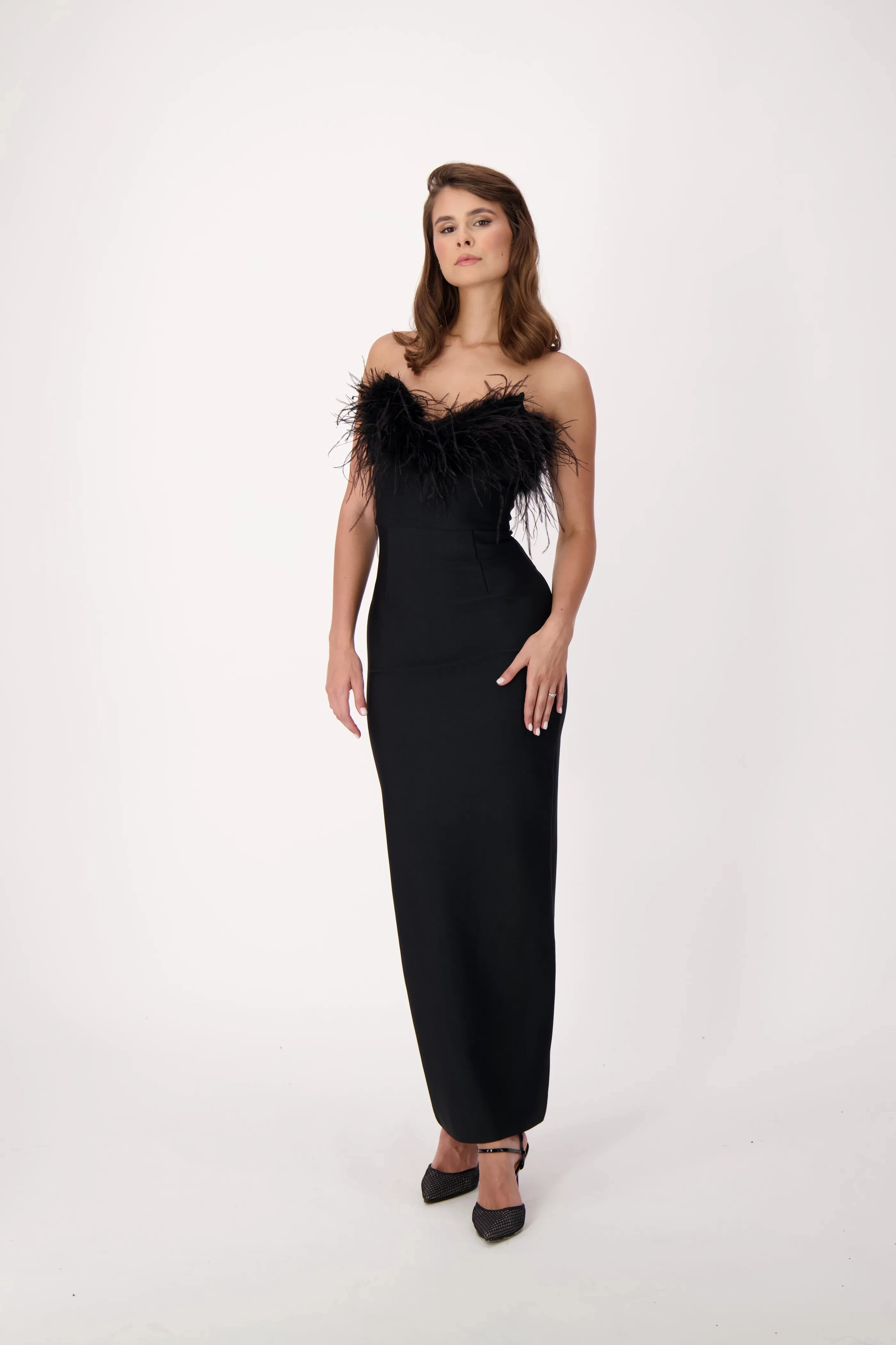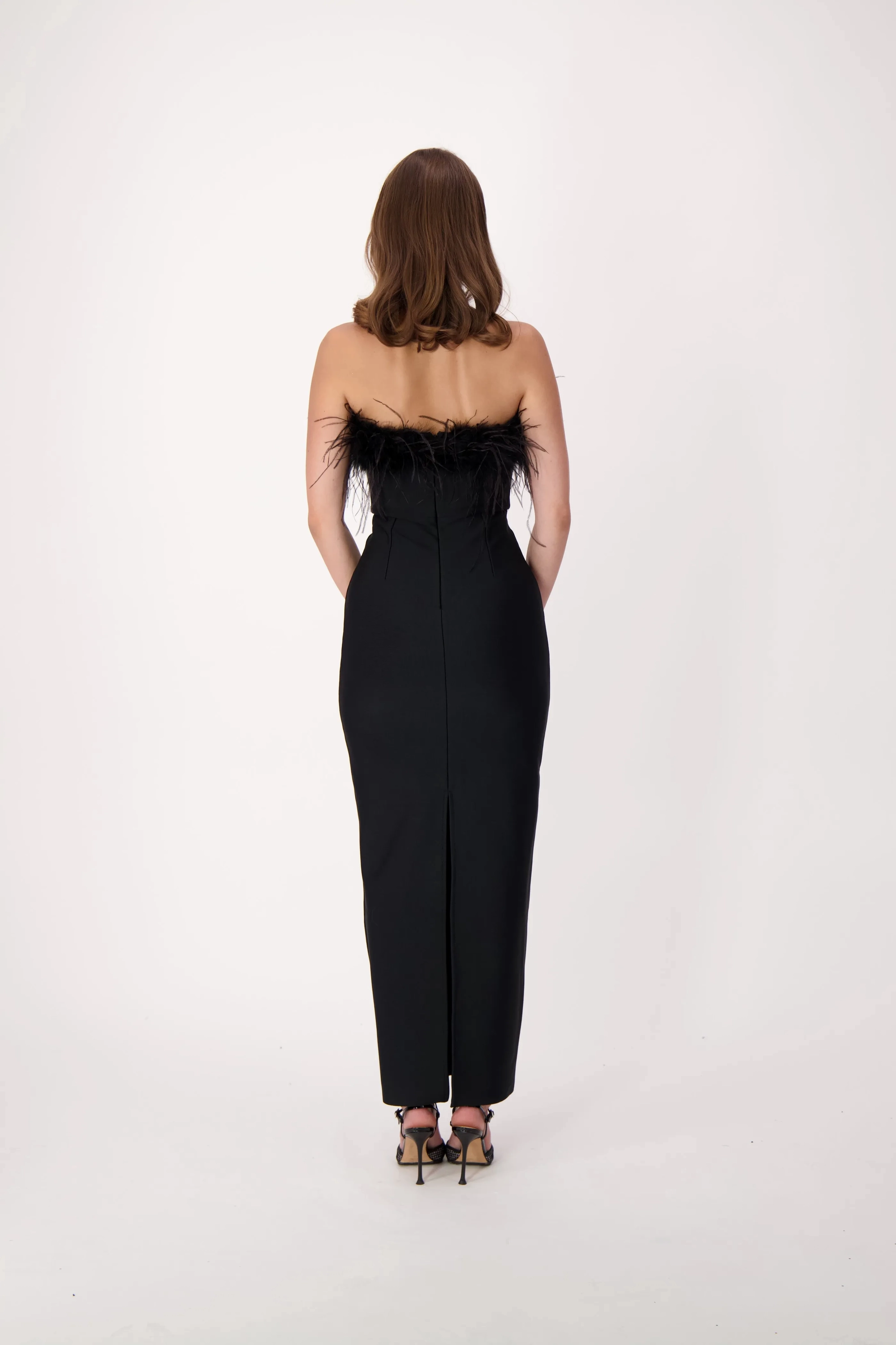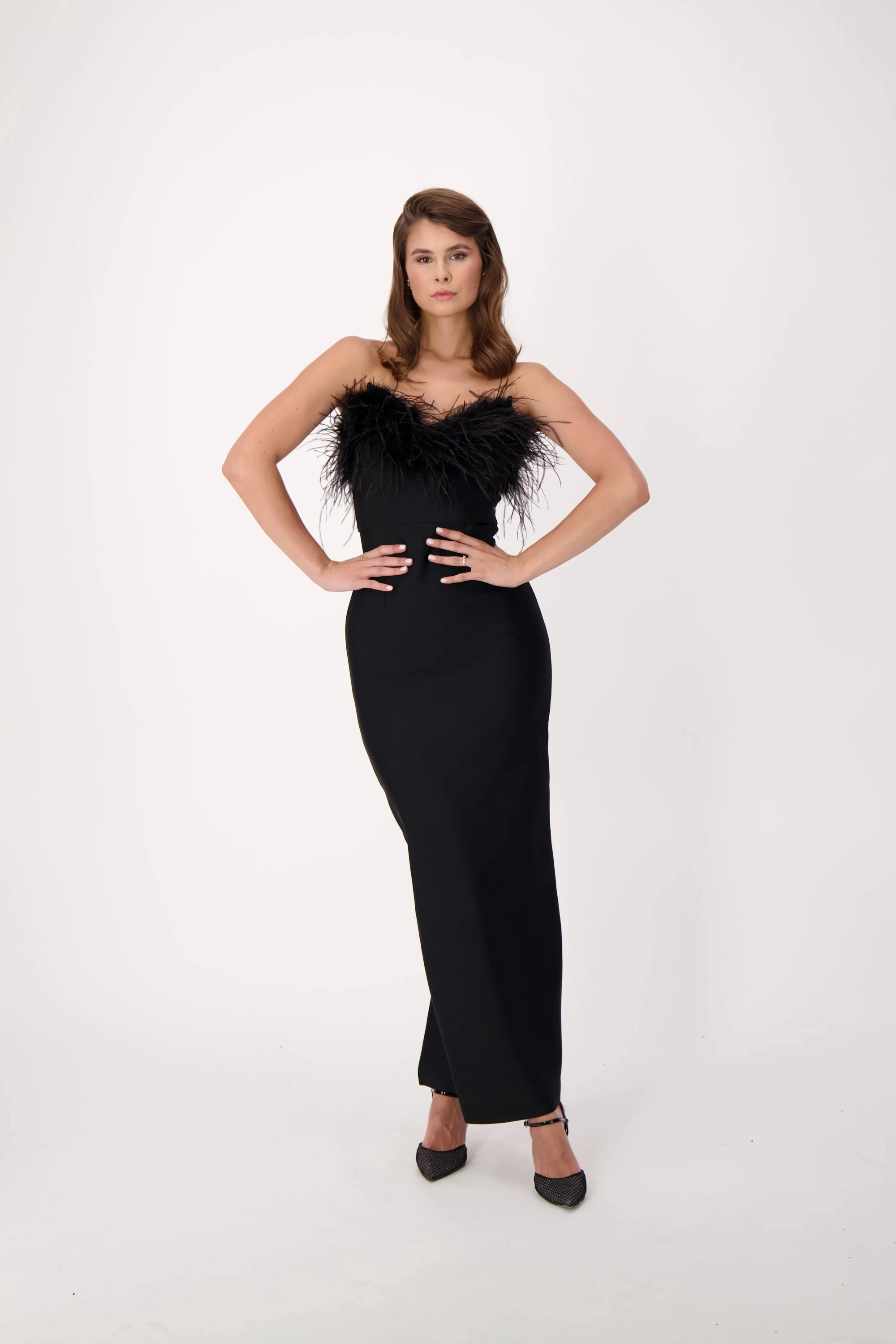 This sophisticated strapless black gown features bold feather accents along the neckline, adding a touch of drama and glamour. Perfect for formal events, galas, or special occasions, this sleek and fitted design exudes timeless elegance with a modern twist.