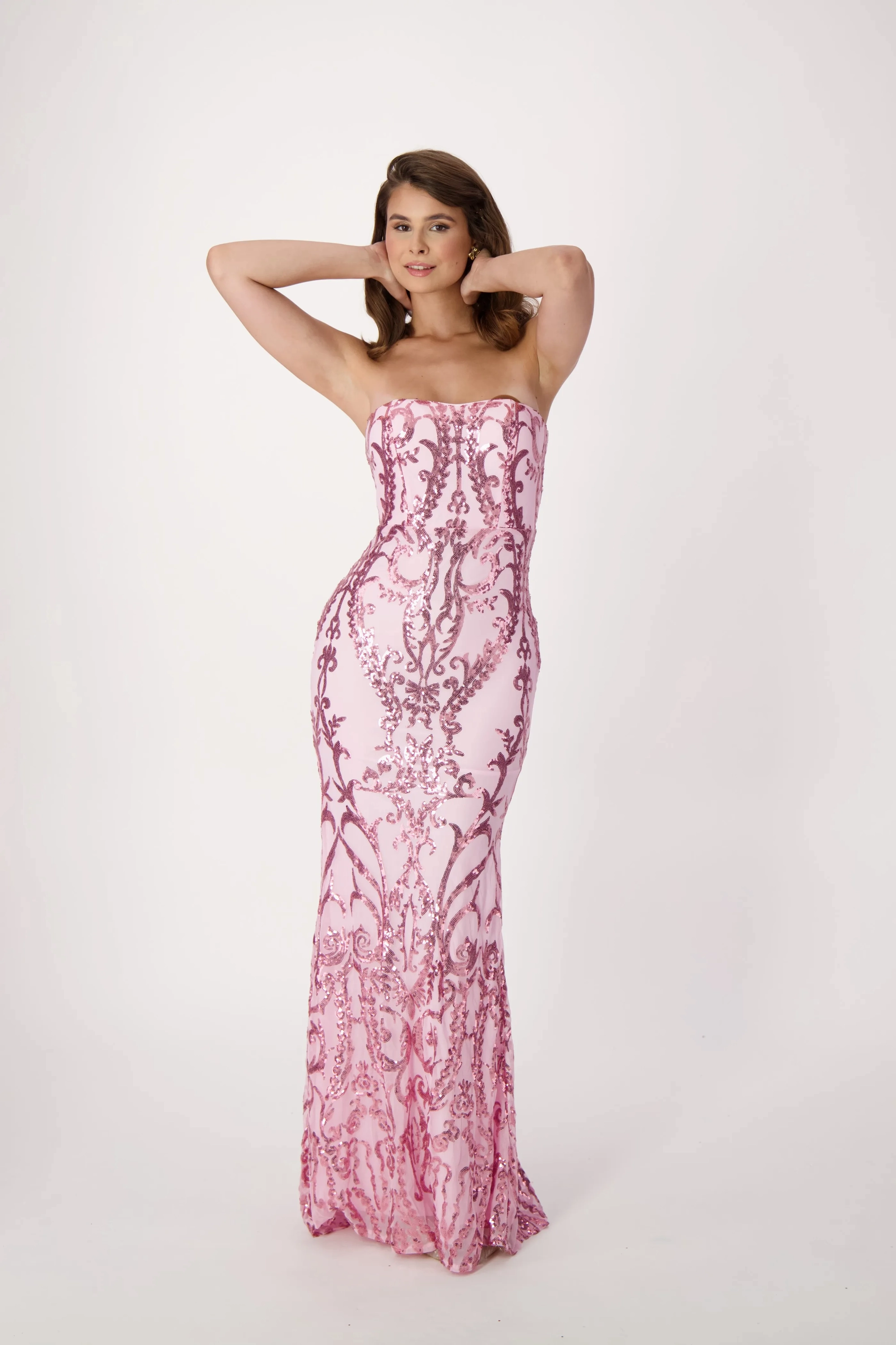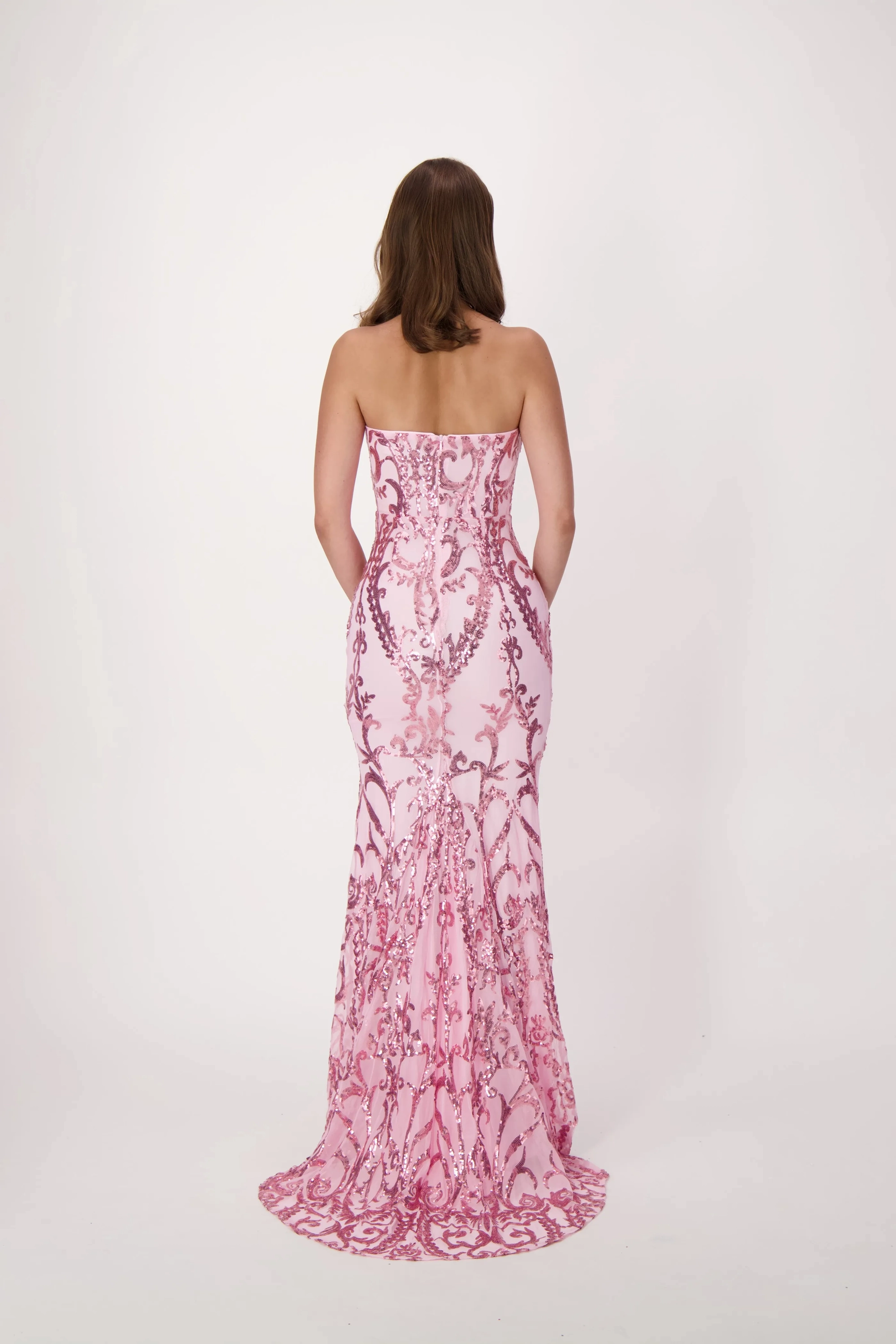 This stunning strapless gown features intricate embellishments cascading down the fitted silhouette, creating a romantic and elegant look. Perfect for formal events, galas, or special occasions, the detailed design and soft pink hue make this dress a standout piece for any celebration.