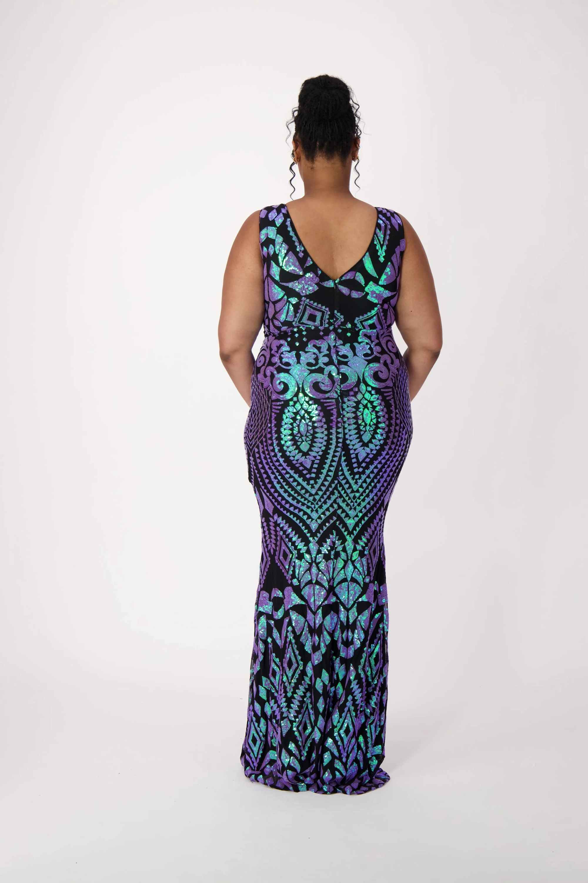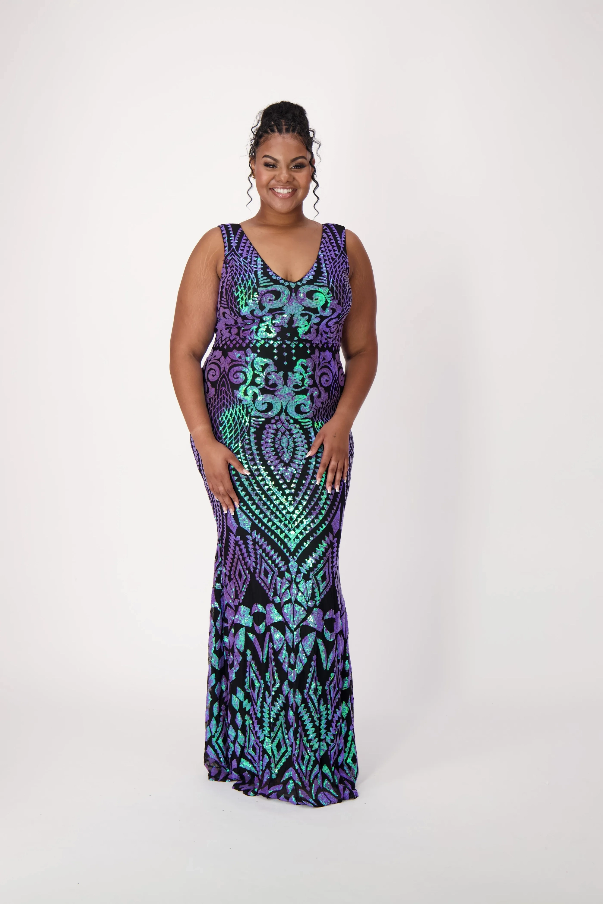 This plus-size sleeveless gown features a vibrant and intricate pattern with shimmering sequins, making it a perfect statement dress for special events like Christmas parties or New Year's Eve celebrations. The flattering V-neck and figure-hugging silhouette accentuate curves, while the bold, eye-catching colors ensure you'll stand out in any crowd. This gown offers both elegance and confidence for festive occasions or formal gatherings.