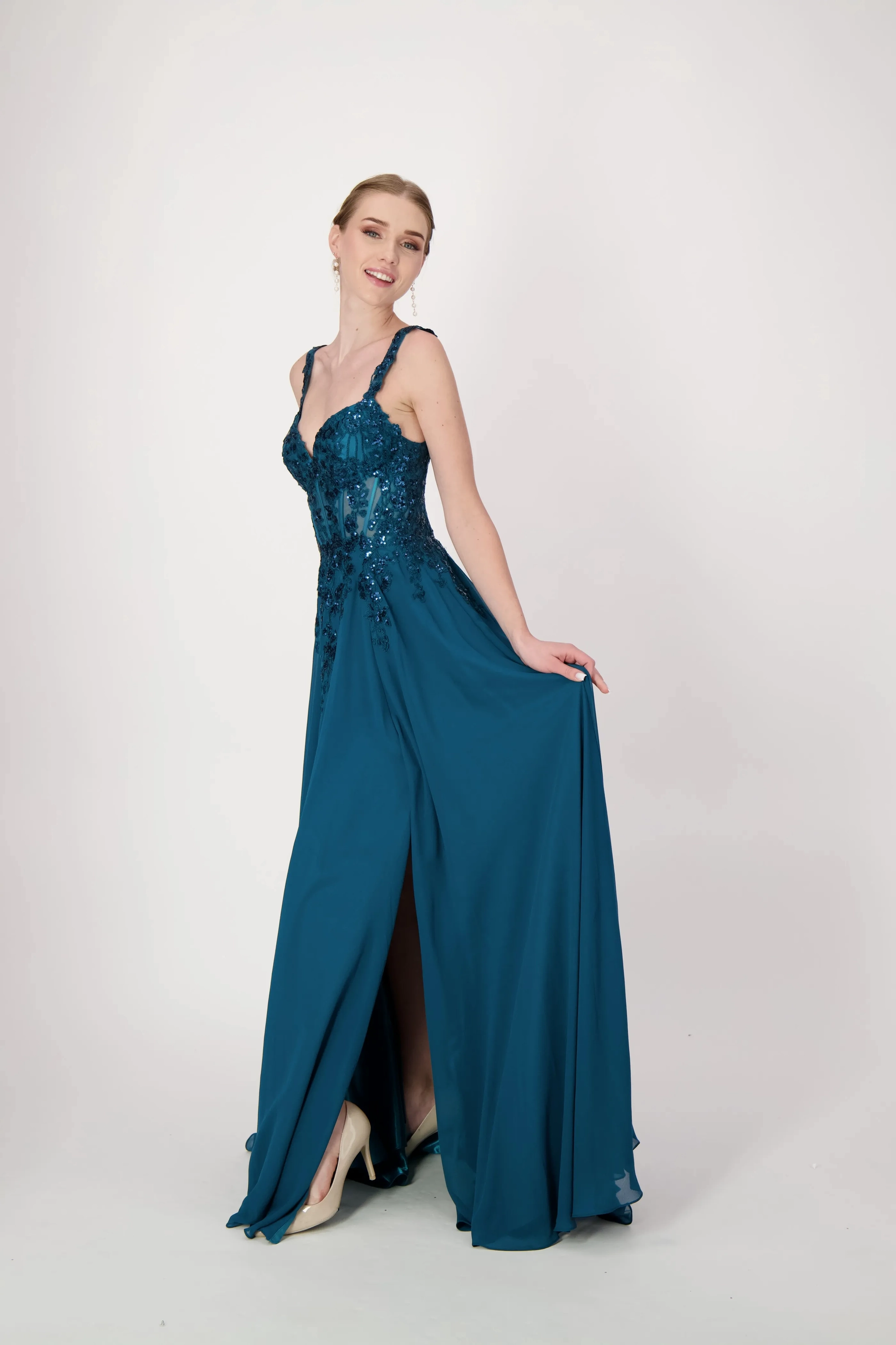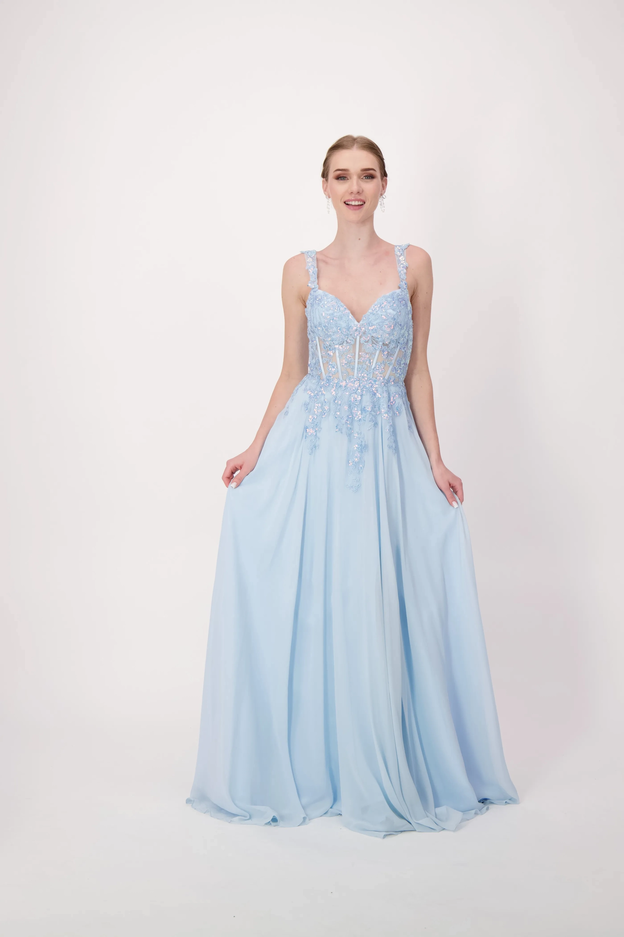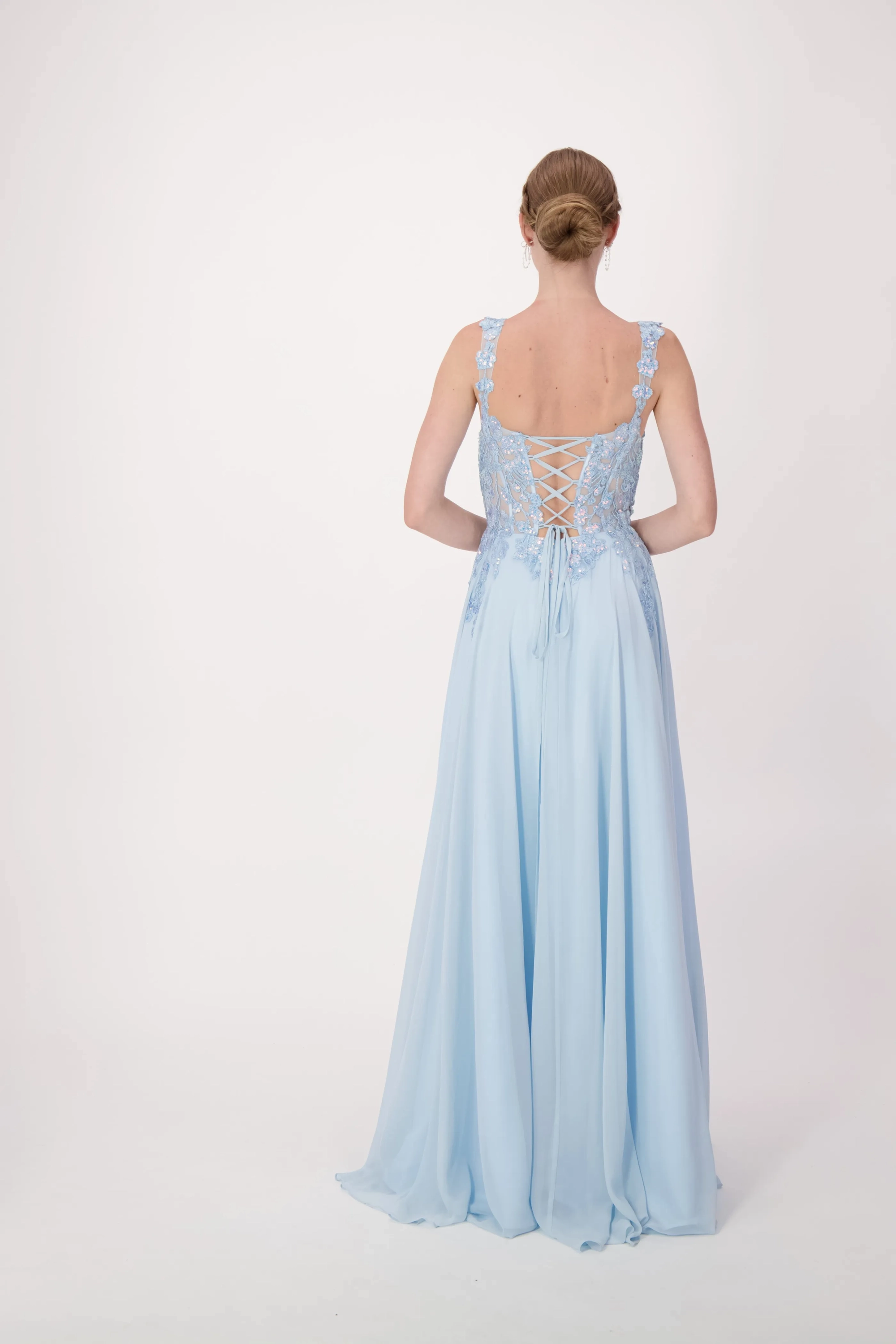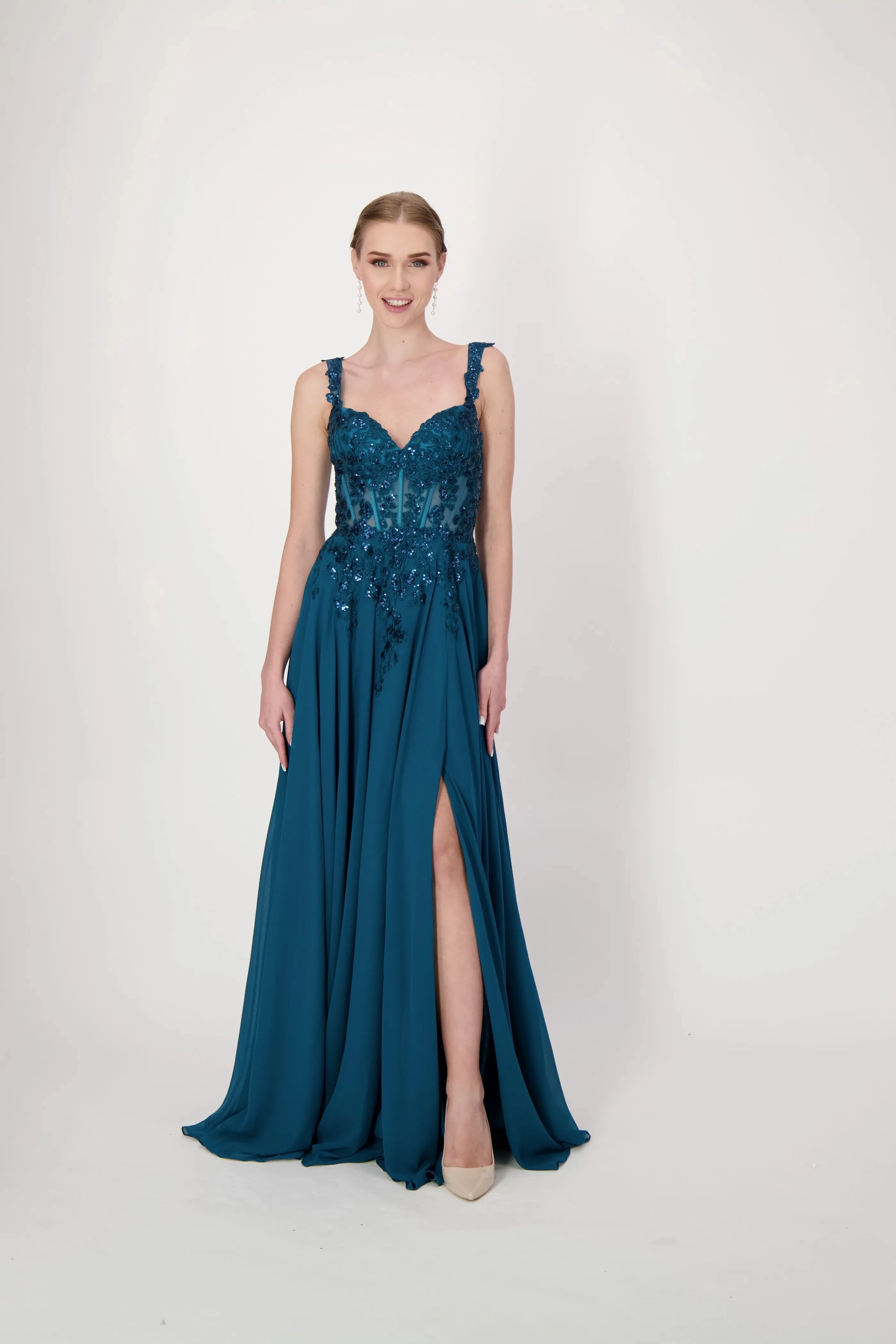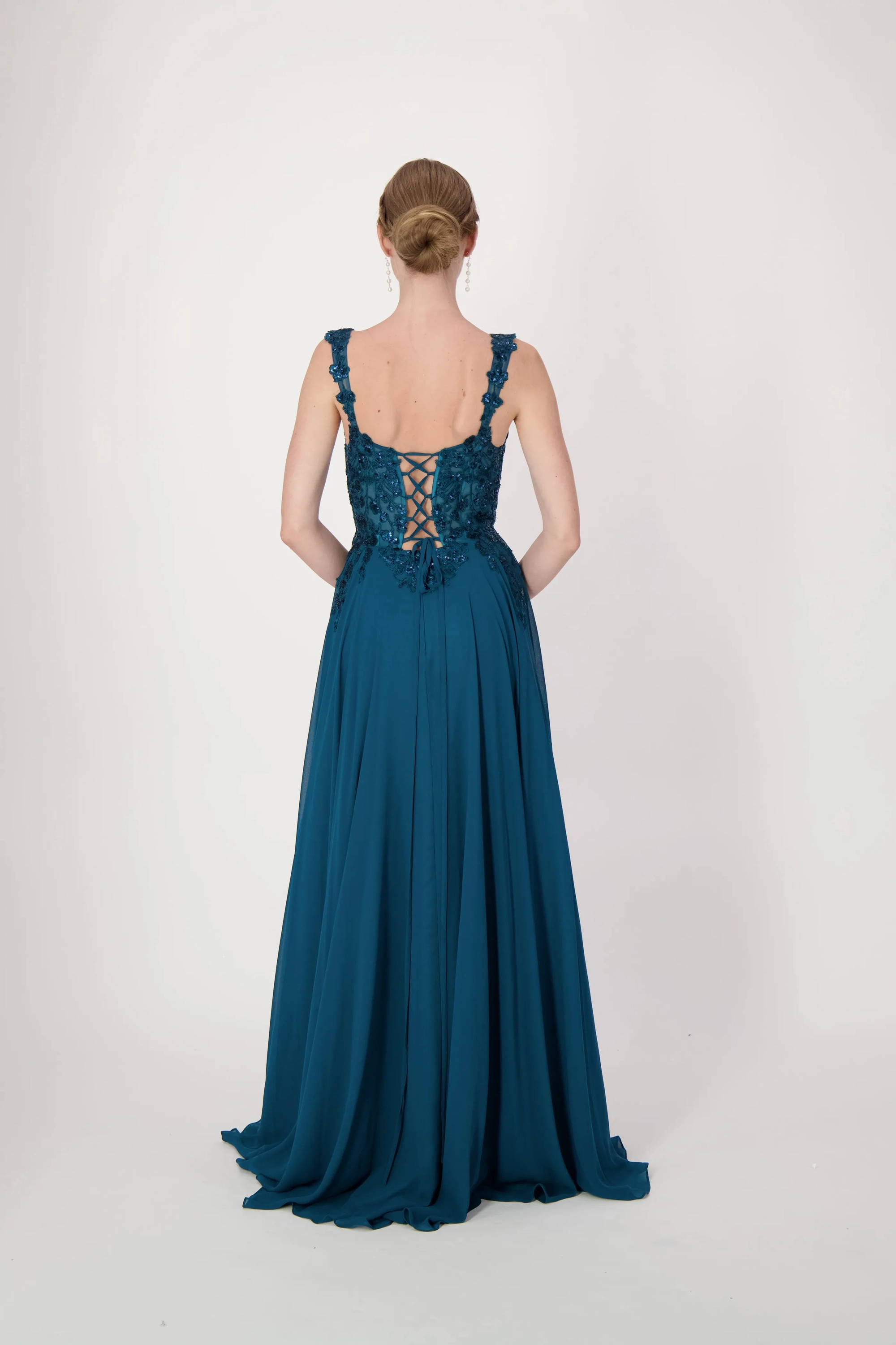 This elegant gown features a sweetheart neckline that beautifully accentuates the décolletage. The intricate lace detailing on the fitted bodice enhances the sophisticated silhouette, while the flowing A-line skirt adds a touch of timeless beauty. Perfect for formal occasions such as proms, galas, or evening events, this dress combines glamour and comfort, ensuring you stand out effortlessly. Its flattering design complements a variety of body types for a memorable, stylish look.