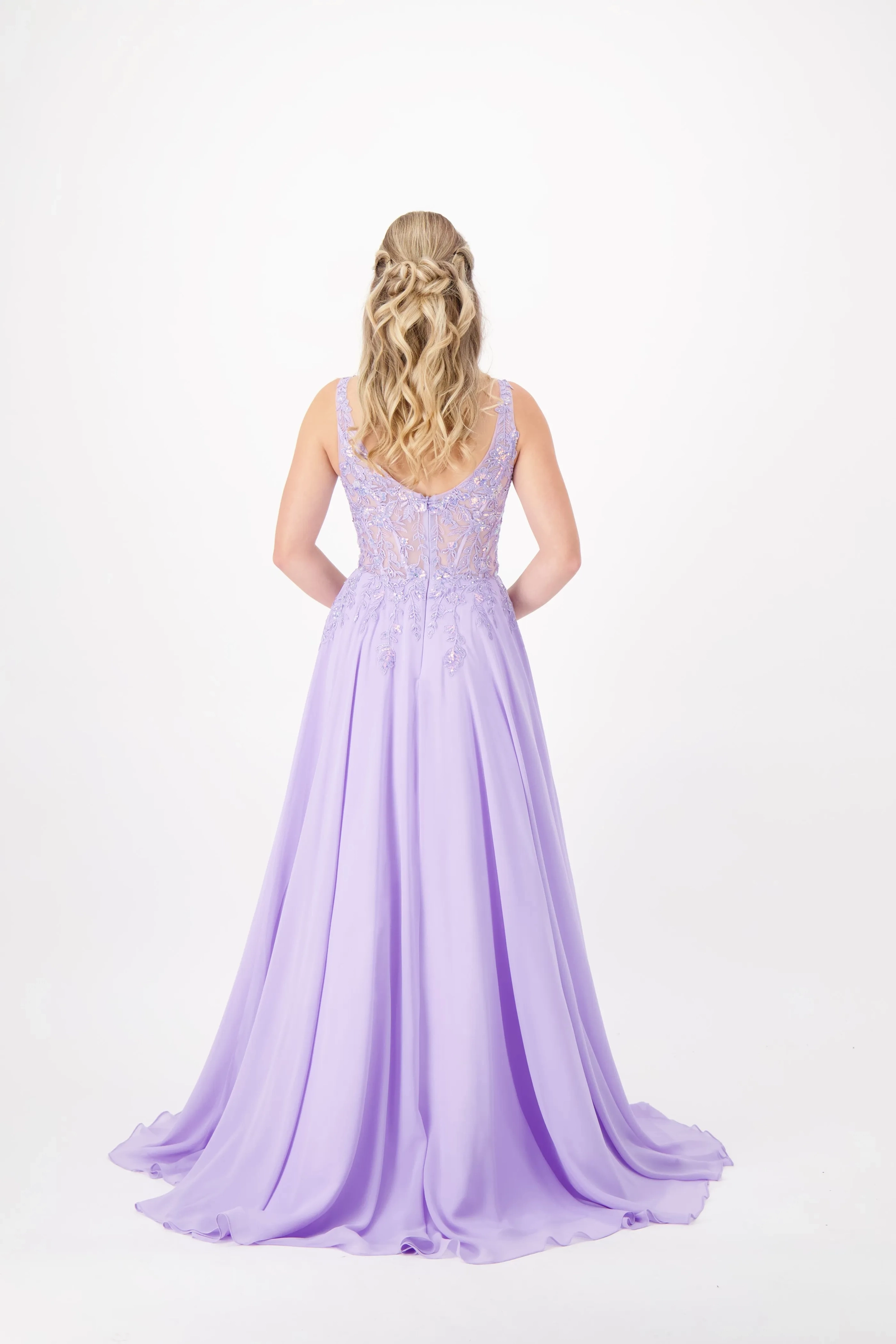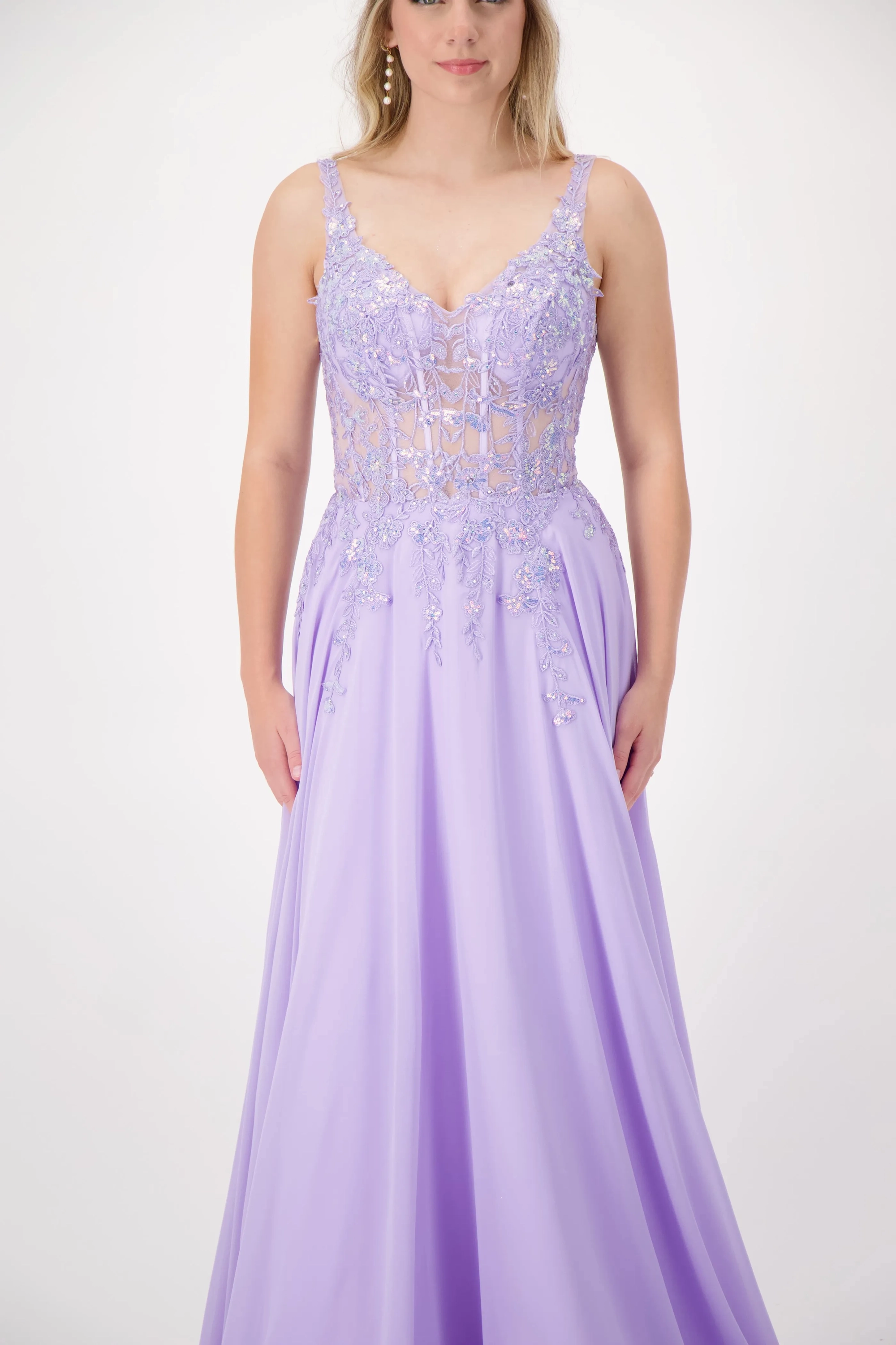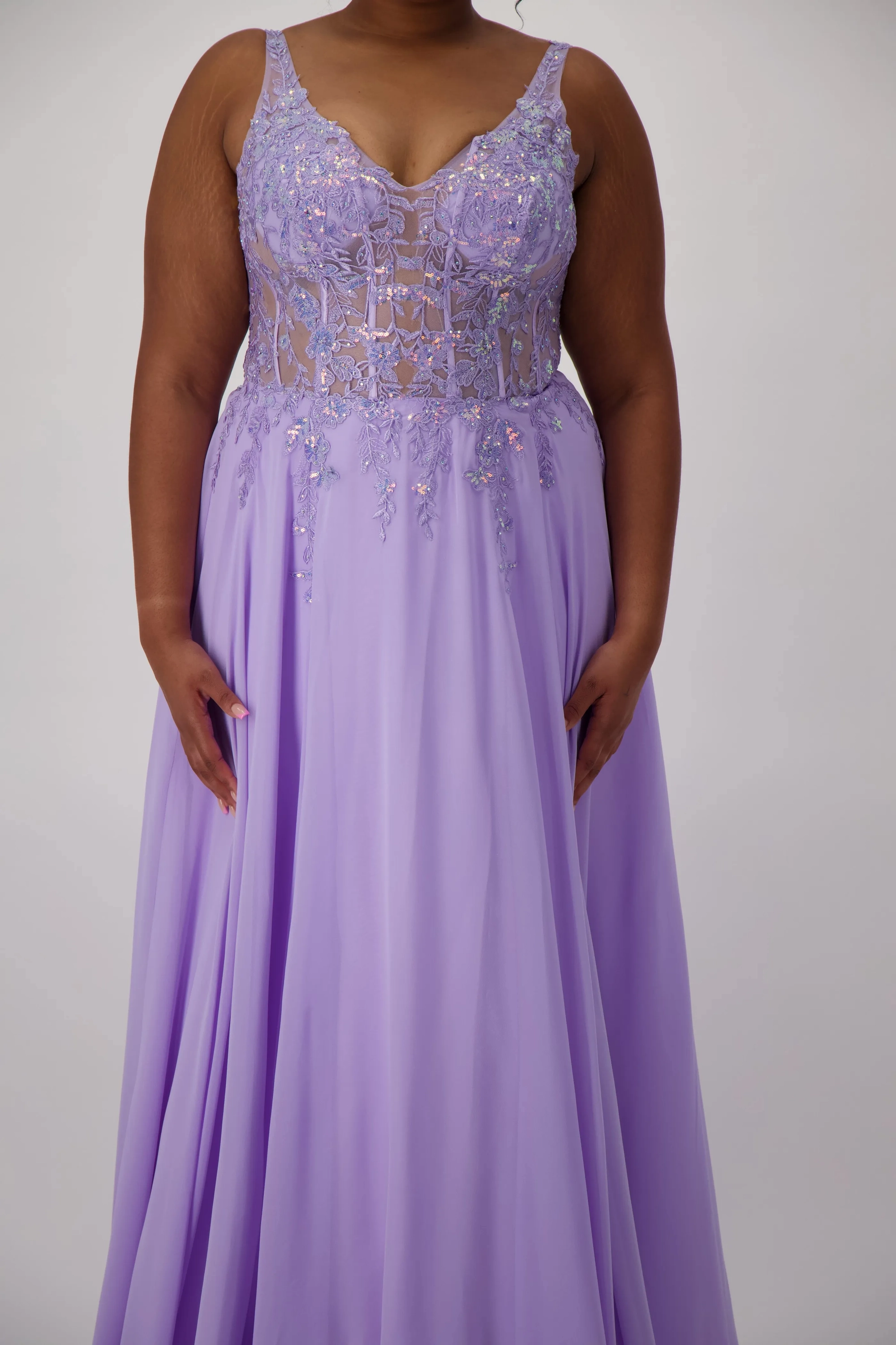 This stunning gown features a V-neckline that flows into a beautifully structured corset bodice, enhancing your natural shape while offering elegant support. The bodice is adorned with delicate embellishments, adding a touch of sparkle and luxury to the overall design. The flowing skirt creates a graceful silhouette, perfect for prom or any formal event where you want to make a sophisticated statement.