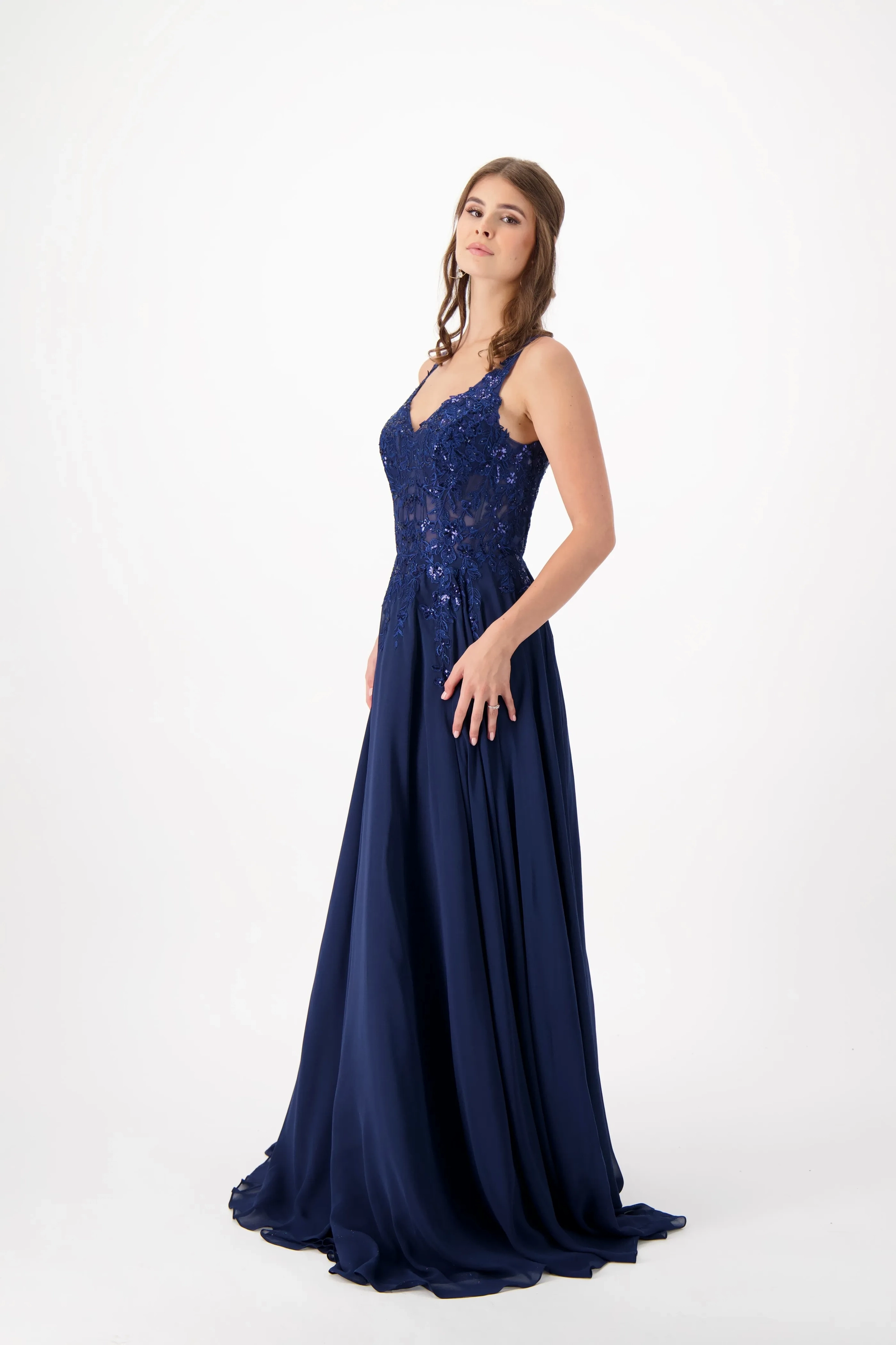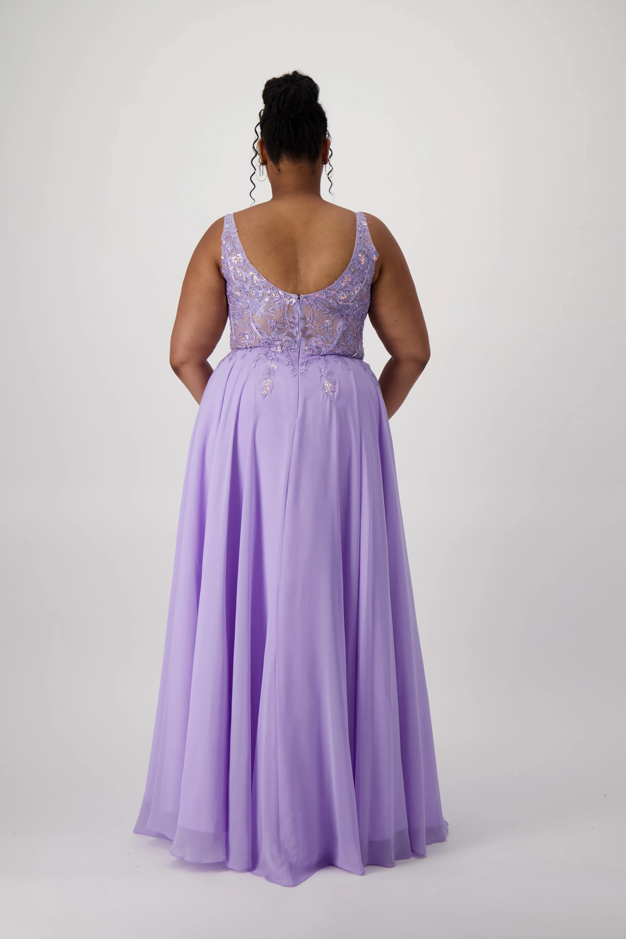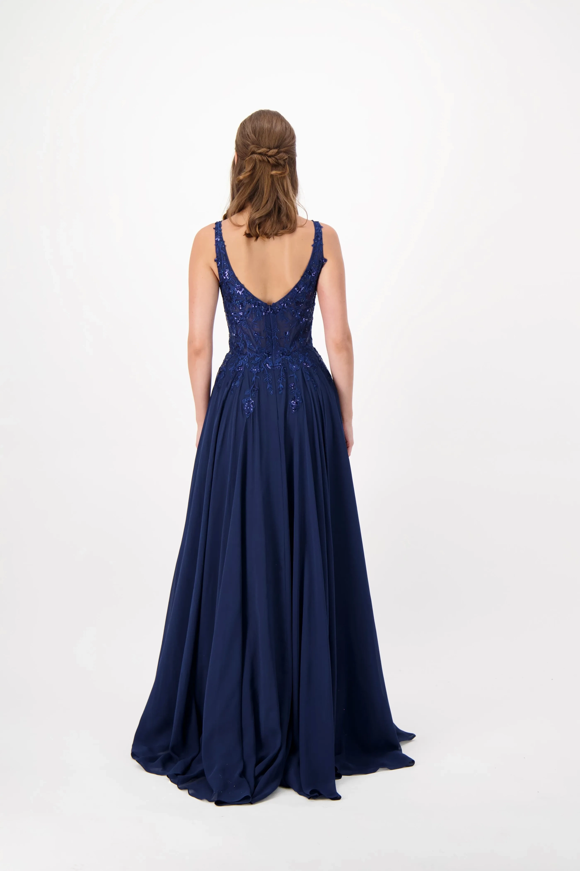This stunning gown features a V-neckline that flows into a beautifully structured corset bodice, enhancing your natural shape while offering elegant support. The bodice is adorned with delicate embellishments, adding a touch of sparkle and luxury to the overall design. The flowing skirt creates a graceful silhouette, perfect for prom or any formal event where you want to make a sophisticated statement.