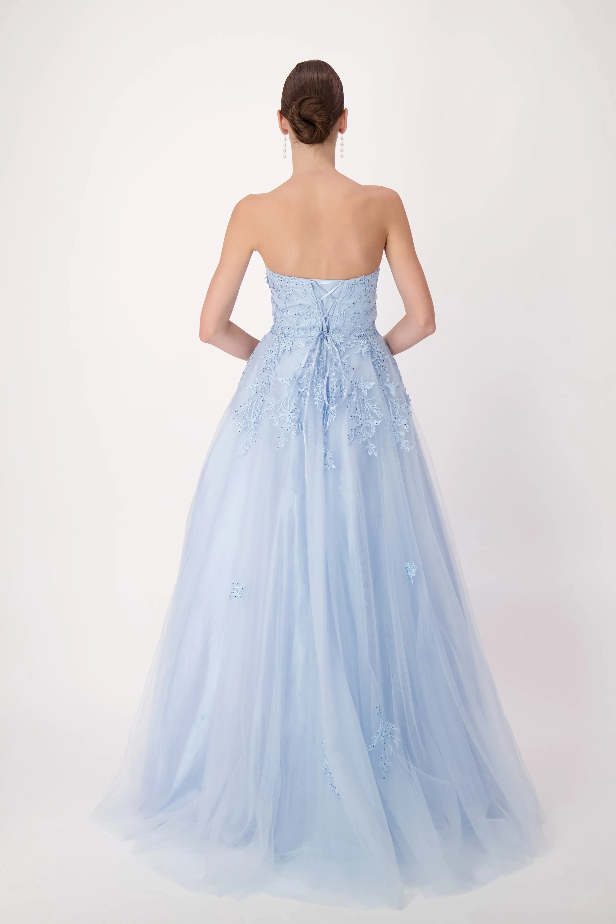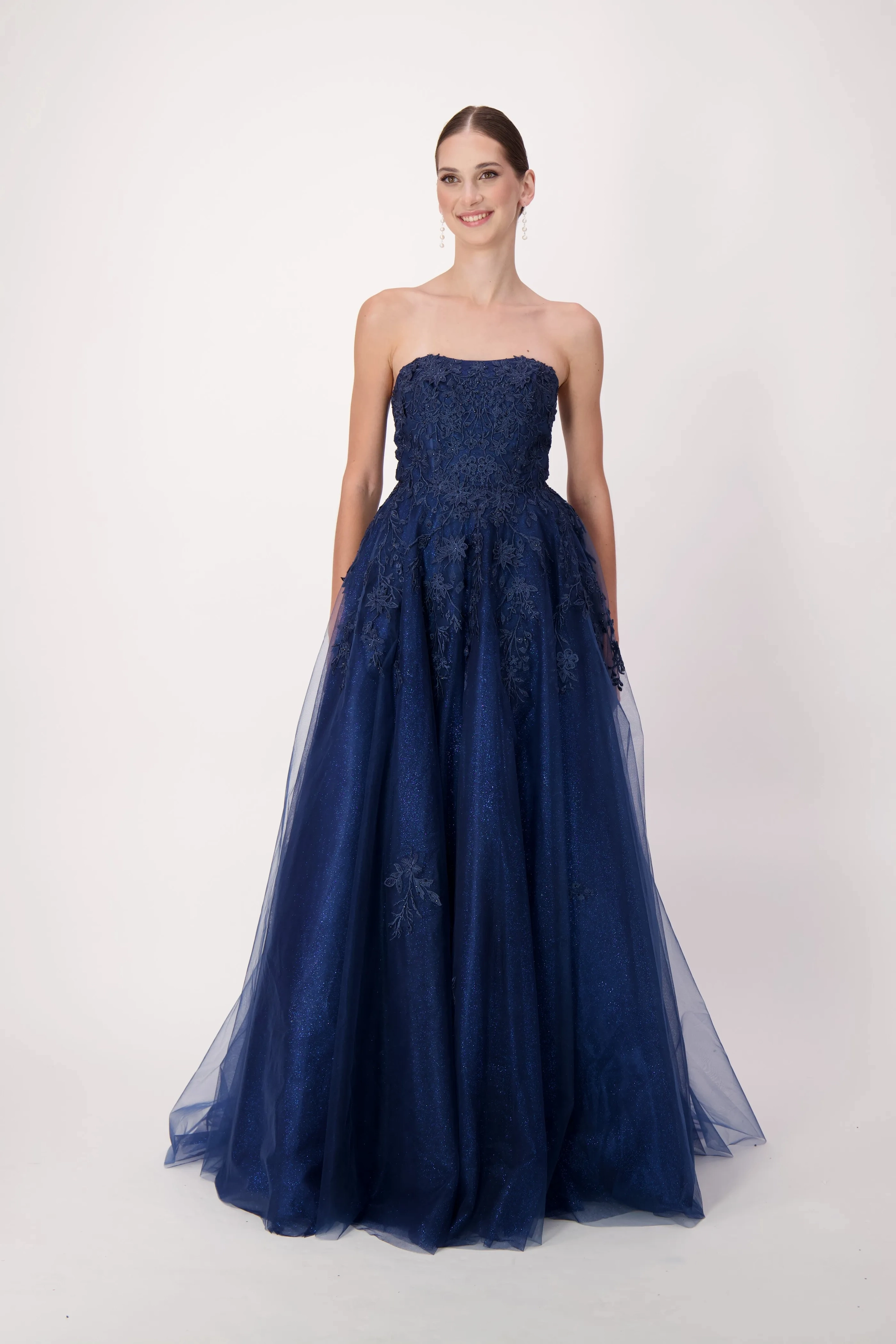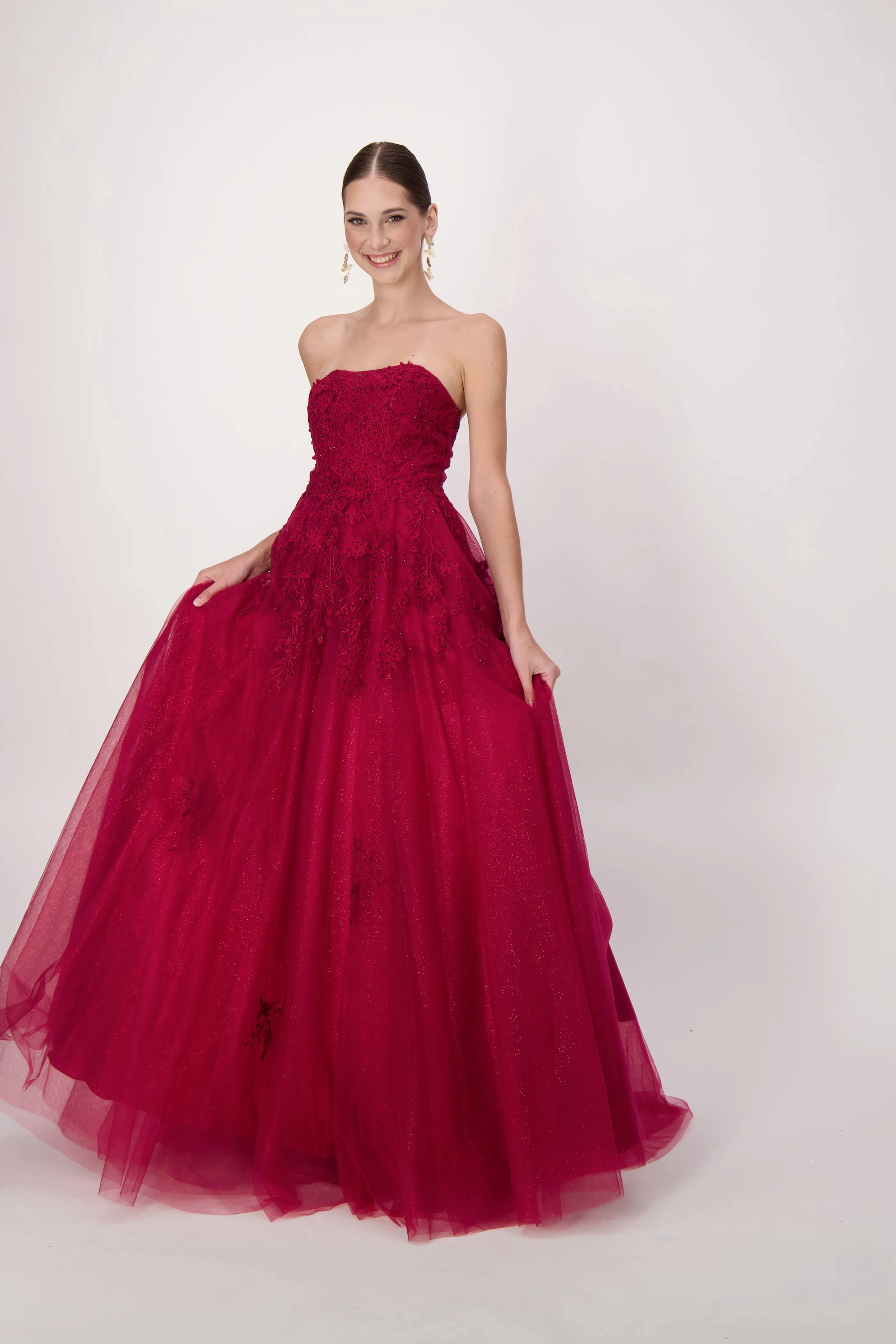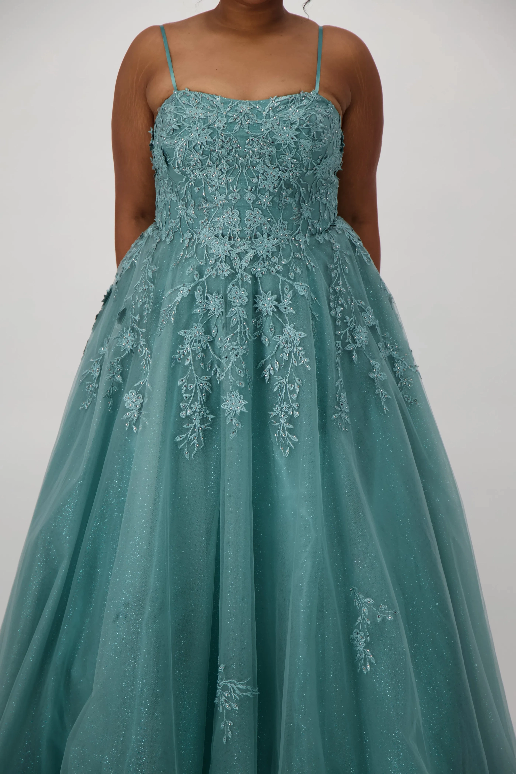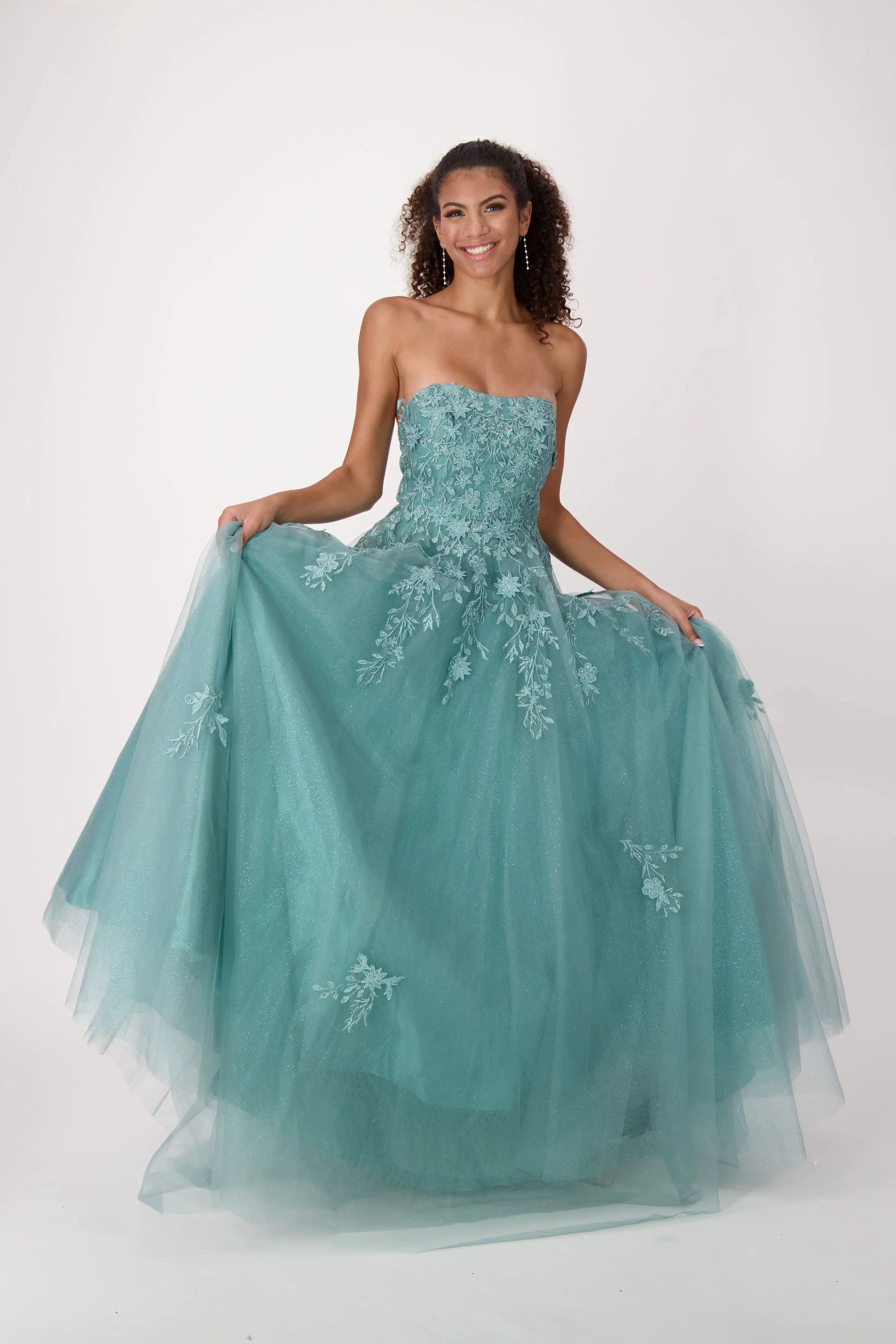 This dress showcases an elegant strapless sweetheart neckline, accompanied by a beautifully embellished corset bodice. The voluminous tulle skirt adds an air of luxury and sophistication, ideal for special occasions like prom, quinceaƱera, or formal events. The delicate lace appliquƩ and intricate beading throughout the gown make it a standout choice for anyone looking to make a statement with a classic and timeless look. Perfect for those seeking a balance of regal elegance and modern flair.