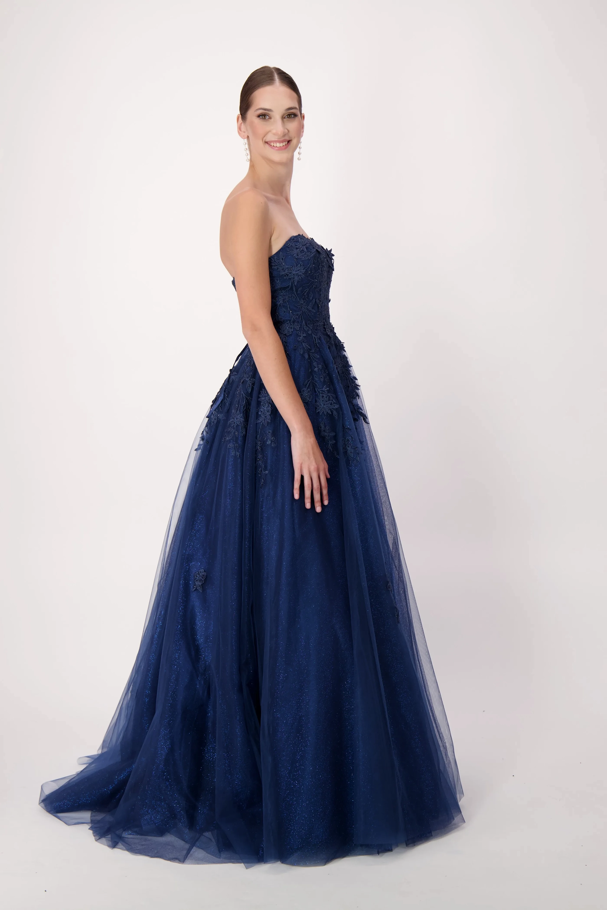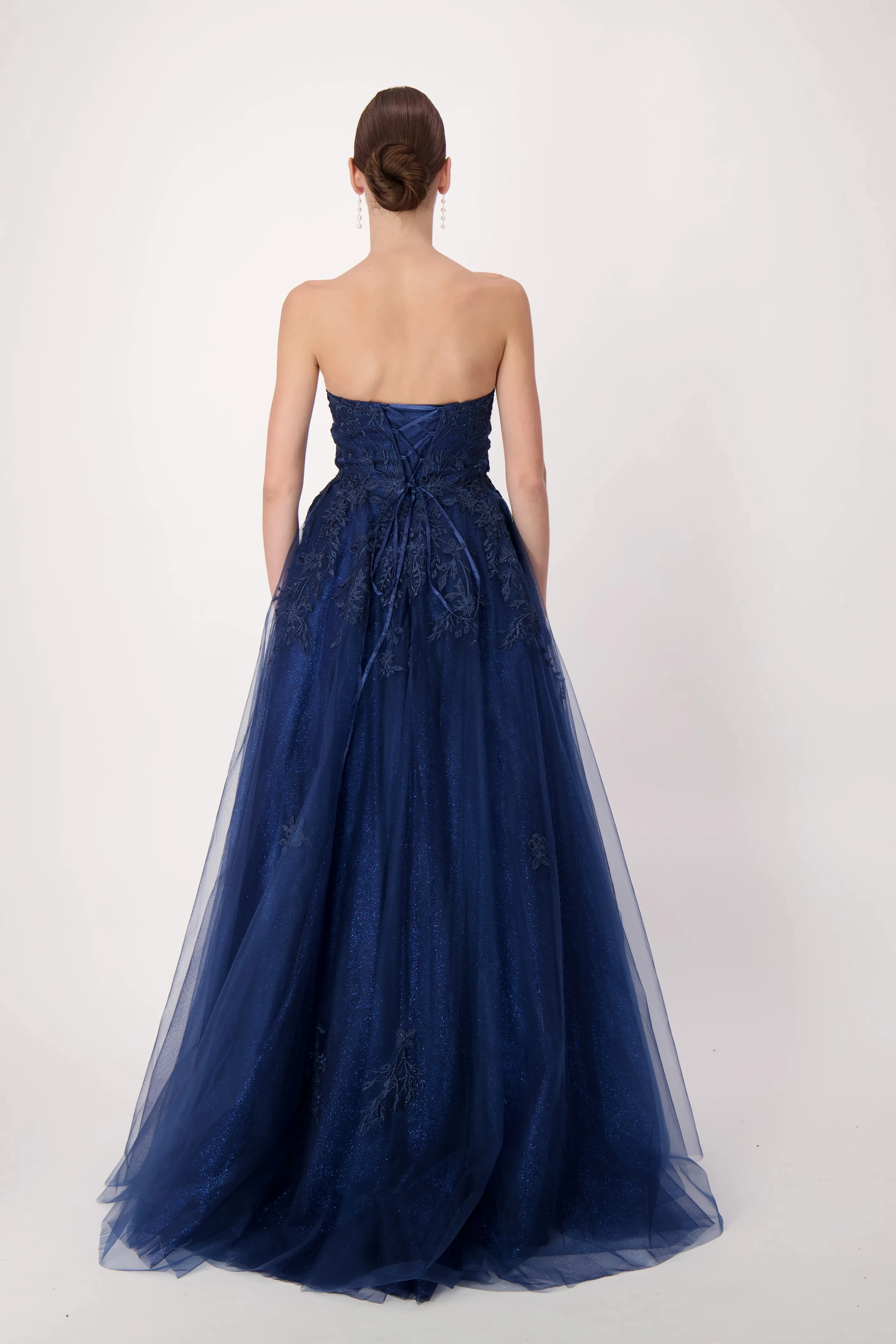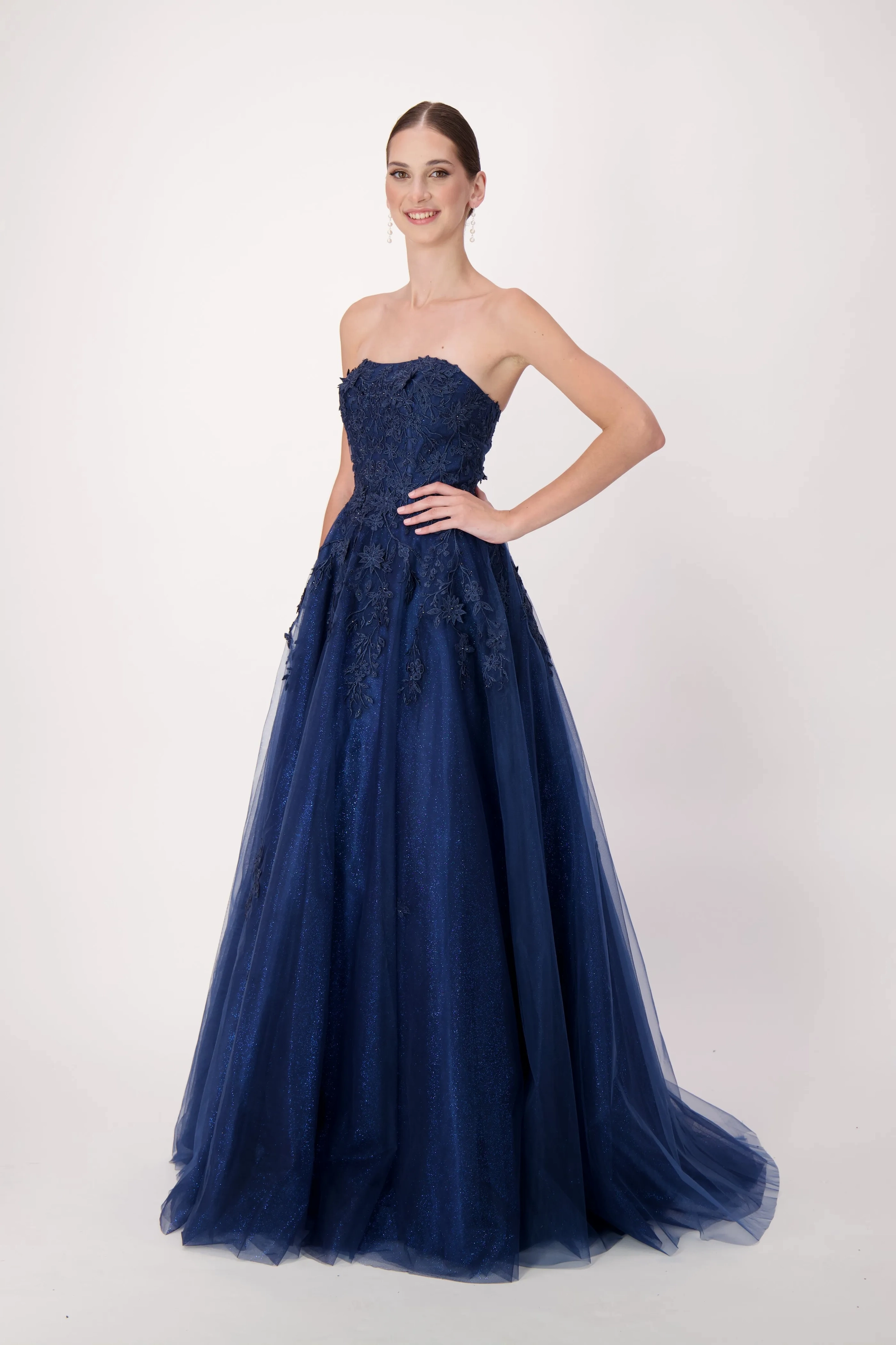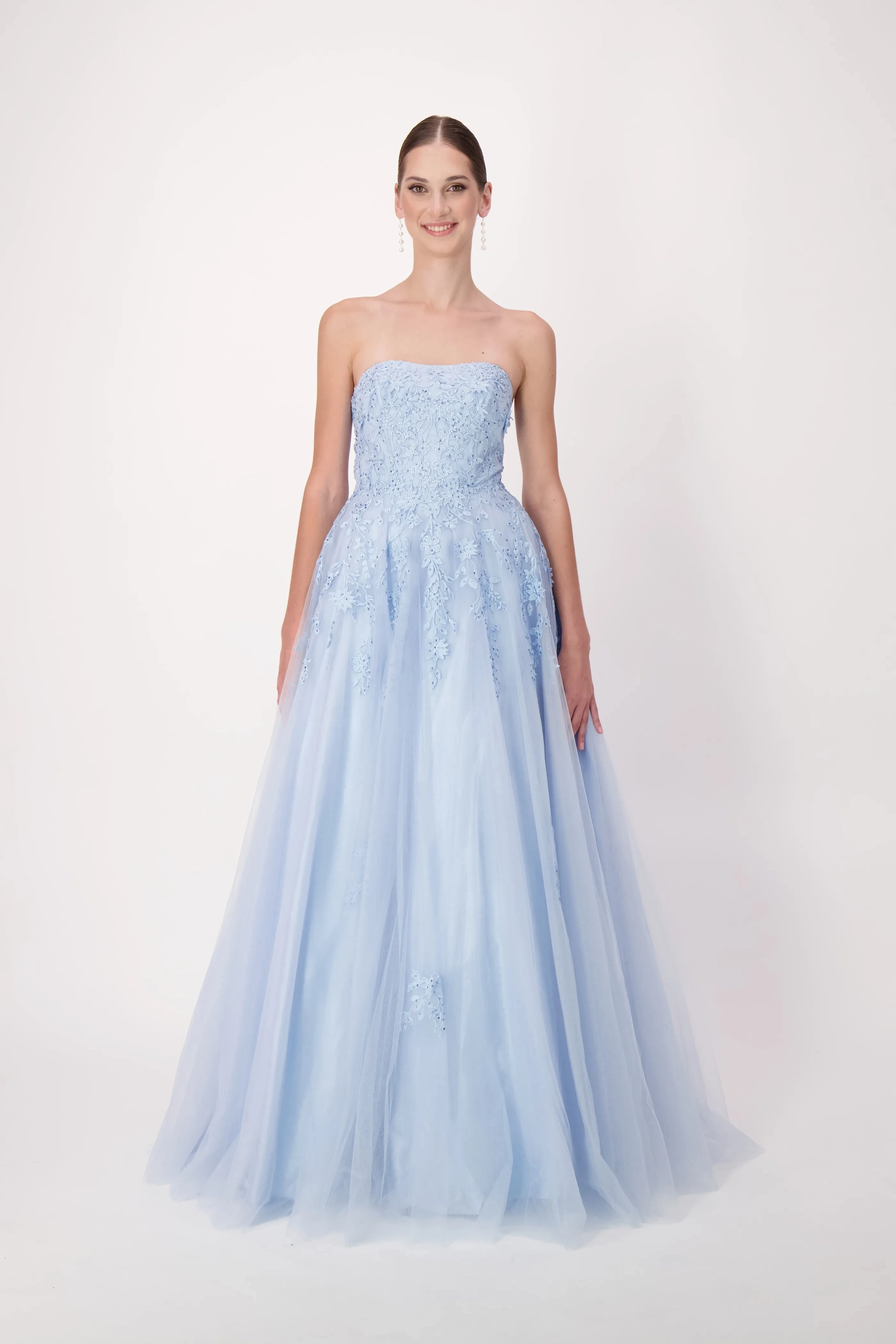 This dress showcases an elegant strapless sweetheart neckline, accompanied by a beautifully embellished corset bodice. The voluminous tulle skirt adds an air of luxury and sophistication, ideal for special occasions like prom, quinceaƱera, or formal events. The delicate lace appliquƩ and intricate beading throughout the gown make it a standout choice for anyone looking to make a statement with a classic and timeless look. Perfect for those seeking a balance of regal elegance and modern flair.