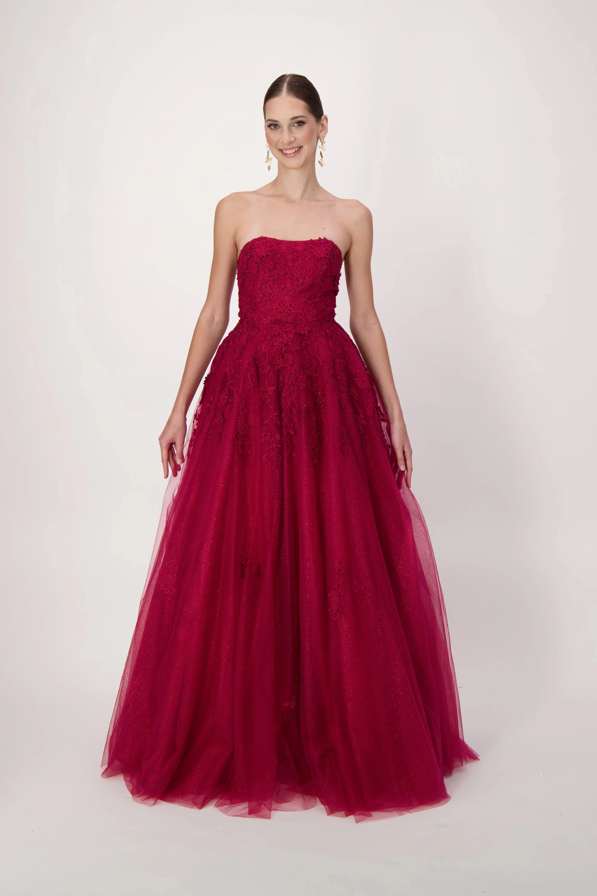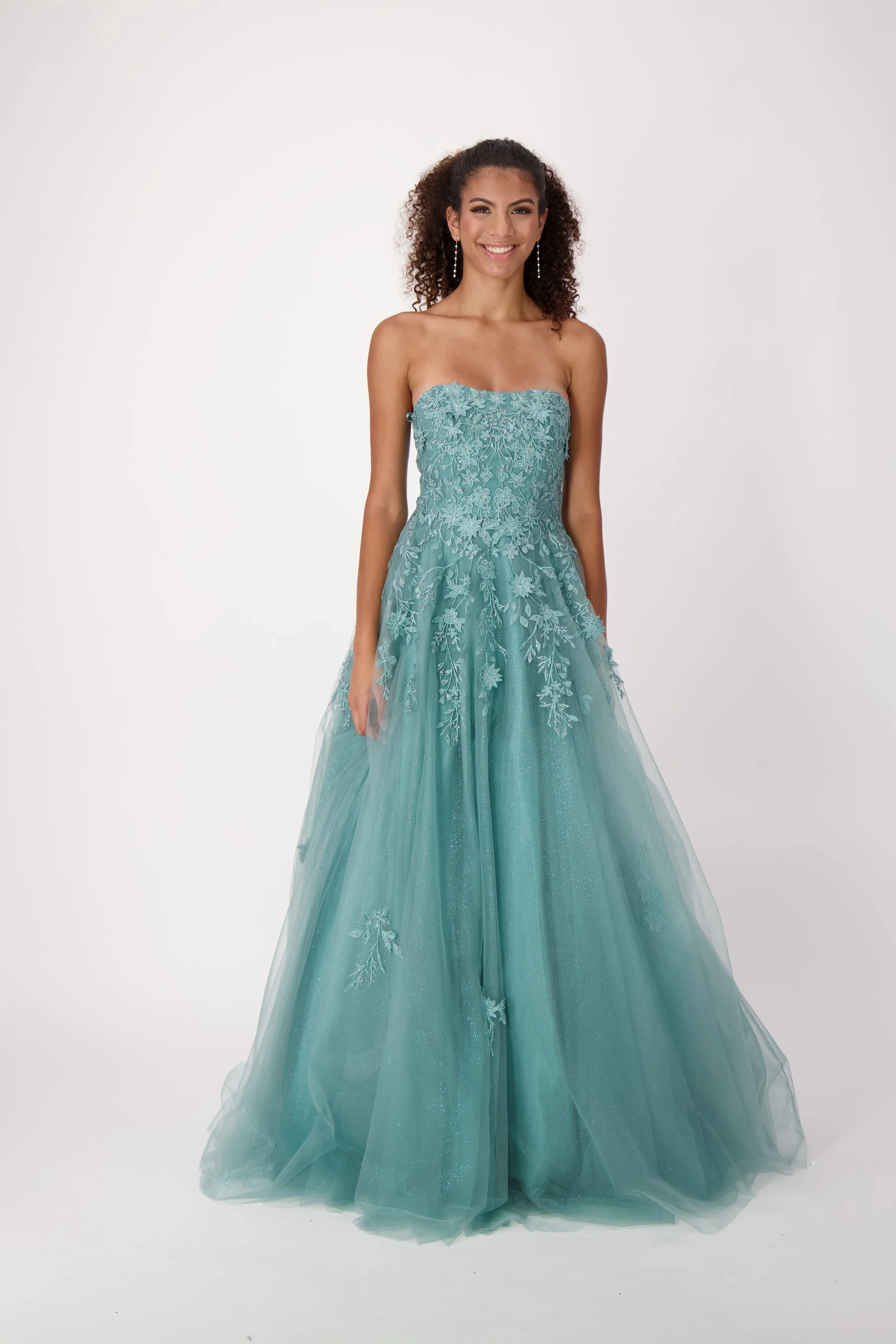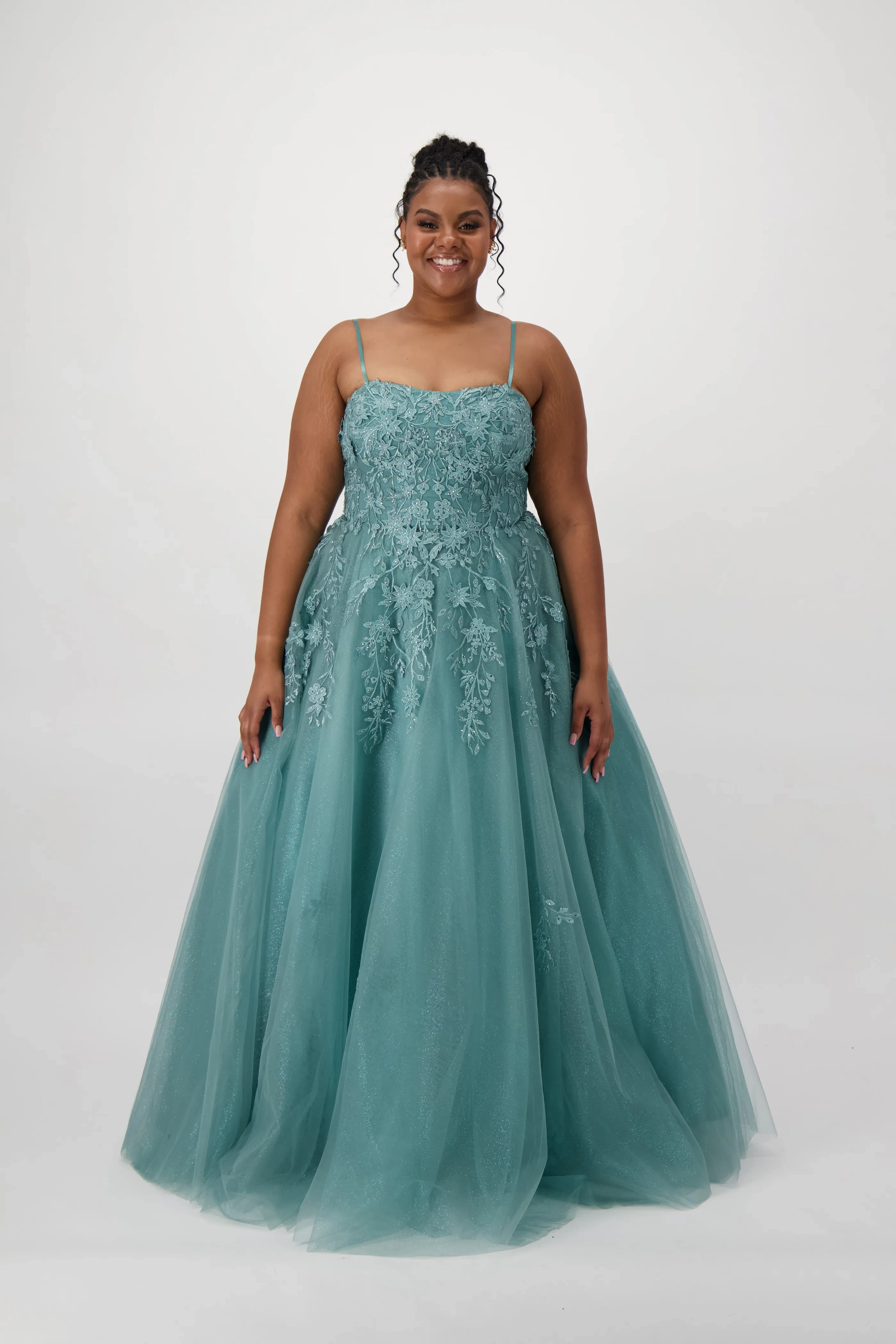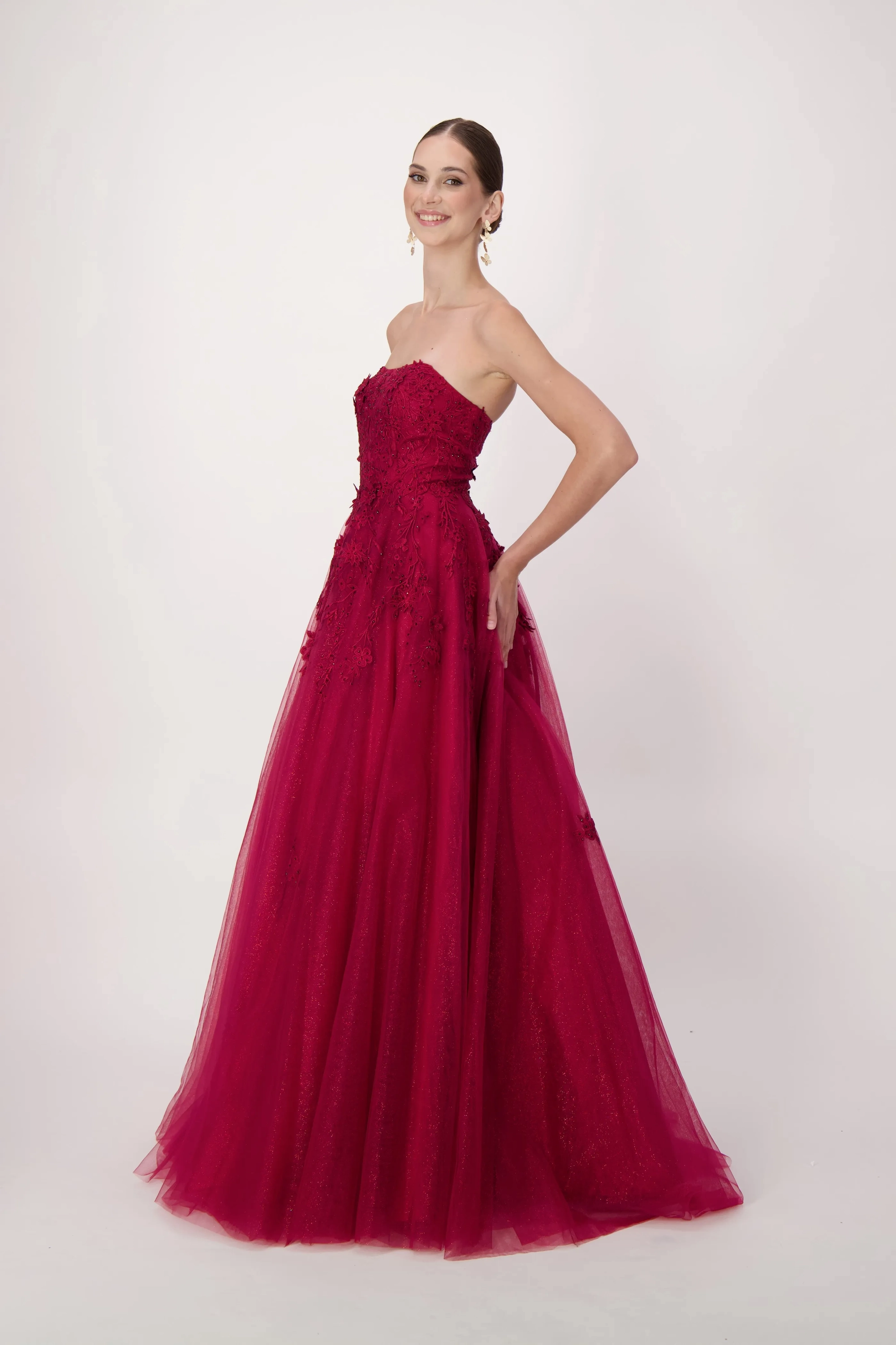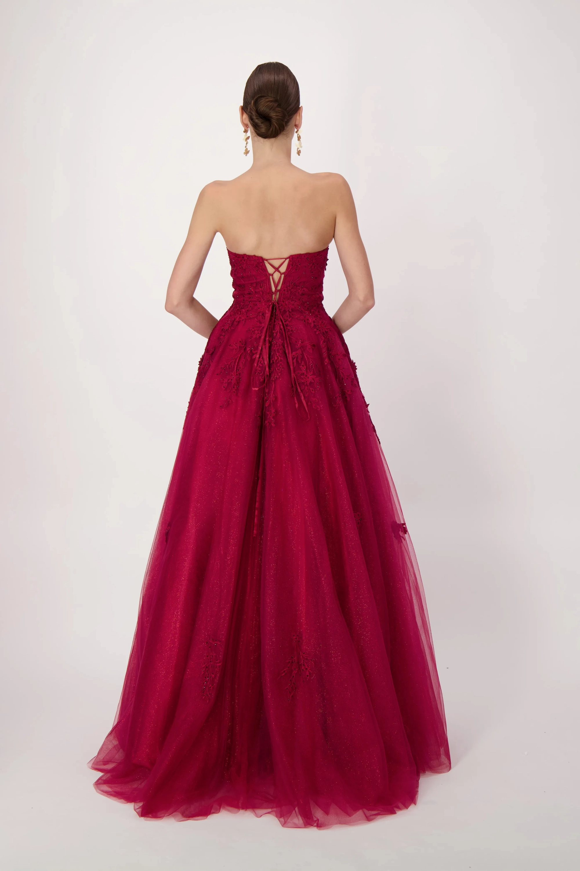 This dress showcases an elegant strapless sweetheart neckline, accompanied by a beautifully embellished corset bodice. The voluminous tulle skirt adds an air of luxury and sophistication, ideal for special occasions like prom, quinceaƱera, or formal events. The delicate lace appliquƩ and intricate beading throughout the gown make it a standout choice for anyone looking to make a statement with a classic and timeless look. Perfect for those seeking a balance of regal elegance and modern flair.