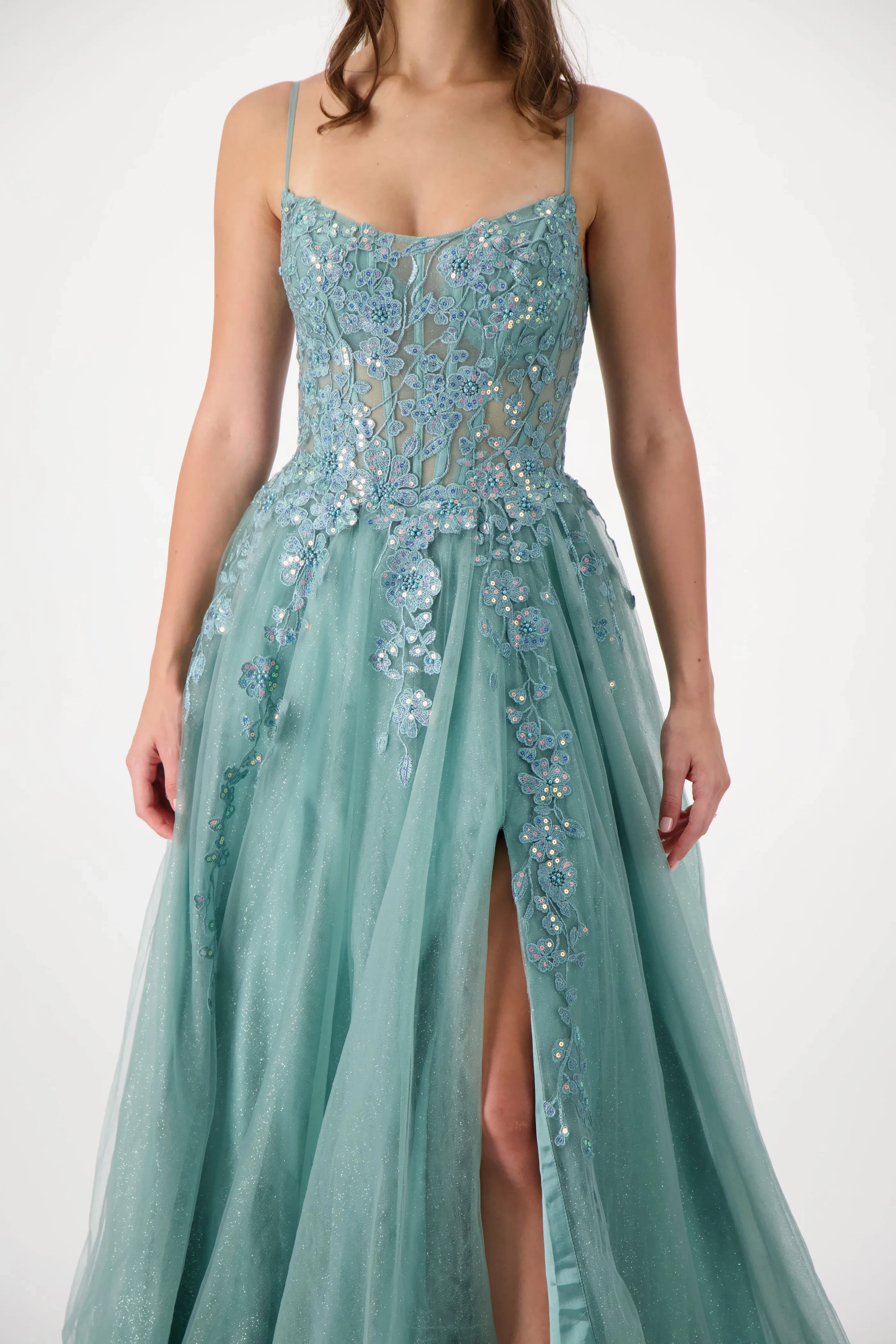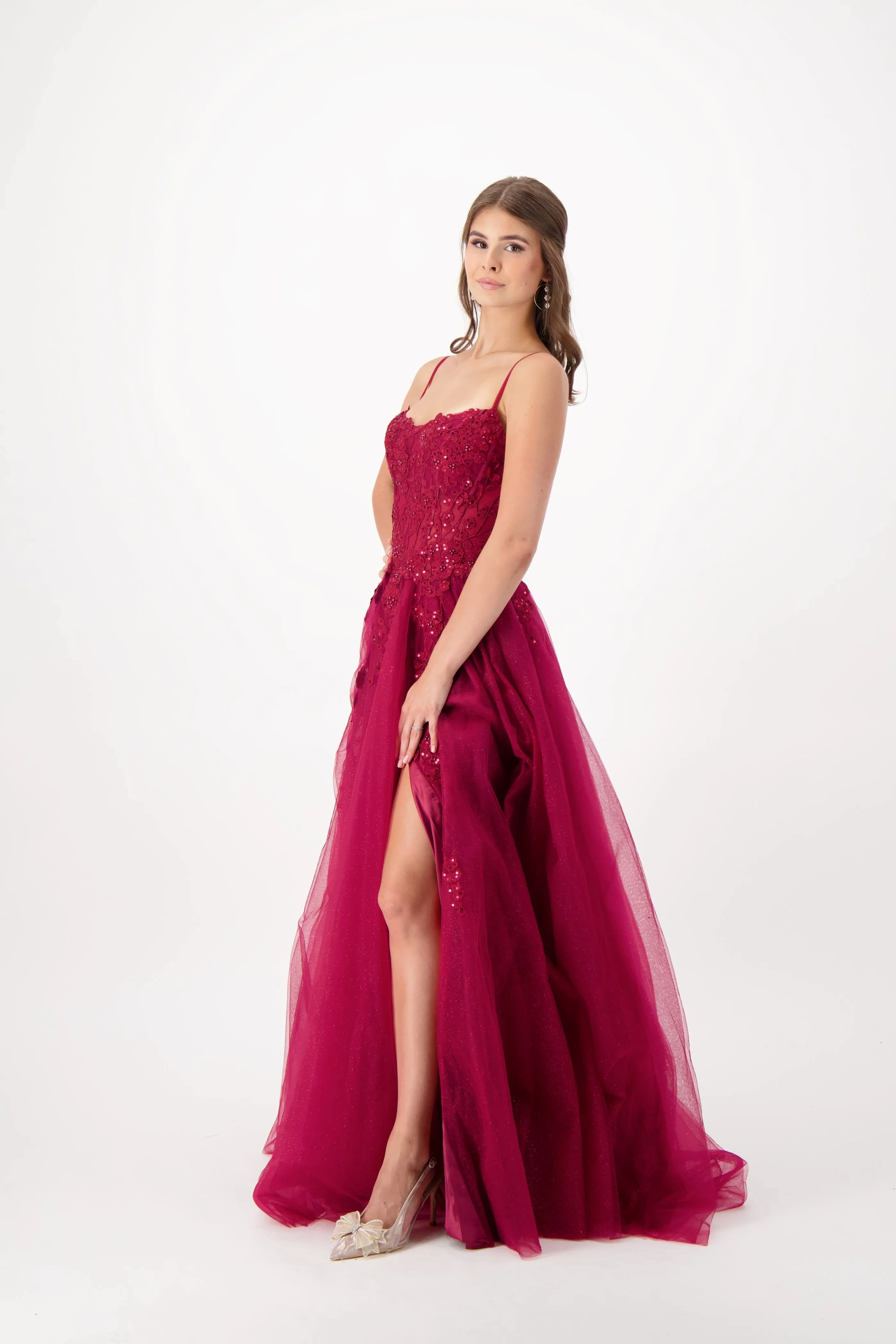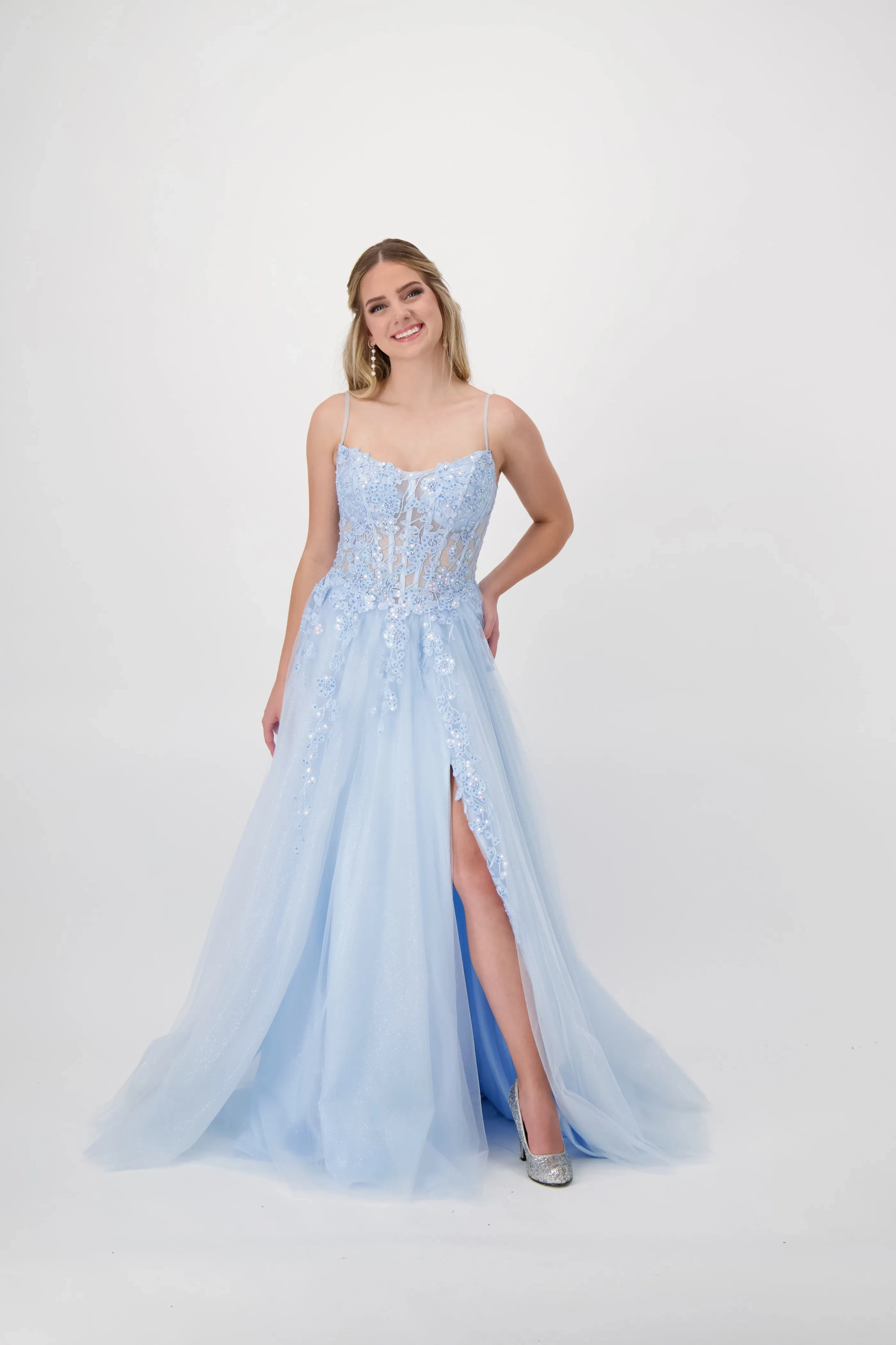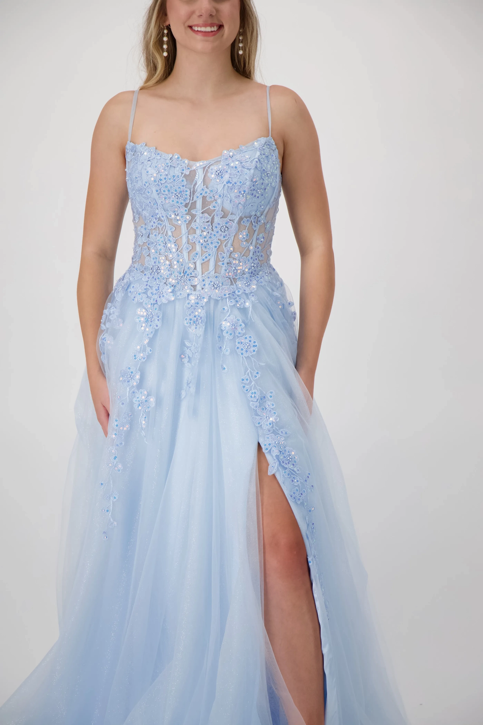This gown features a sweetheart neckline and a corset bodice, adorned with intricate floral embellishments. The design beautifully blends elegance and modernity, with a shimmering chiffon skirt that adds movement and sparkle to your look. The high side slit adds a touch of allure while maintaining sophistication, making this dress a perfect choice for prom or any glamorous occasion.