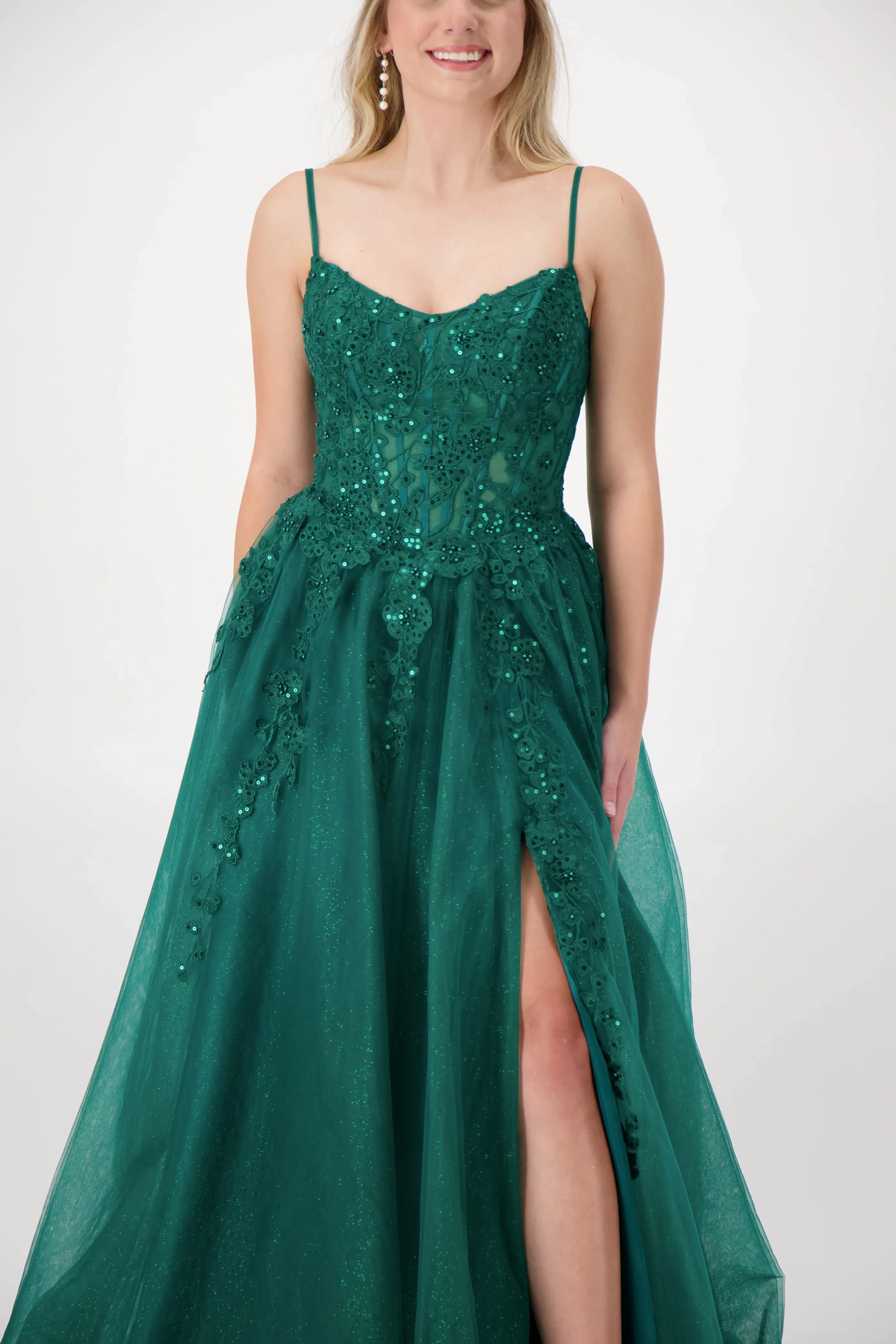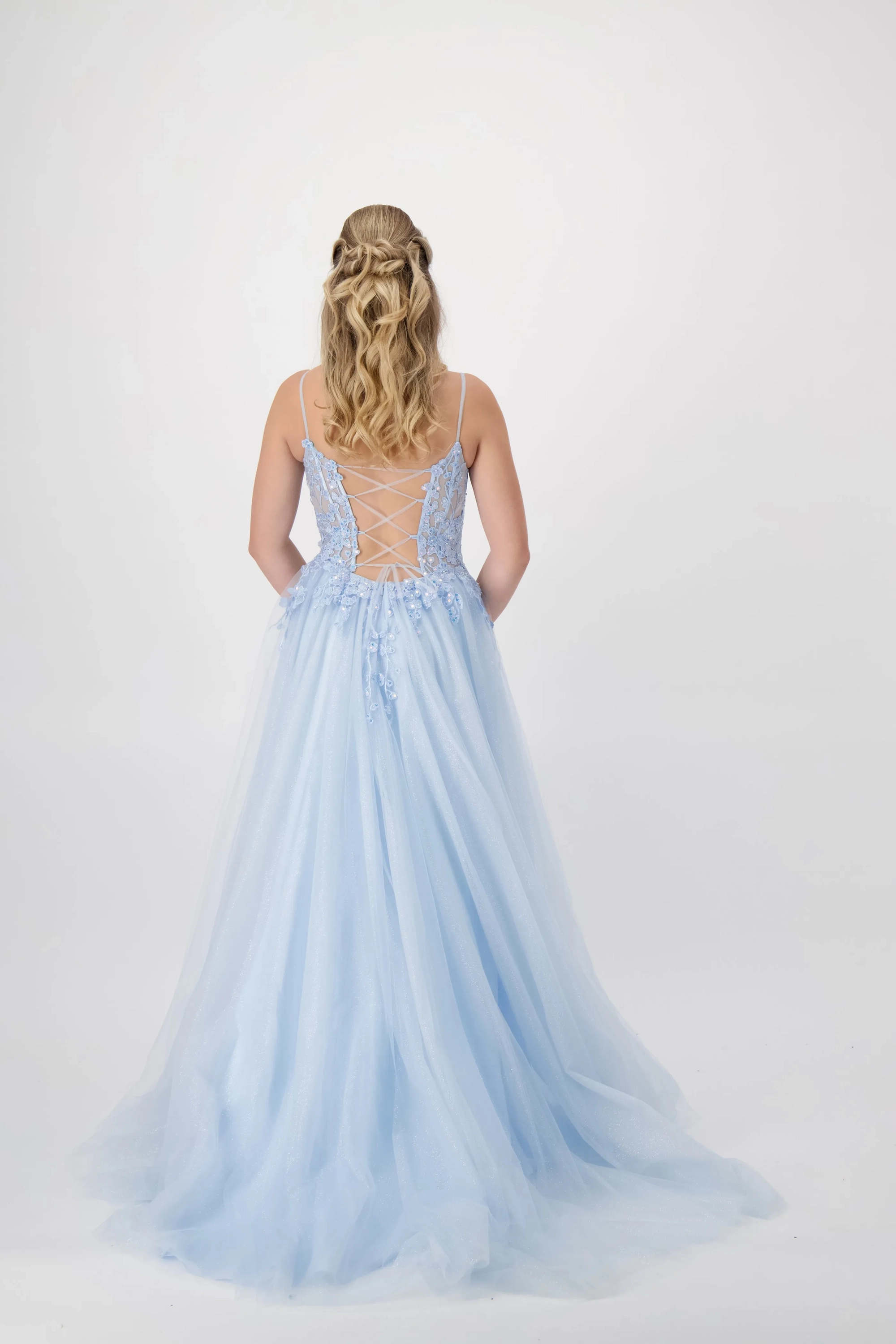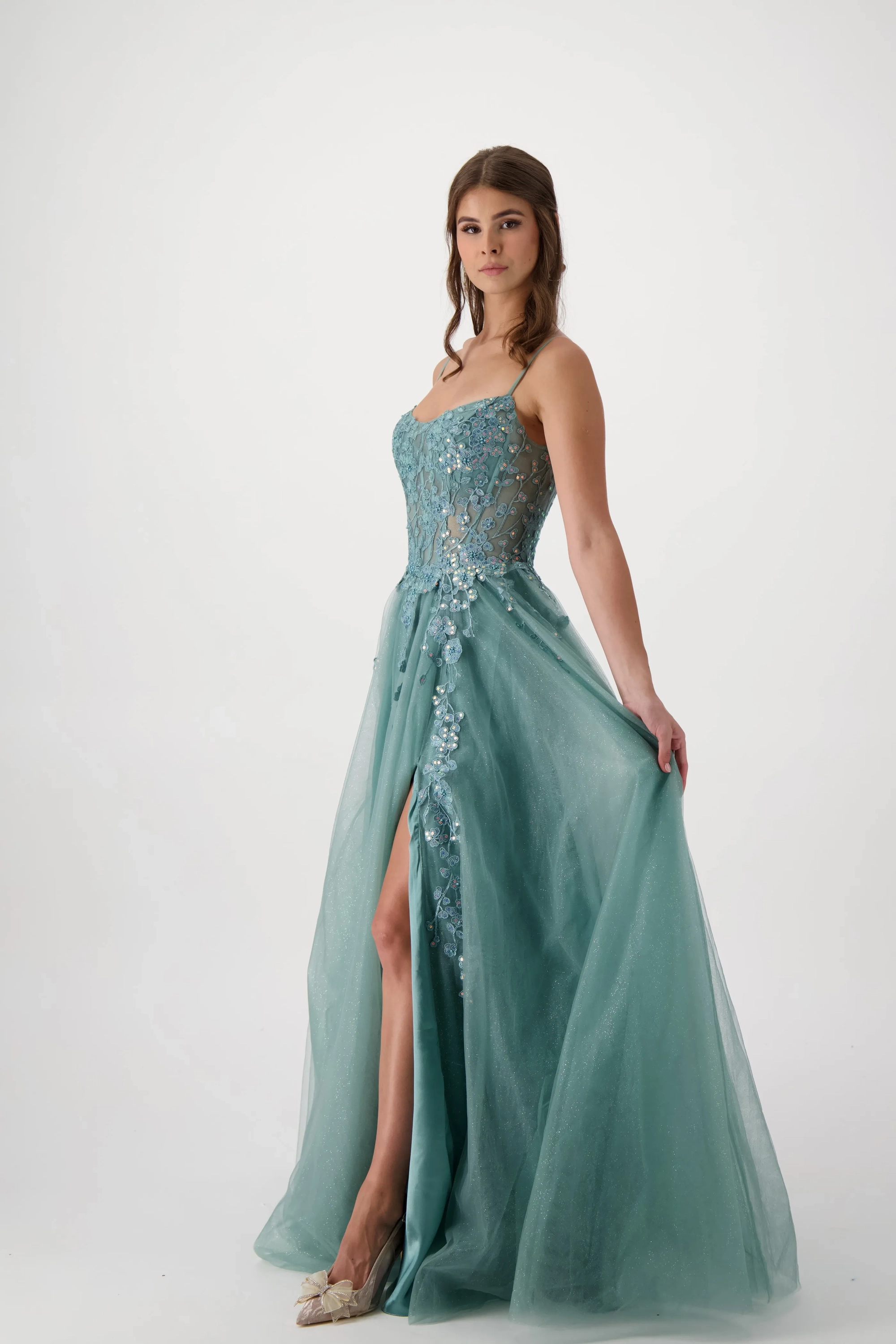 This gown features a sweetheart neckline and a corset bodice, adorned with intricate floral embellishments. The design beautifully blends elegance and modernity, with a shimmering chiffon skirt that adds movement and sparkle to your look. The high side slit adds a touch of allure while maintaining sophistication, making this dress a perfect choice for prom or any glamorous occasion.