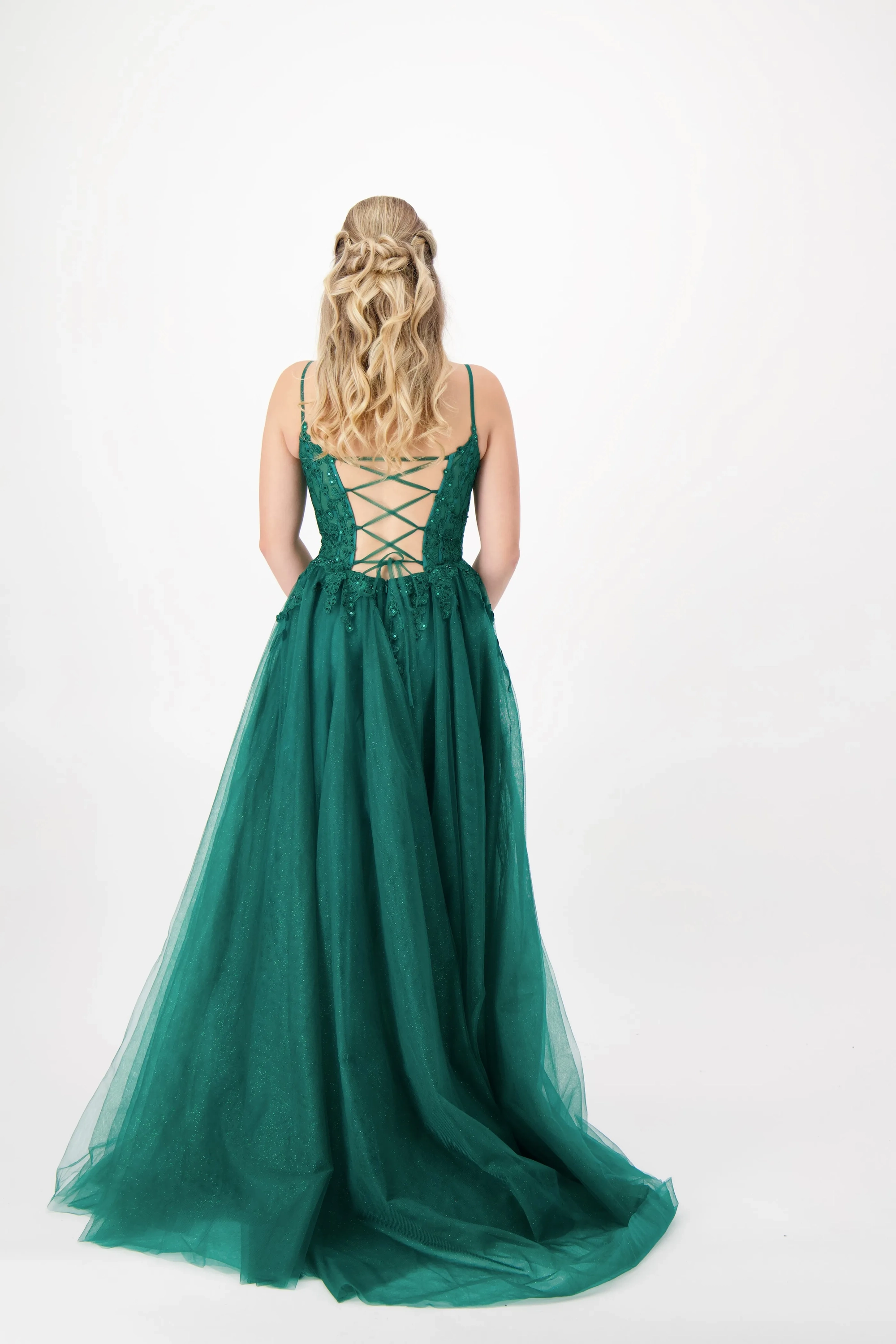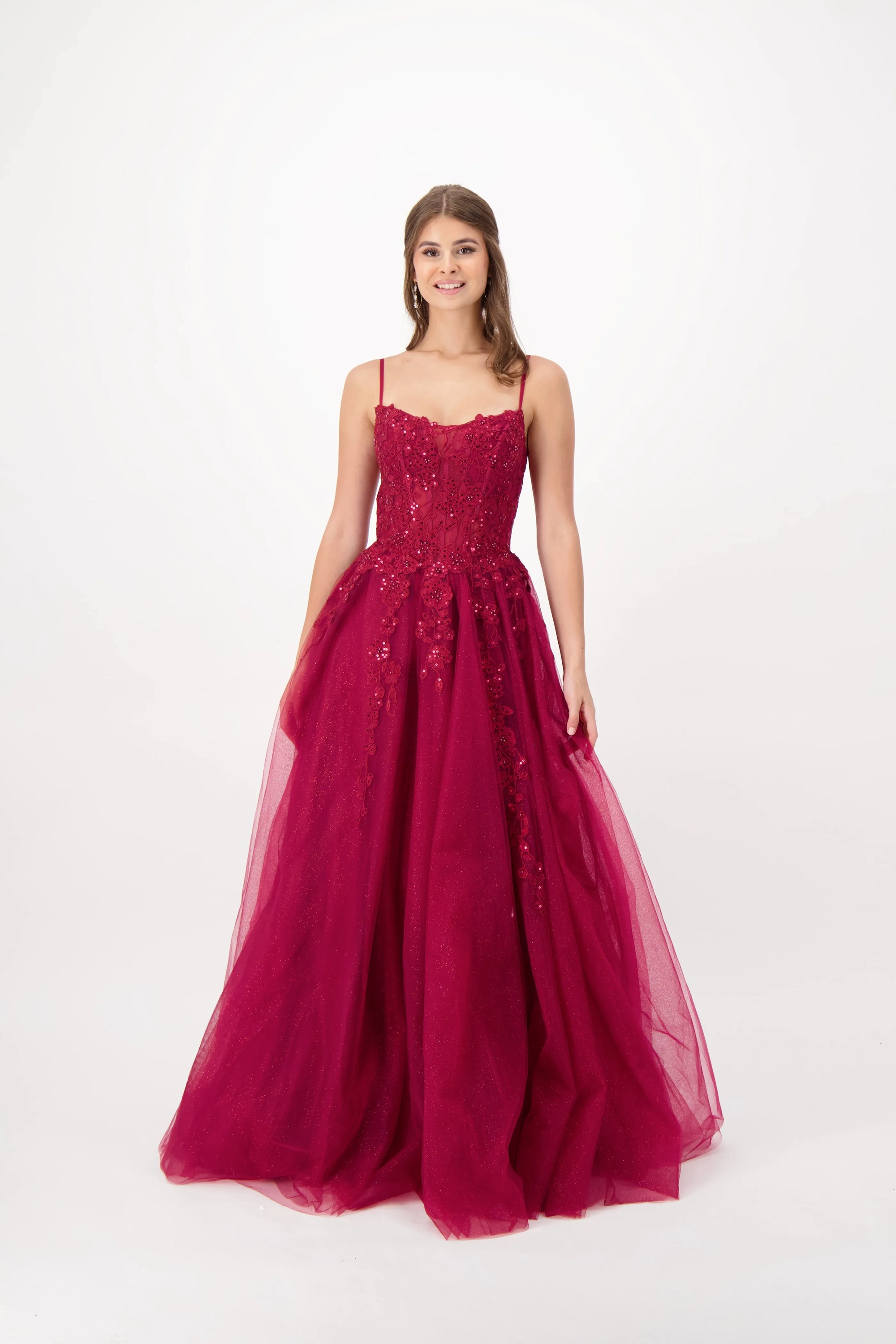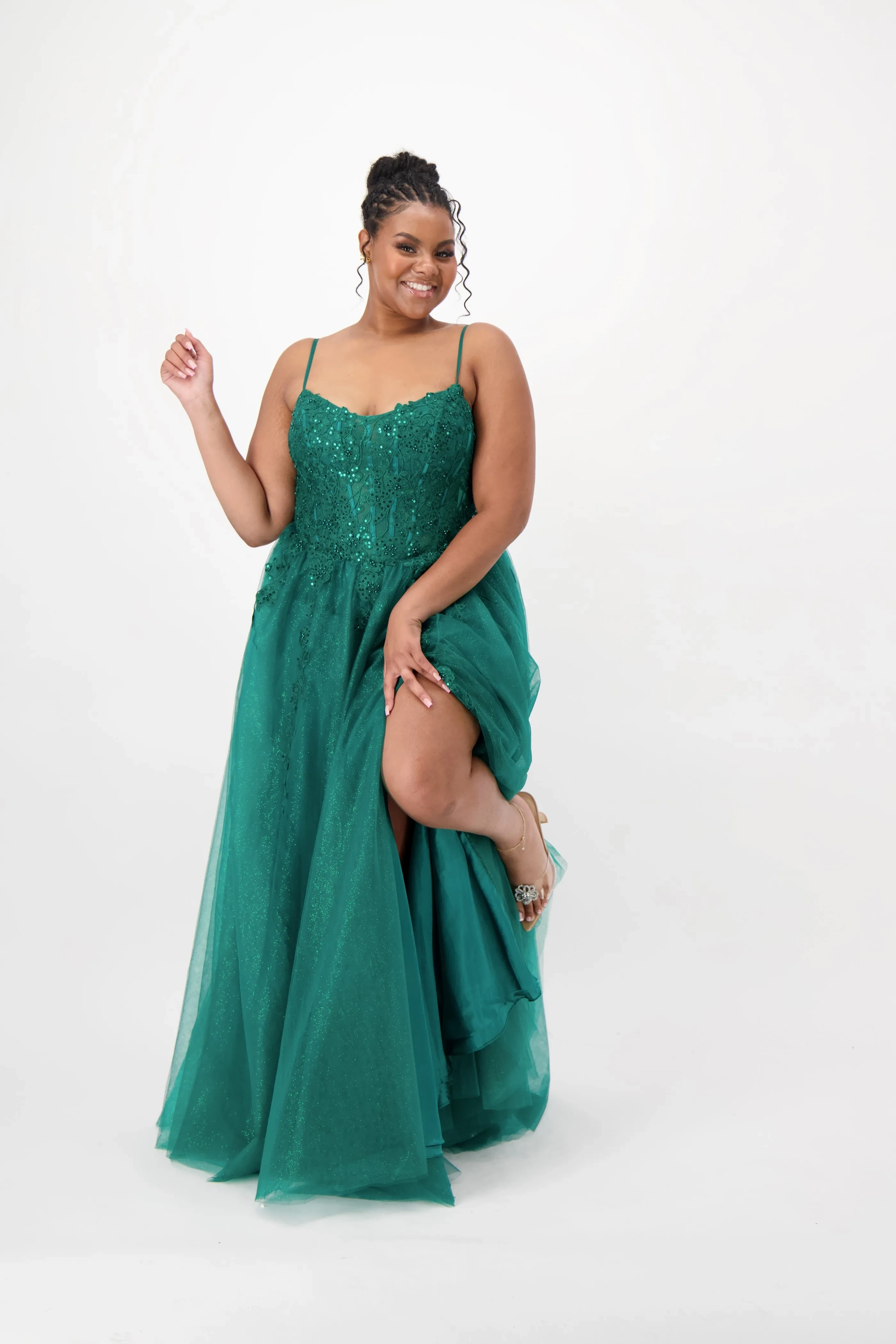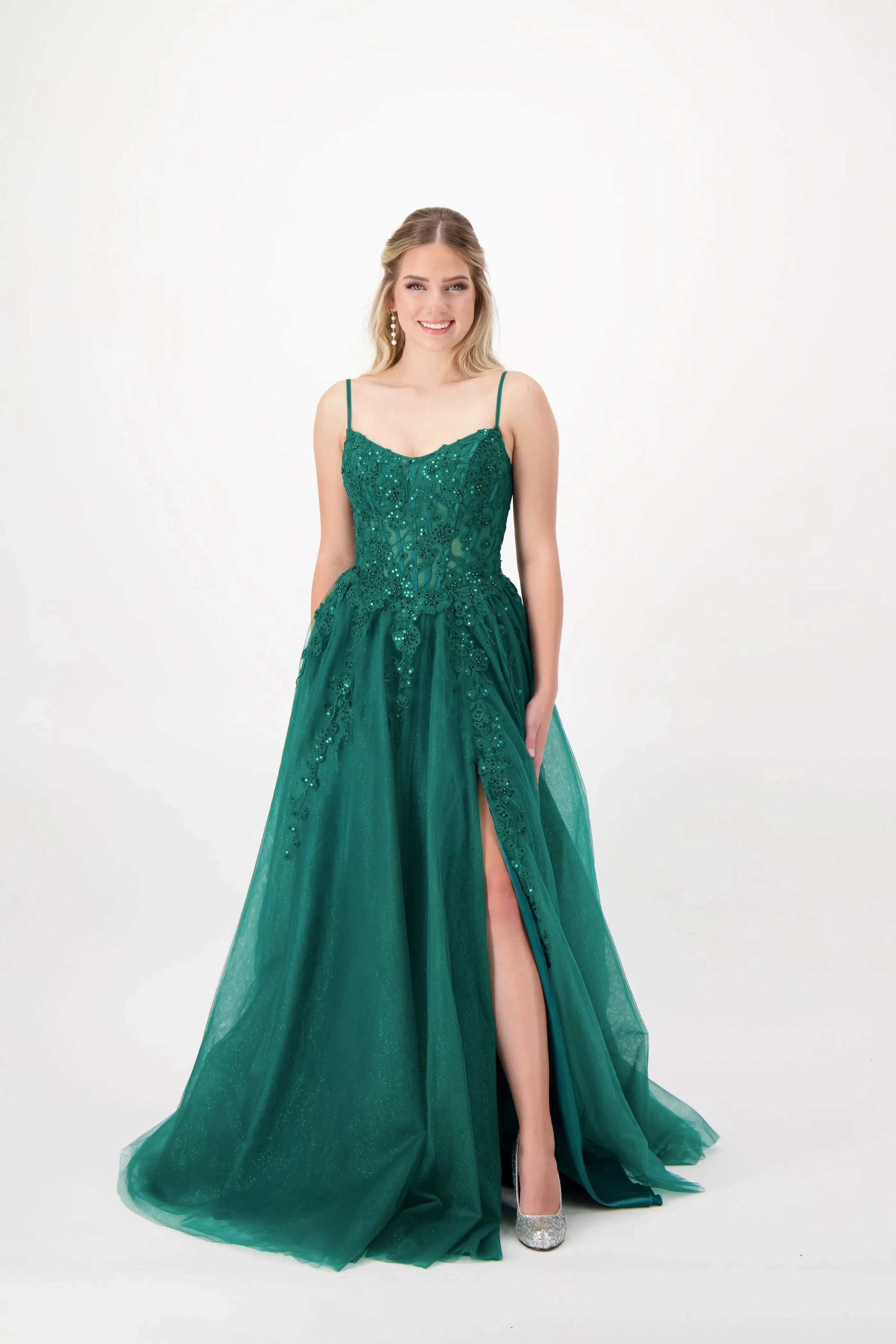 This gown features a sweetheart neckline and a corset bodice, adorned with intricate floral embellishments. The design beautifully blends elegance and modernity, with a shimmering chiffon skirt that adds movement and sparkle to your look. The high side slit adds a touch of allure while maintaining sophistication, making this dress a perfect choice for prom or any glamorous occasion.