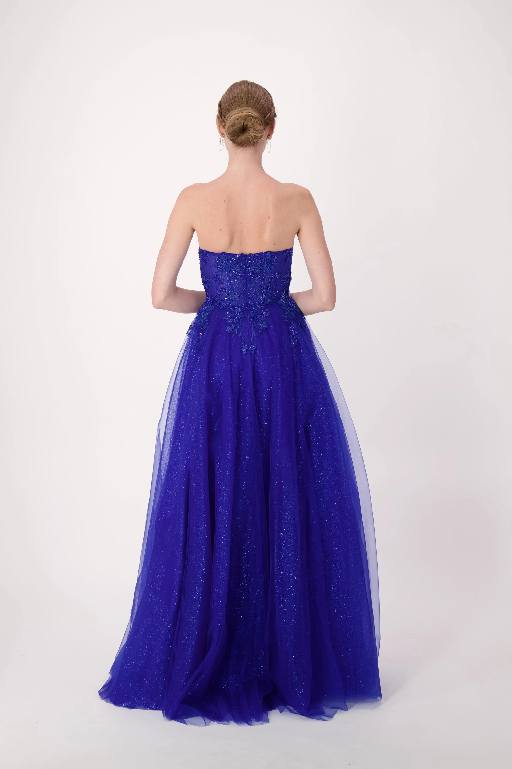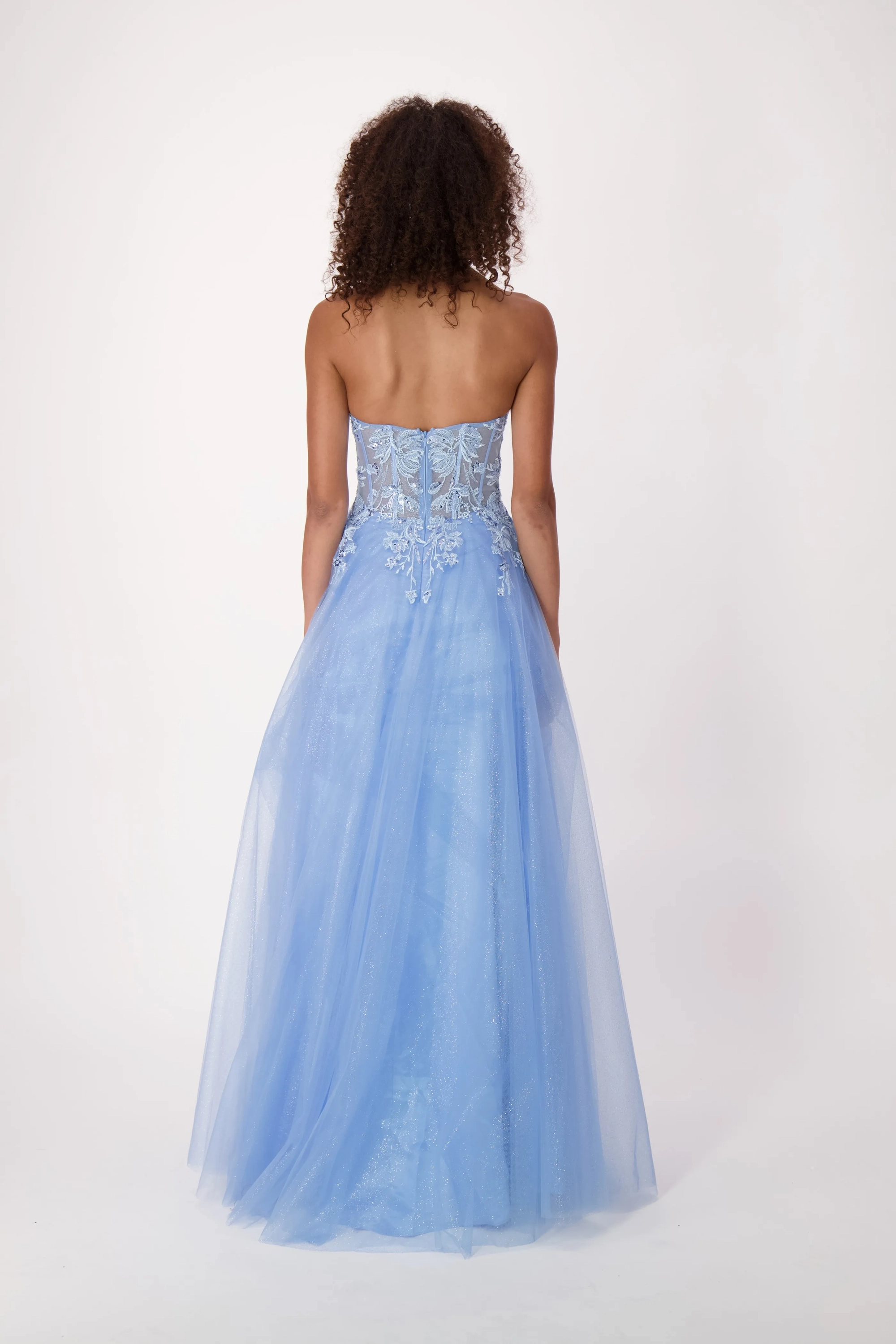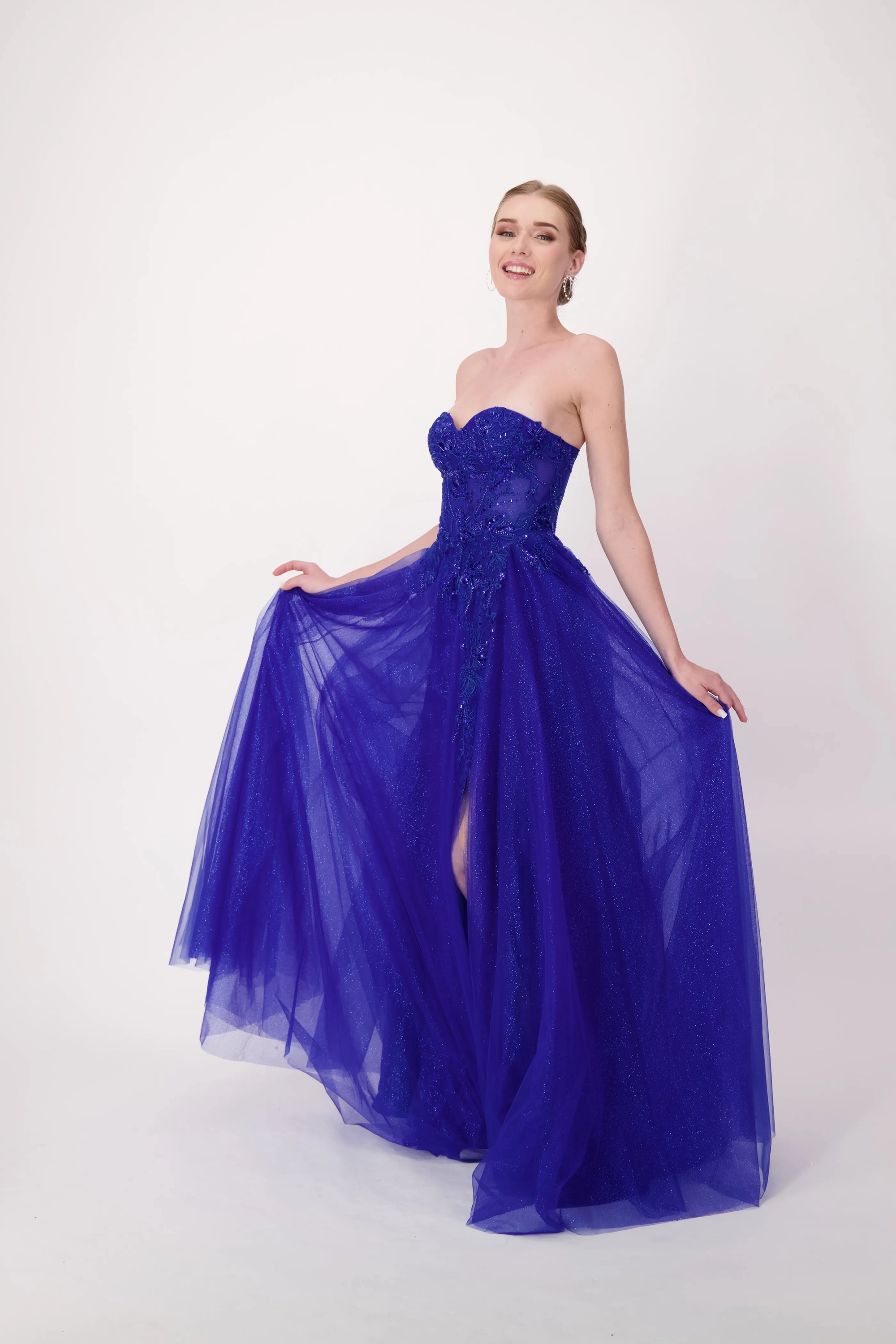This stunning gown features a sweetheart neckline and a corset bodice, intricately adorned with lace appliqués. The basque waistline creates a flattering silhouette, emphasizing the waist and elongating the torso. The shimmering tulle skirt flows gracefully, complete with a thigh-high slit for added allure. Perfect for prom, special occasions, or any event where you want to make an unforgettable entrance.