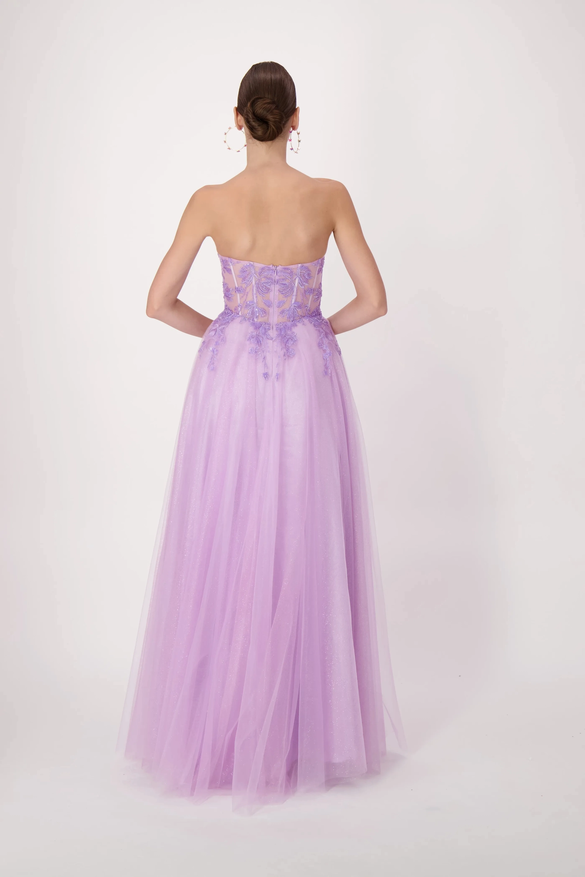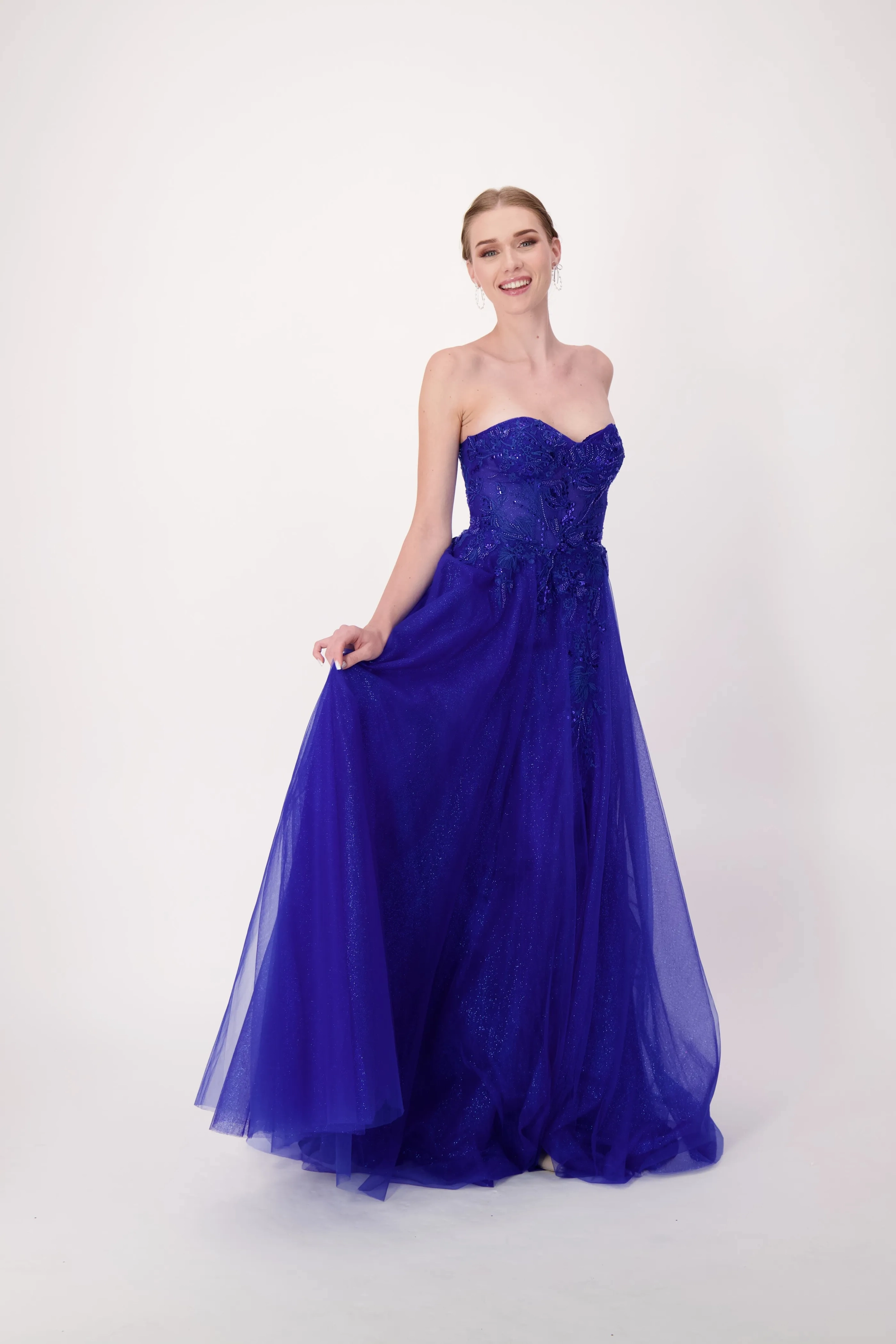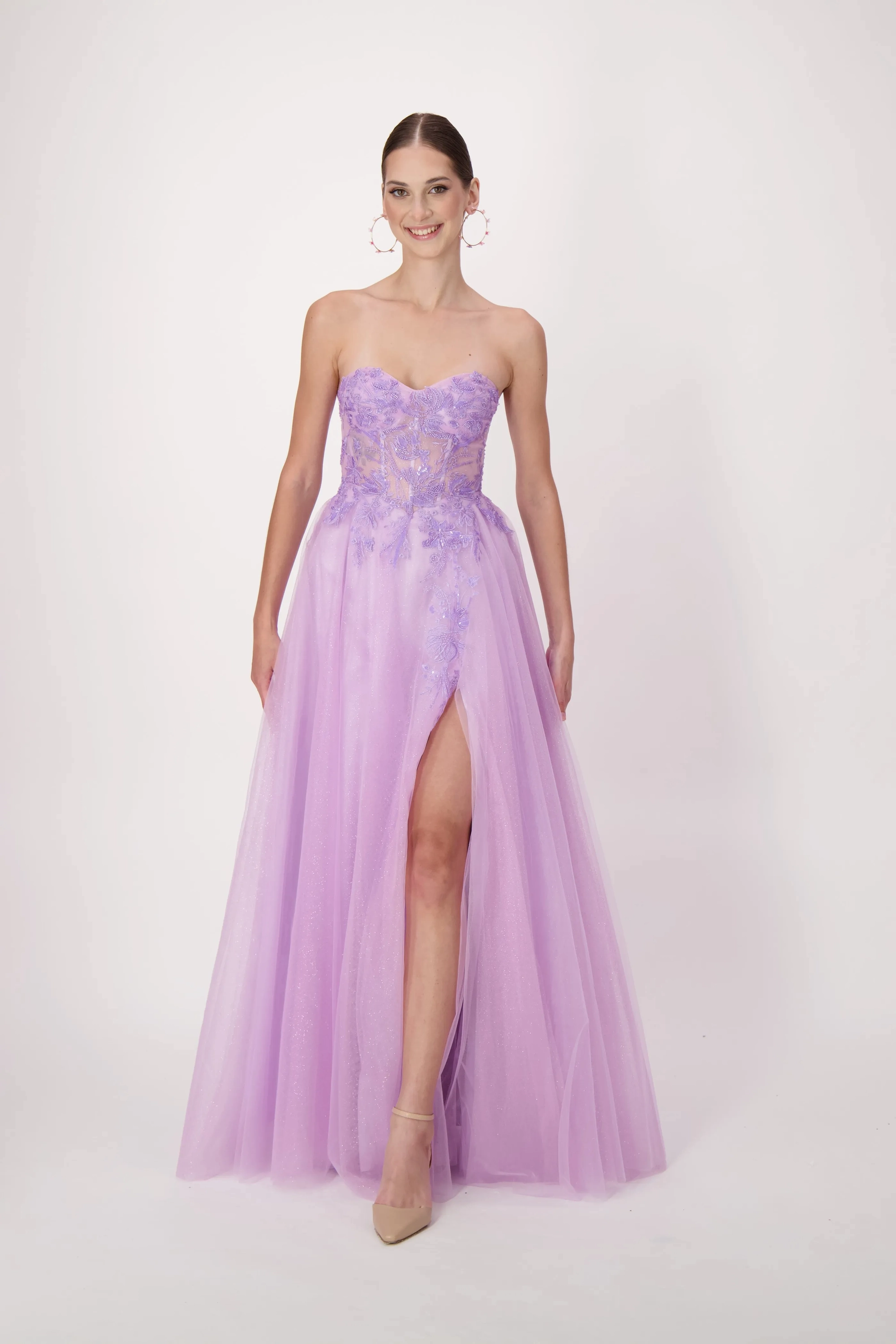 This stunning gown features a sweetheart neckline and a corset bodice, intricately adorned with lace appliqués. The basque waistline creates a flattering silhouette, emphasizing the waist and elongating the torso. The shimmering tulle skirt flows gracefully, complete with a thigh-high slit for added allure. Perfect for prom, special occasions, or any event where you want to make an unforgettable entrance.