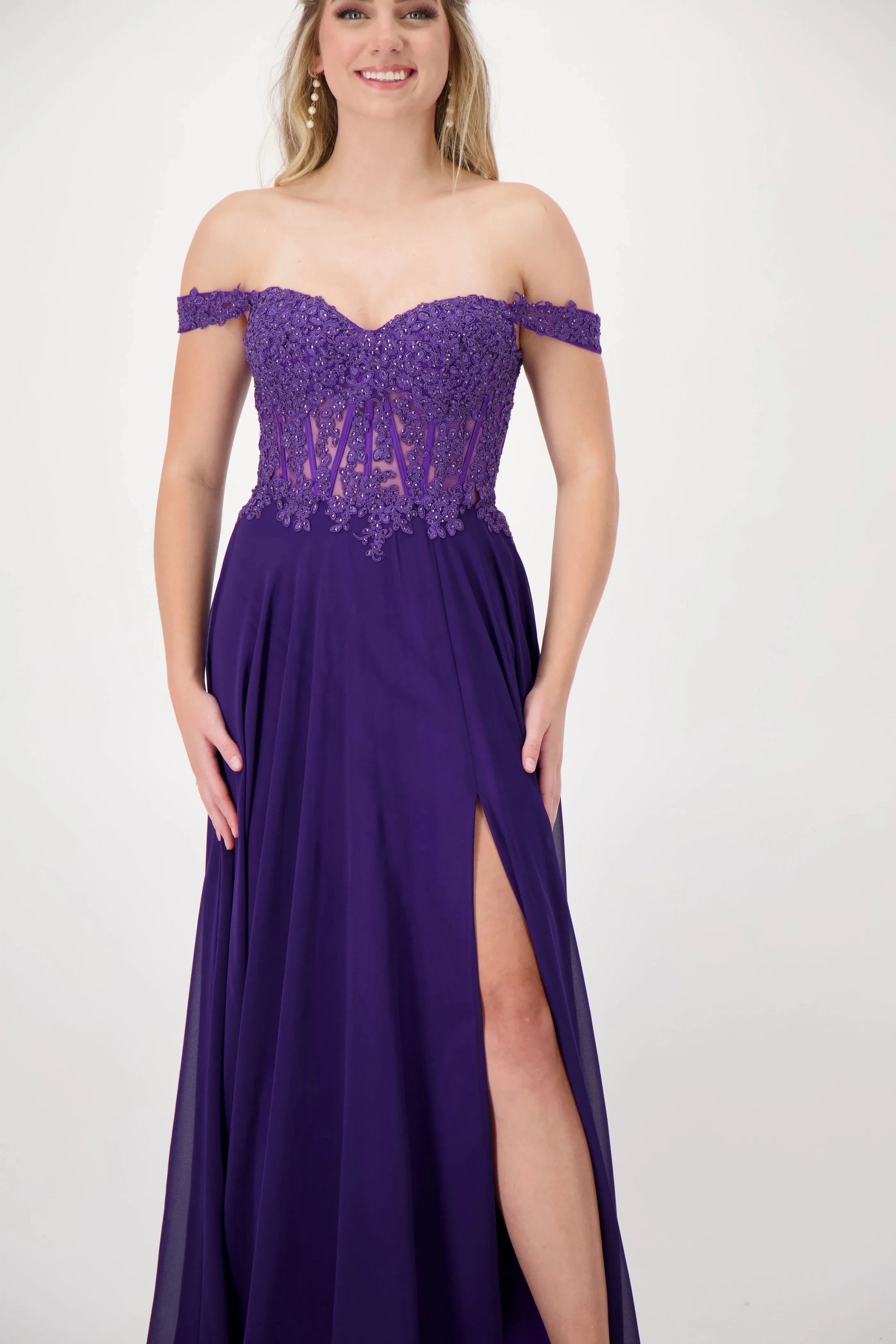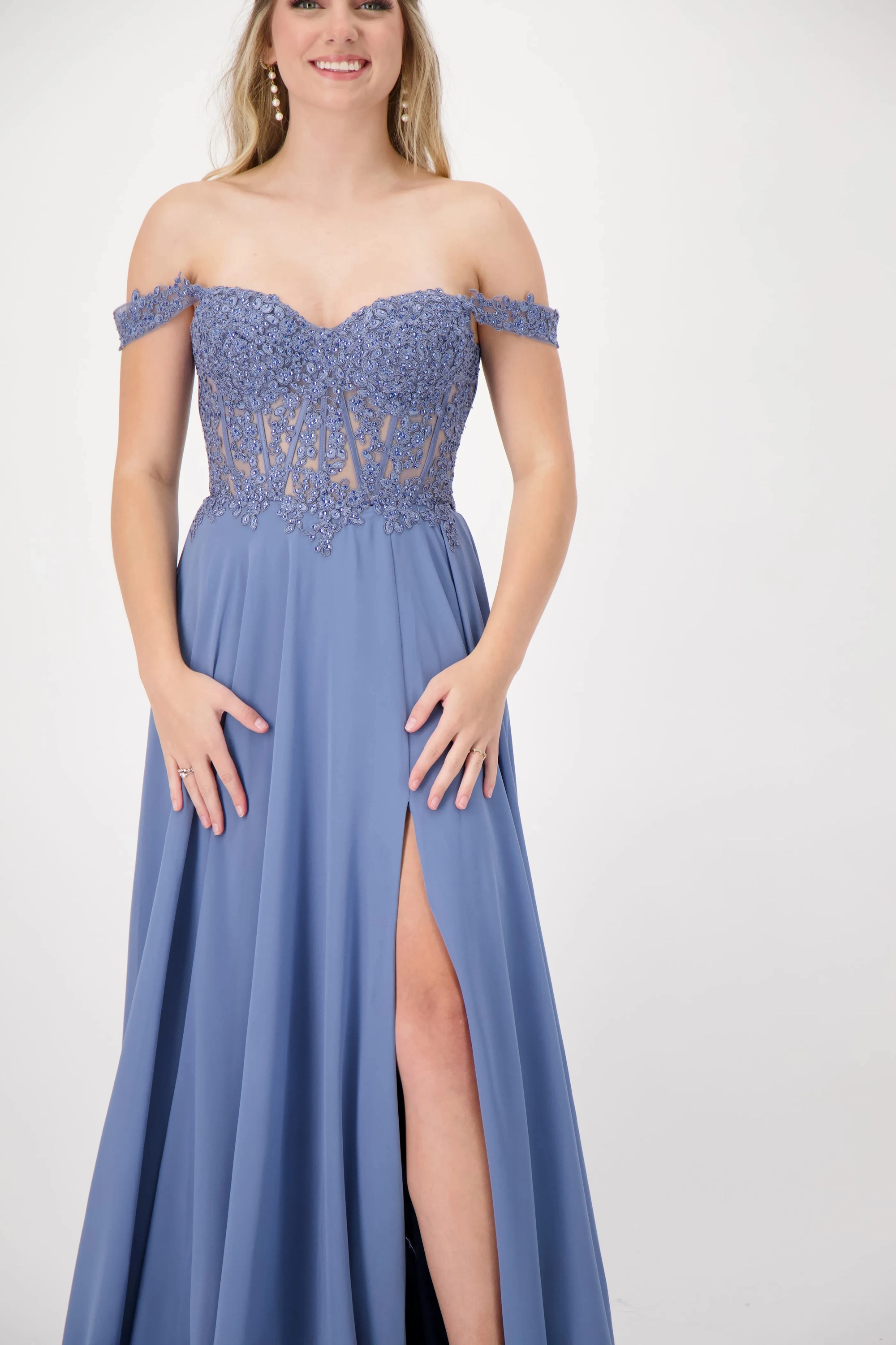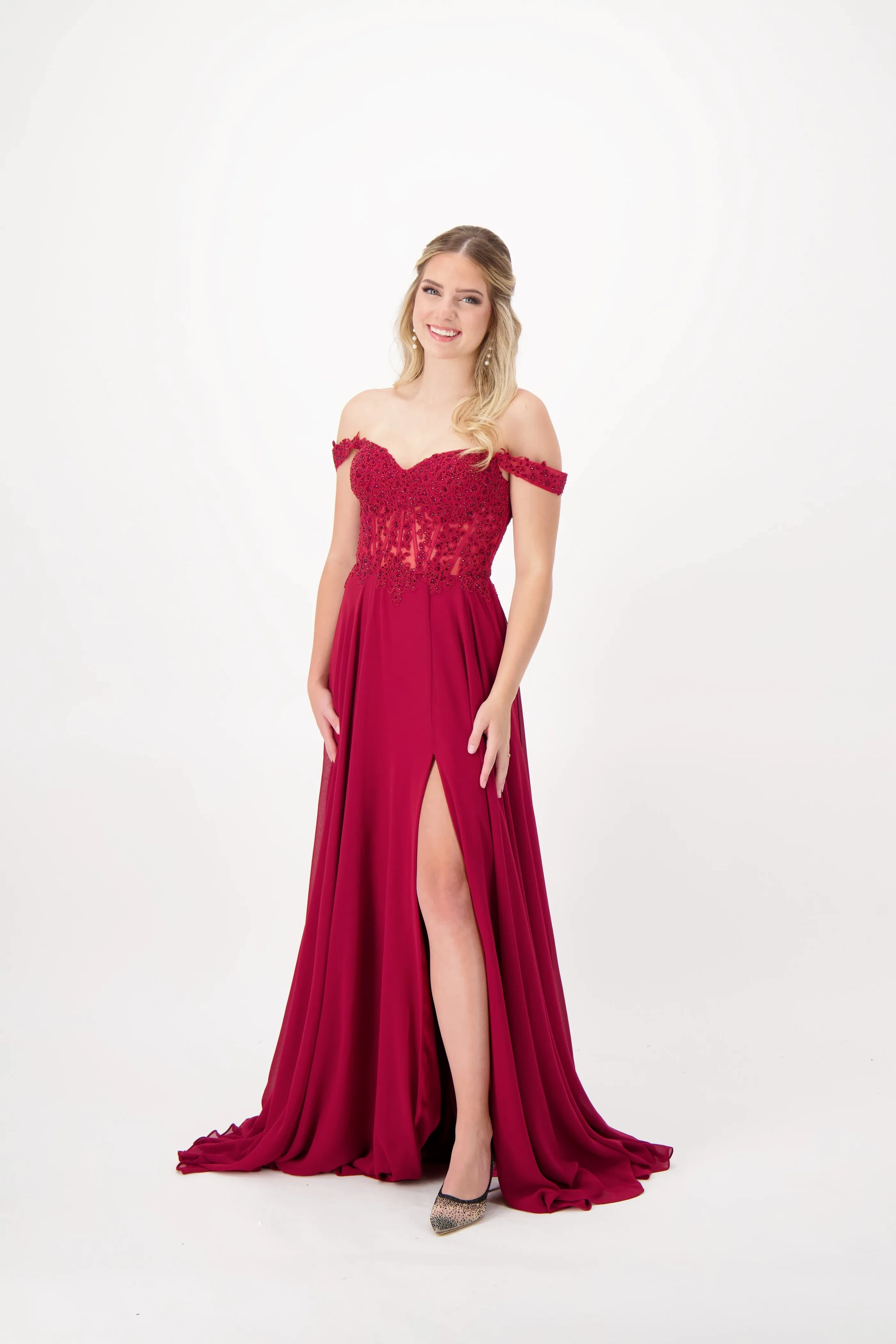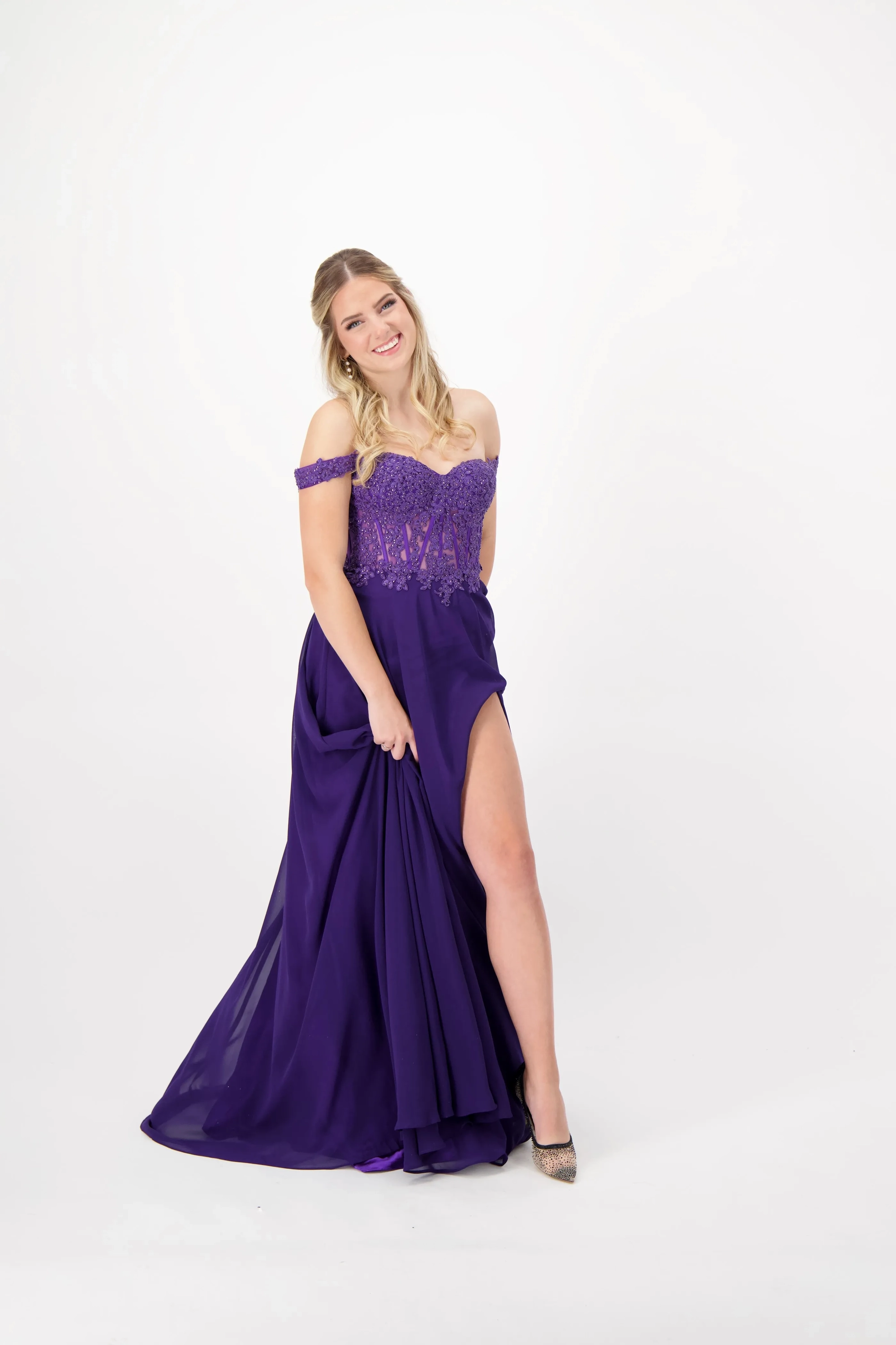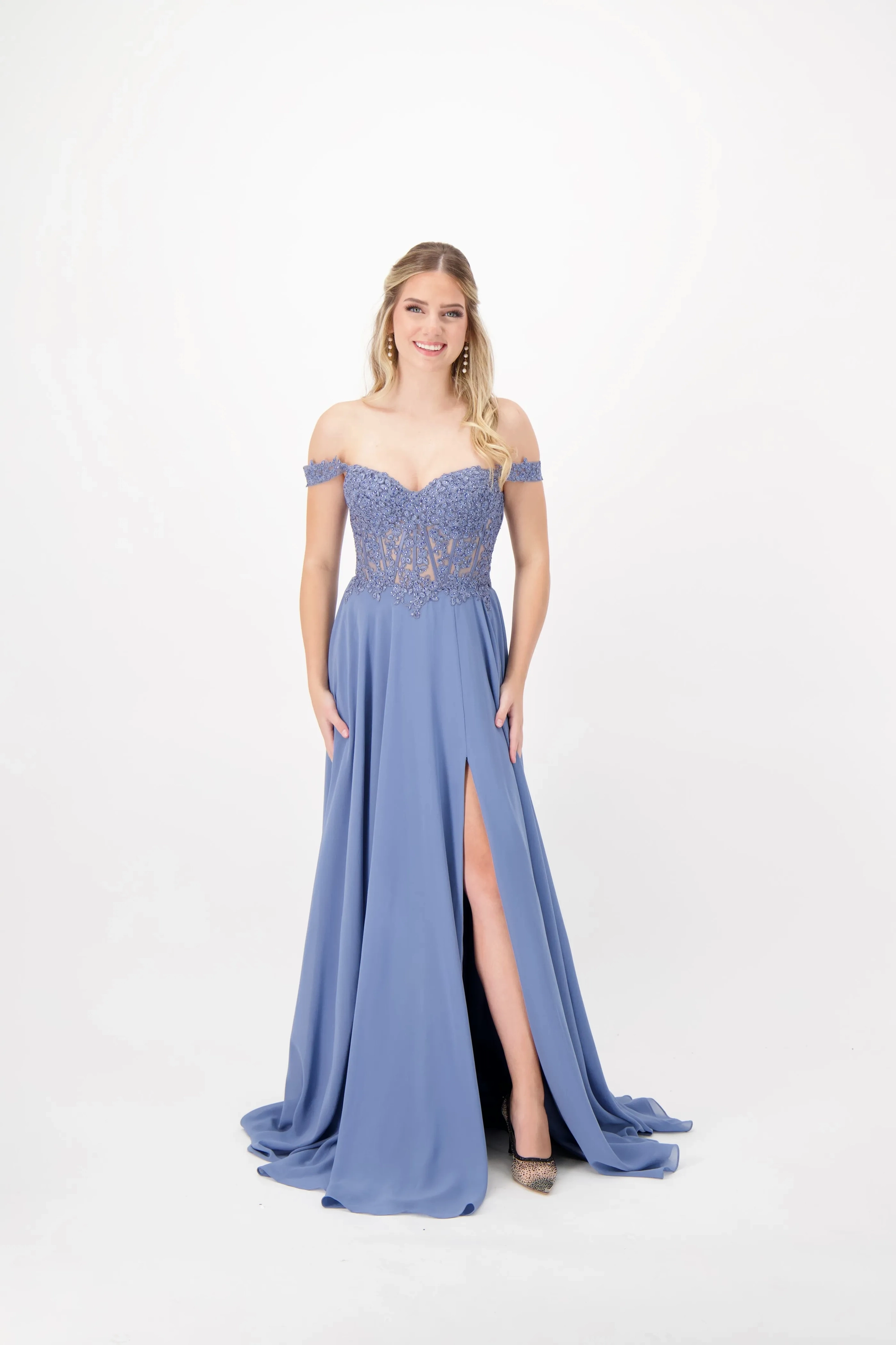 This enchanting gown features a flattering sweetheart neckline and delicate off-the-shoulder sleeves for a romantic touch. The bodice showcases intricate lace embellishments that add elegance, while the corset-style boning provides a structured and supportive fit. The flowing A-line chiffon skirt cascades gracefully, offering movement and comfort. Perfect for prom, weddings, or any formal event, this gown combines timeless design with modern elements for a stunning silhouette.