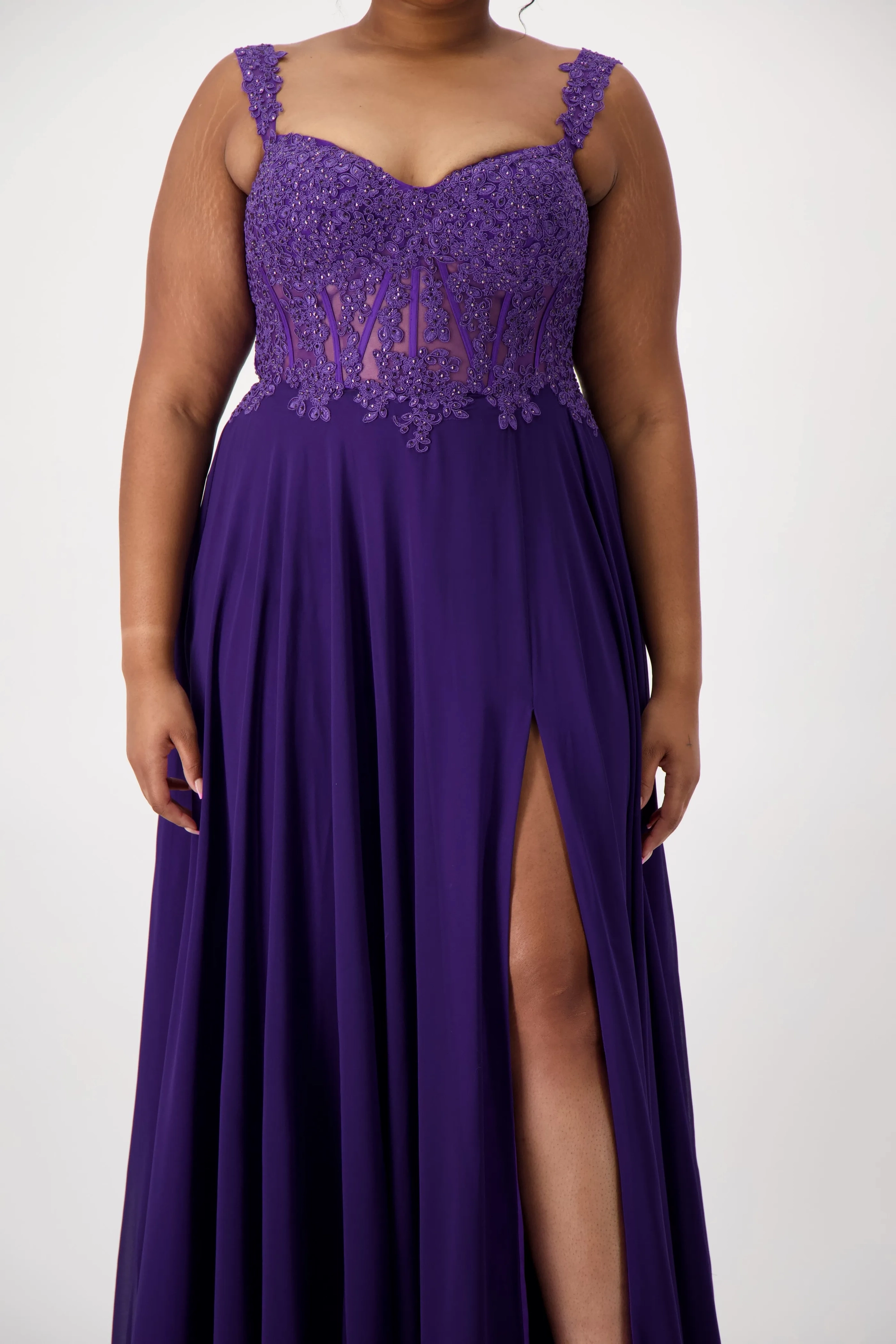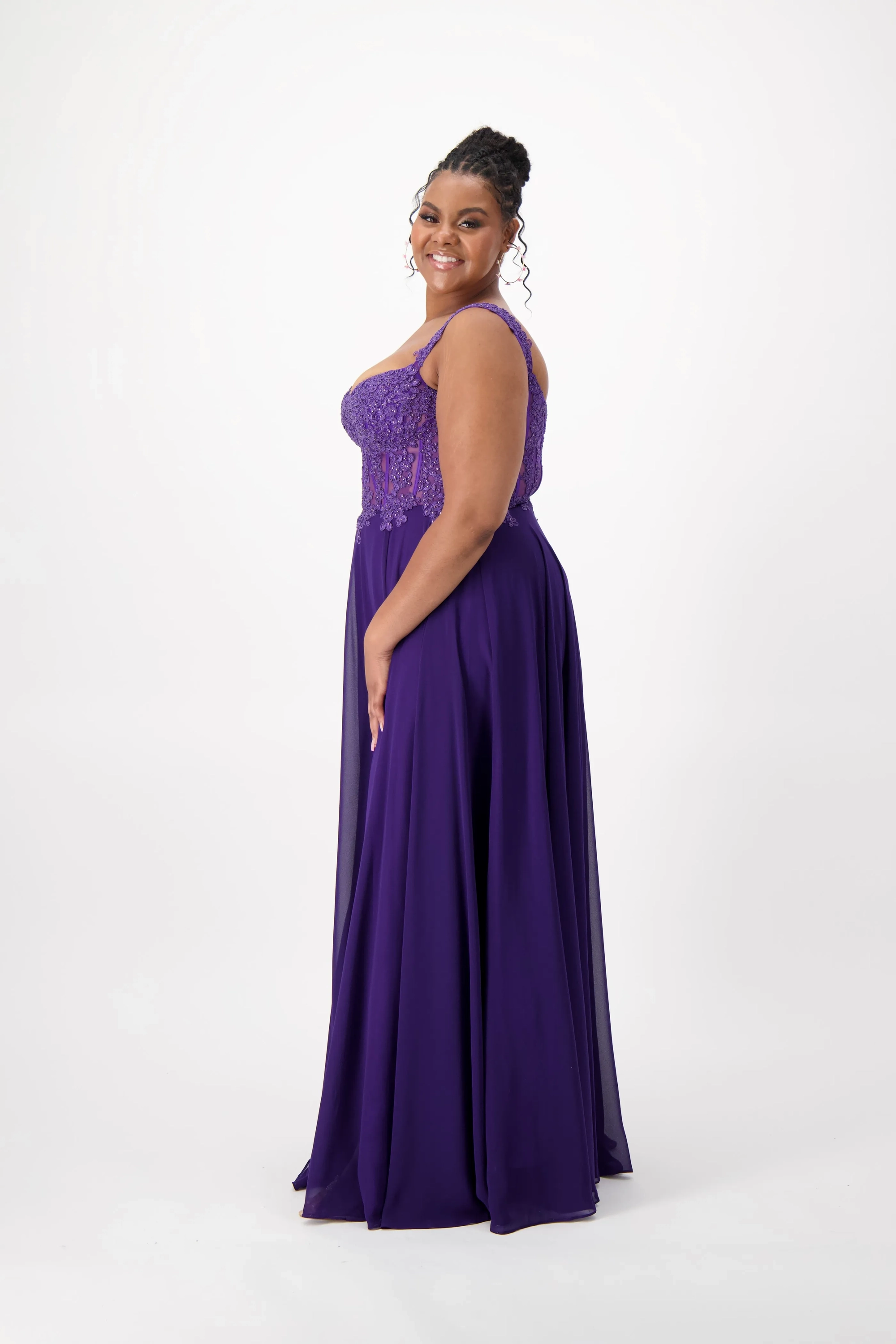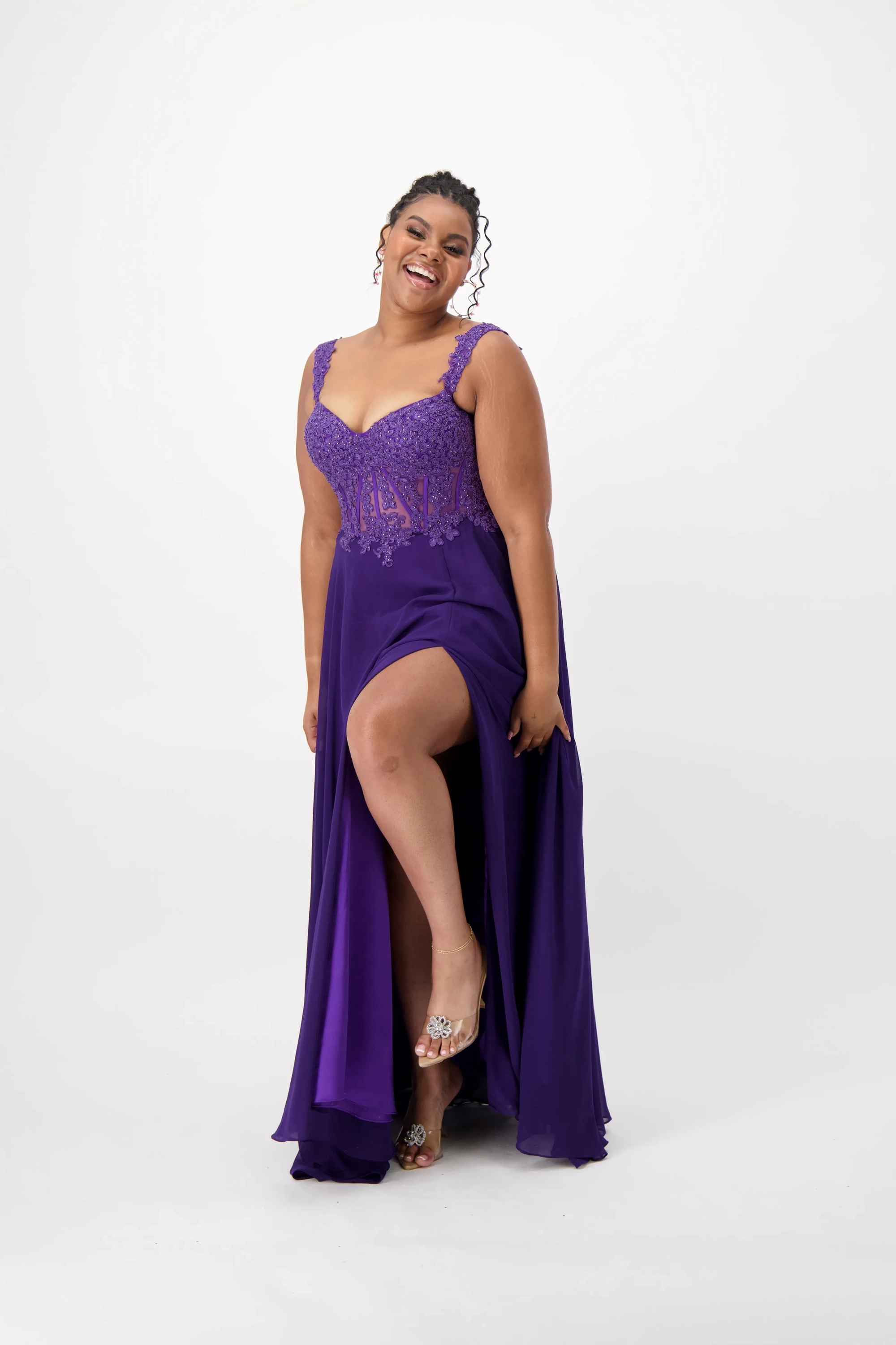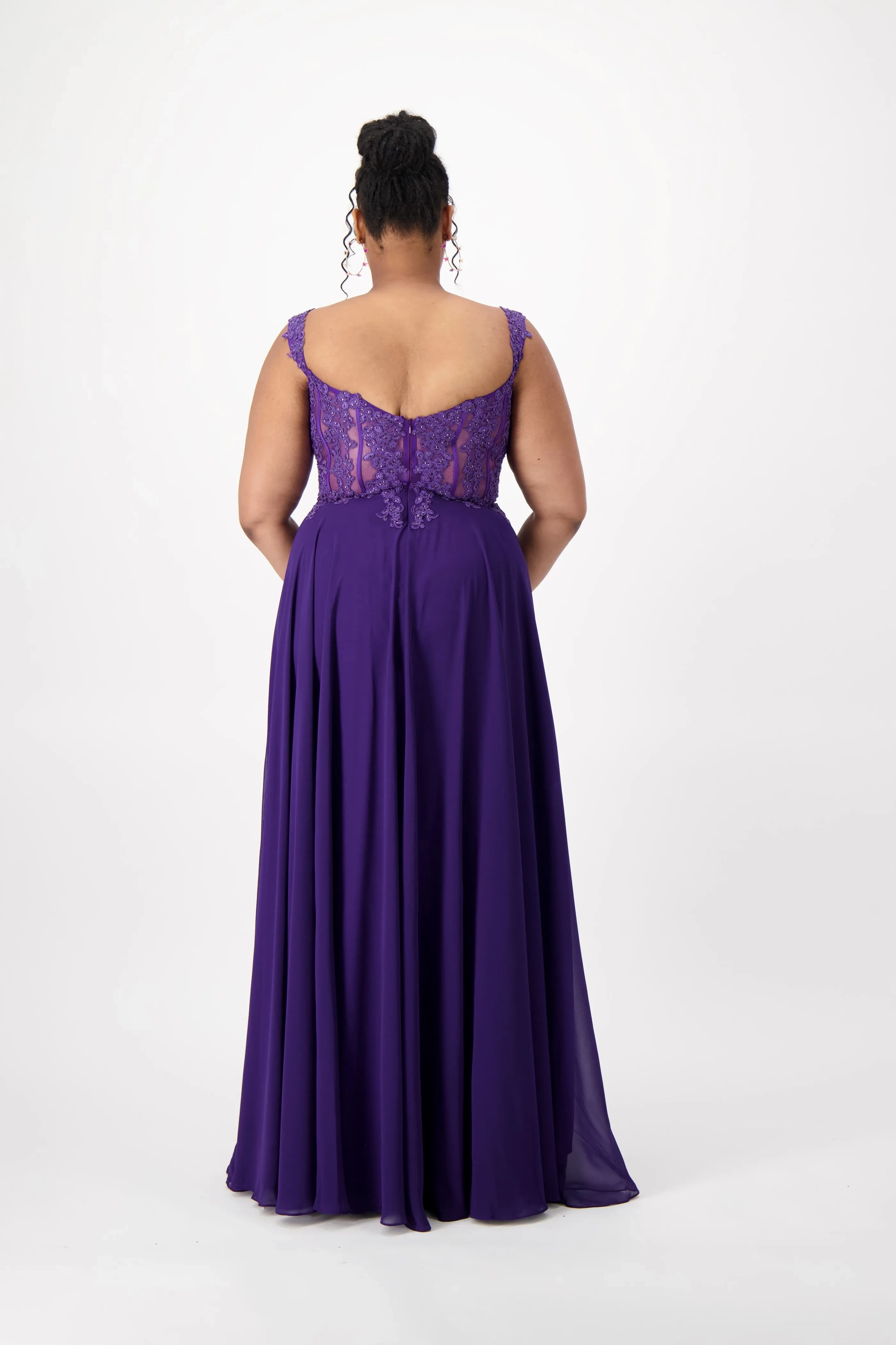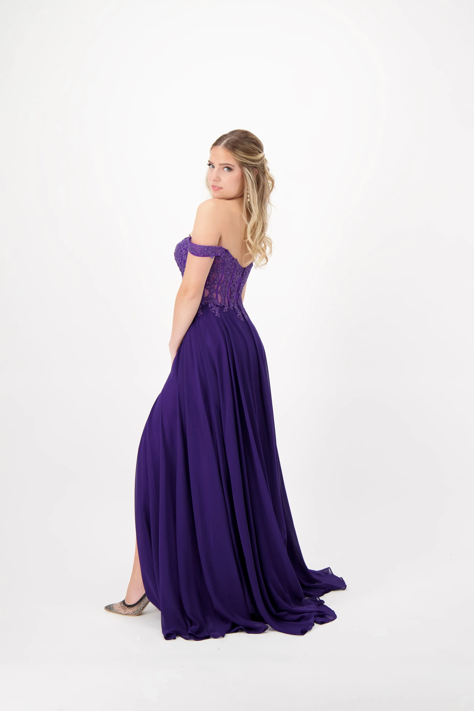 This enchanting gown features a flattering sweetheart neckline and delicate off-the-shoulder sleeves for a romantic touch. The bodice showcases intricate lace embellishments that add elegance, while the corset-style boning provides a structured and supportive fit. The flowing A-line chiffon skirt cascades gracefully, offering movement and comfort. Perfect for prom, weddings, or any formal event, this gown combines timeless design with modern elements for a stunning silhouette.