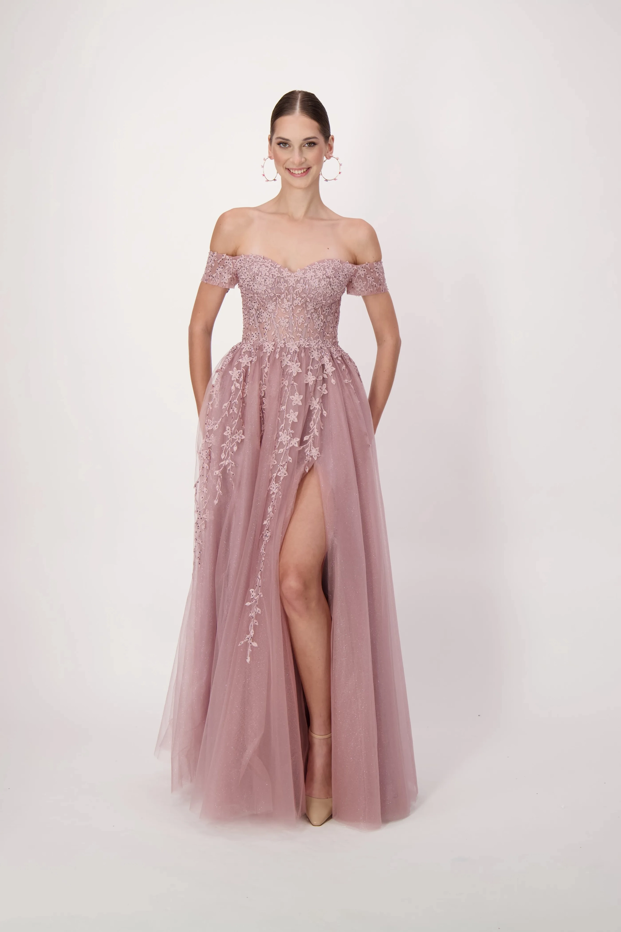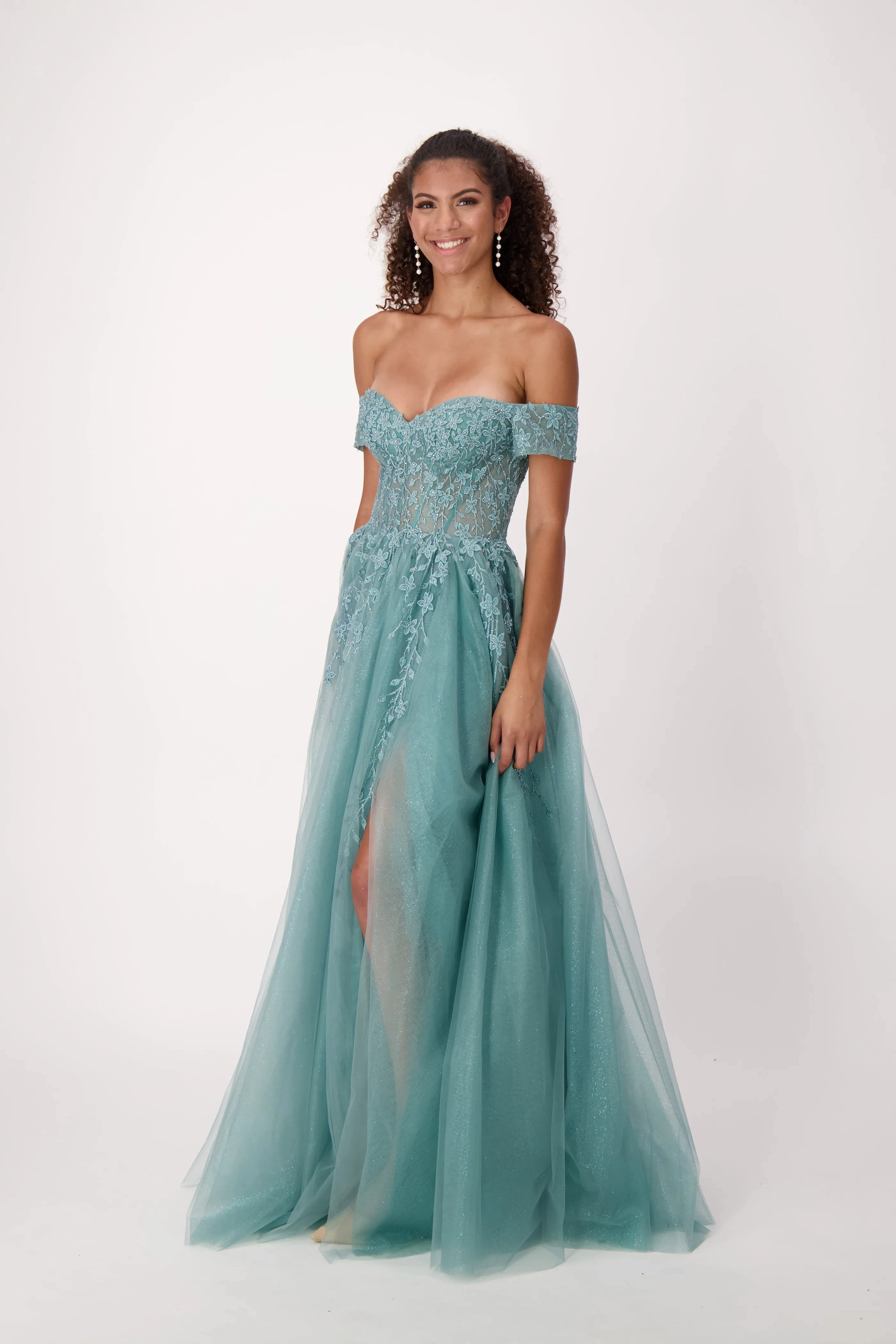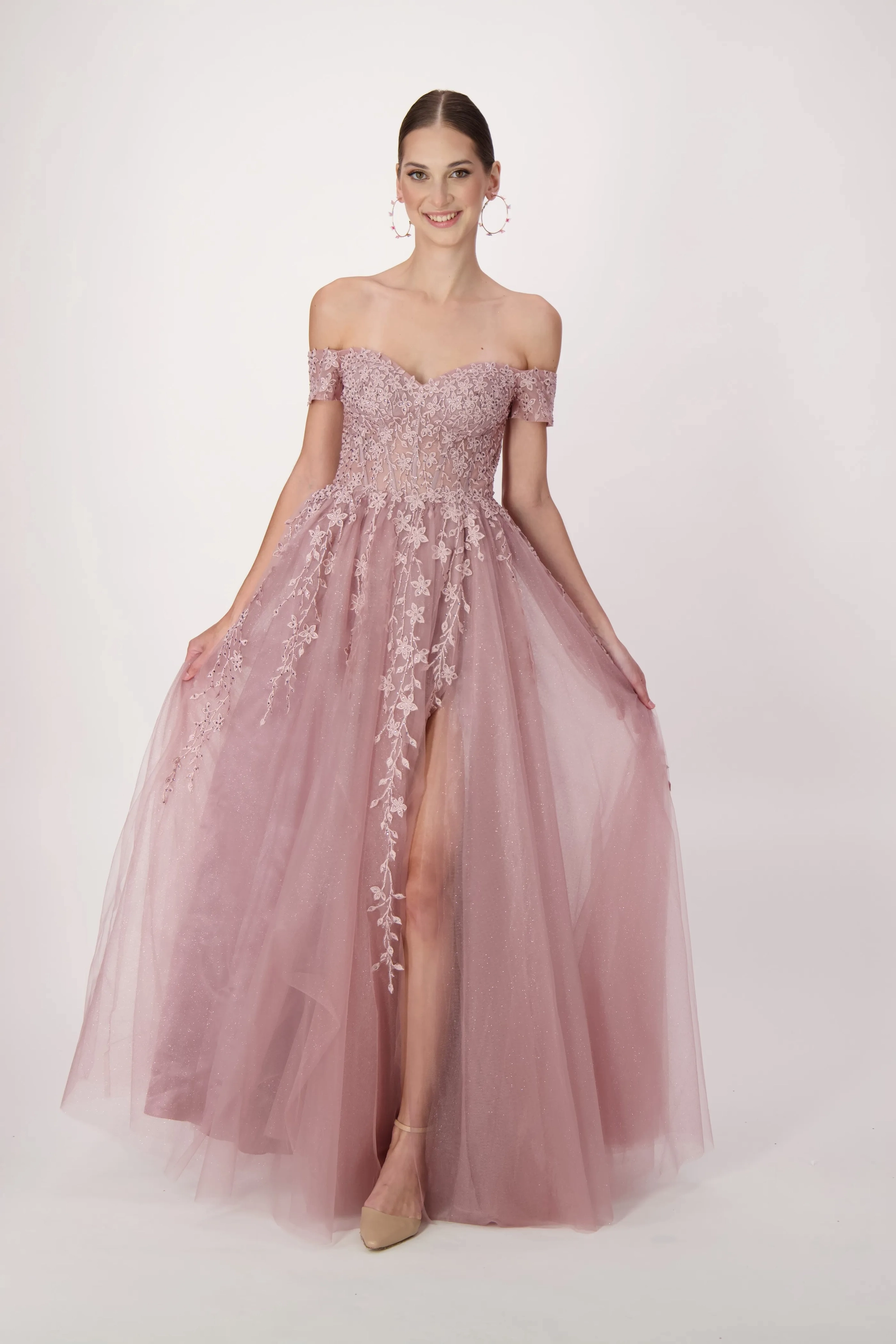 This stunning dress features an off-the-shoulder neckline and a beautifully structured corset bodice, creating a flattering silhouette. The floor-length skirt flows elegantly in shimmering tulle fabric, adding movement and sophistication. Perfect for a glamorous prom or formal event, this gown ensures a head-turning entrance with its delicate embellishments and thigh-high slit, offering a modern, chic touch to a timeless design. The intricate detailing on the bodice contrasts with the voluminous, layered skirt, making it a one-of-a-kind masterpiece.