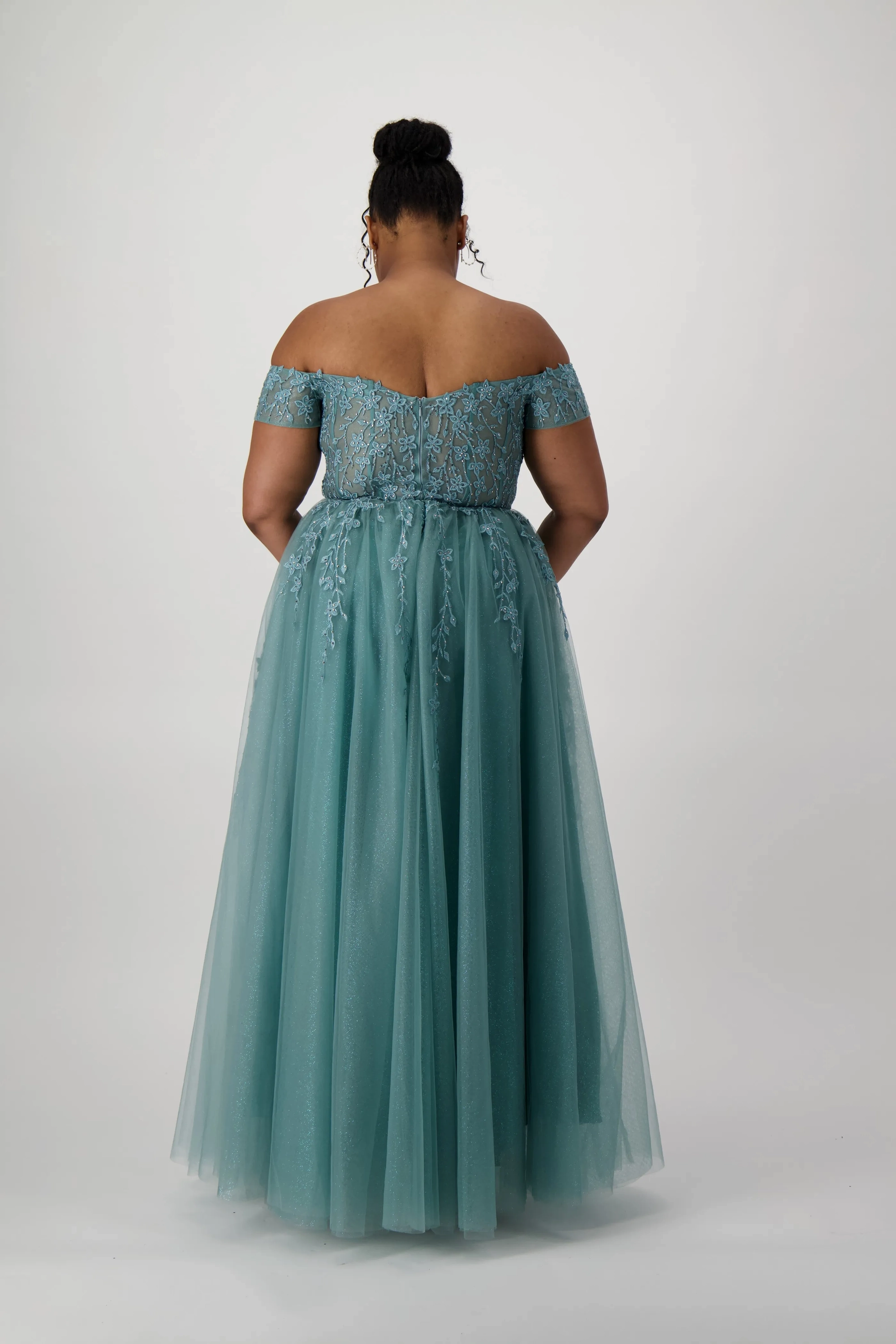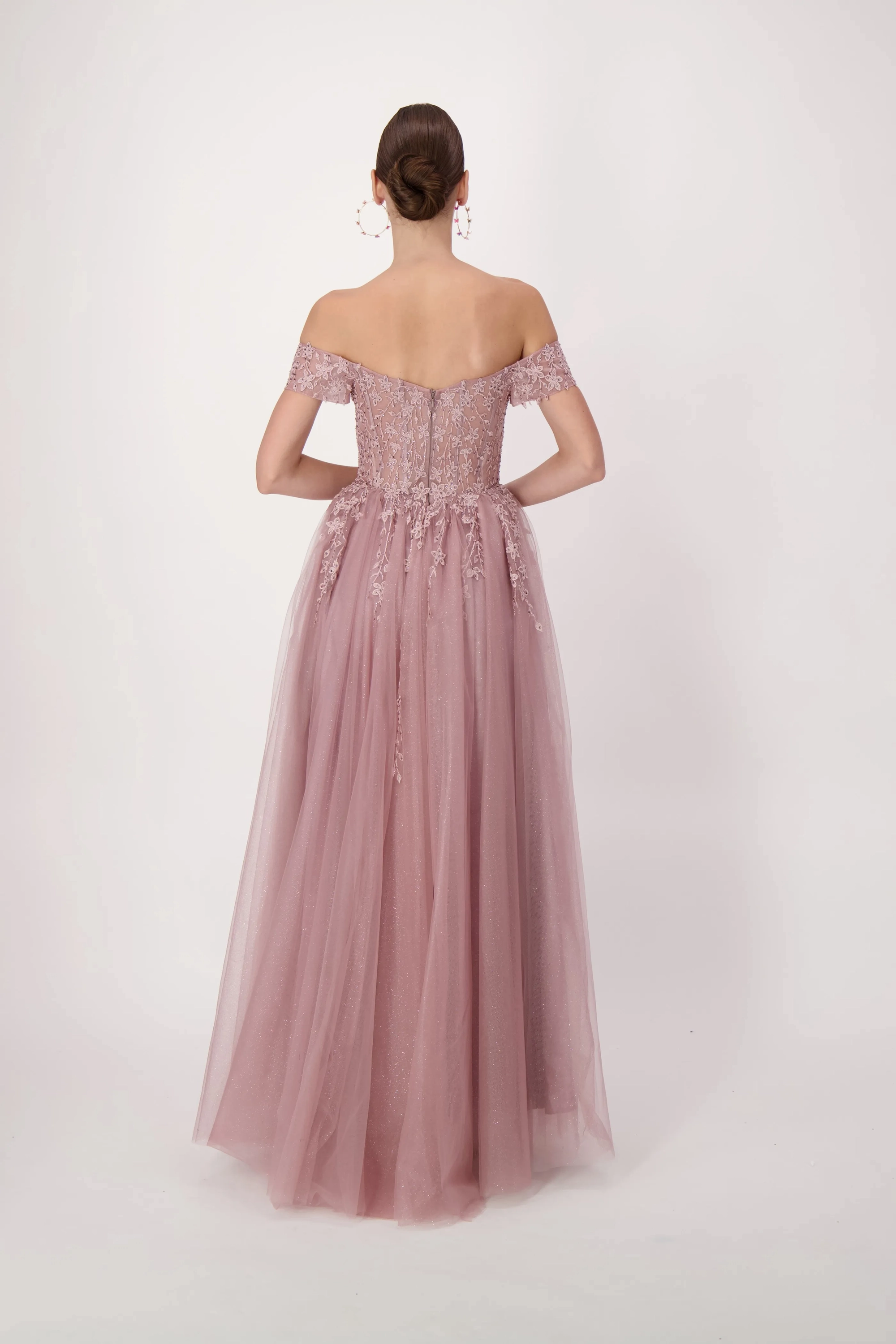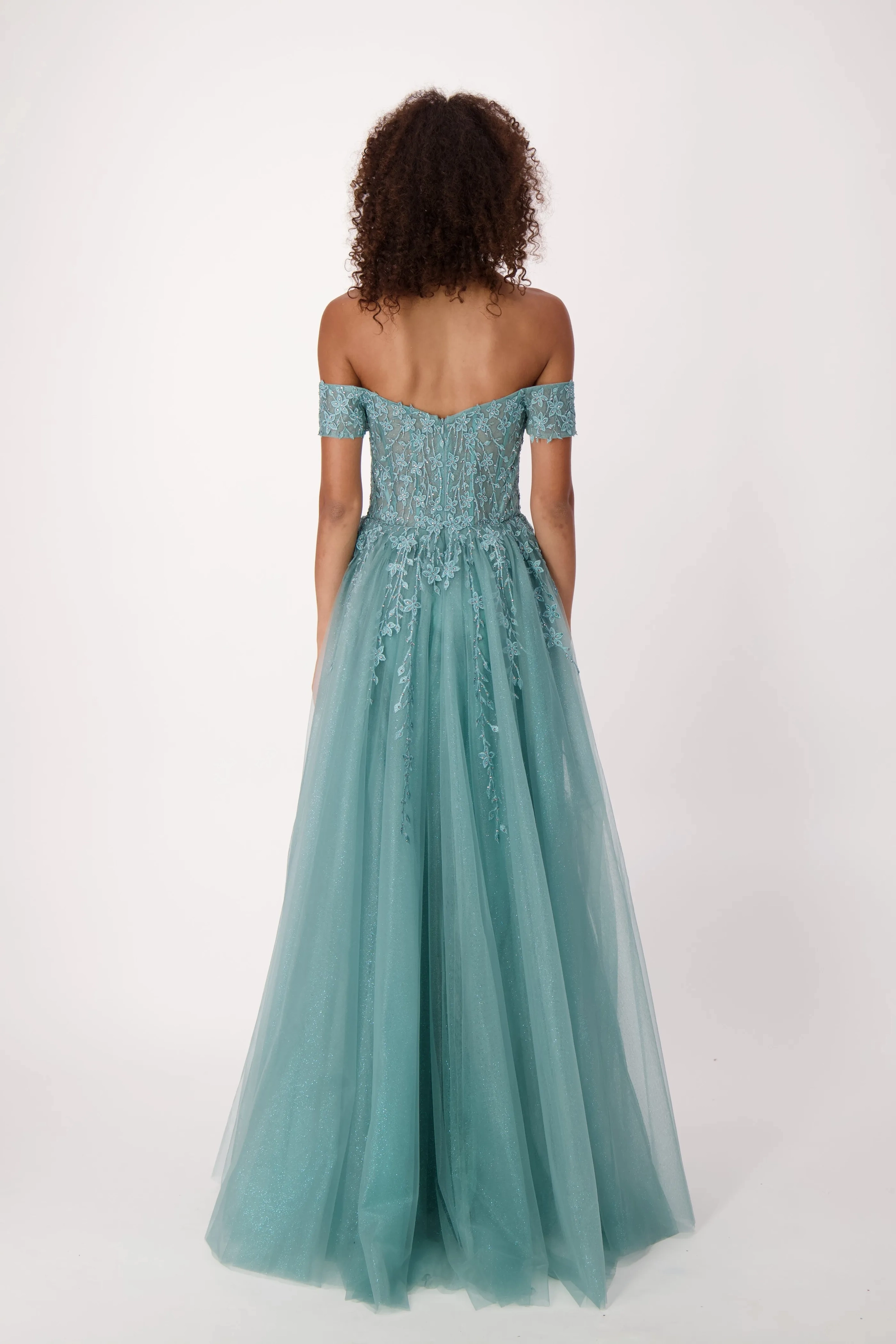 This stunning dress features an off-the-shoulder neckline and a beautifully structured corset bodice, creating a flattering silhouette. The floor-length skirt flows elegantly in shimmering tulle fabric, adding movement and sophistication. Perfect for a glamorous prom or formal event, this gown ensures a head-turning entrance with its delicate embellishments and thigh-high slit, offering a modern, chic touch to a timeless design. The intricate detailing on the bodice contrasts with the voluminous, layered skirt, making it a one-of-a-kind masterpiece.