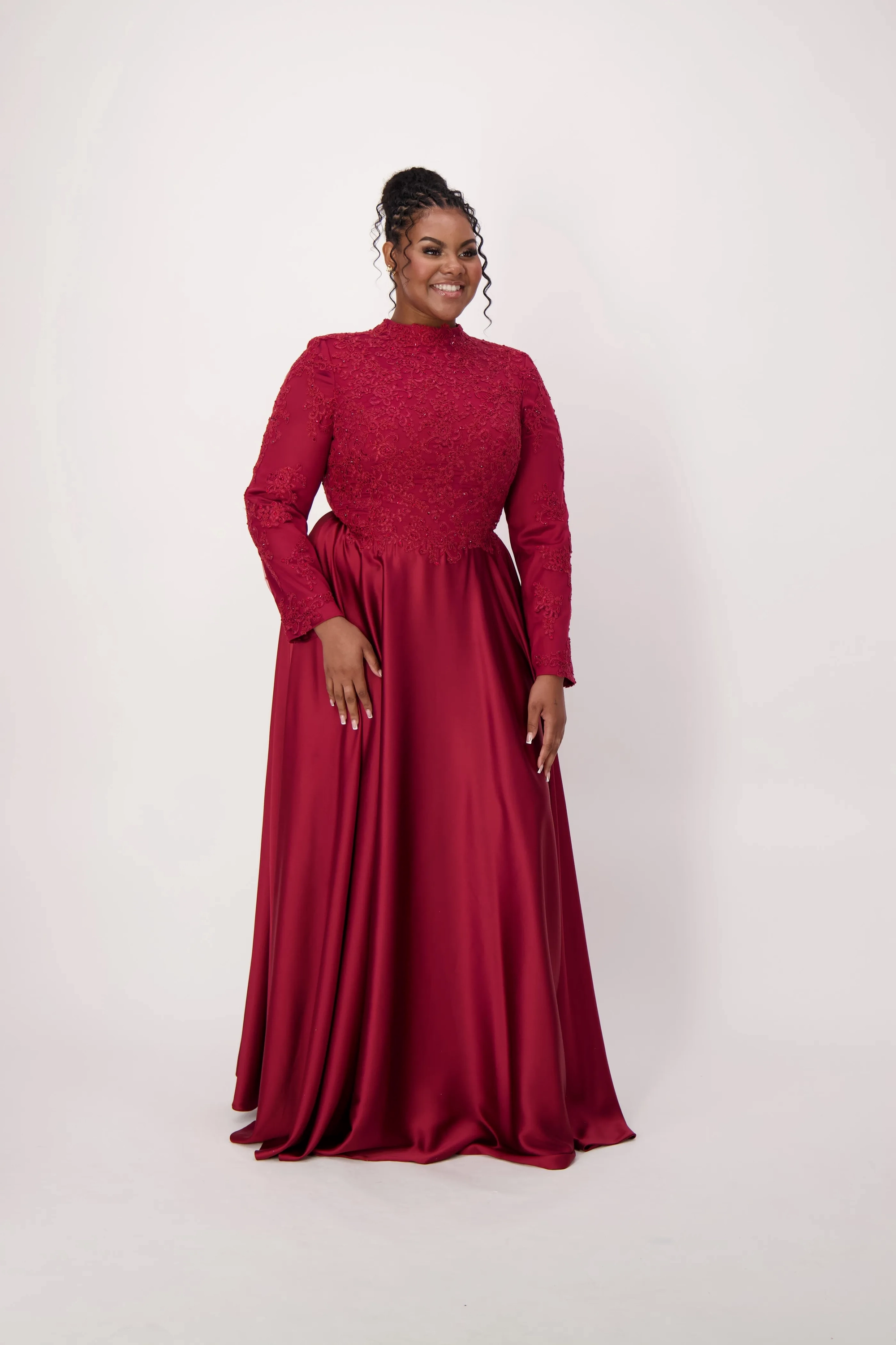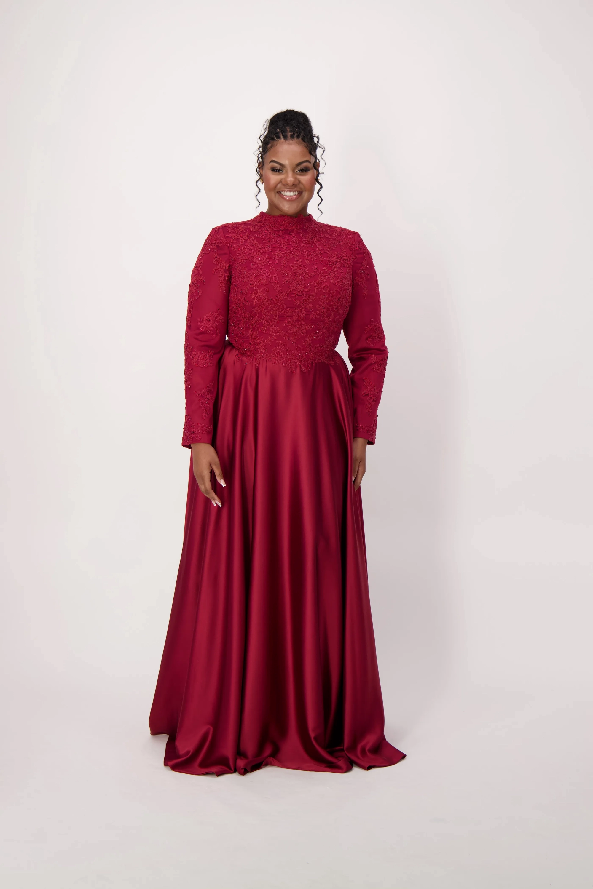 This dress features a high-neck bodice adorned with intricate lace detailing, giving it a sophisticated and regal look. The long sleeves add elegance and modesty, while the flowing satin skirt adds a touch of drama and movement to the overall silhouette. Perfect for special occasions, this design combines timeless style with a modern twist for a flattering and stunning appearance. Ideal for those who want a balance between classic grace and contemporary style.