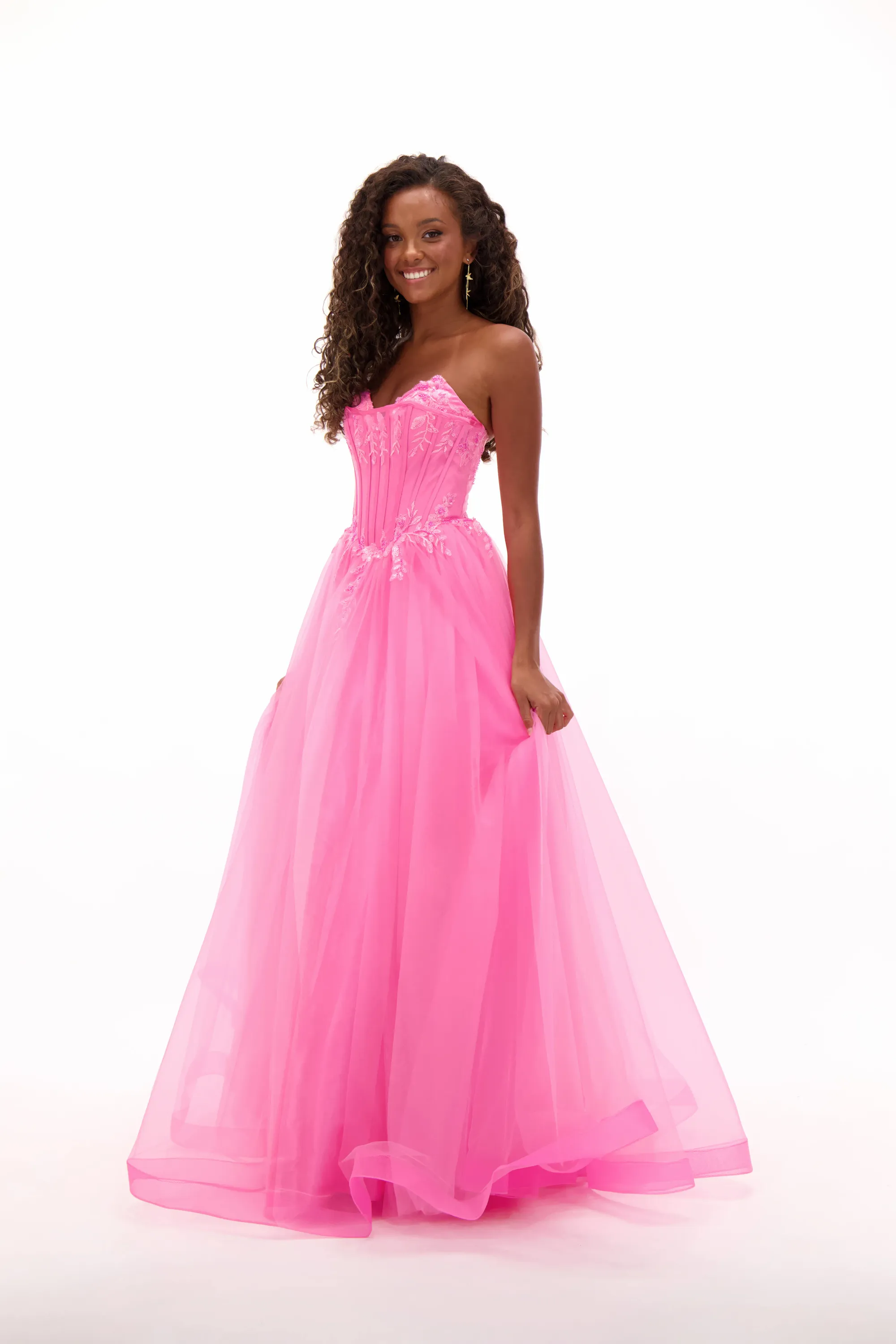 A fairytale prom gown with a sparkling beaded bodice and layered tulle skirt. Romantic, dramatic, and perfect for unforgettable evenings.
