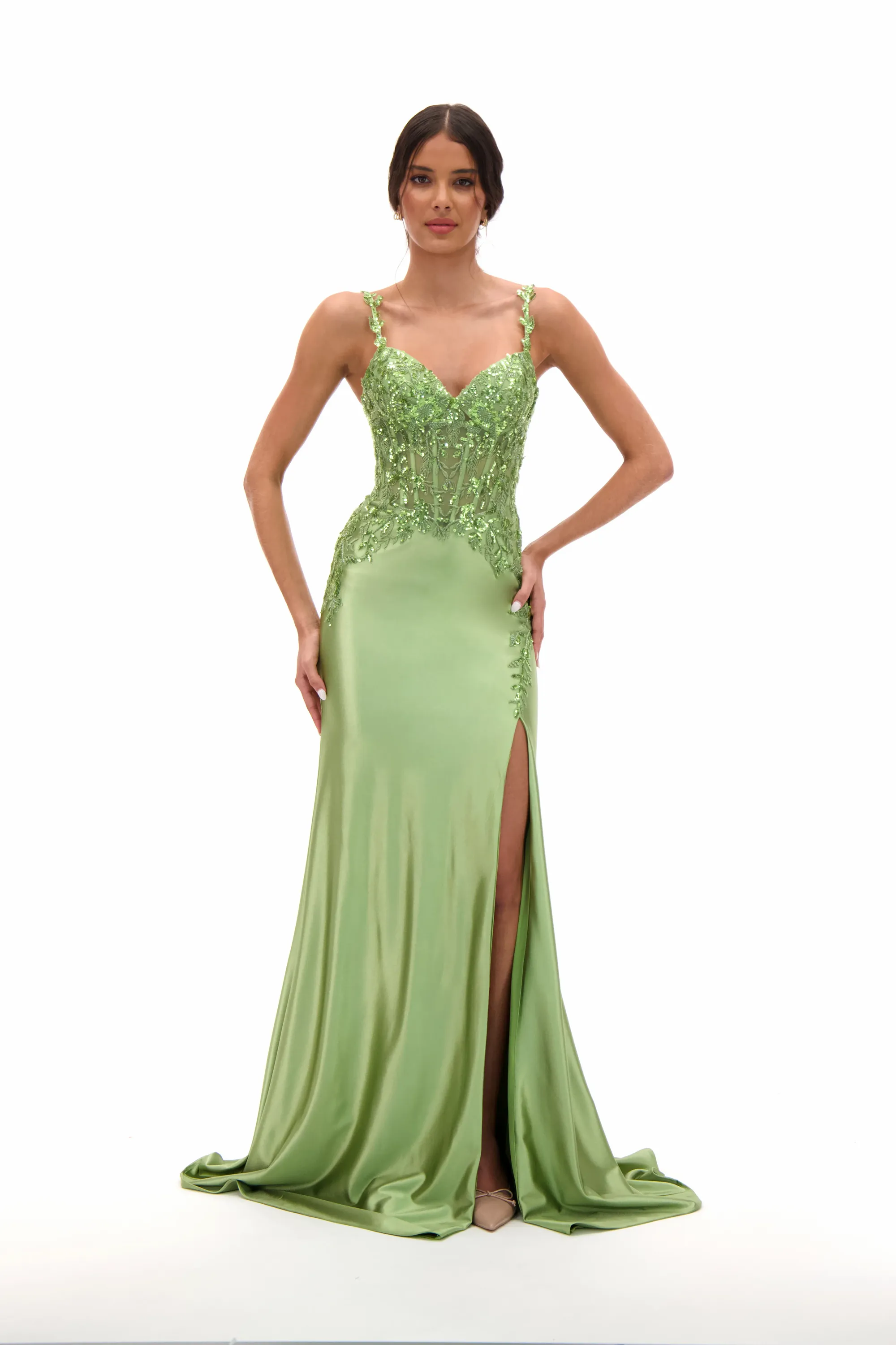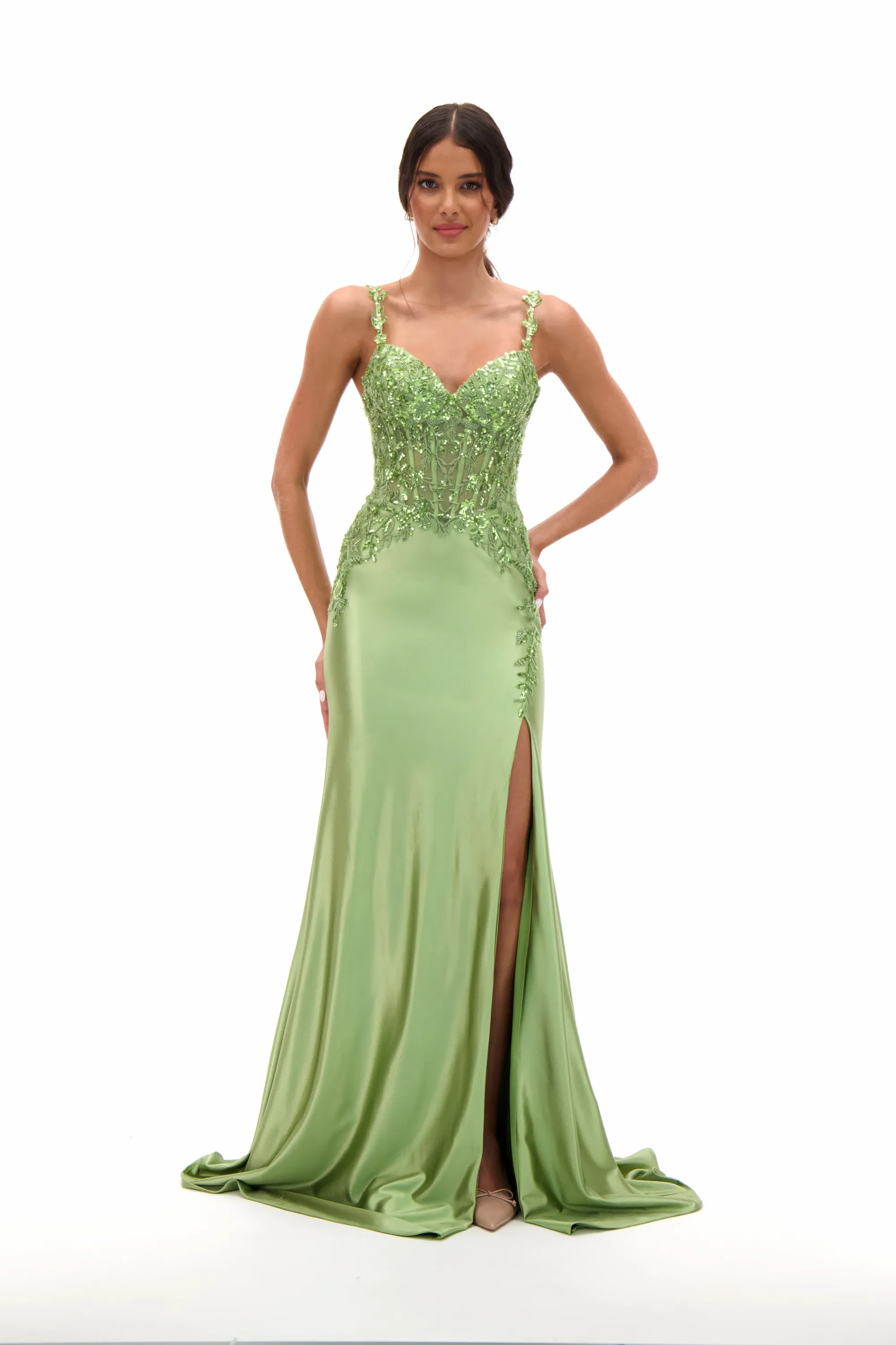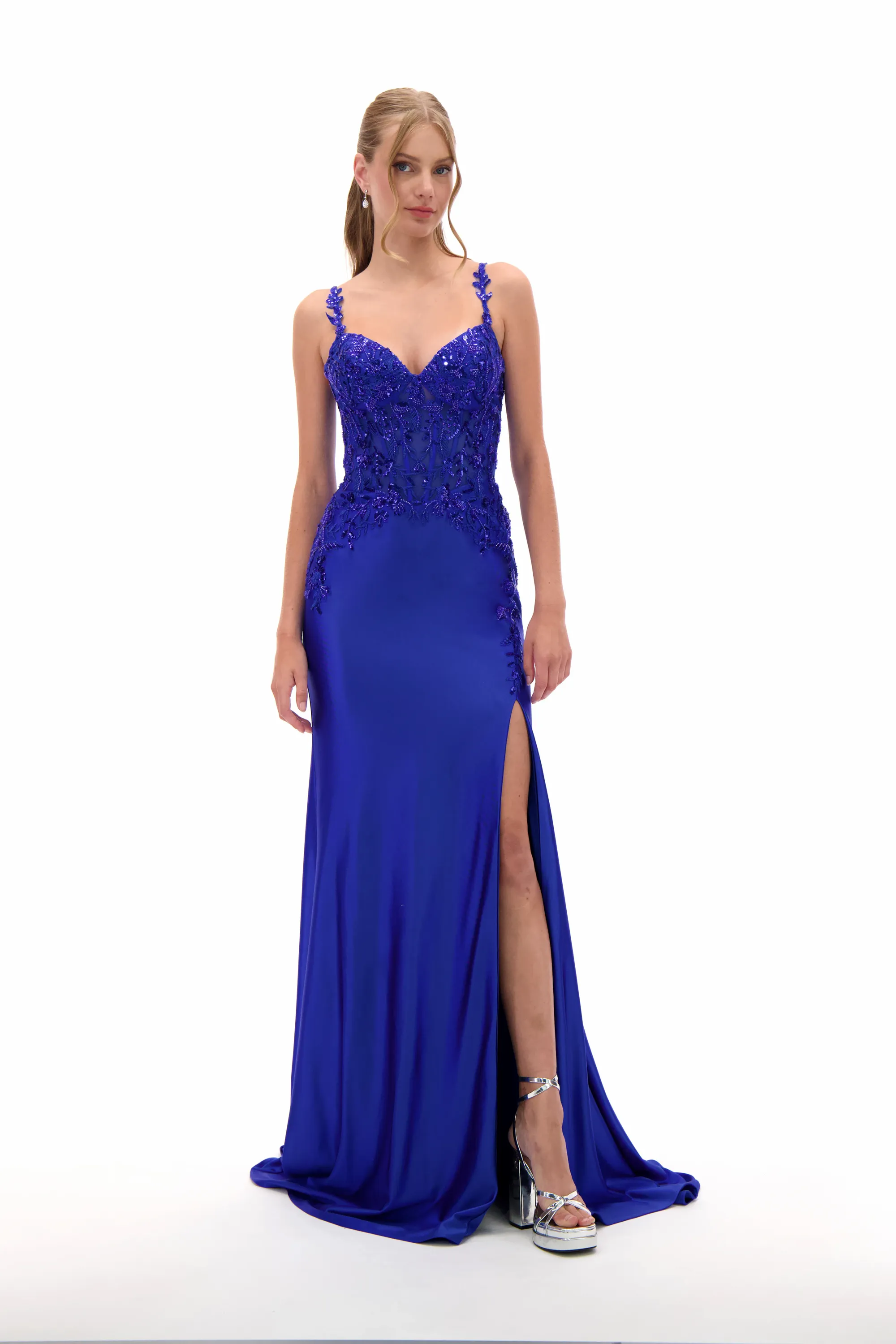 Shimmer with elegance in this embellished sweetheart satin prom dress, designed to highlight your figure with a sleek fitted silhouette. The bodice glistens with beadwork and embroidery, balanced by slim straps and a romantic sweetheart neckline. A high side slit adds just the right amount of boldness, making this gown a flawless choice for proms, pageants, or evening galas.