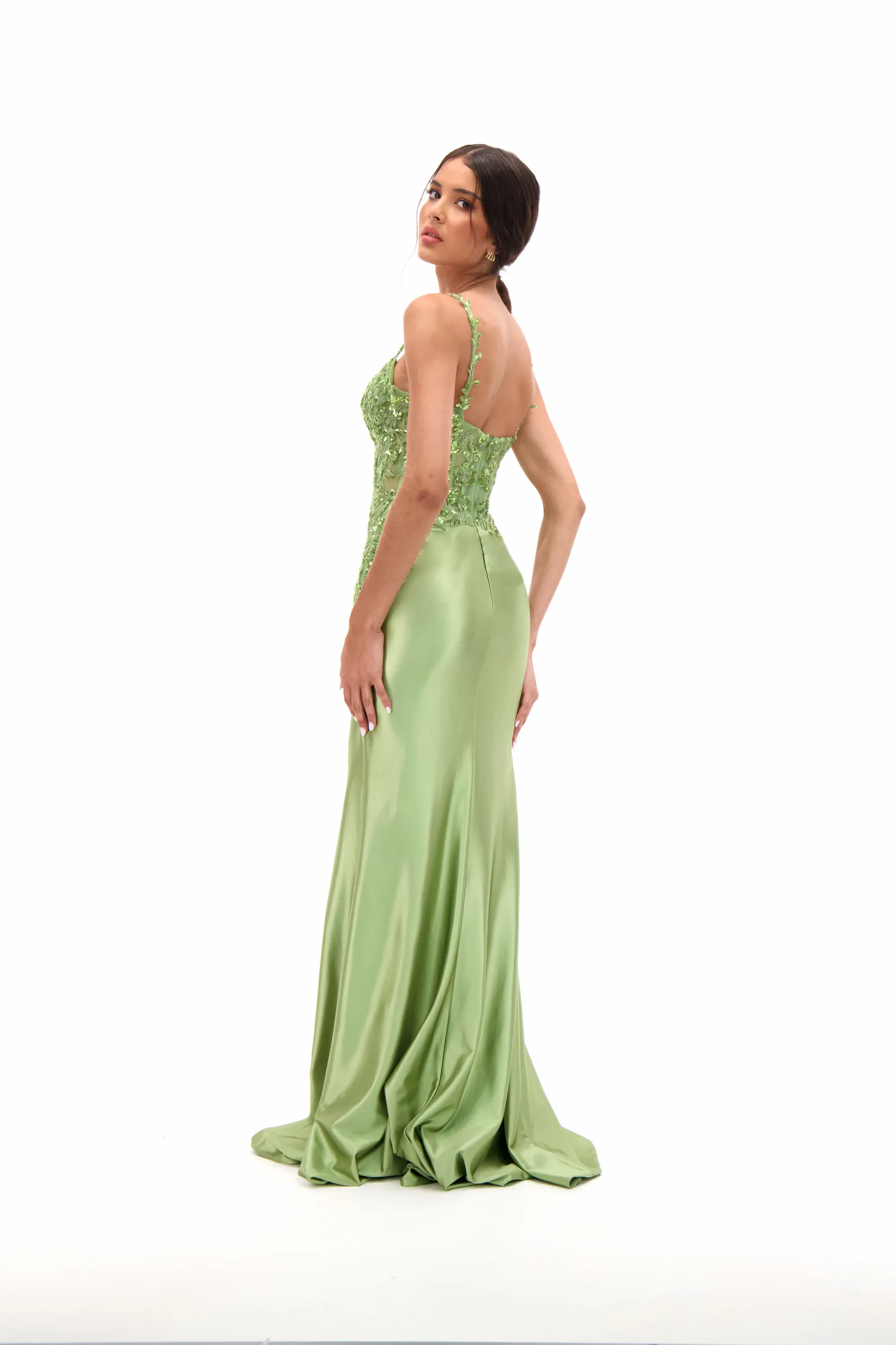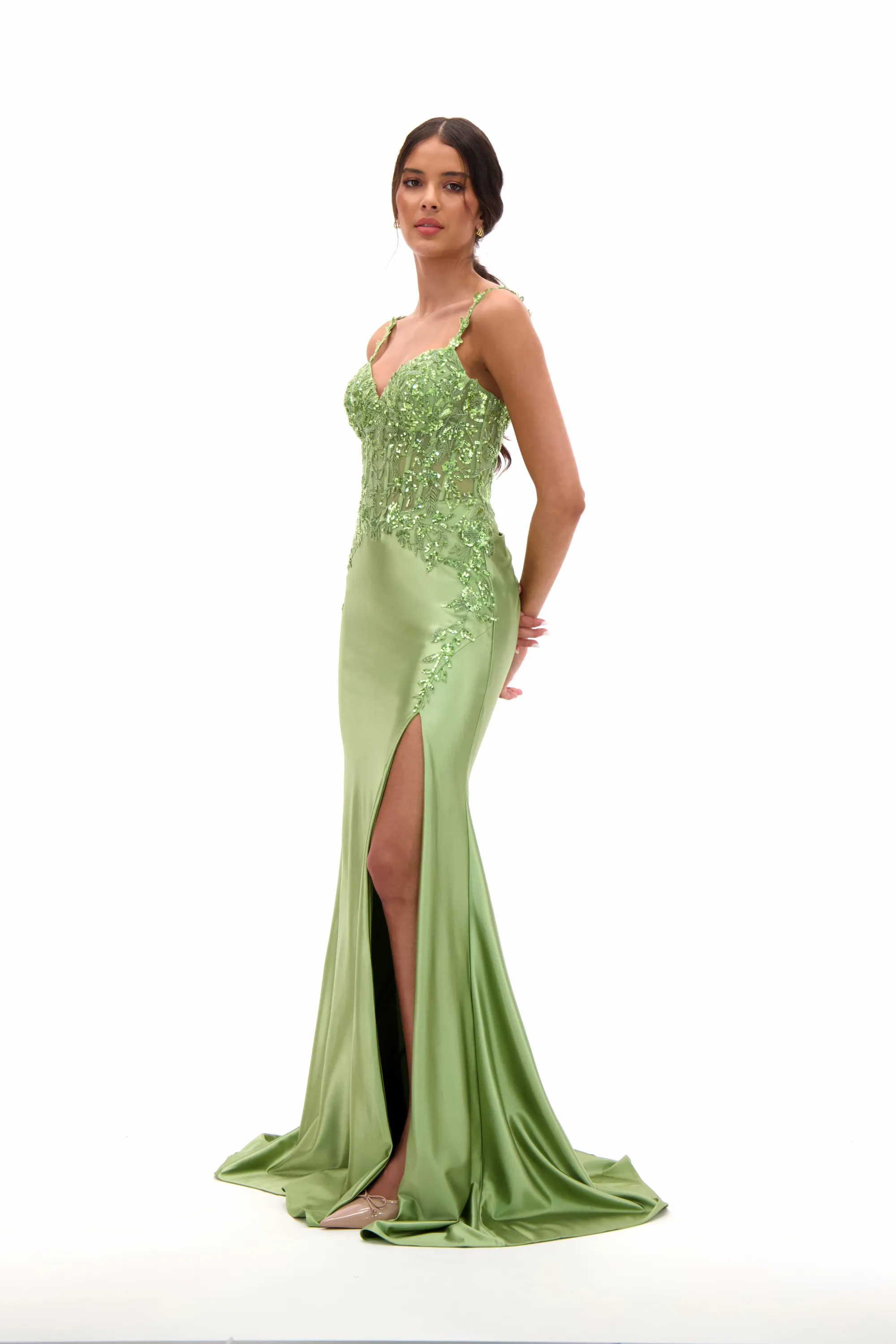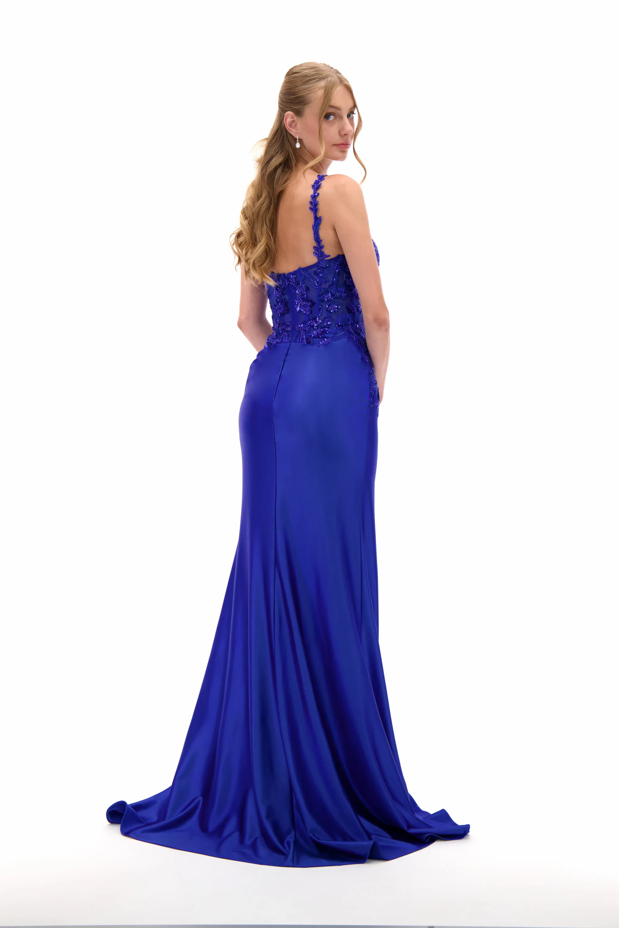 Shimmer with elegance in this embellished sweetheart satin prom dress, designed to highlight your figure with a sleek fitted silhouette. The bodice glistens with beadwork and embroidery, balanced by slim straps and a romantic sweetheart neckline. A high side slit adds just the right amount of boldness, making this gown a flawless choice for proms, pageants, or evening galas.