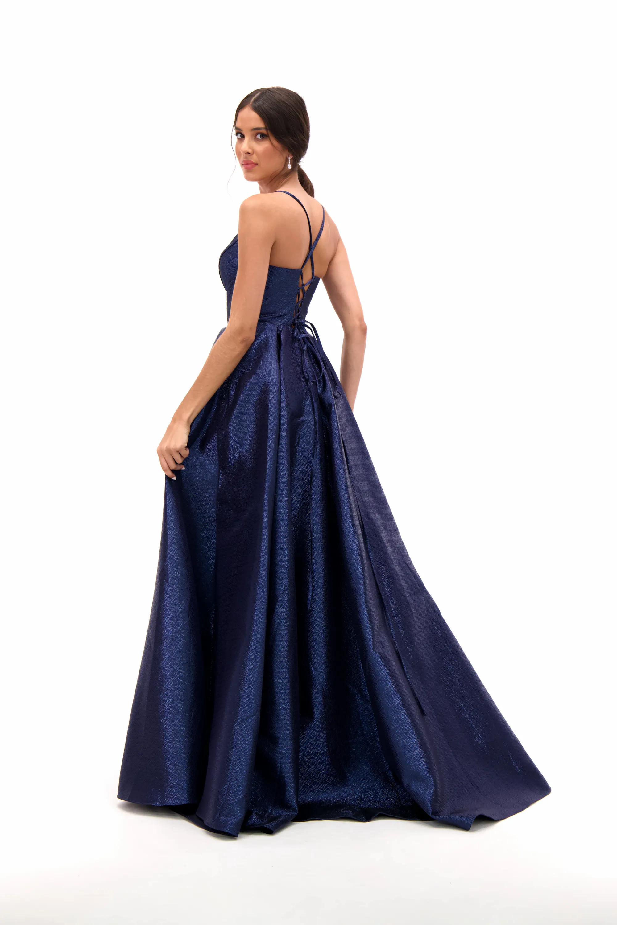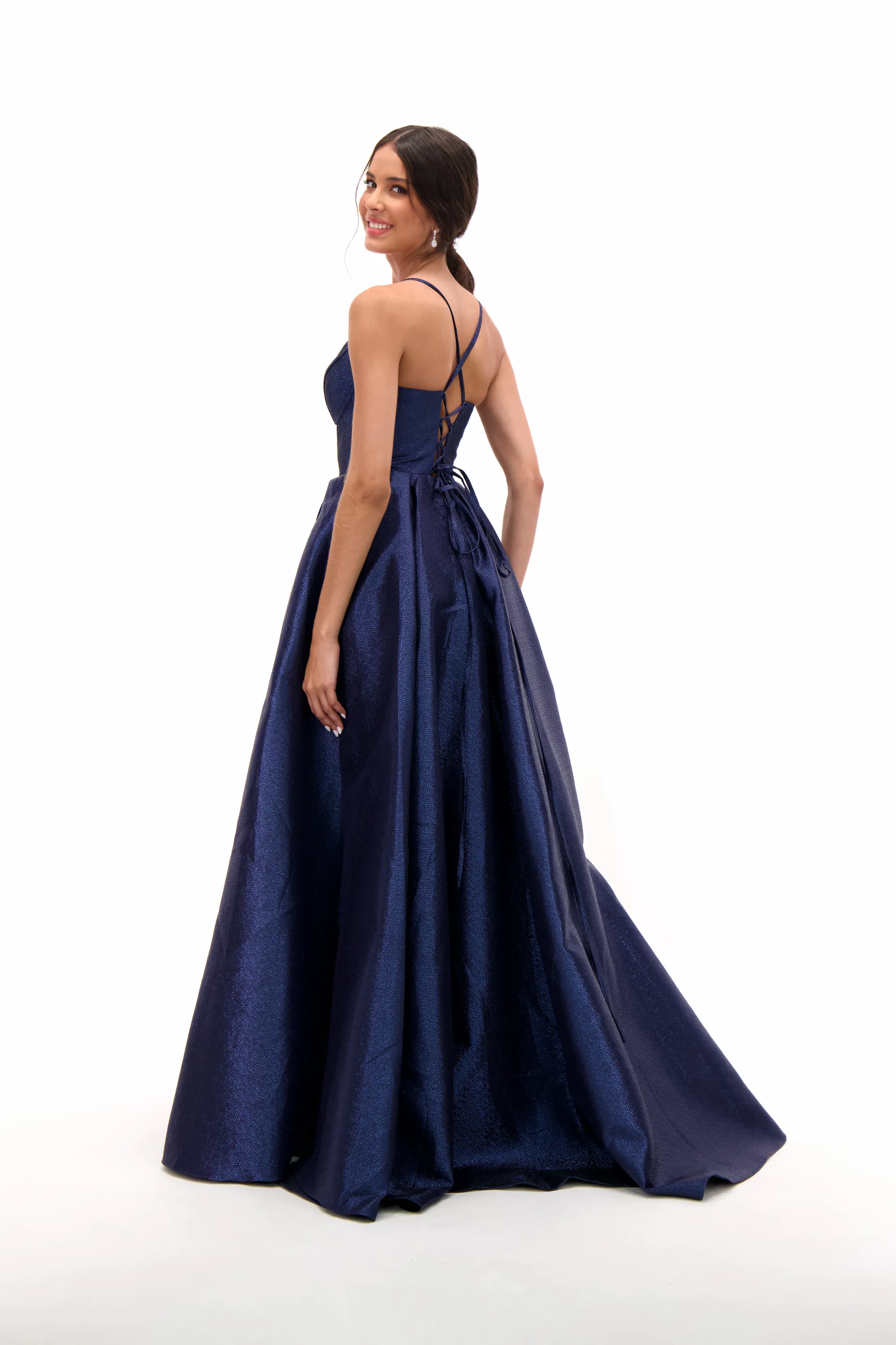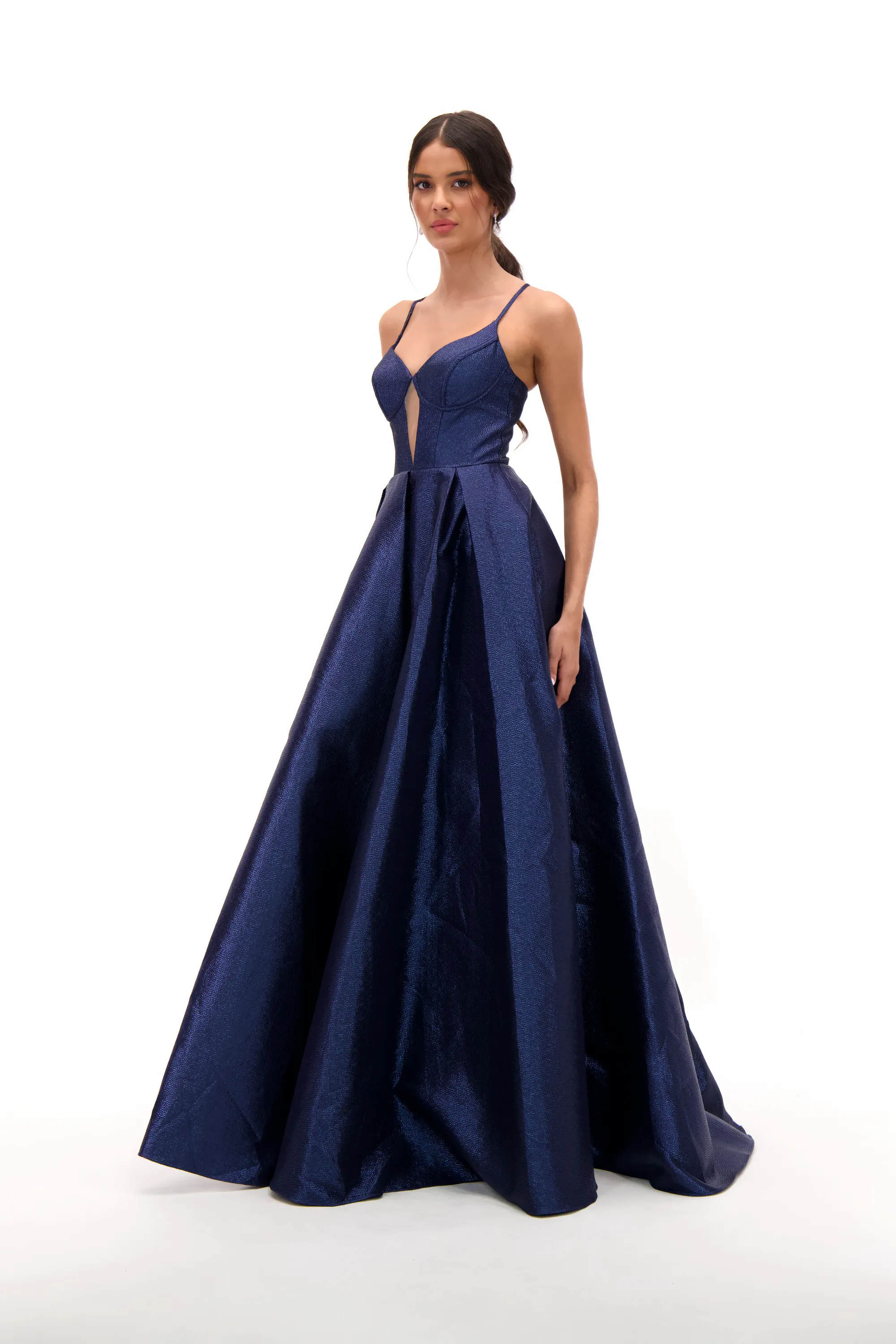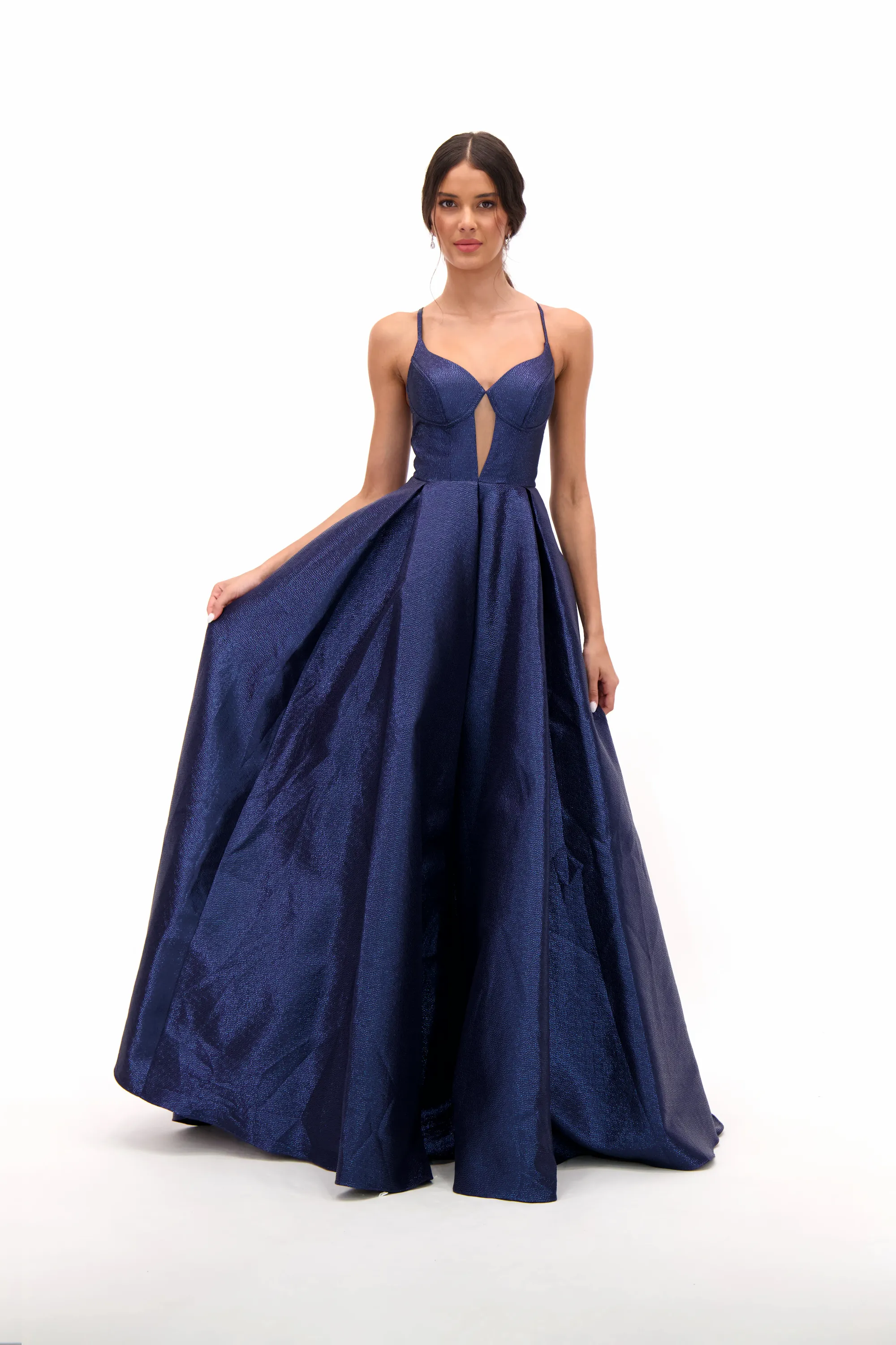 Shine at your next formal event in this stunning metallic navy gown. The design features a fitted bodice with a chic front cutout and delicate spaghetti straps, flowing into a full A-line skirt that moves effortlessly. Both bold and elegant, this gown is the perfect choice for prom, galas, and evening occasions where you want to stand out with timeless glamour.
