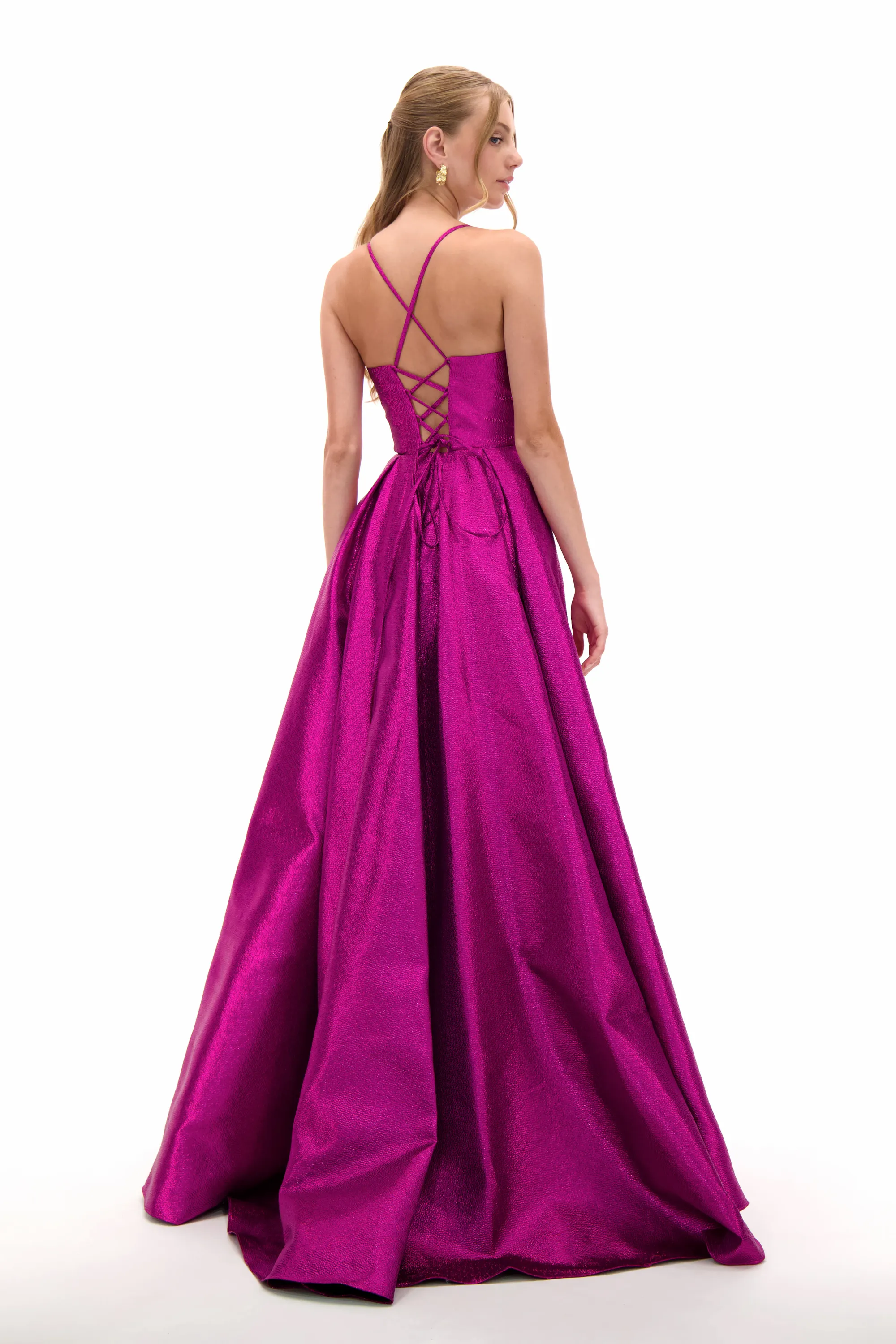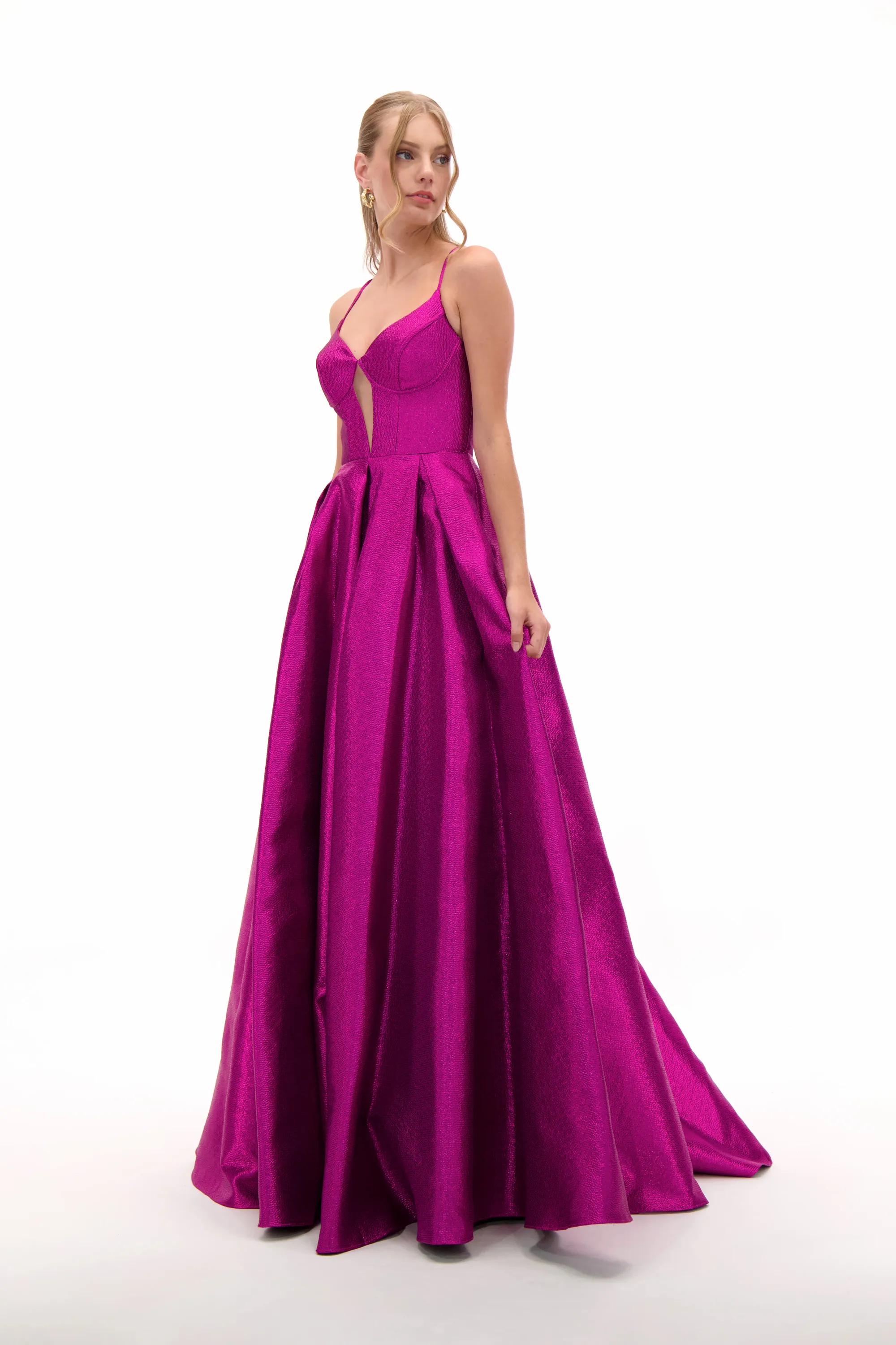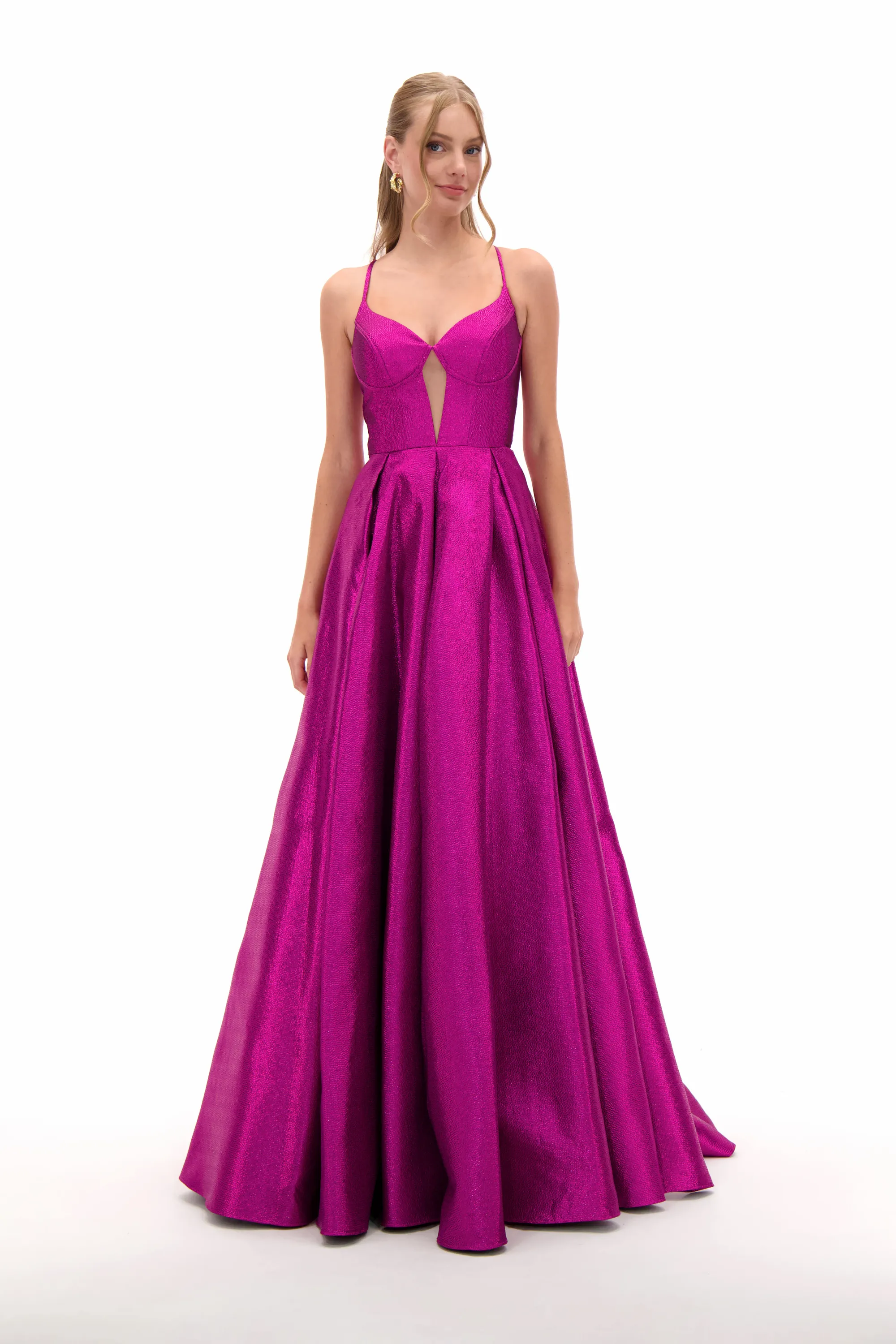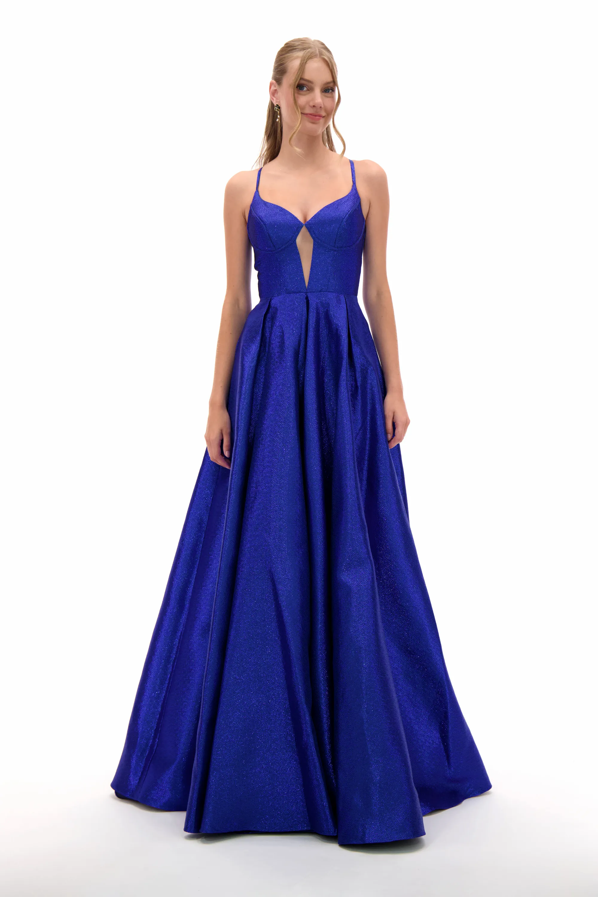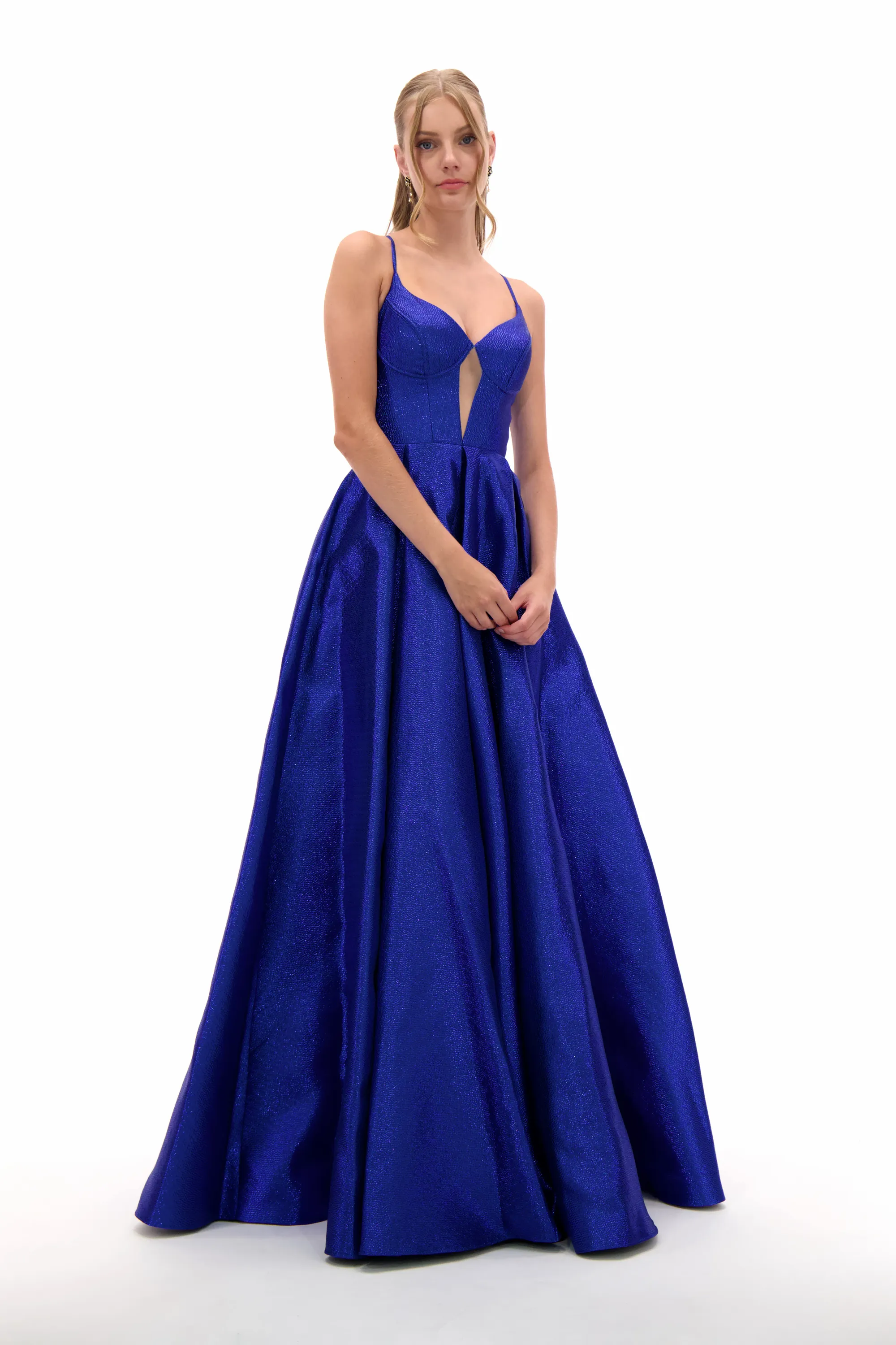 Shine at your next formal event in this stunning metallic navy gown. The design features a fitted bodice with a chic front cutout and delicate spaghetti straps, flowing into a full A-line skirt that moves effortlessly. Both bold and elegant, this gown is the perfect choice for prom, galas, and evening occasions where you want to stand out with timeless glamour.
