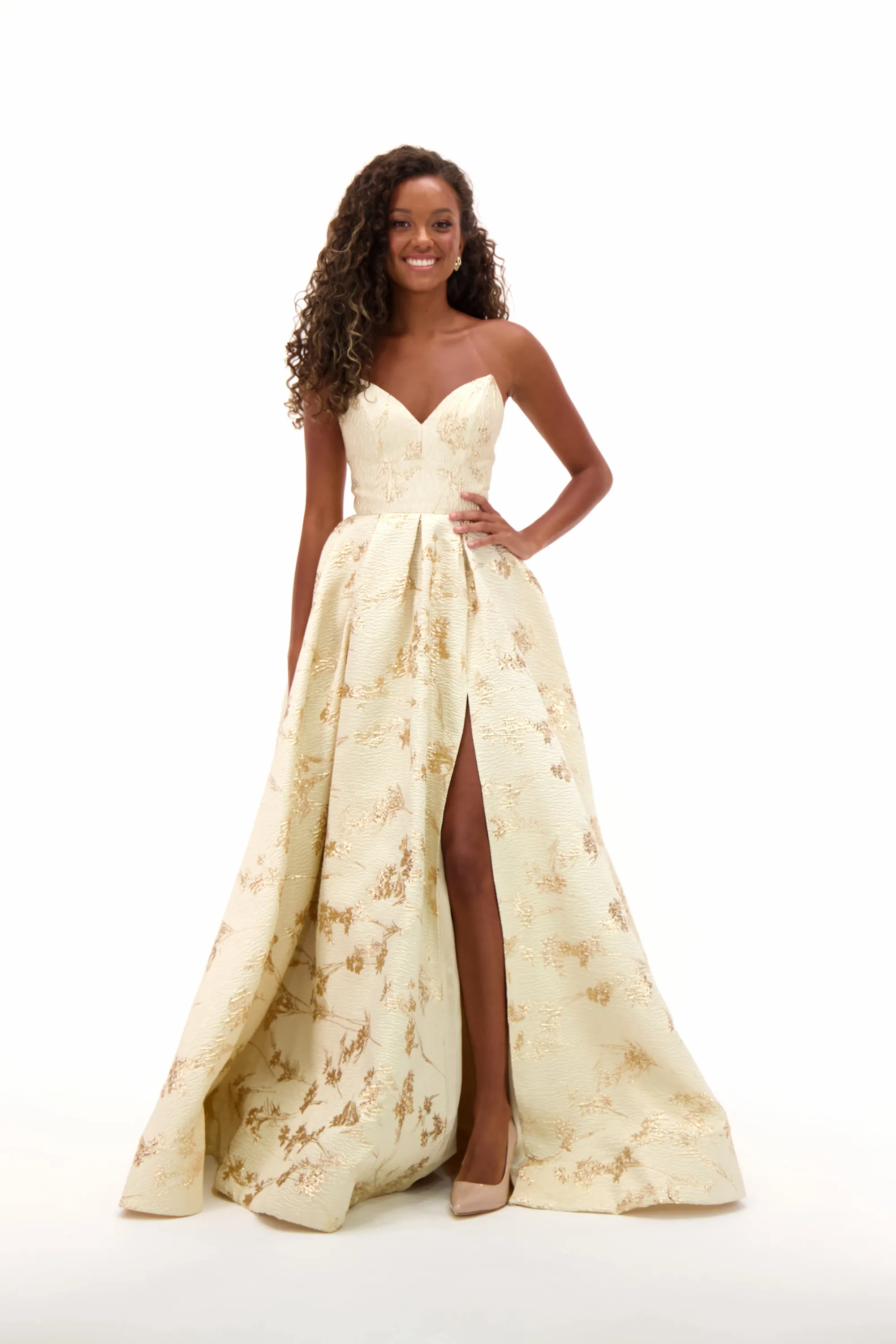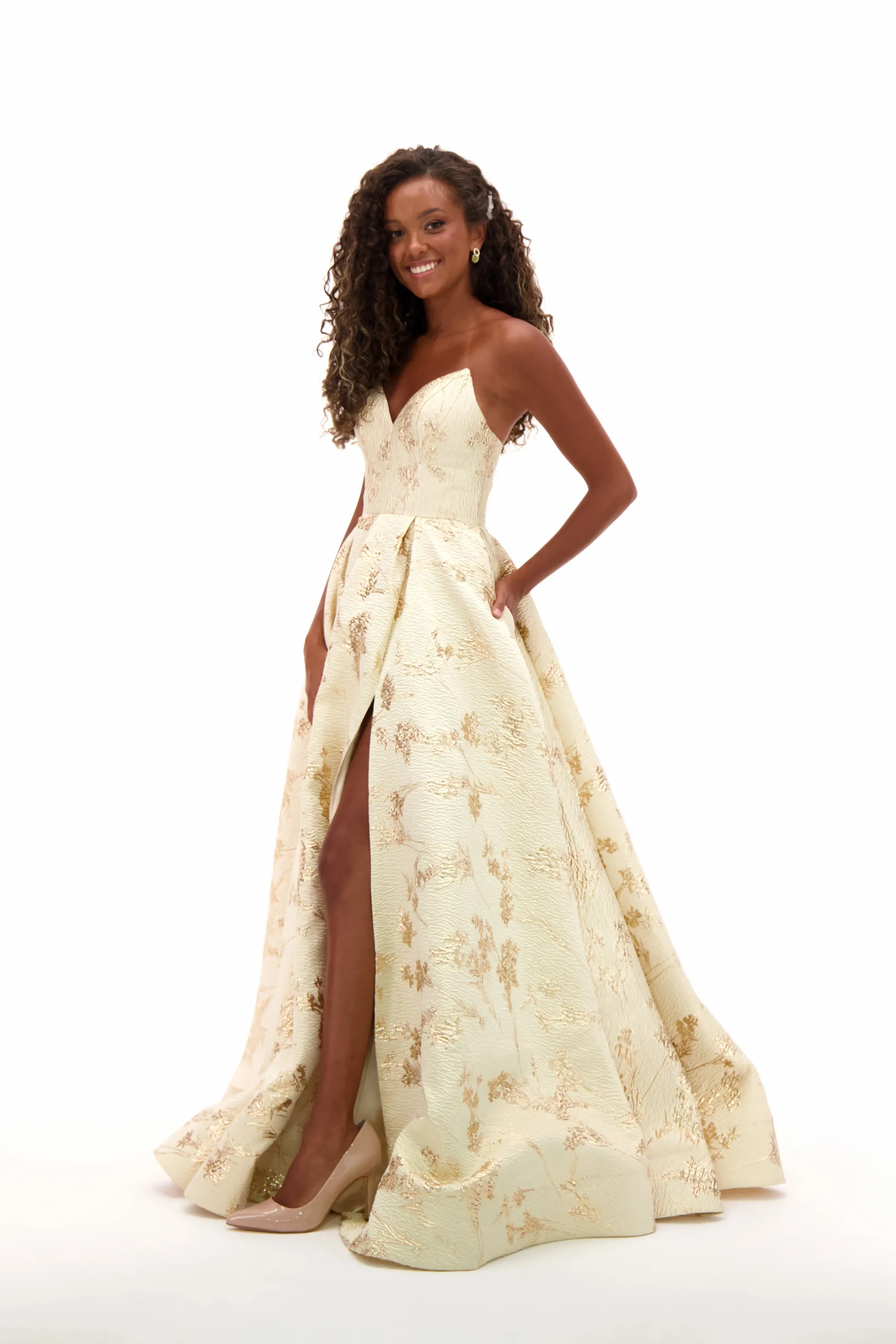 Make a grand entrance in this elegant ivory and gold brocade gown. Featuring a deep V-neckline and fitted bodice, the design flows into a dramatic A-line skirt with a high slit for a modern touch. The metallic floral detailing adds a regal finish, making this gown perfect for prom, galas, pageants, or black-tie events.