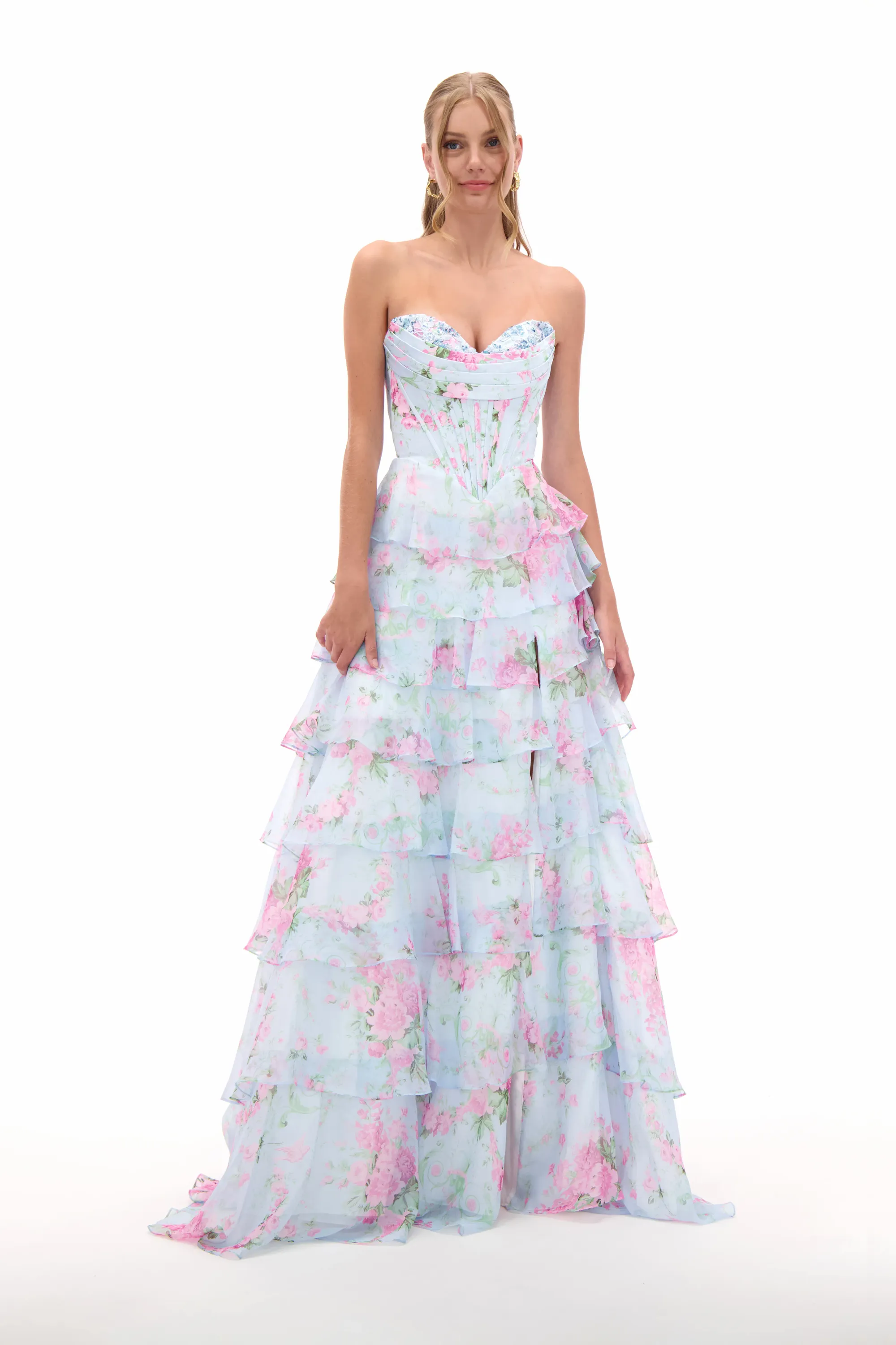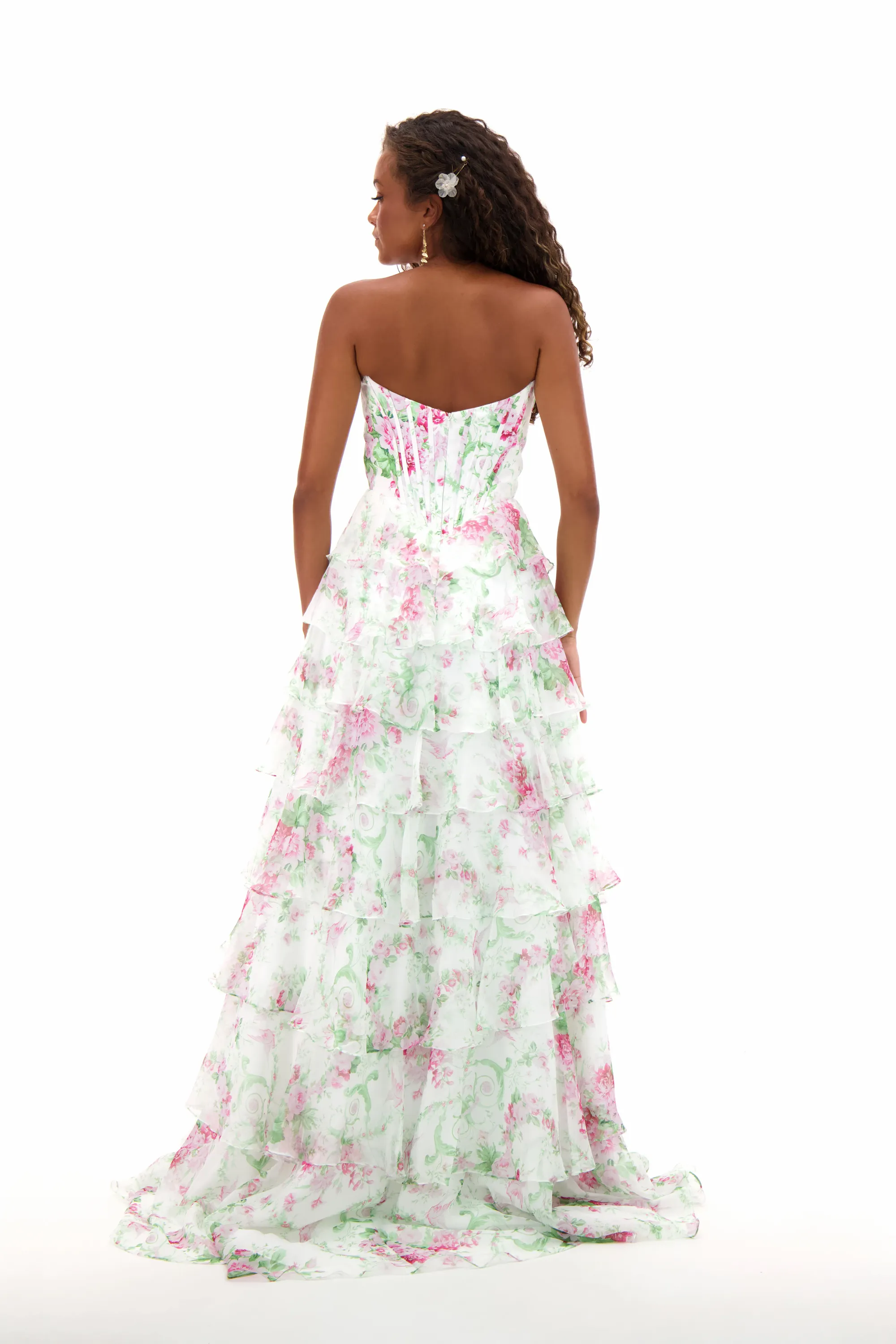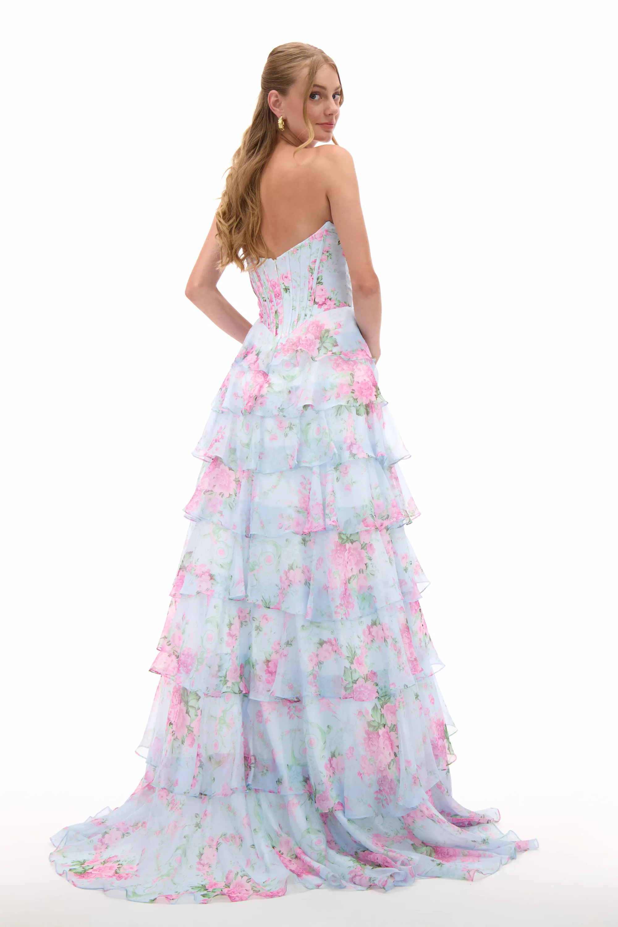Romantic and feminine, this strapless gown features a sweetheart neckline and fitted corset bodice that highlights the waist. The cascading tiered ruffle skirt flows gracefully, while the thigh-high slit adds a flirty edge. Designed in a dreamy pastel floral print, this gown is perfect for prom, spring formals, and garden-inspired events.
