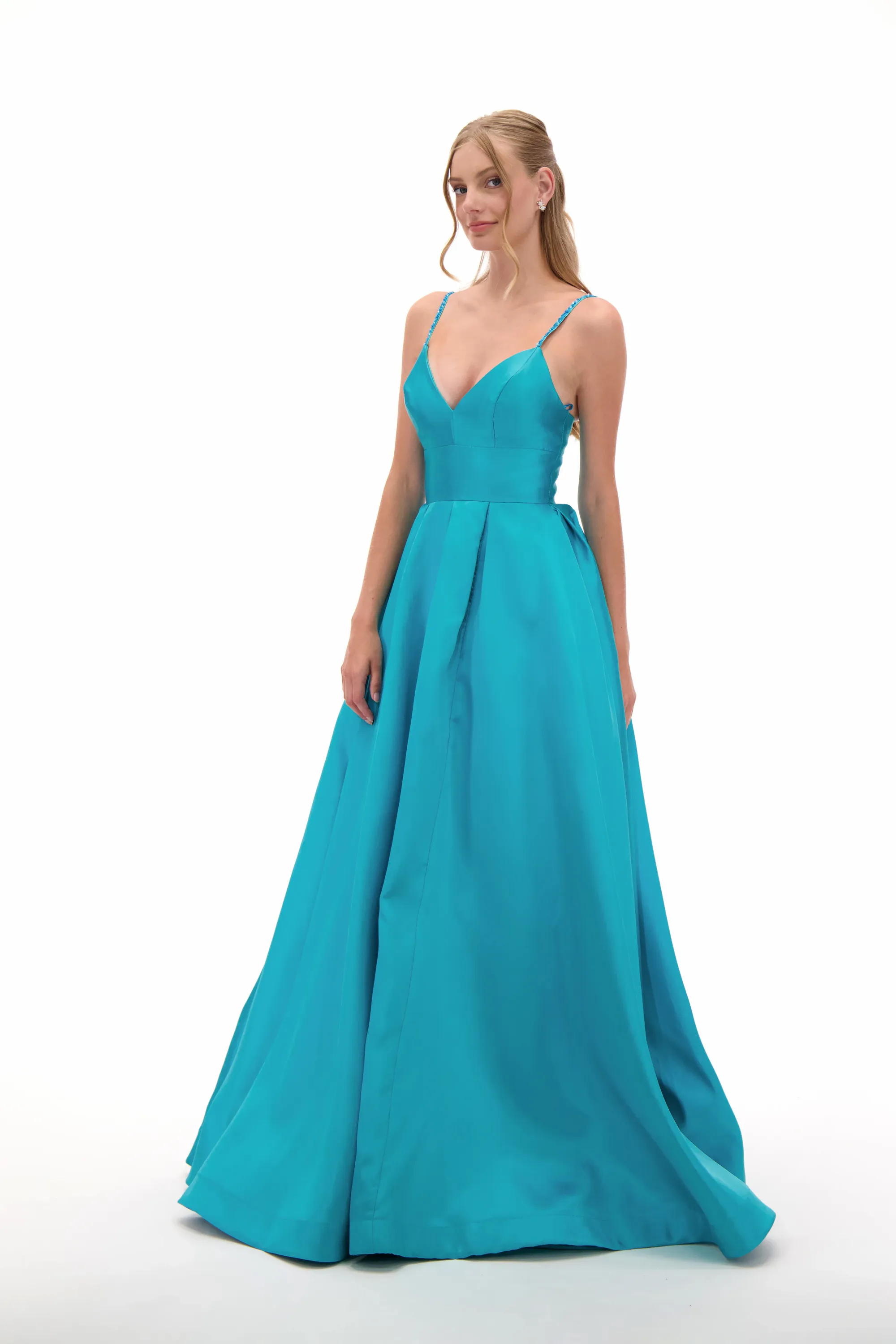 Stand out in this vibrant ball gown featuring a flattering V-neckline and delicate beaded straps for a touch of sparkle. The fitted bodice flows into a full pleated skirt that creates a dramatic silhouette, perfect for twirling on the dance floor. Ideal for prom, quinceaƱeras, and evening galas, this gown is a stunning mix of elegance and youthful charm.