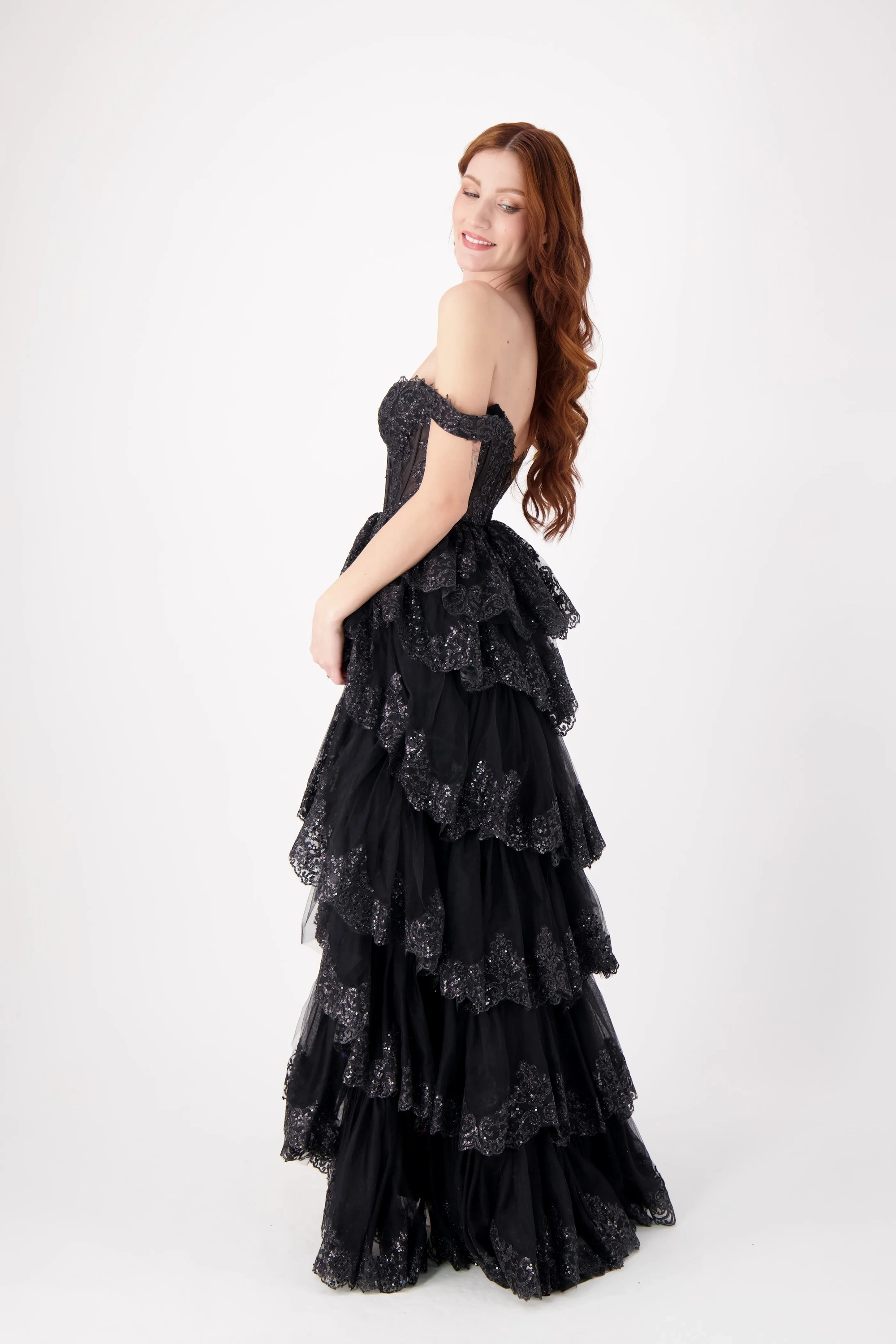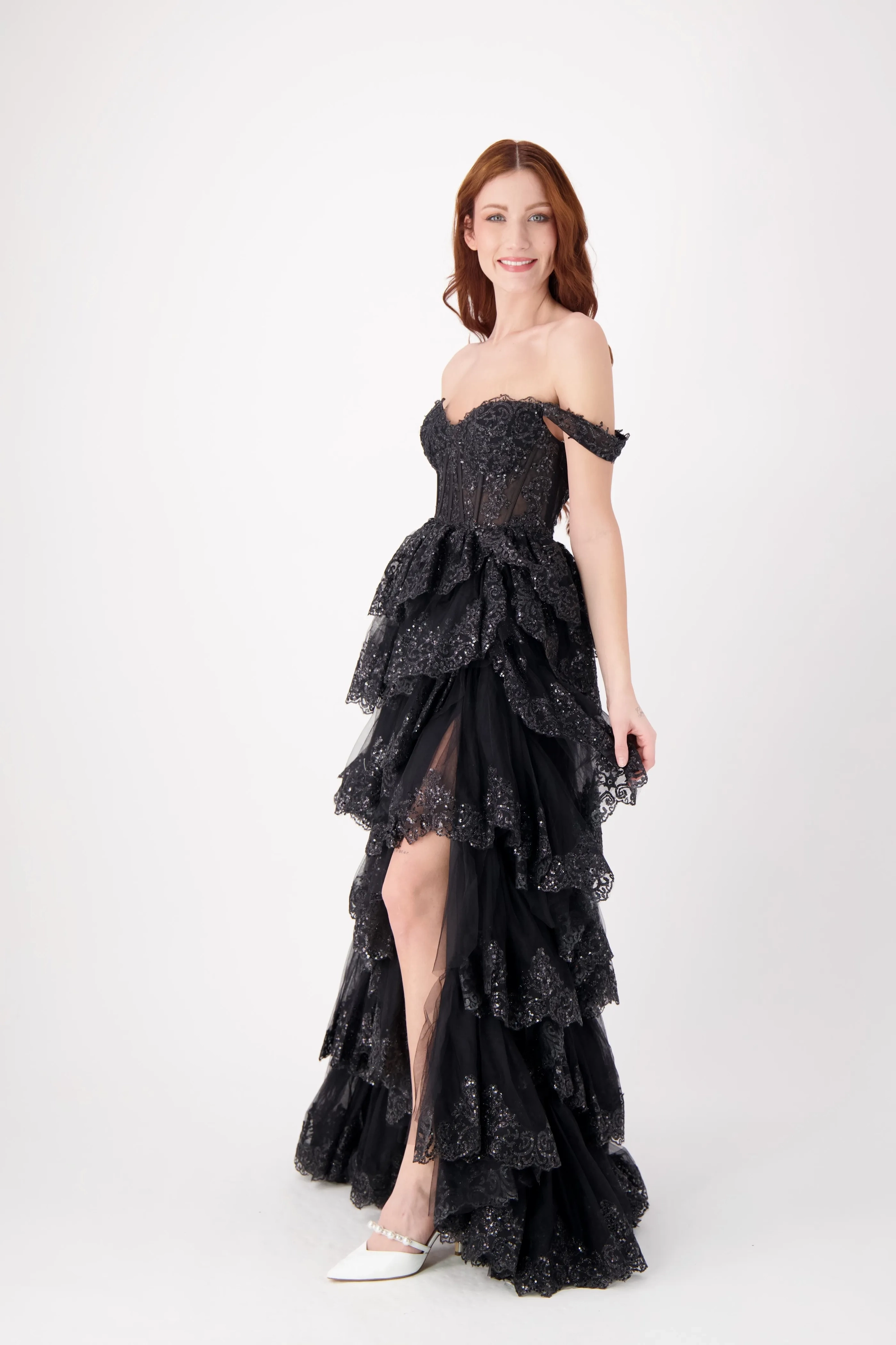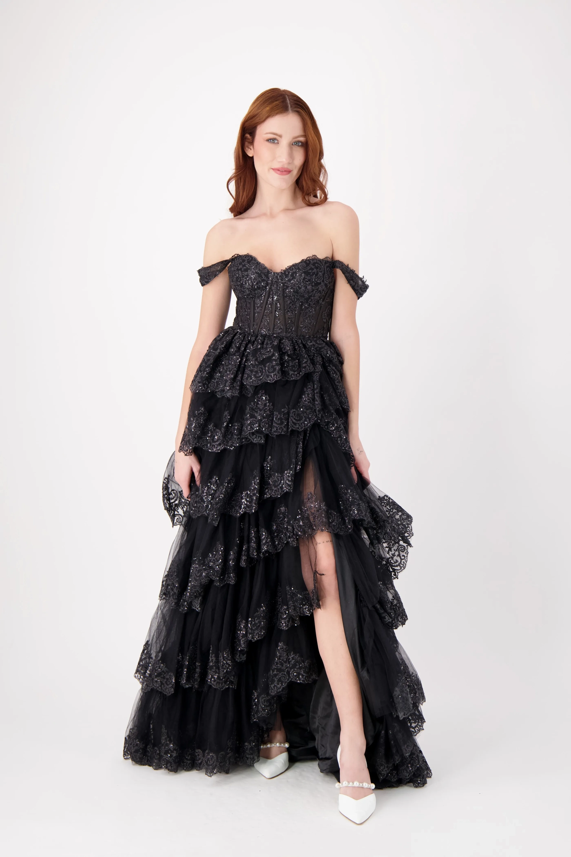 Dramatic and elegant, this black gown features an off-shoulder neckline with a structured corset bodice that accentuates the waist. The layered lace tiered skirt adds volume and movement, while the thigh-high slit brings a modern, daring twist. Perfect for prom, galas, or black-tie events, this gown is designed to captivate with gothic-inspired glamour.