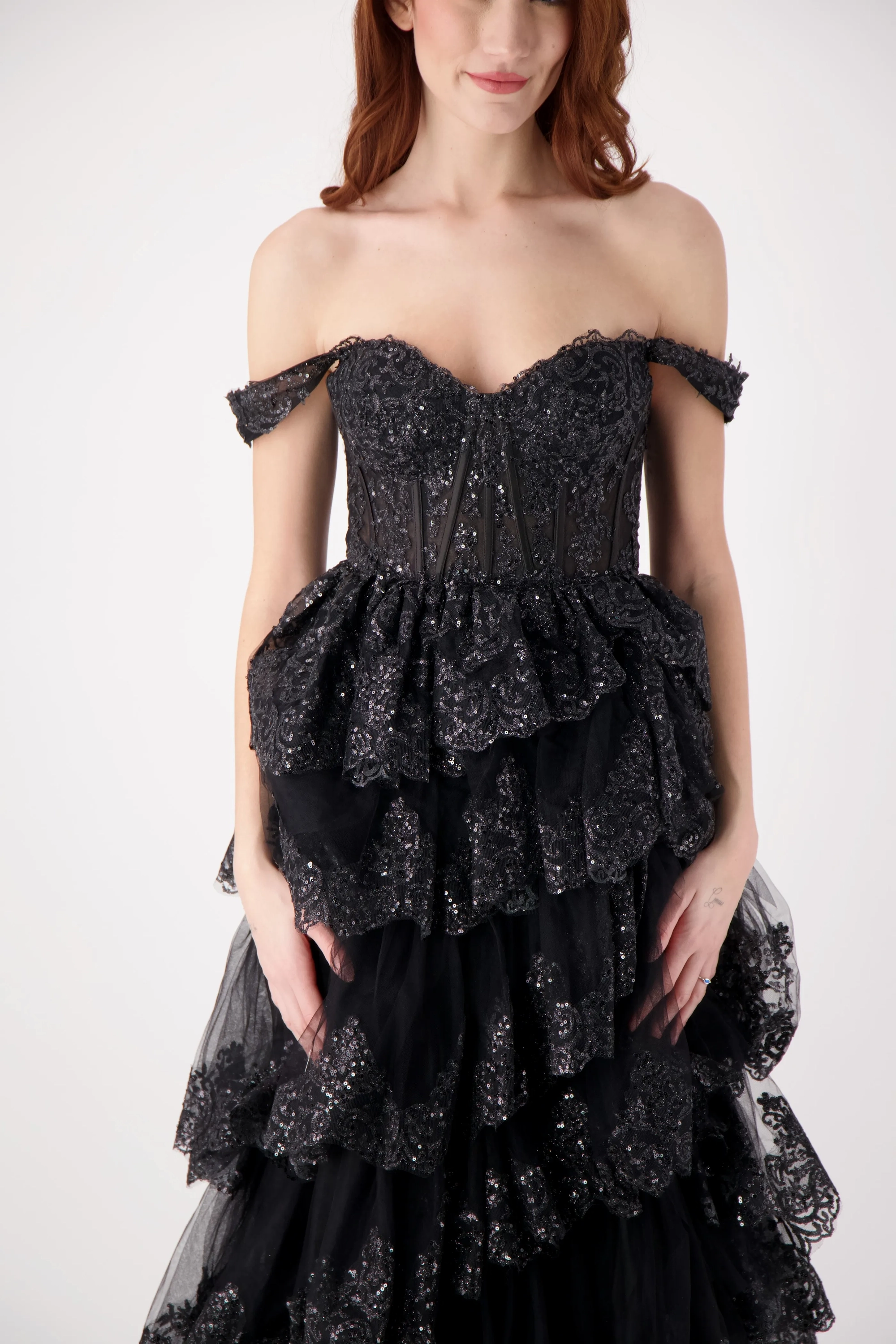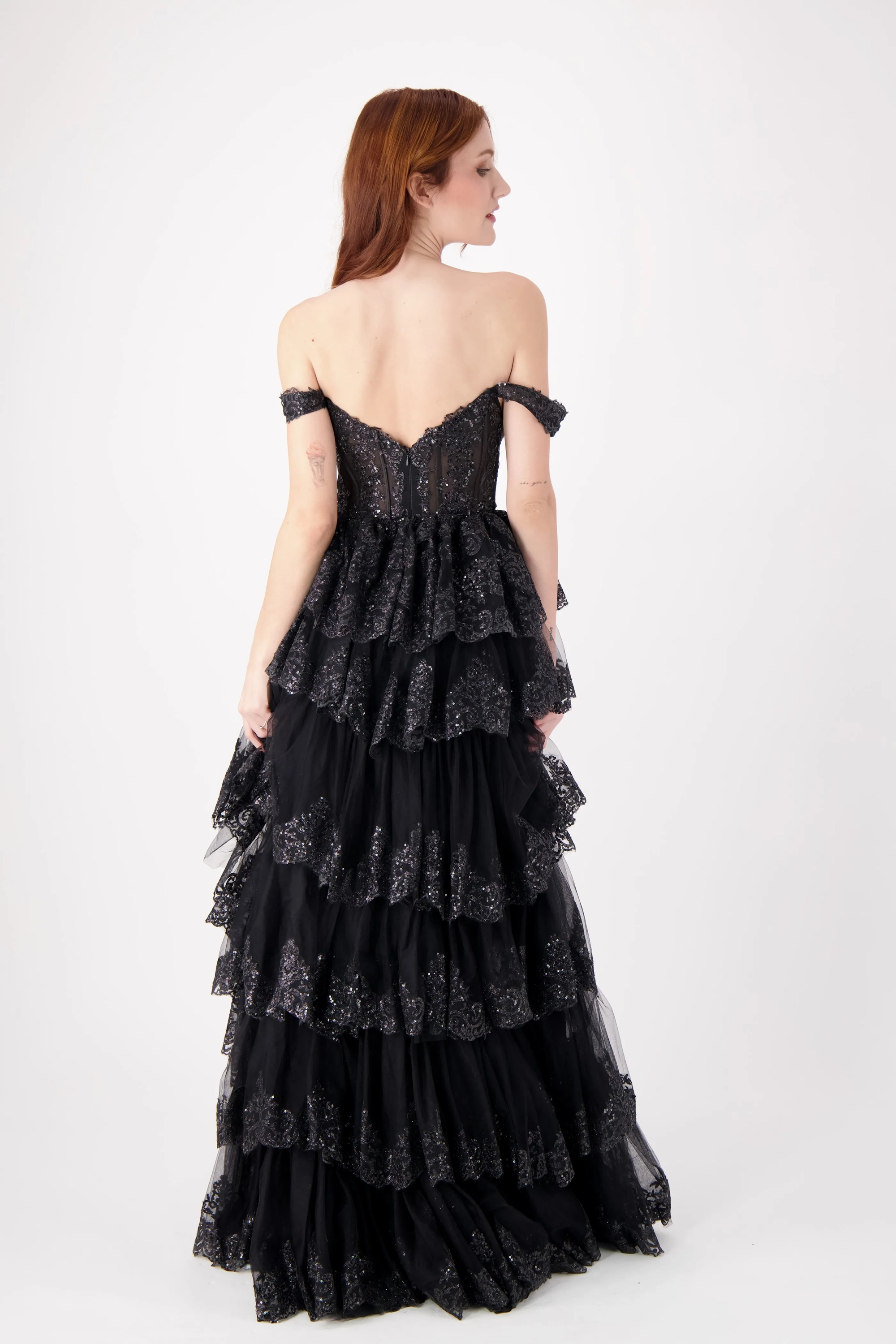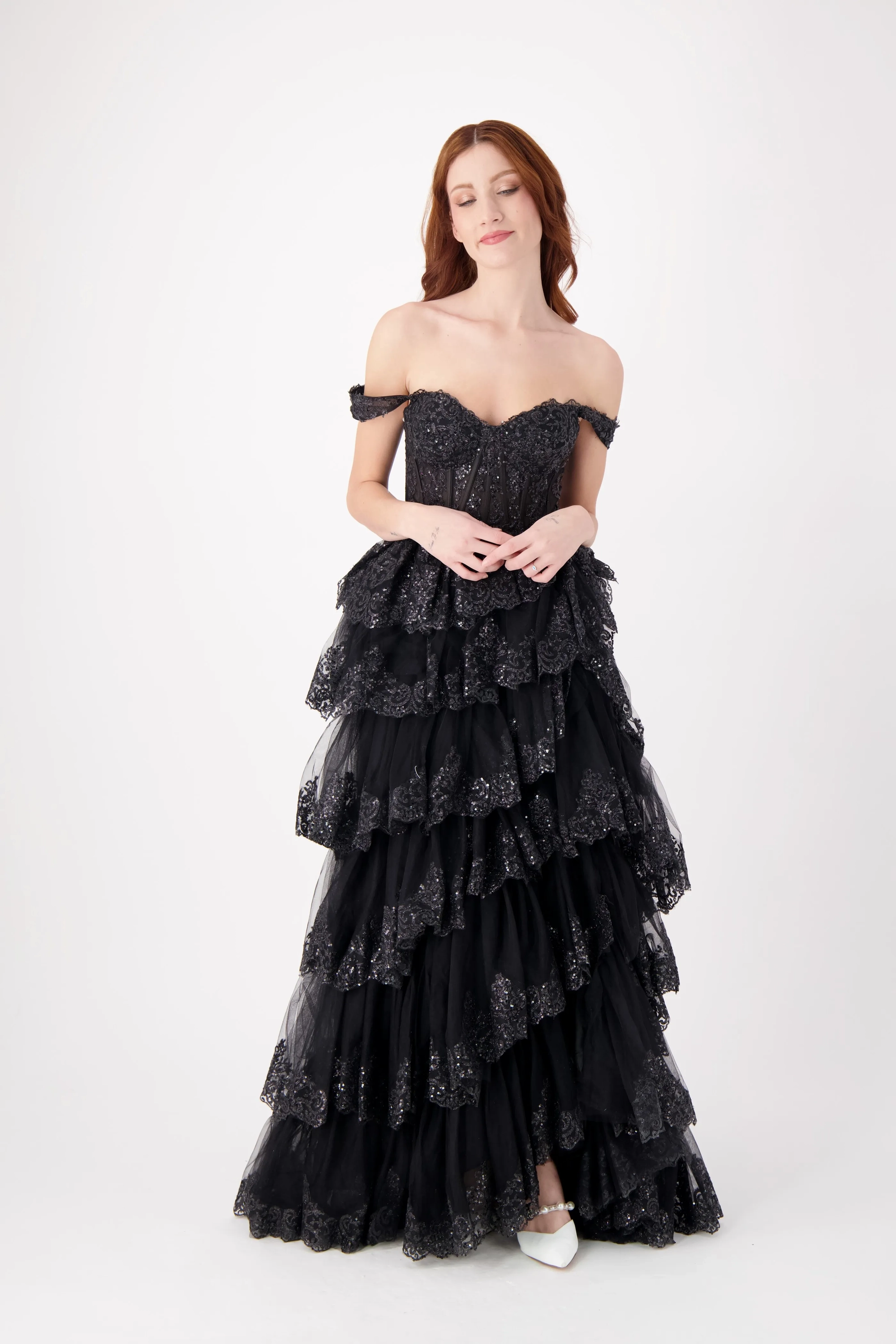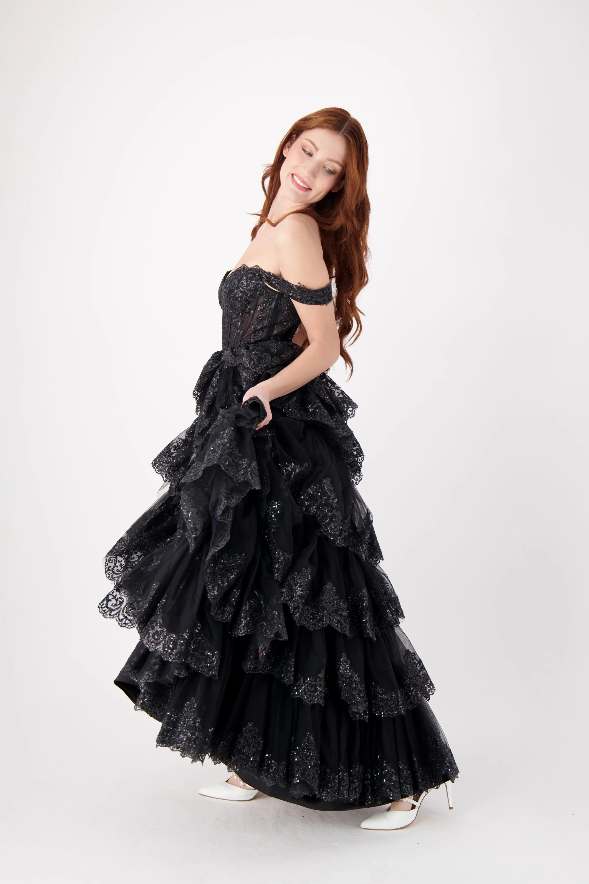 Dramatic and elegant, this black gown features an off-shoulder neckline with a structured corset bodice that accentuates the waist. The layered lace tiered skirt adds volume and movement, while the thigh-high slit brings a modern, daring twist. Perfect for prom, galas, or black-tie events, this gown is designed to captivate with gothic-inspired glamour.
