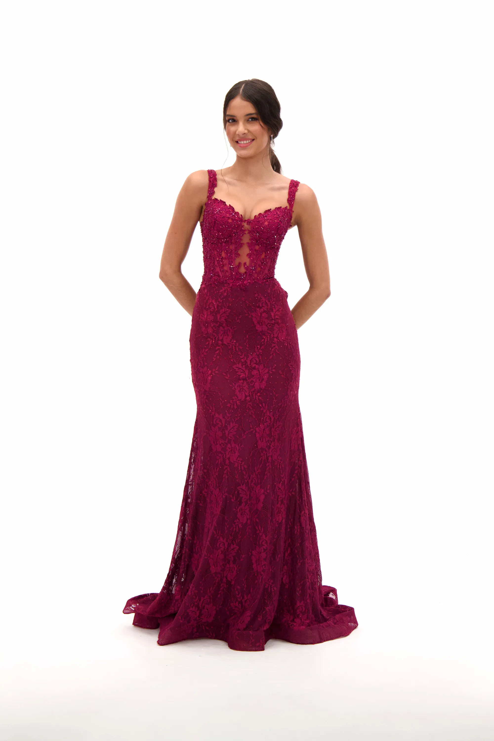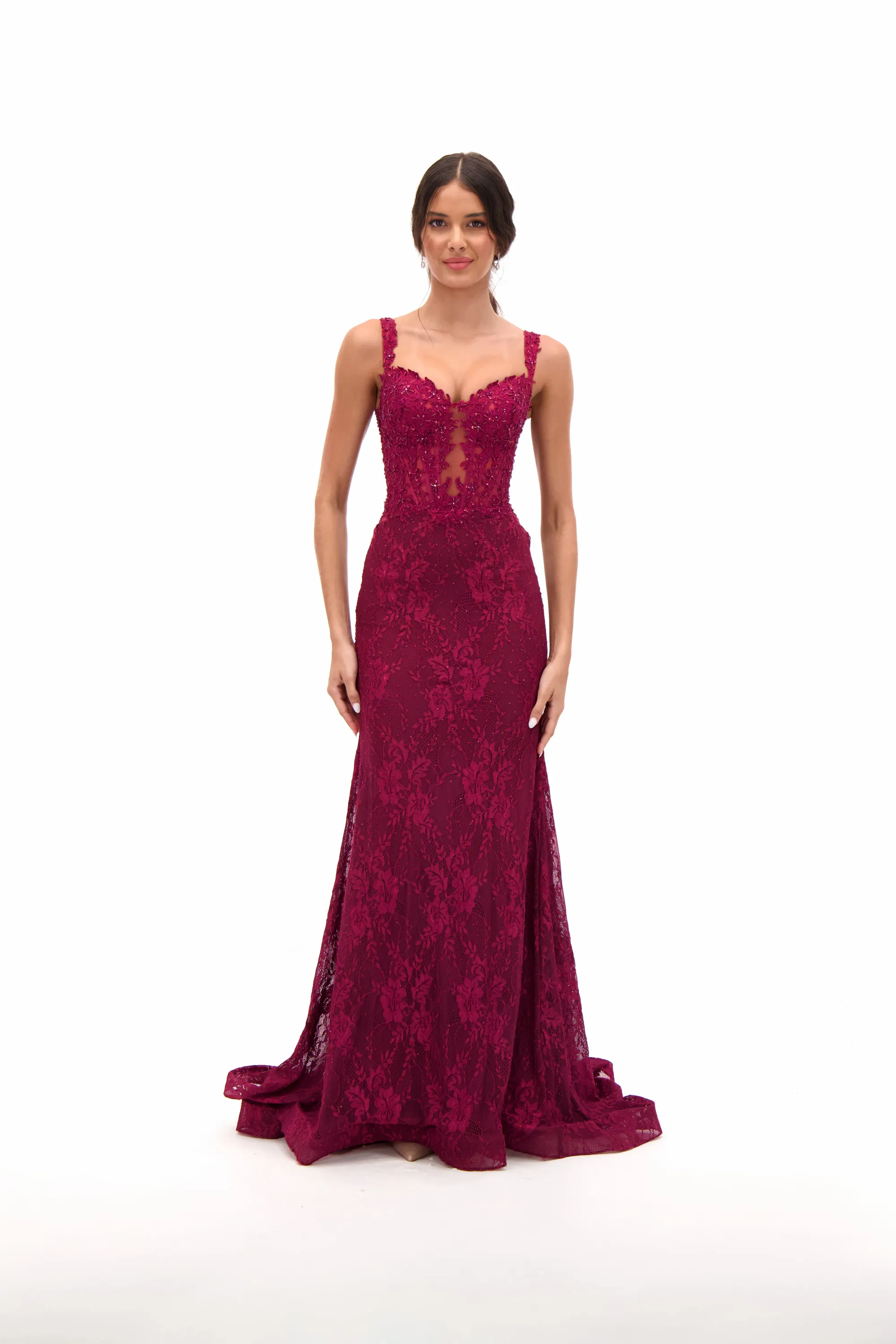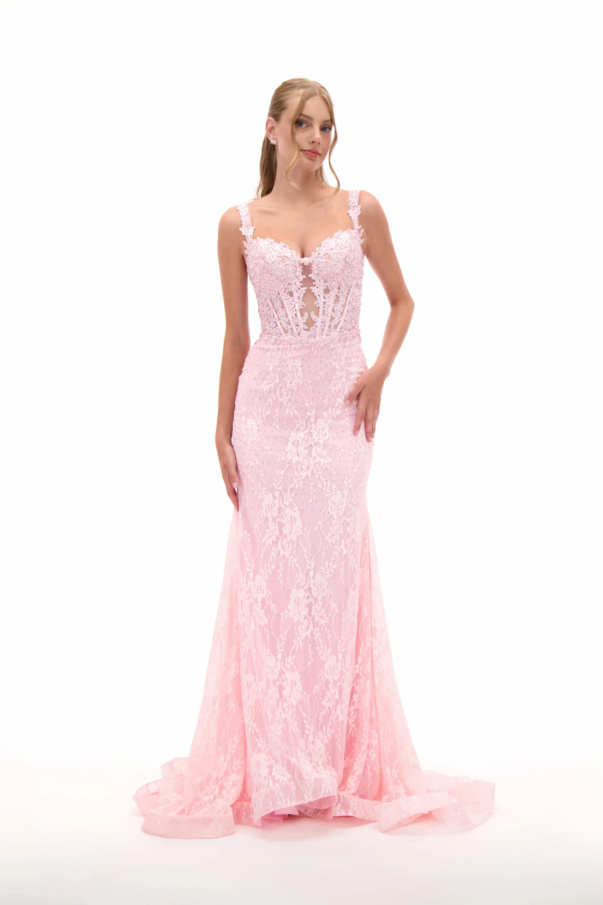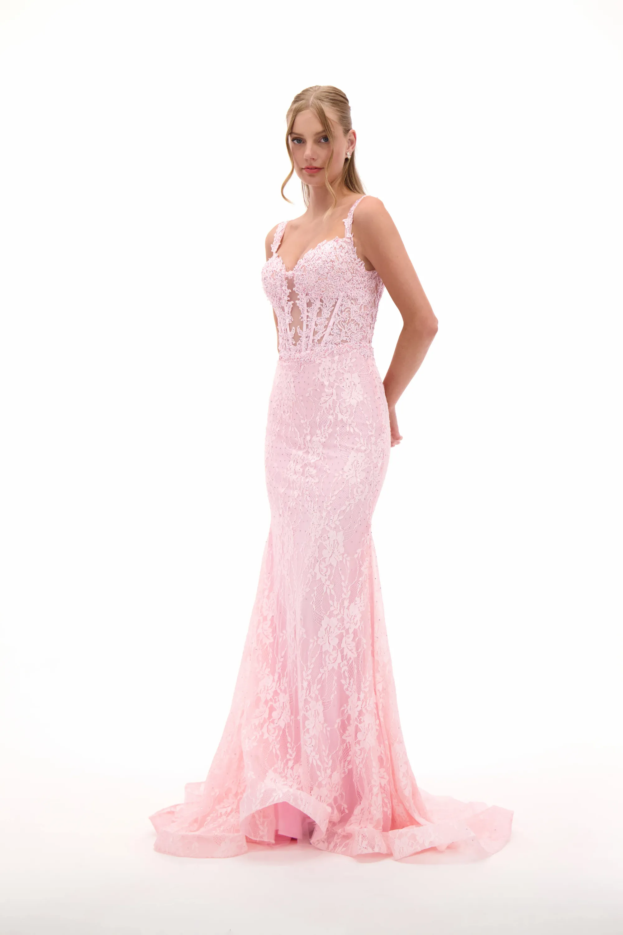 Romantic and feminine, this blush pink gown features an intricate lace design with a fitted silhouette that flatters every curve. The illusion plunge bodice with delicate straps adds a modern, flirty touch, while the subtle train completes the look with elegance. Perfect for prom, weddings, or evening galas, this gown embodies timeless beauty with a soft, graceful finish.