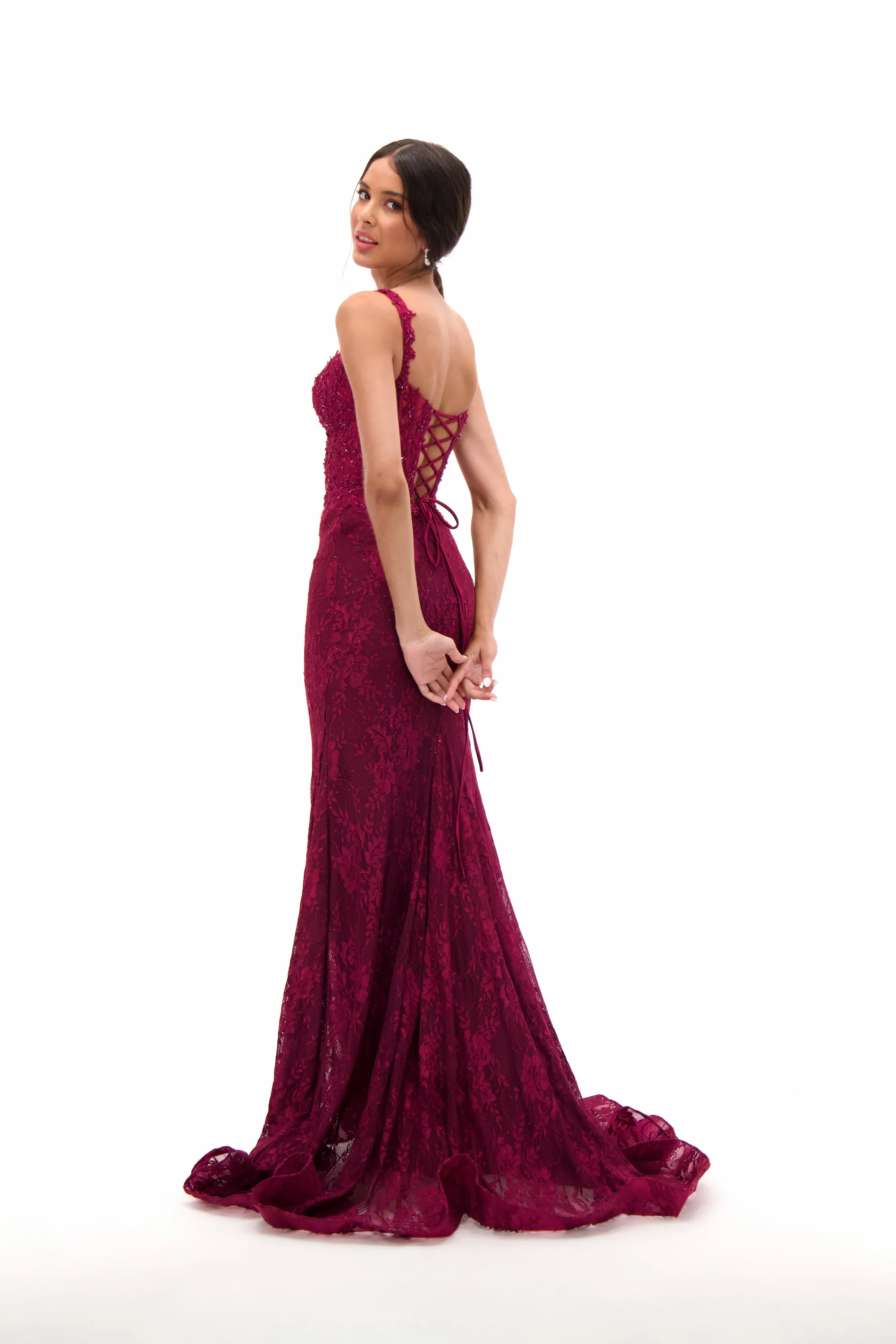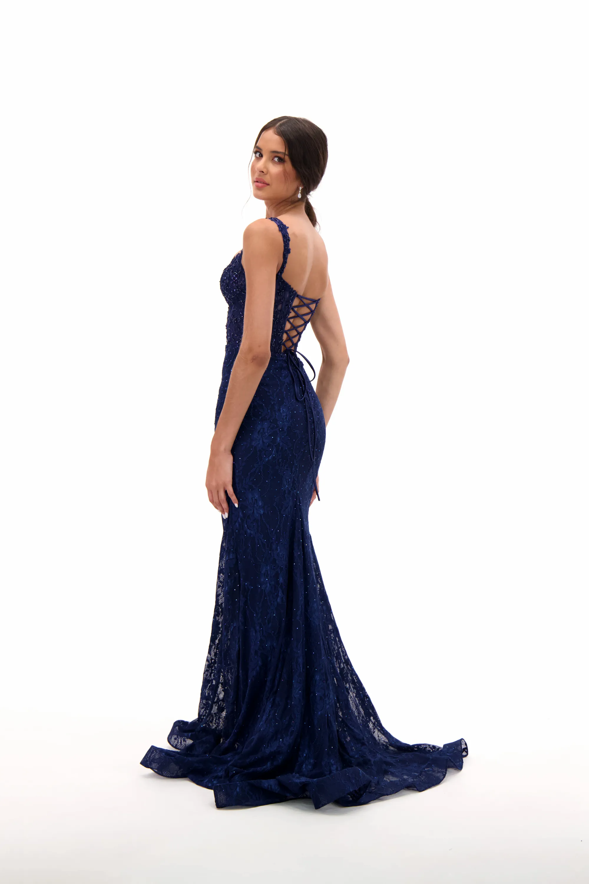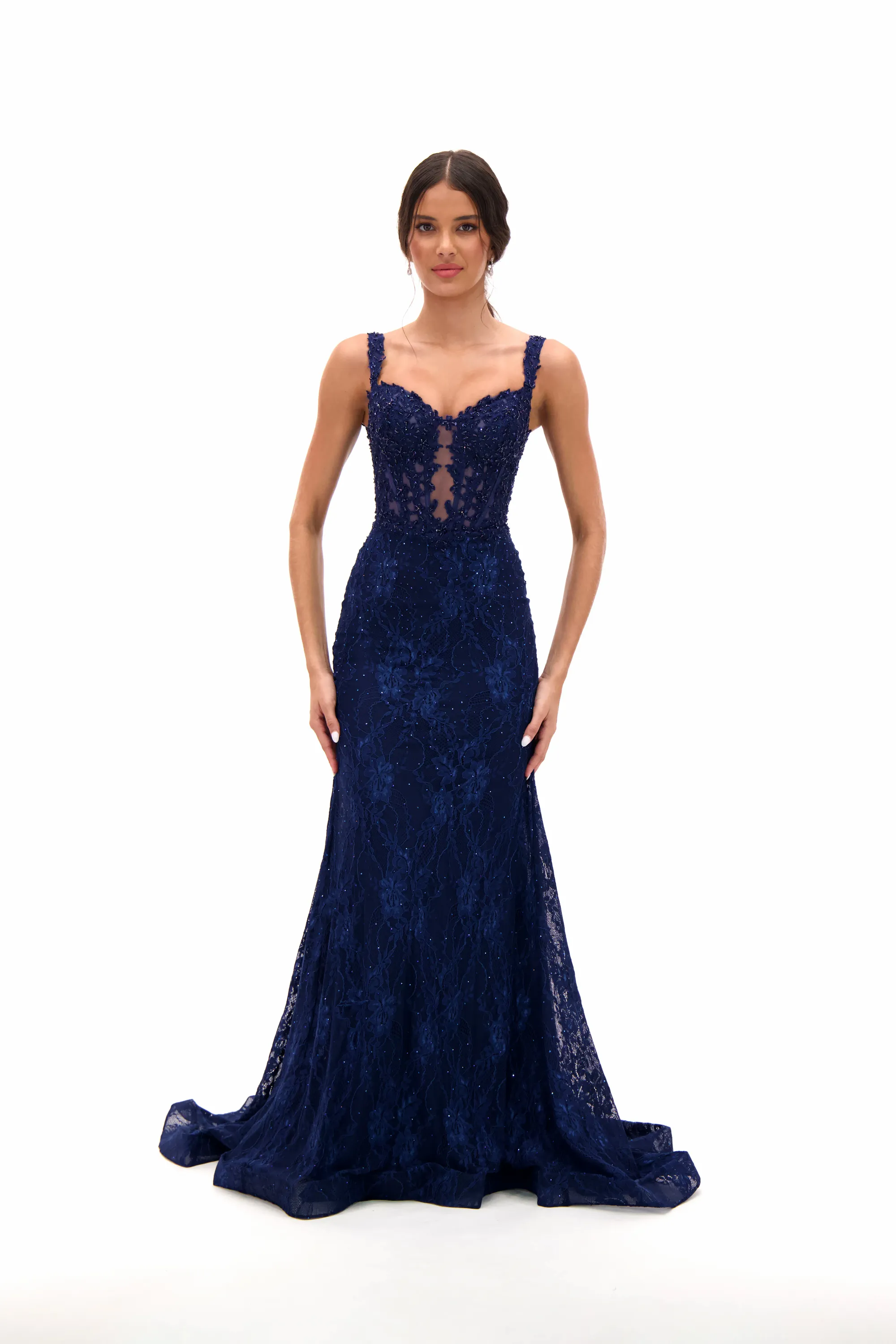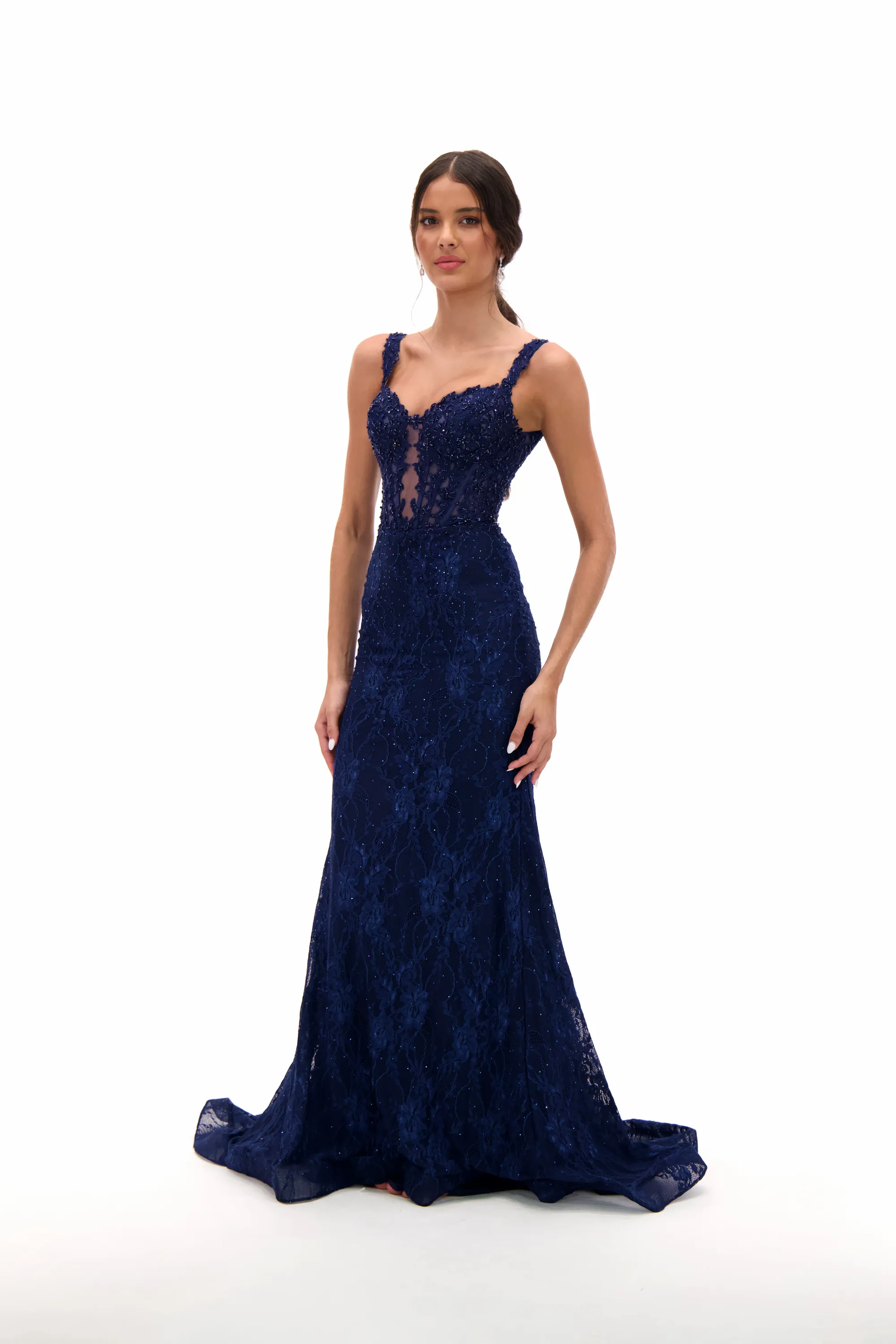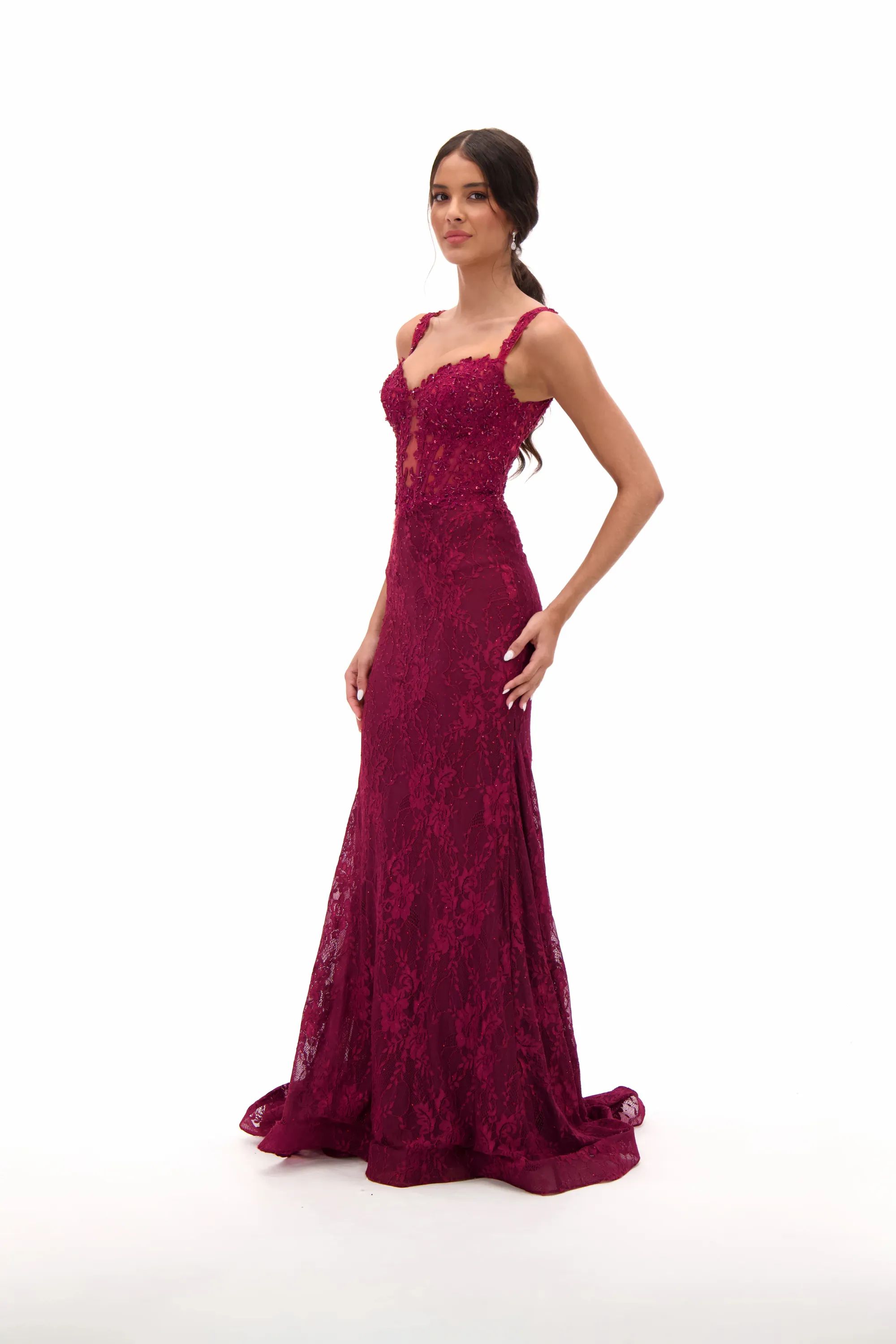Romantic and feminine, this blush pink gown features an intricate lace design with a fitted silhouette that flatters every curve. The illusion plunge bodice with delicate straps adds a modern, flirty touch, while the subtle train completes the look with elegance. Perfect for prom, weddings, or evening galas, this gown embodies timeless beauty with a soft, graceful finish.