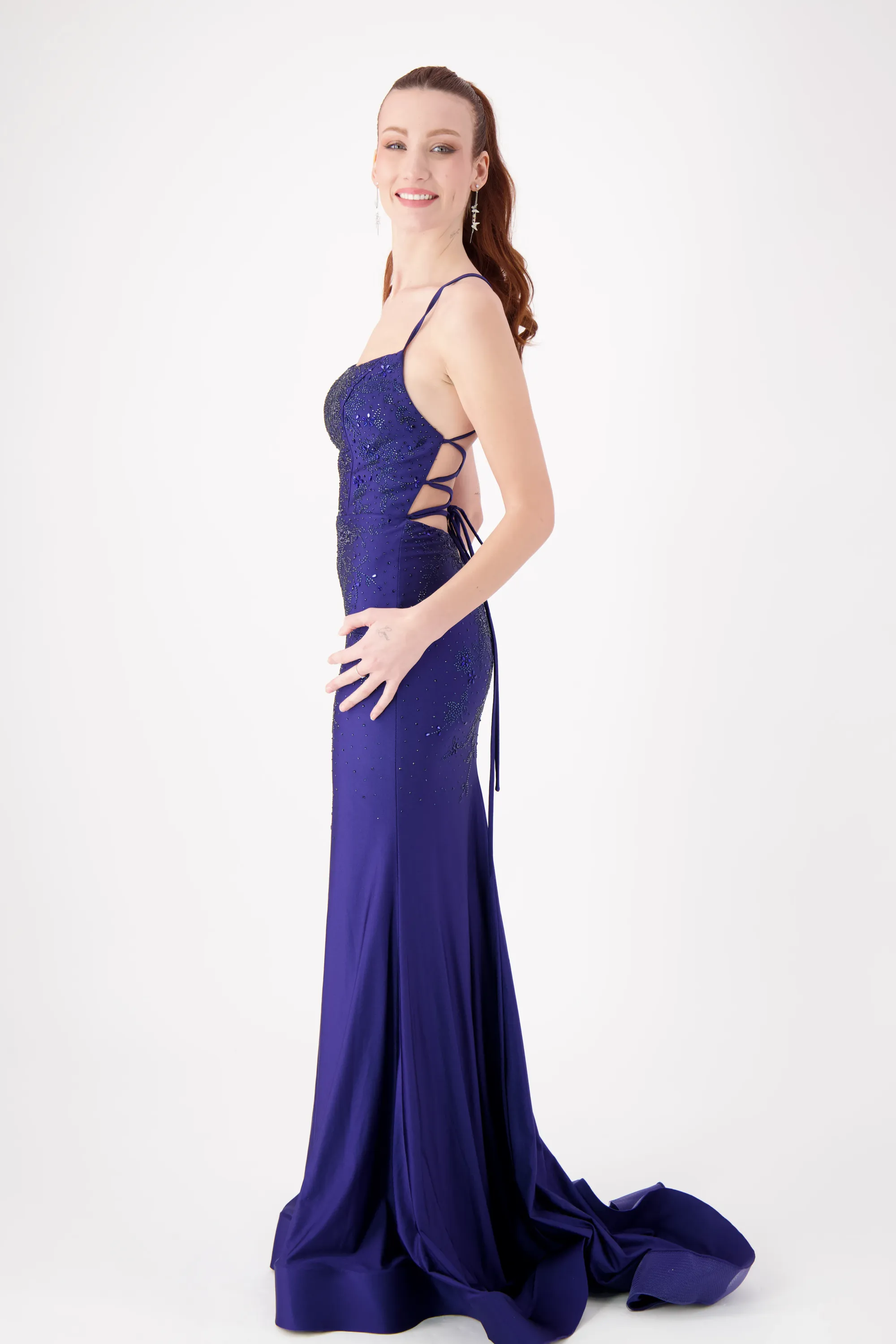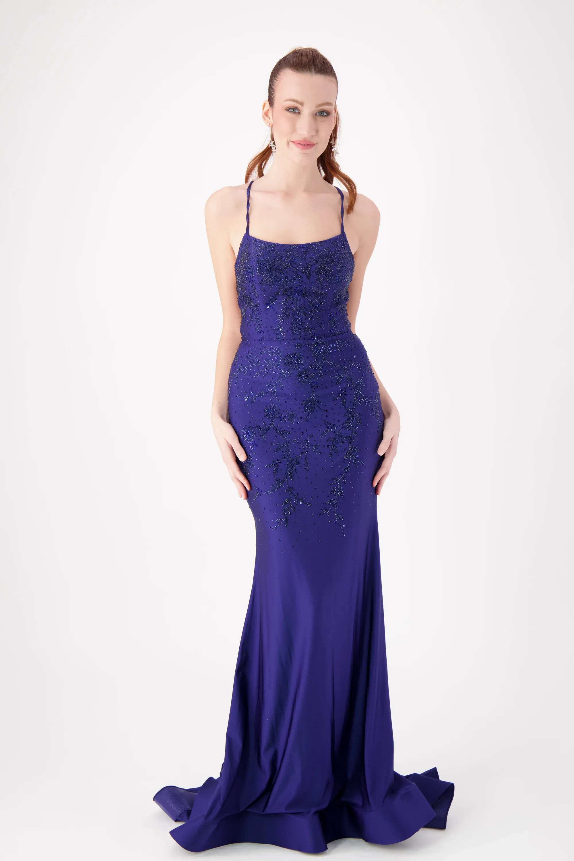 This glamorous purple gown features a sleek fitted silhouette adorned with intricate beadwork for a dazzling finish. The halter-style straps frame the neckline elegantly, while the smooth skirt extends into a soft train for added drama. Perfect for prom, evening galas, and pageants, this gown delivers sophistication with a touch of sparkle.