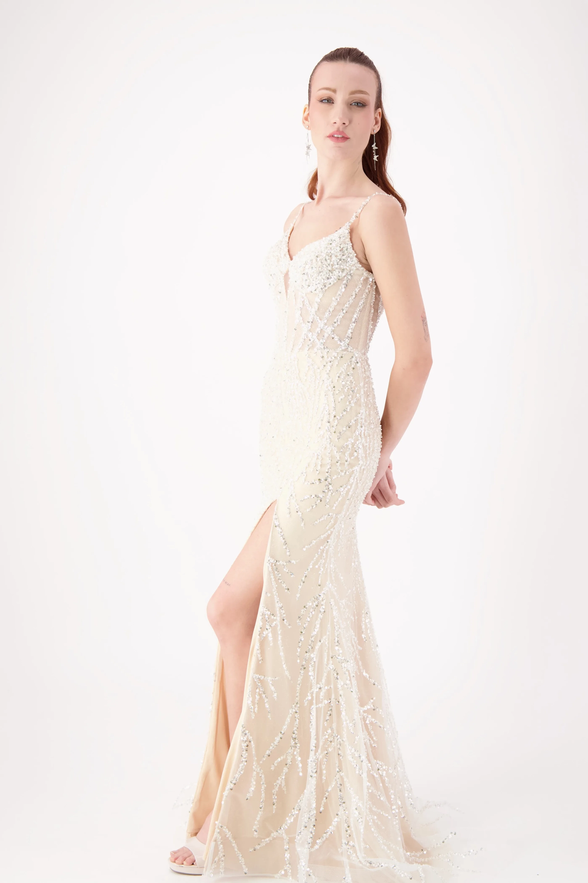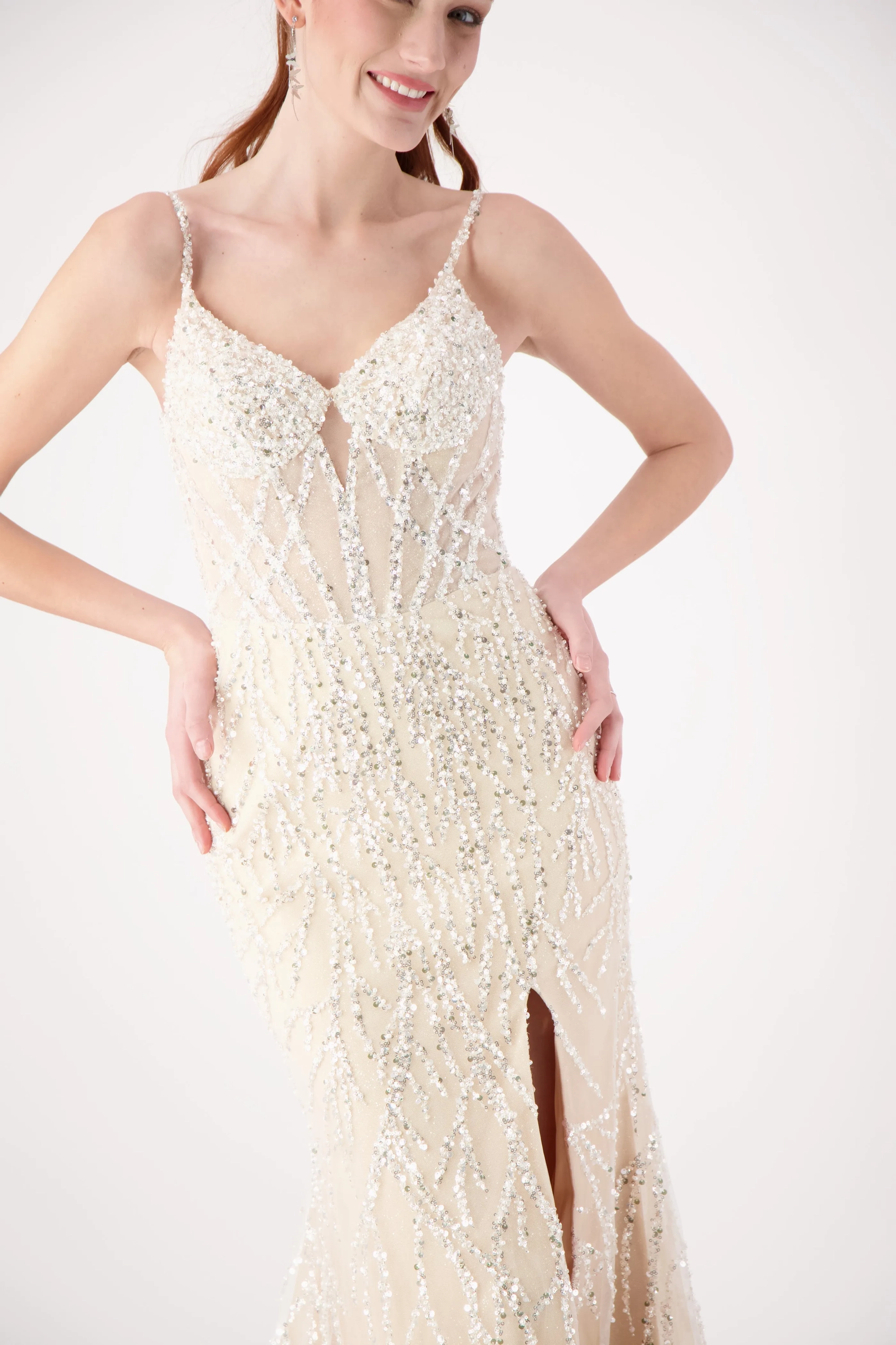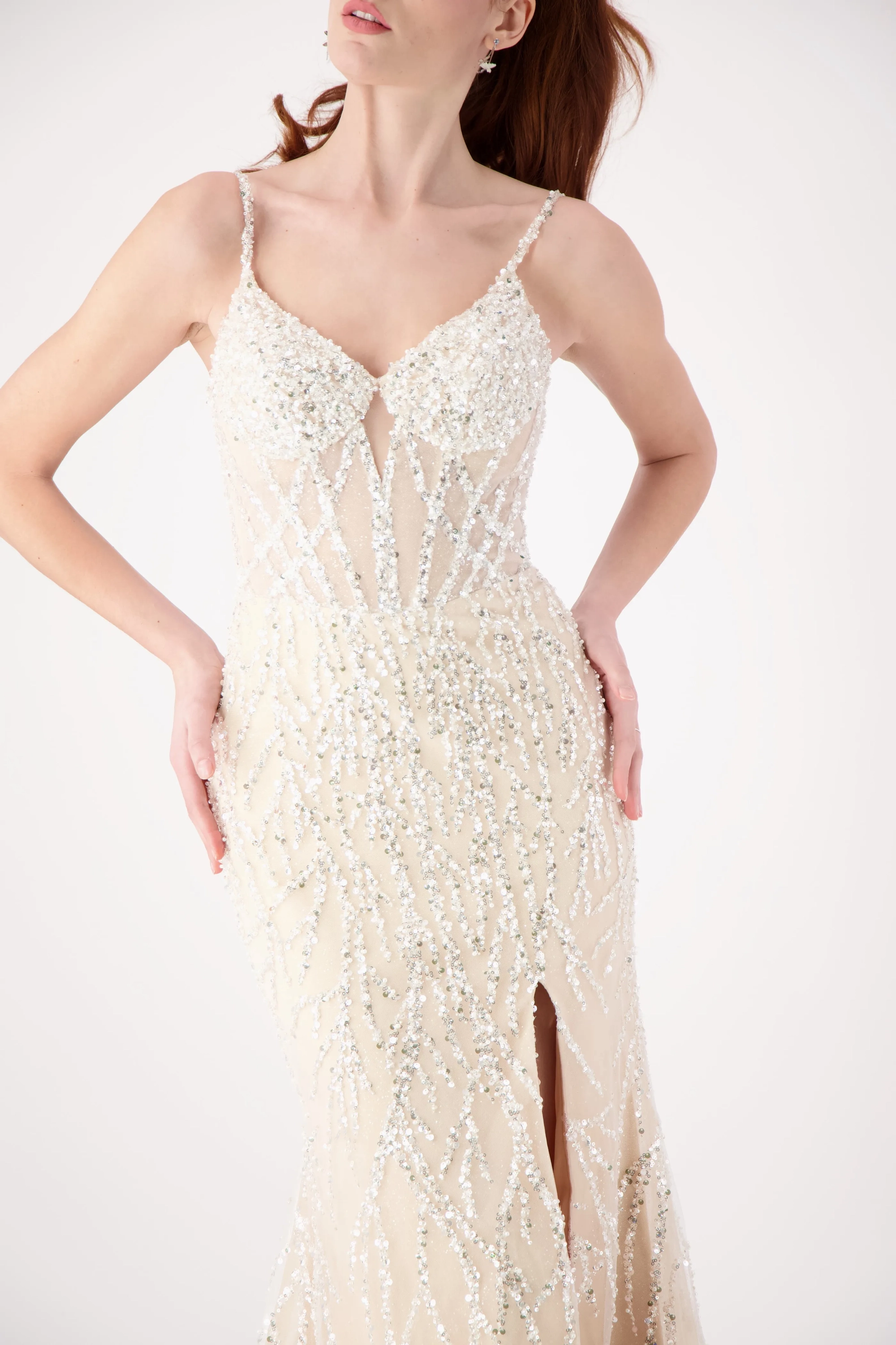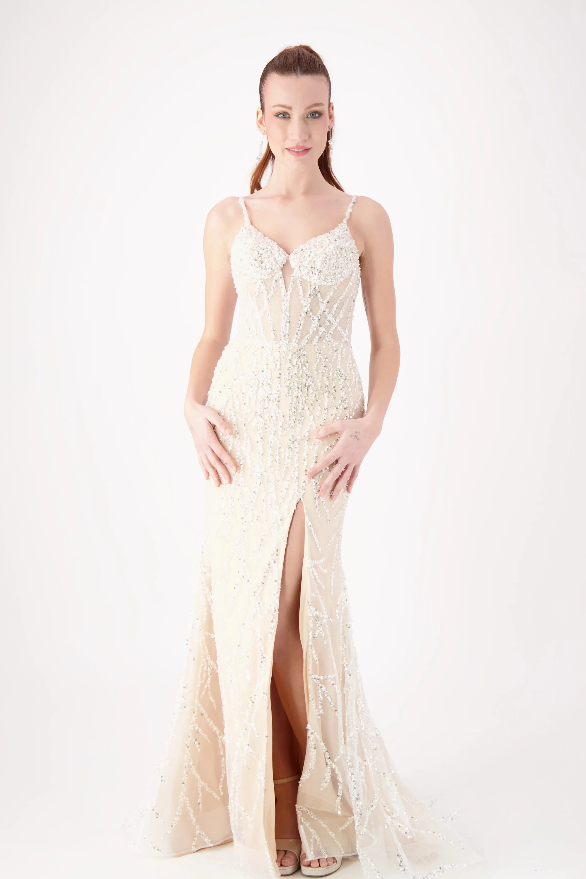Sparkle all night in this dazzling gown featuring intricate silver beadwork on a fitted silhouette. The V-neckline with delicate straps adds elegance, while the thigh-high slit brings a bold, modern touch. Perfect for prom, pageants, or evening galas, this gown is designed to shine from every angle.