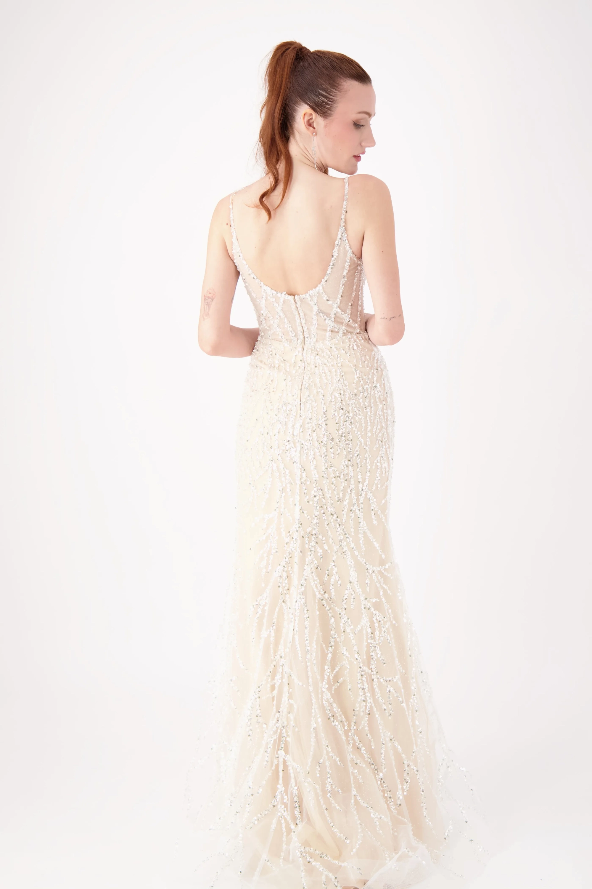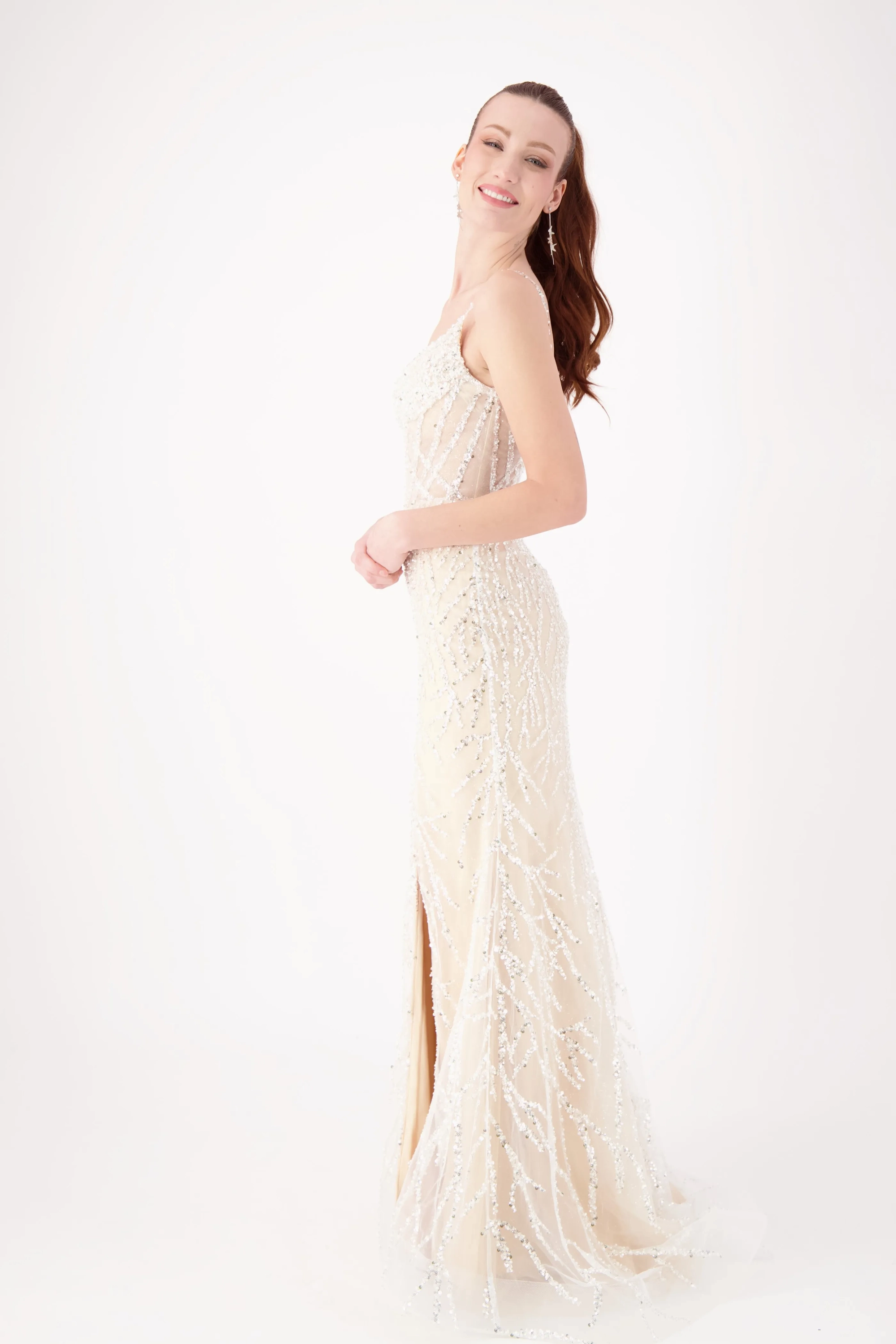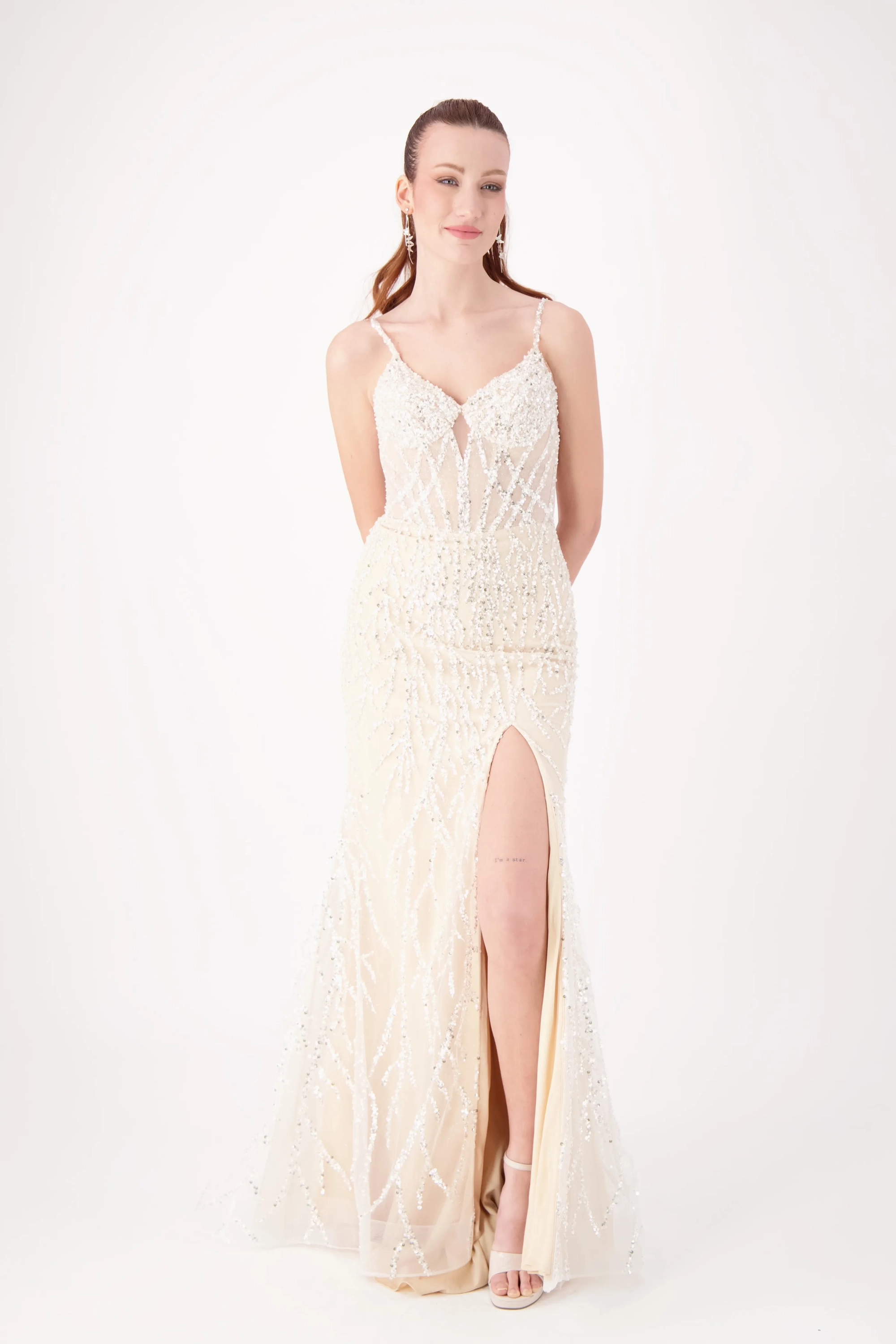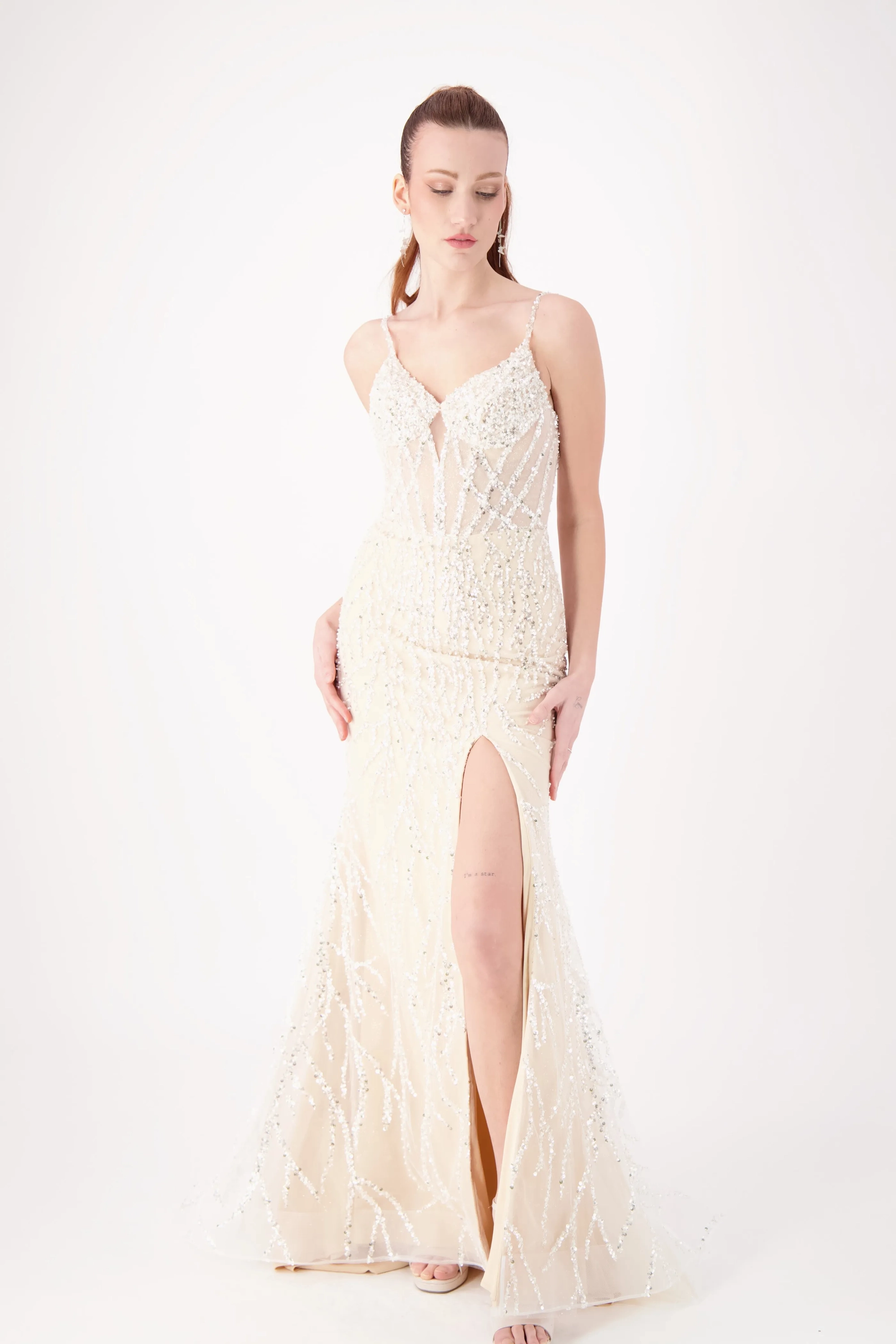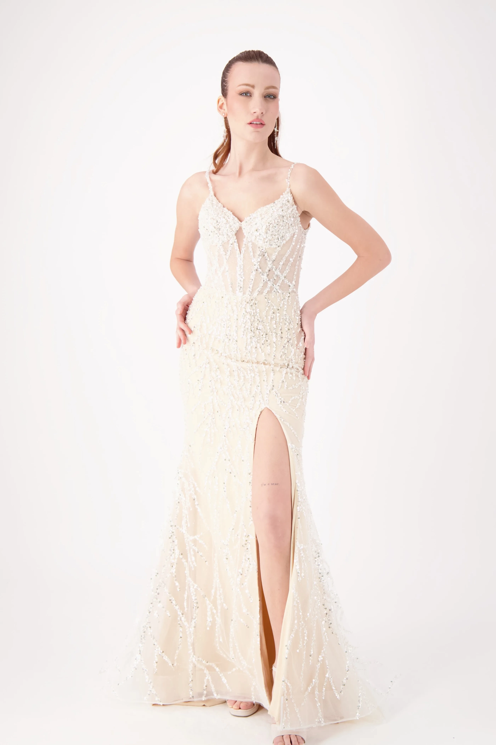 Sparkle all night in this dazzling gown featuring intricate silver beadwork on a fitted silhouette. The V-neckline with delicate straps adds elegance, while the thigh-high slit brings a bold, modern touch. Perfect for prom, pageants, or evening galas, this gown is designed to shine from every angle.
