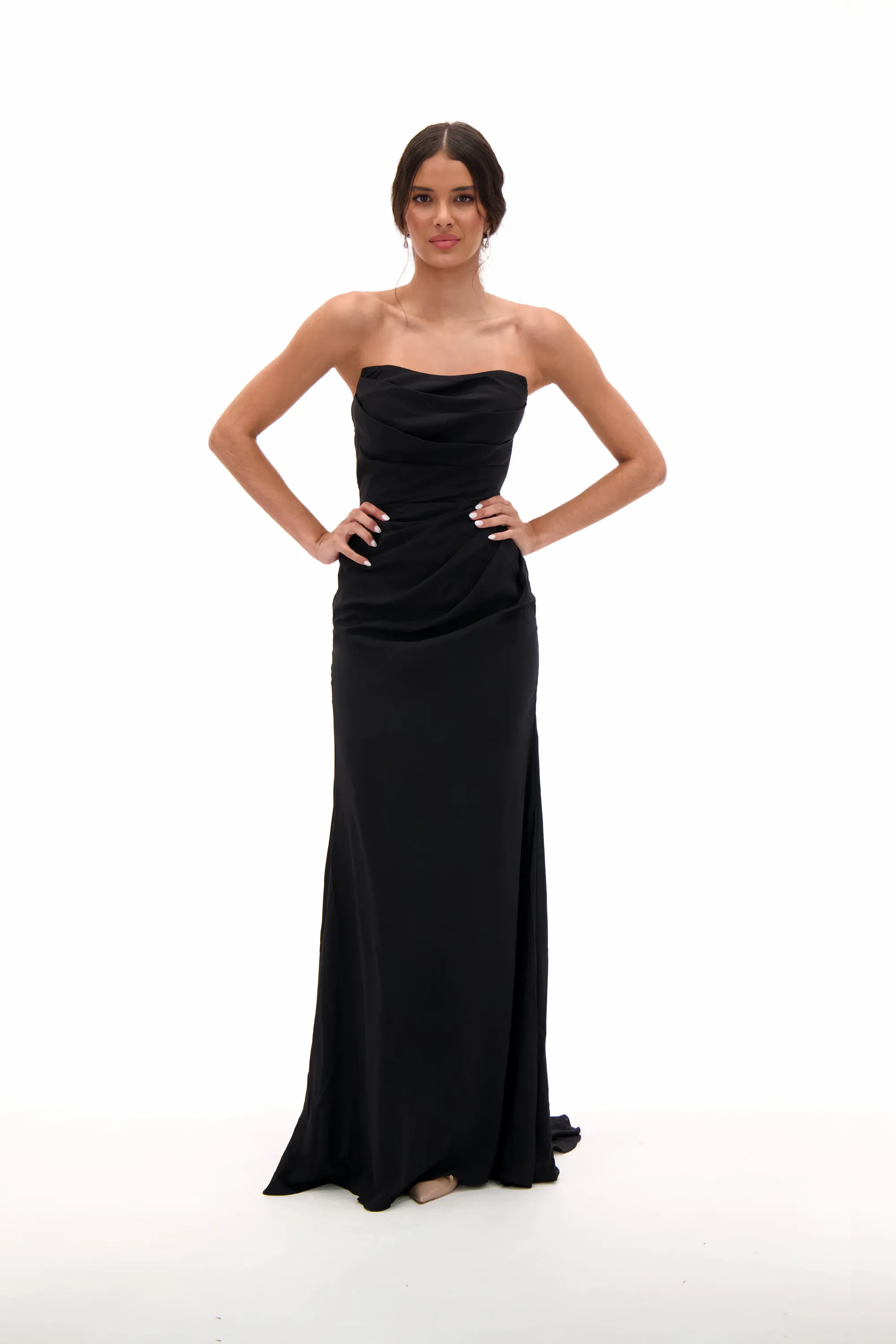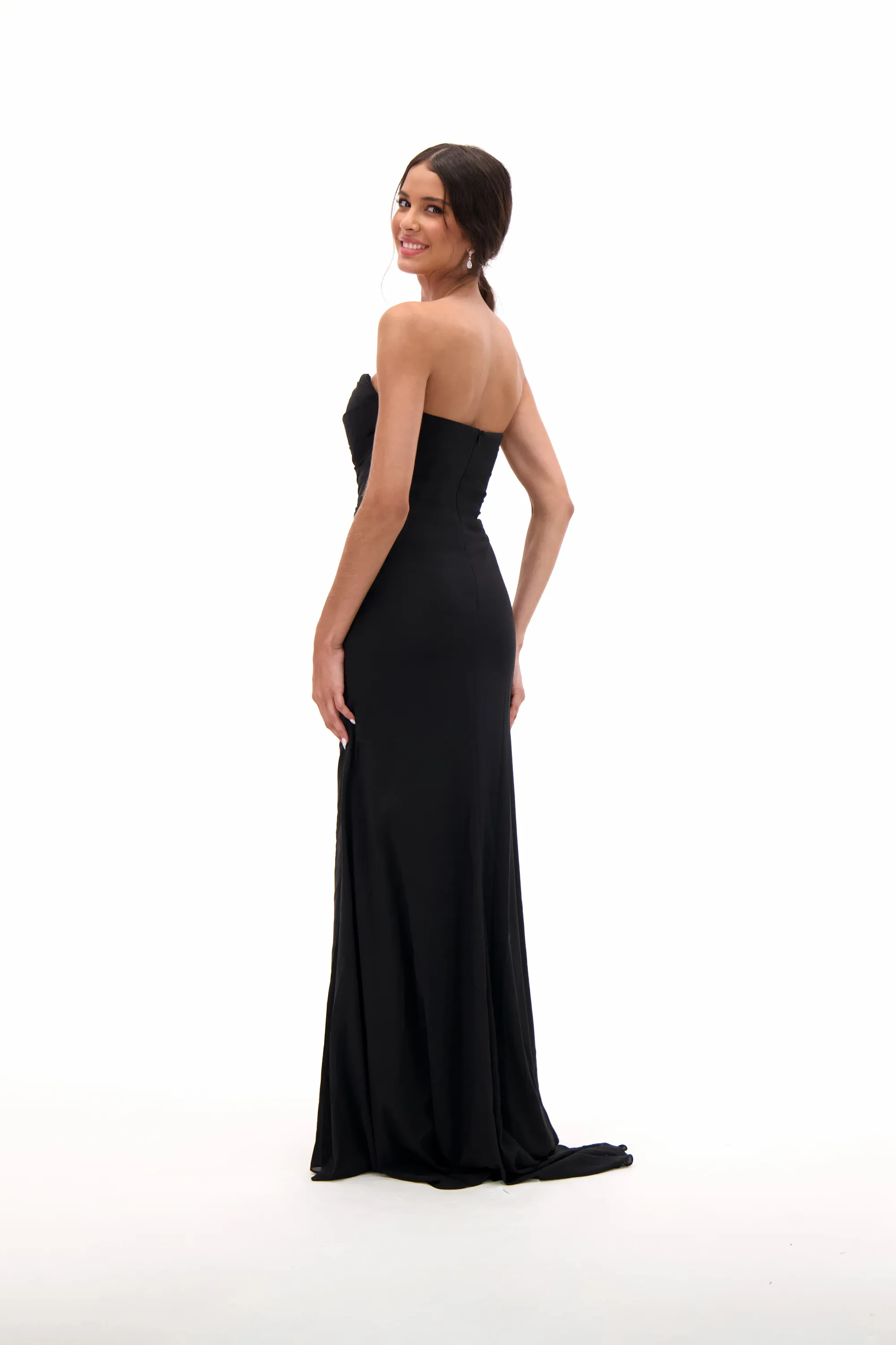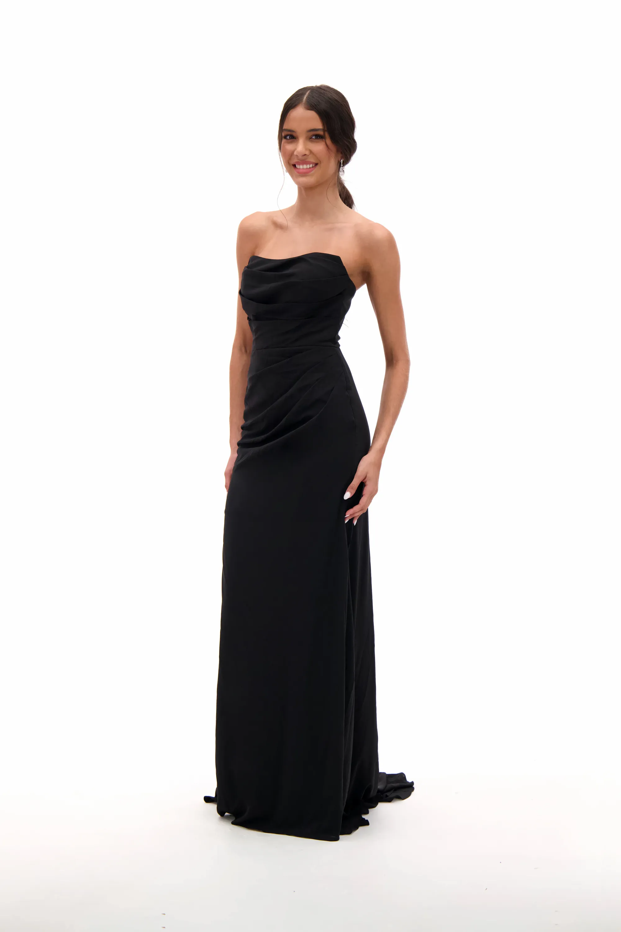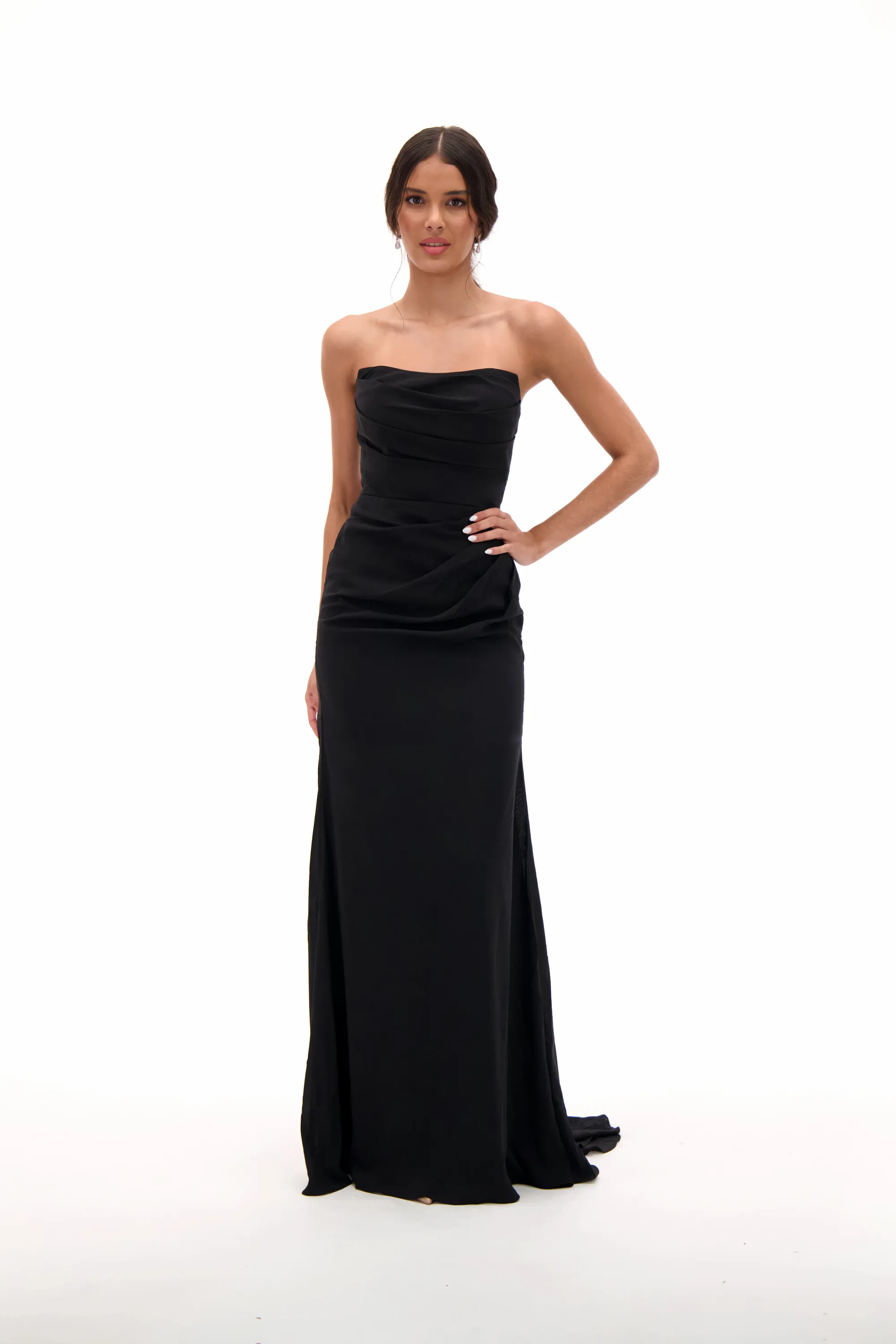 Timeless and sophisticated, this gown features a strapless neckline with a ruched bodice that flatters the figure. The sleek fitted silhouette flows into a floor-length skirt with a subtle train, making it a chic choice for prom, formal galas, or evening occasions. A classic black dress that combines elegance with modern minimalism.