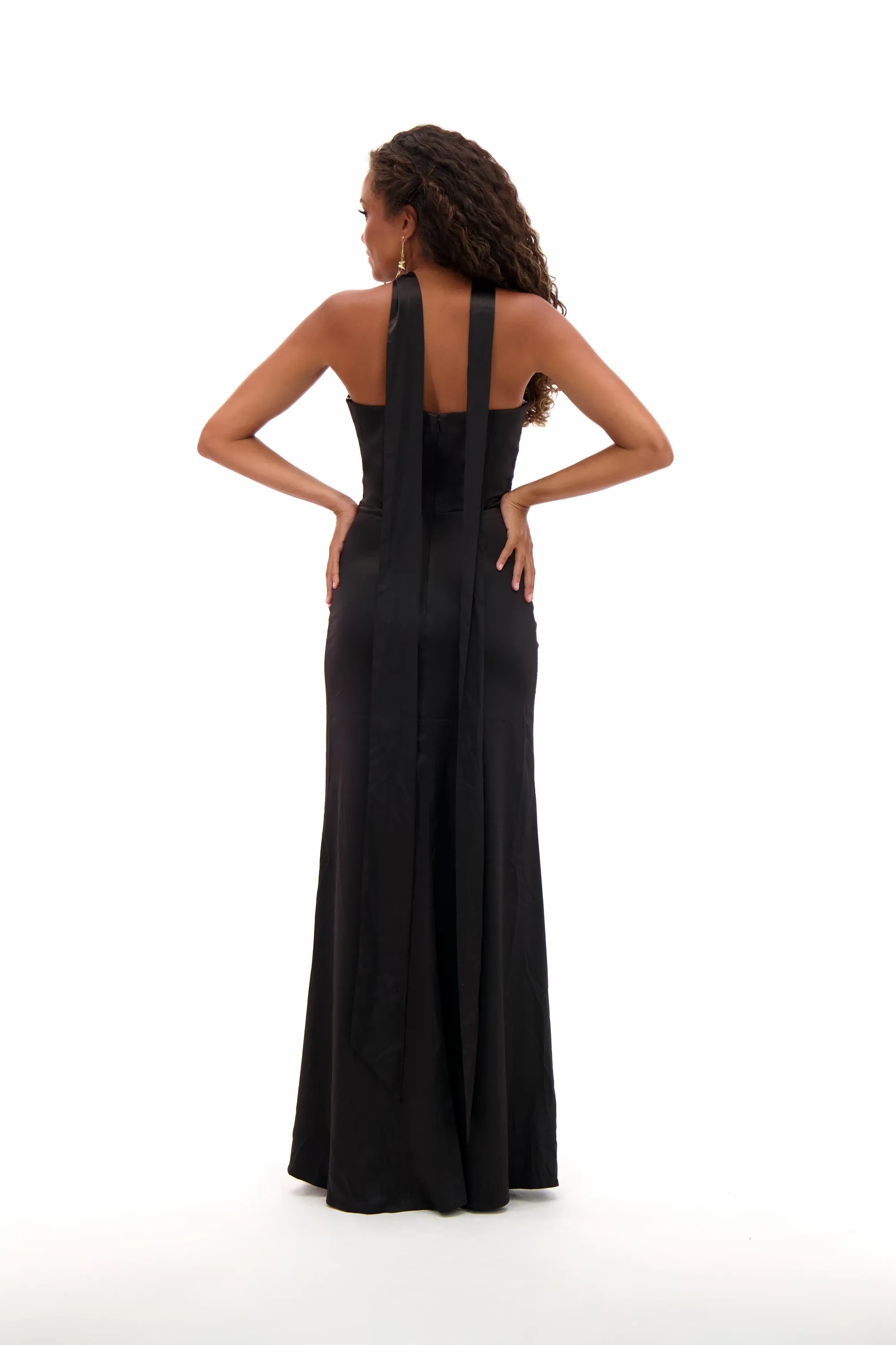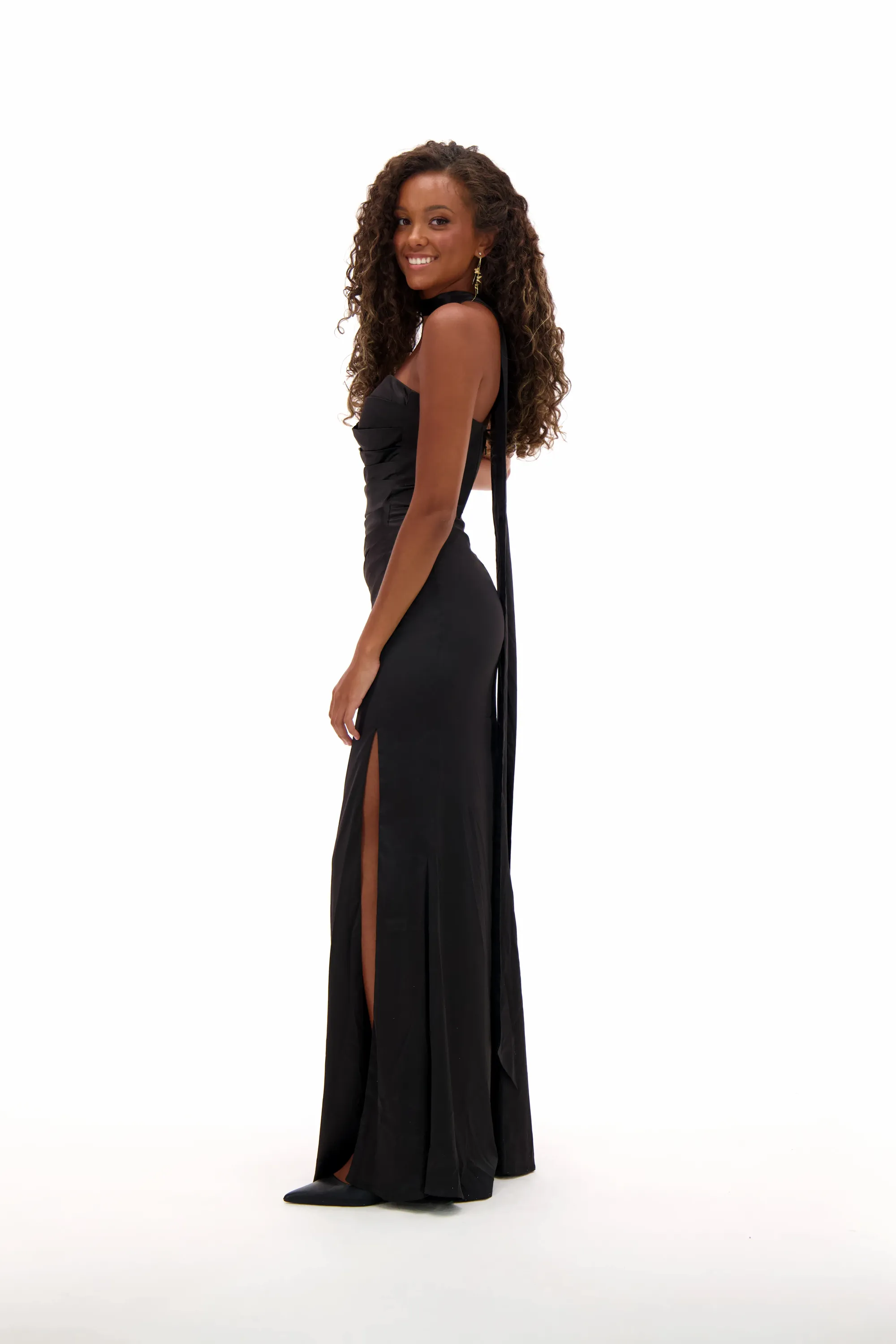 Chic and timeless, this strapless black gown features a sleek ruched bodice that enhances the silhouette. The fitted design extends into a floor-length skirt with a daring thigh-high slit, creating the perfect balance of elegance and allure. Ideal for prom, evening galas, or formal occasions, this gown is a must-have for a sophisticated look.