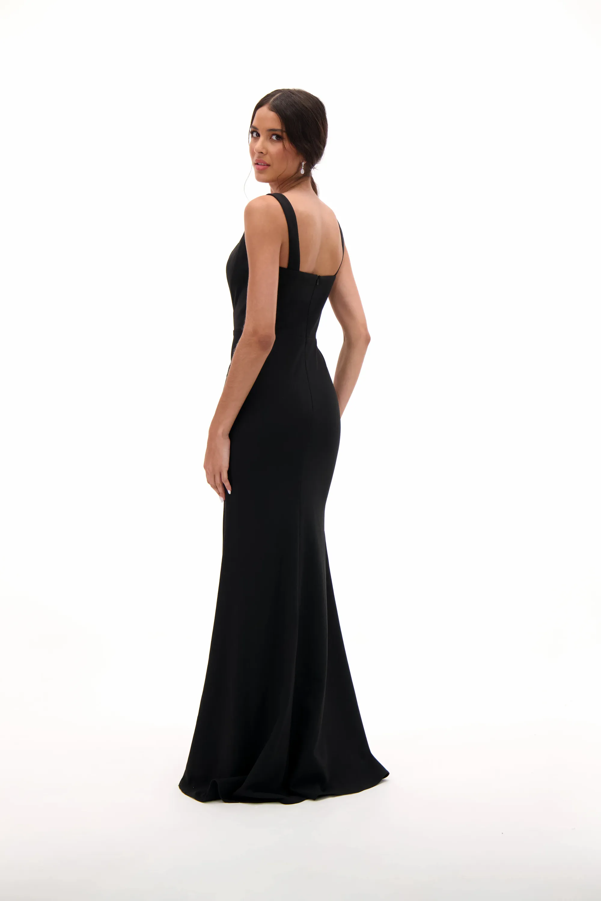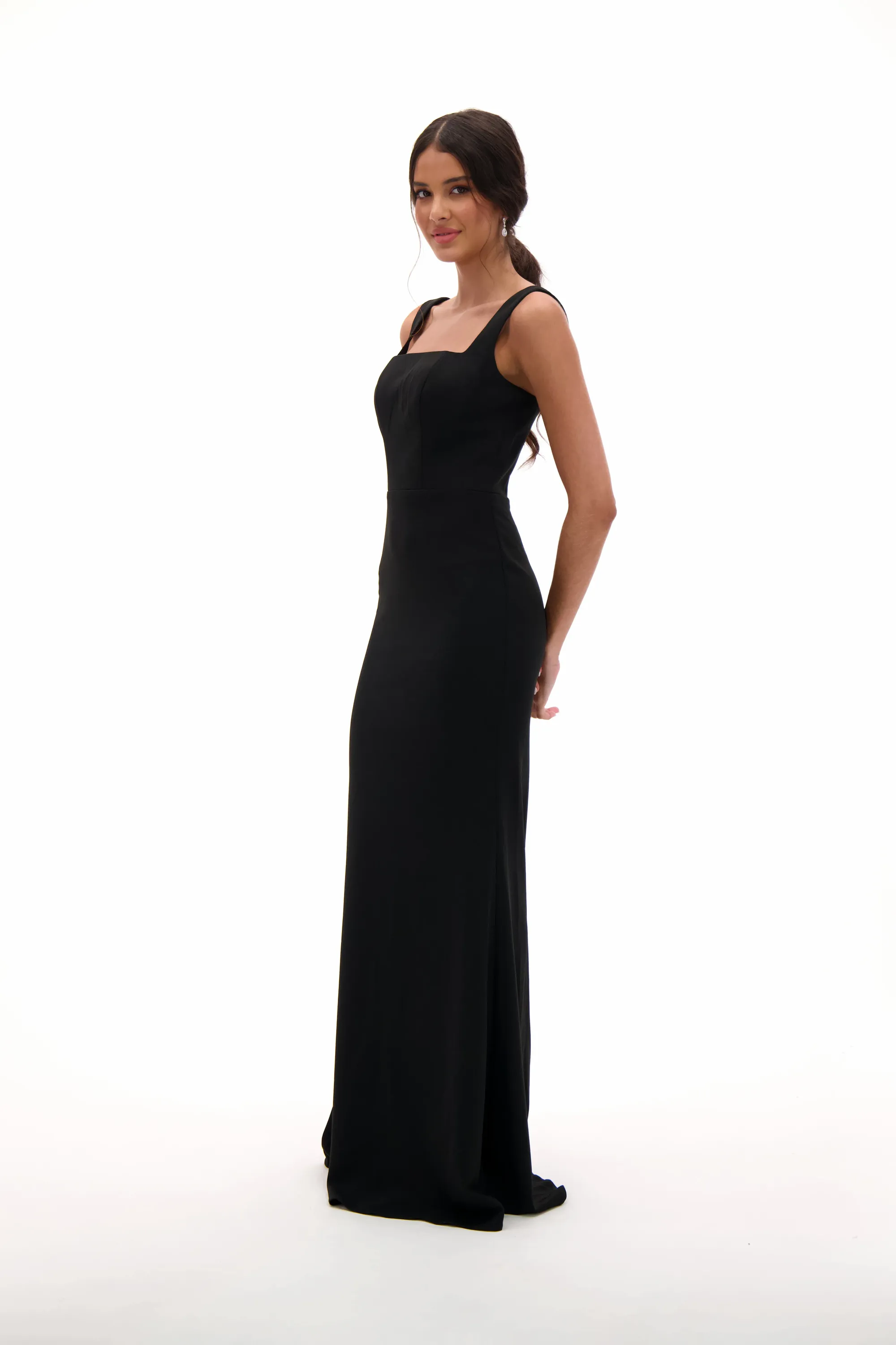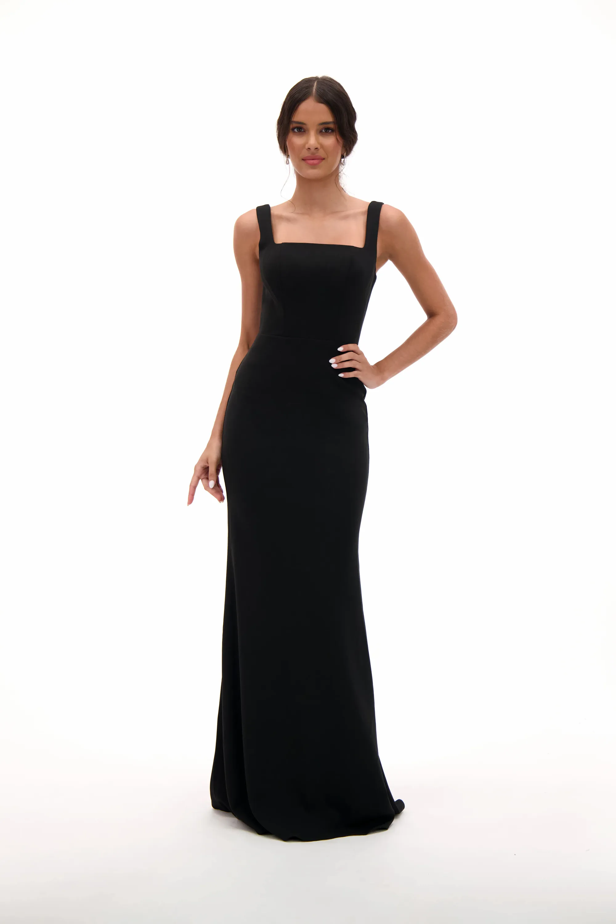 Minimalist and refined, this black gown features a modern square neckline with thick straps for a structured and elegant look. The fitted silhouette flows into a floor-length skirt, creating a timeless design that exudes sophistication. Perfect for prom, evening galas, or black-tie events, this gown is the ultimate choice for understated glamour.